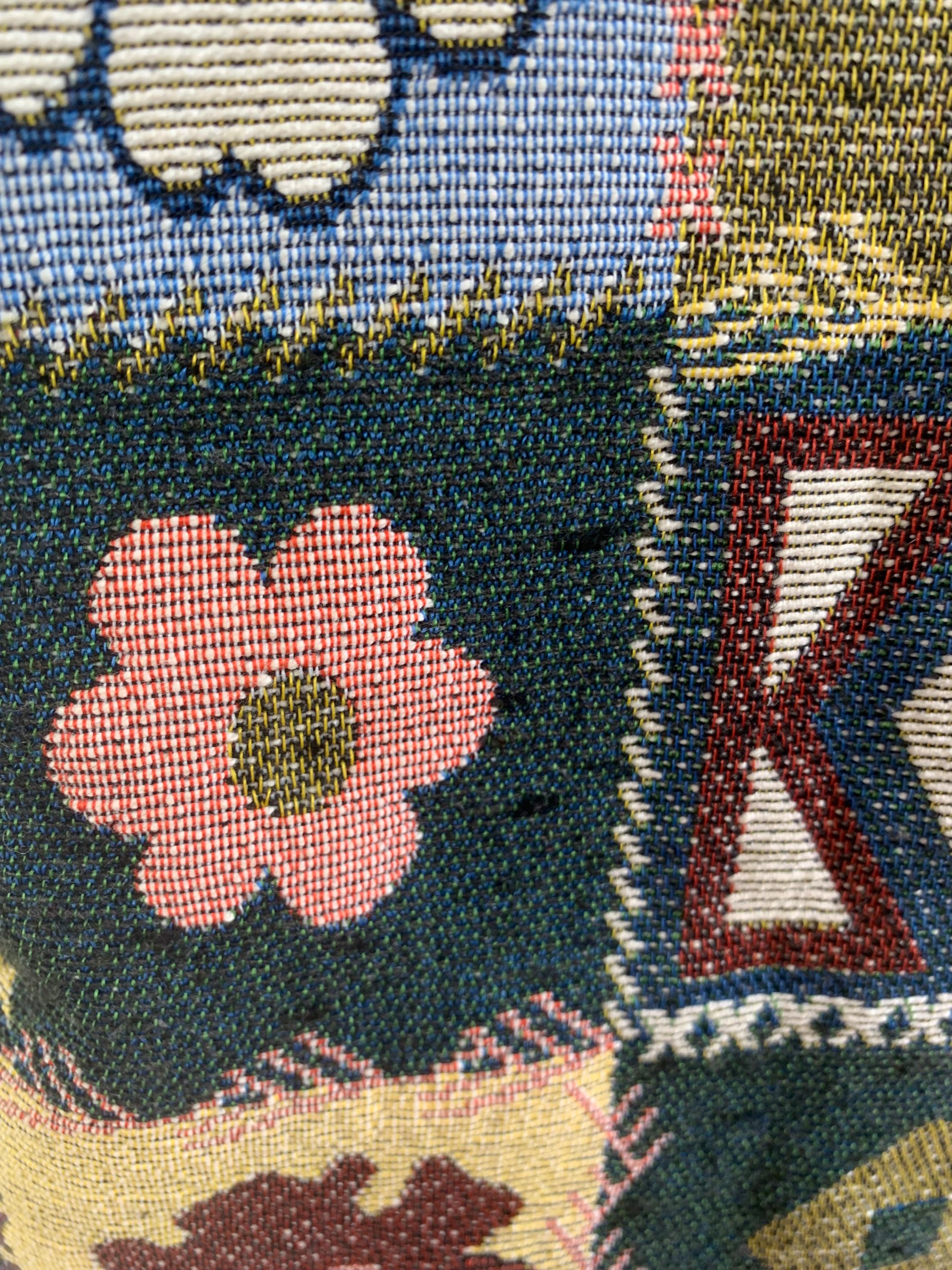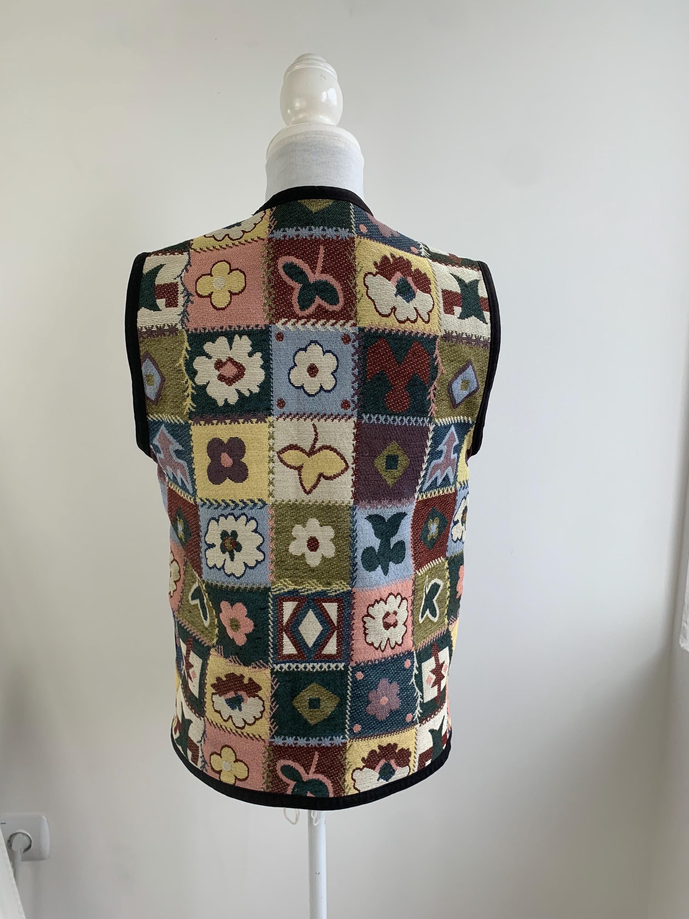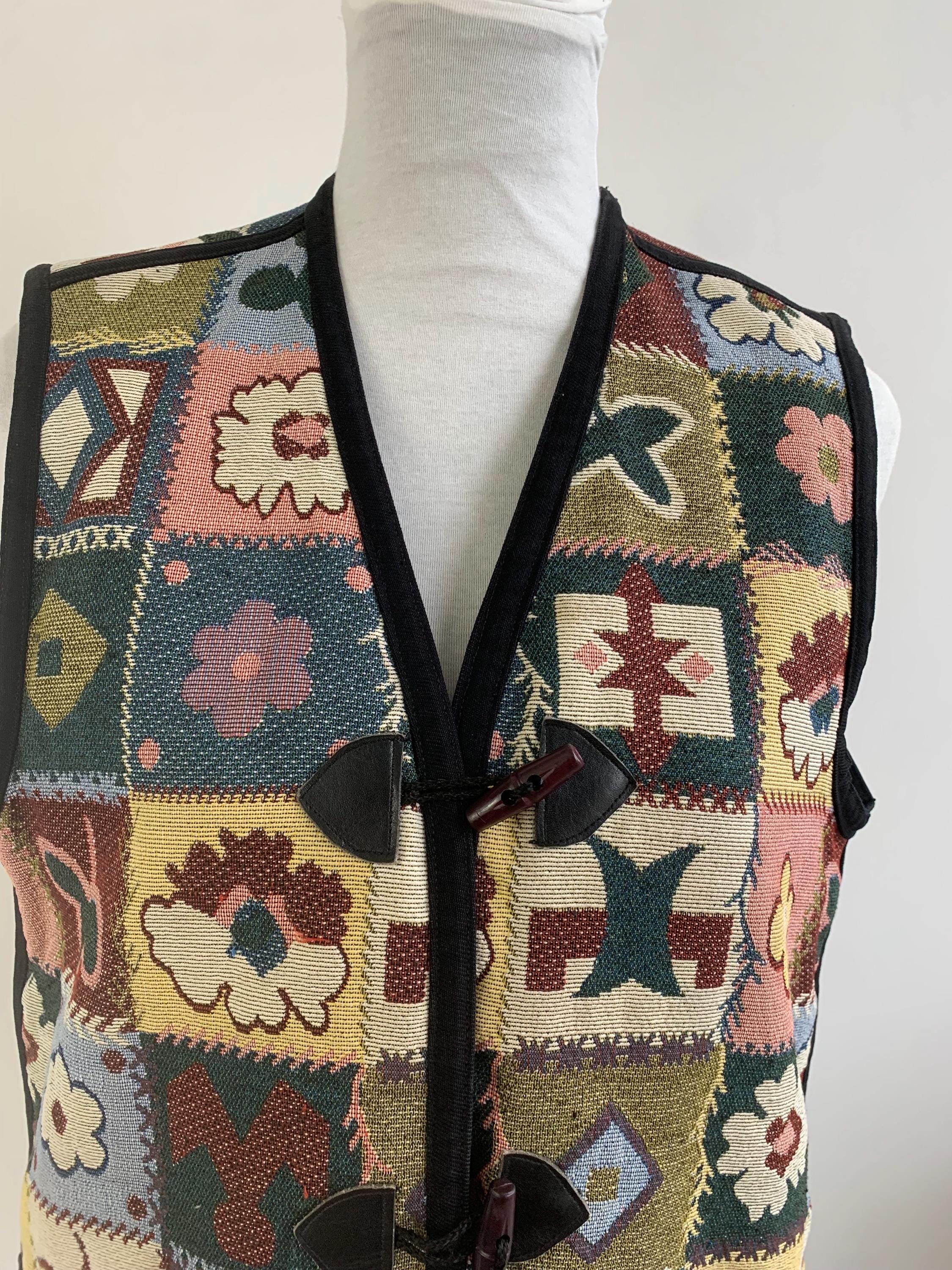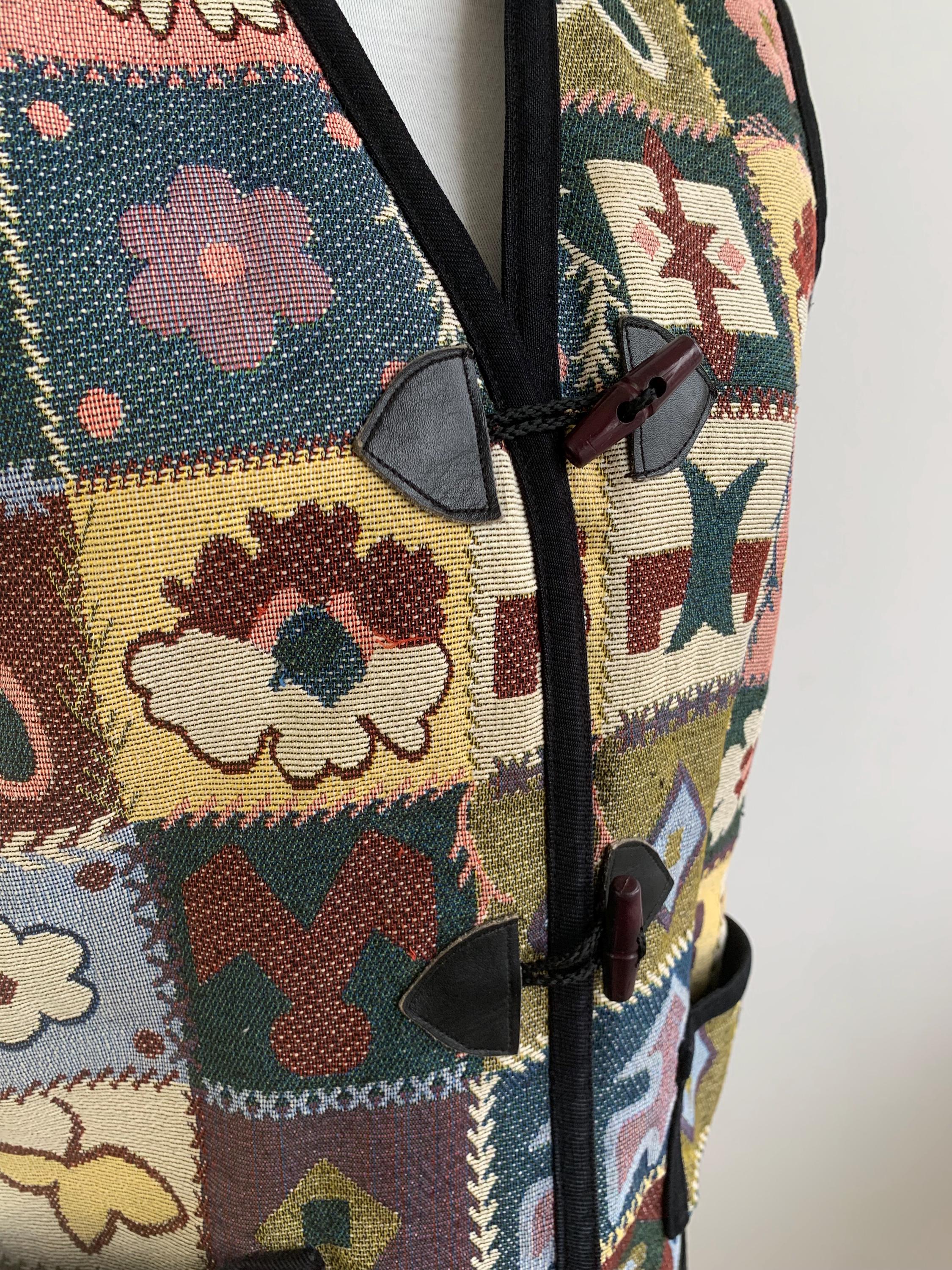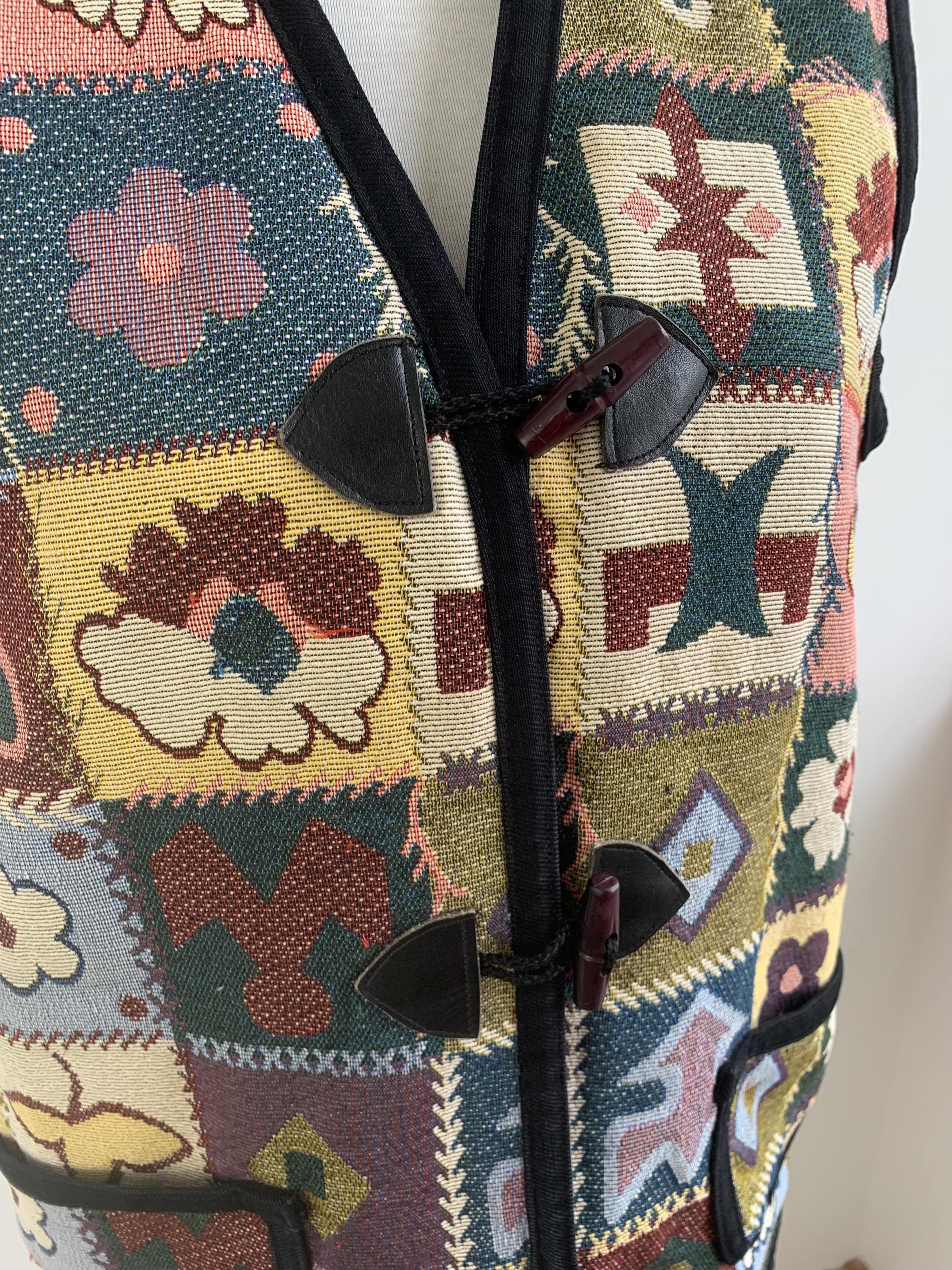 Embrace the cozy, colorful style of the 1990s with this unique vintage tapestry vest! This sleeveless jacket features a beautiful all-over patchwork design woven into the heavy fabric, showcasing folk-art inspired florals, geometric shapes, and stylized motifs in a charming muted color palette of sage green, dusty rose, maroon, and mustard yellow.