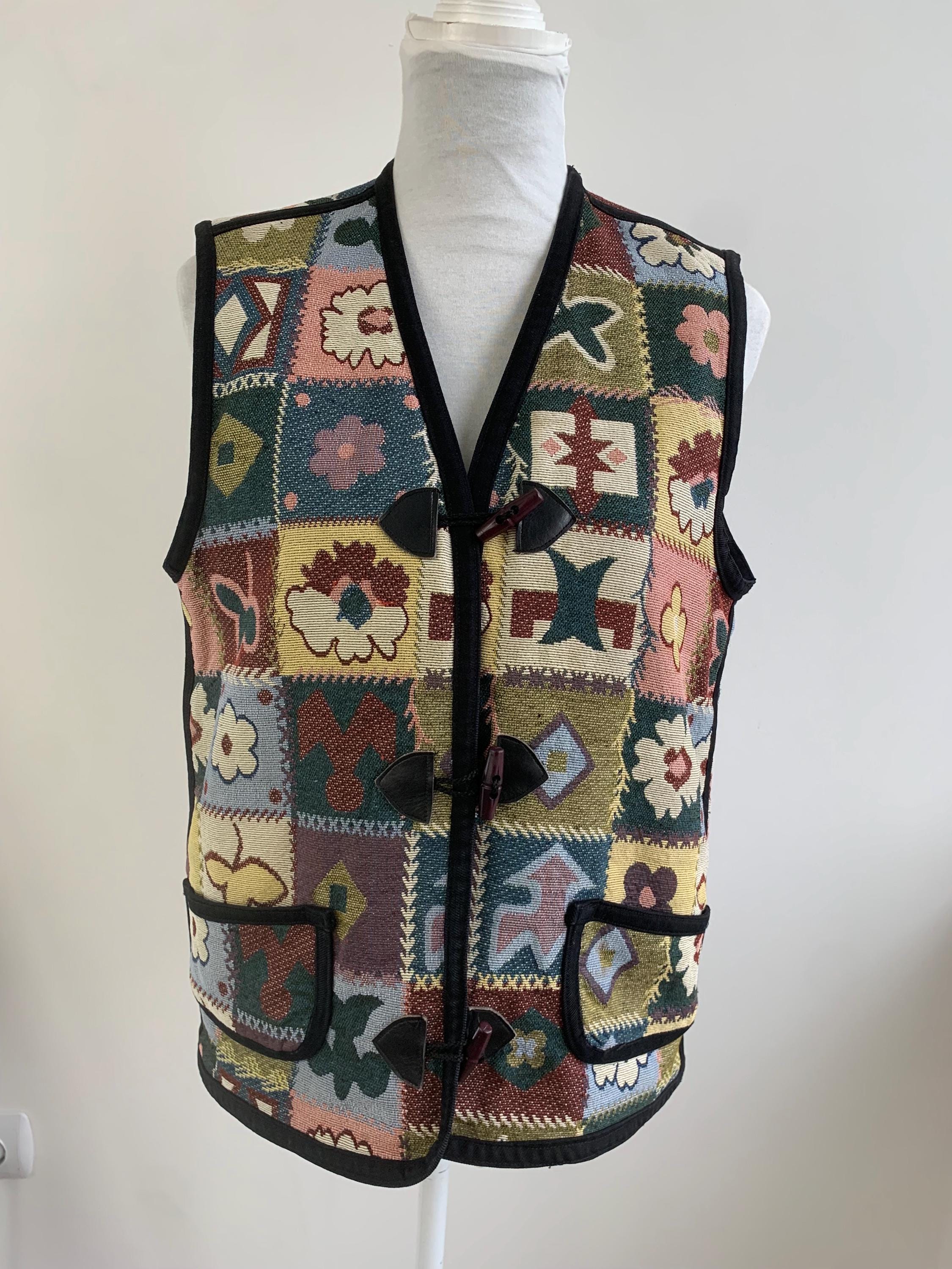 The vest has a distinctly quilted waistcoat feel, perfect for layering during any season. It is fully lined for comfort and features a striking front closure with brown toggles and faux leather pieces, which adds to its classic Boho and Cottagecore aesthetic. The v-neckline and black trim give it a polished, finished look.