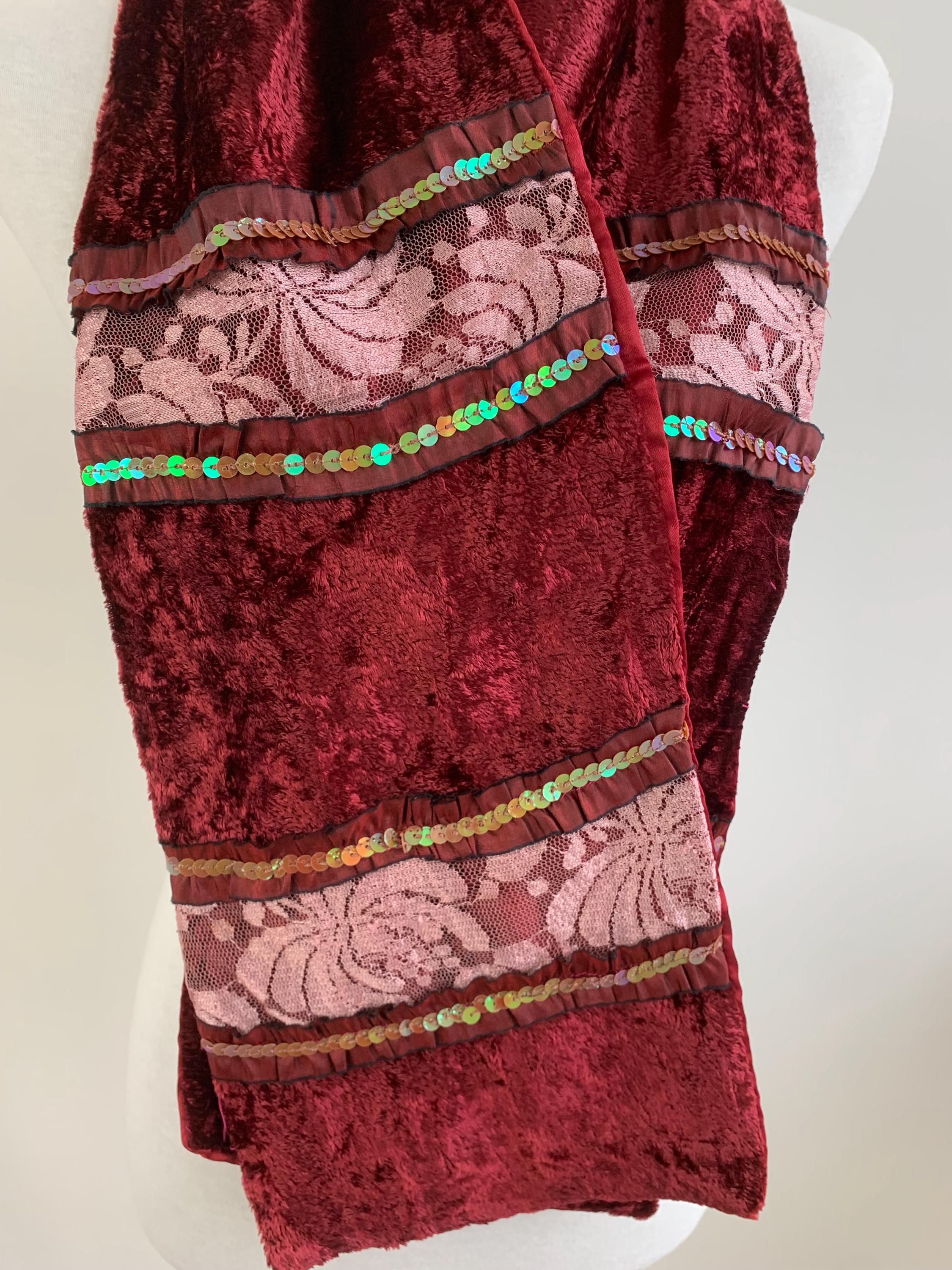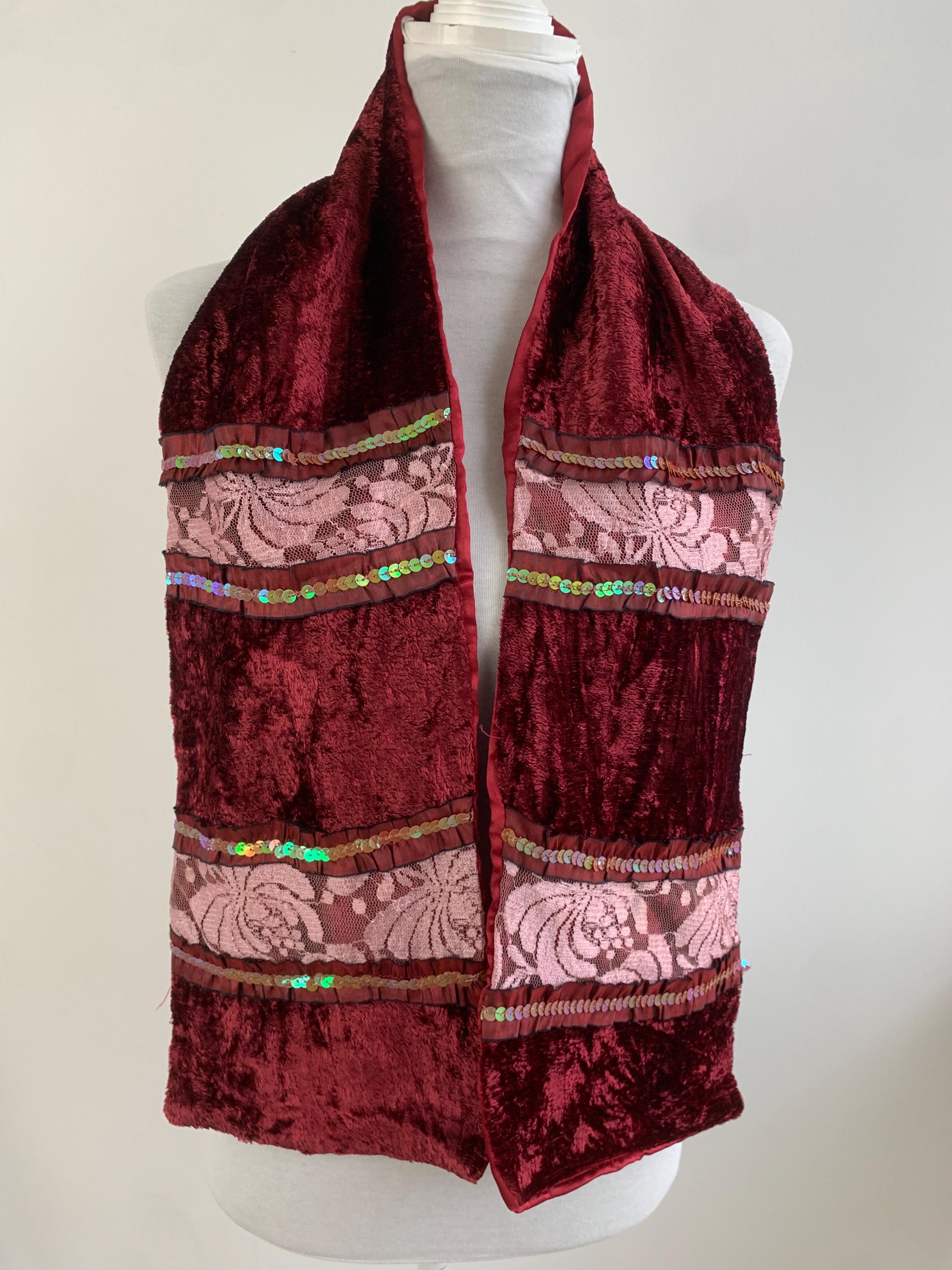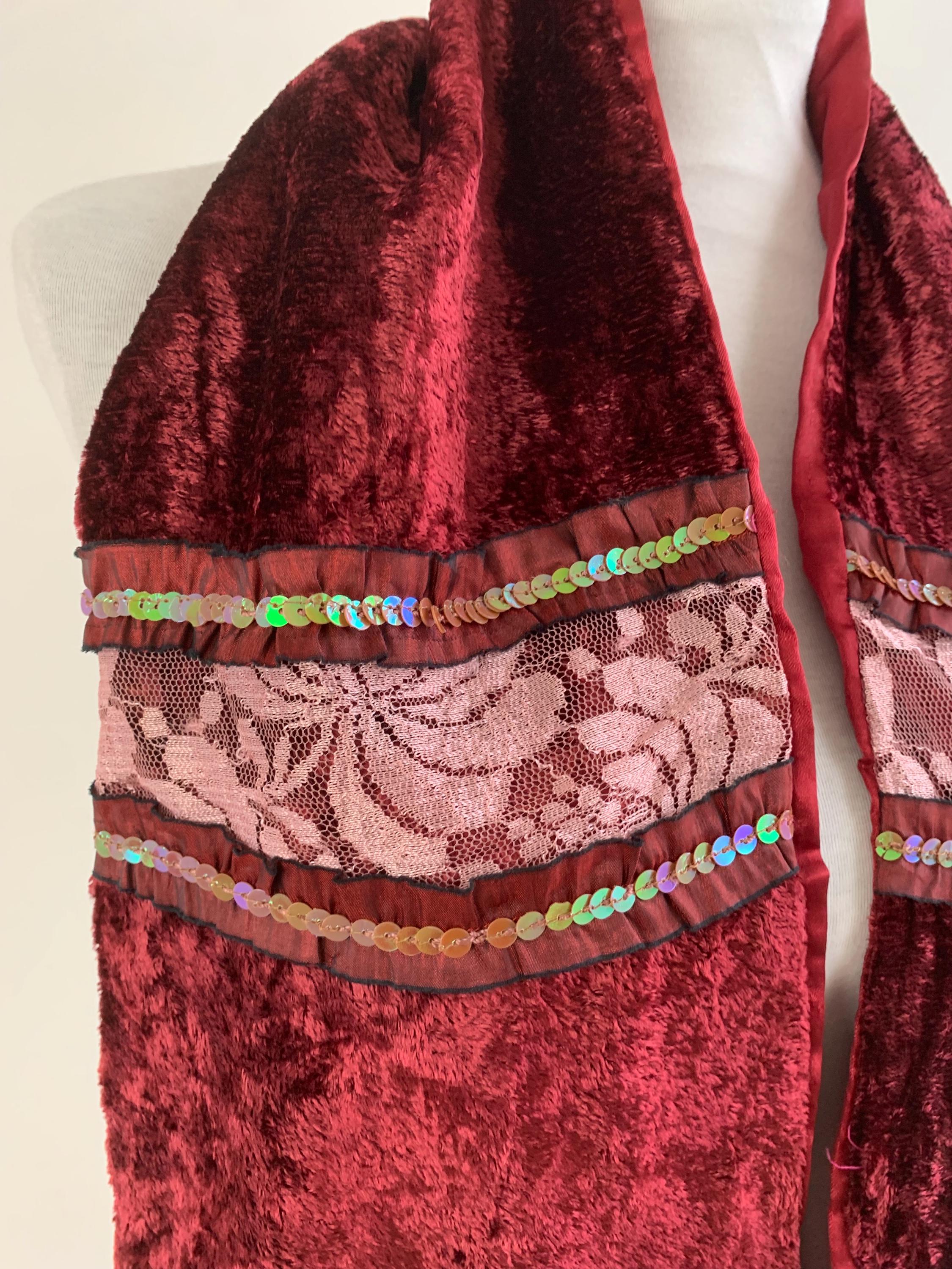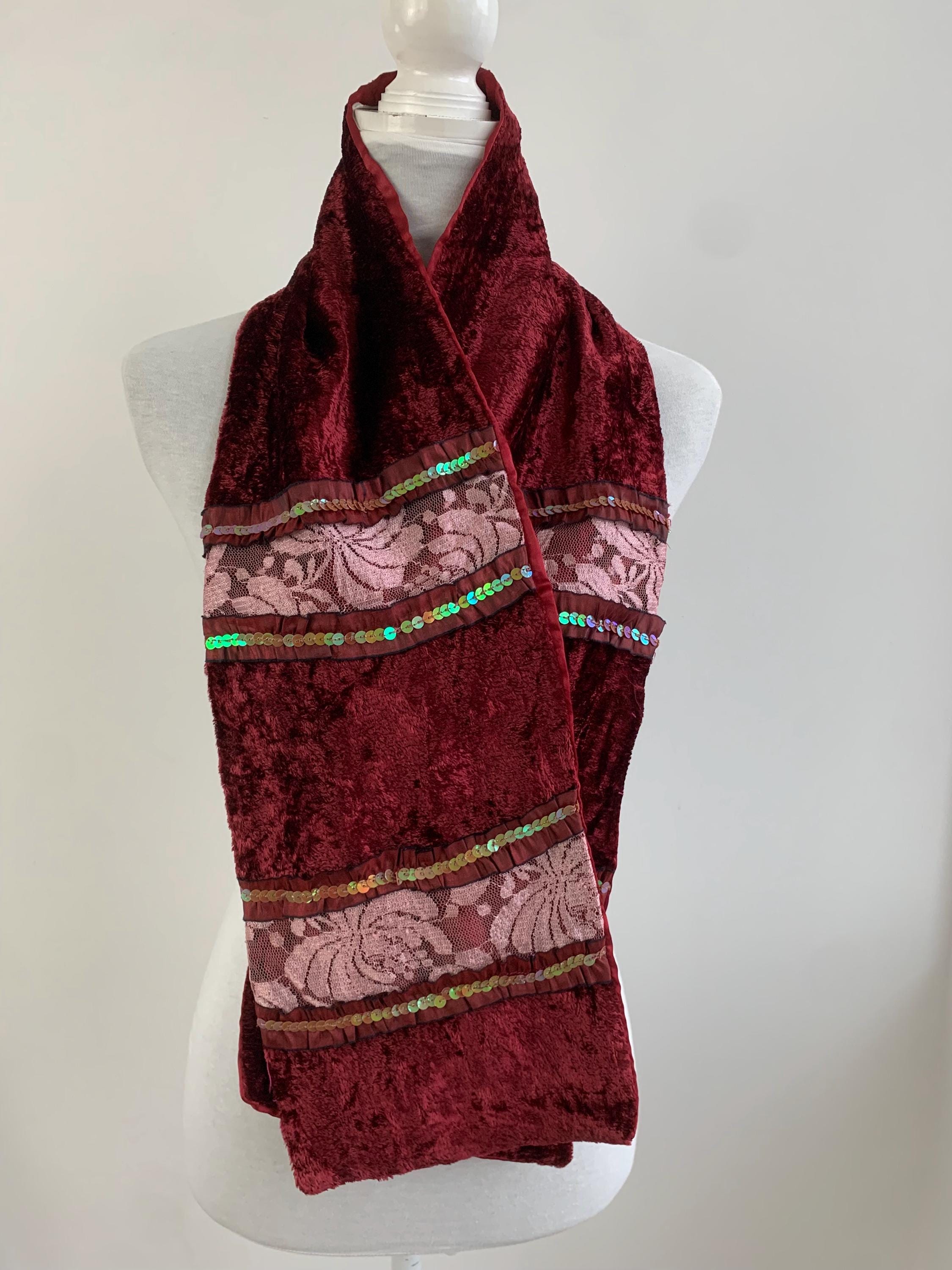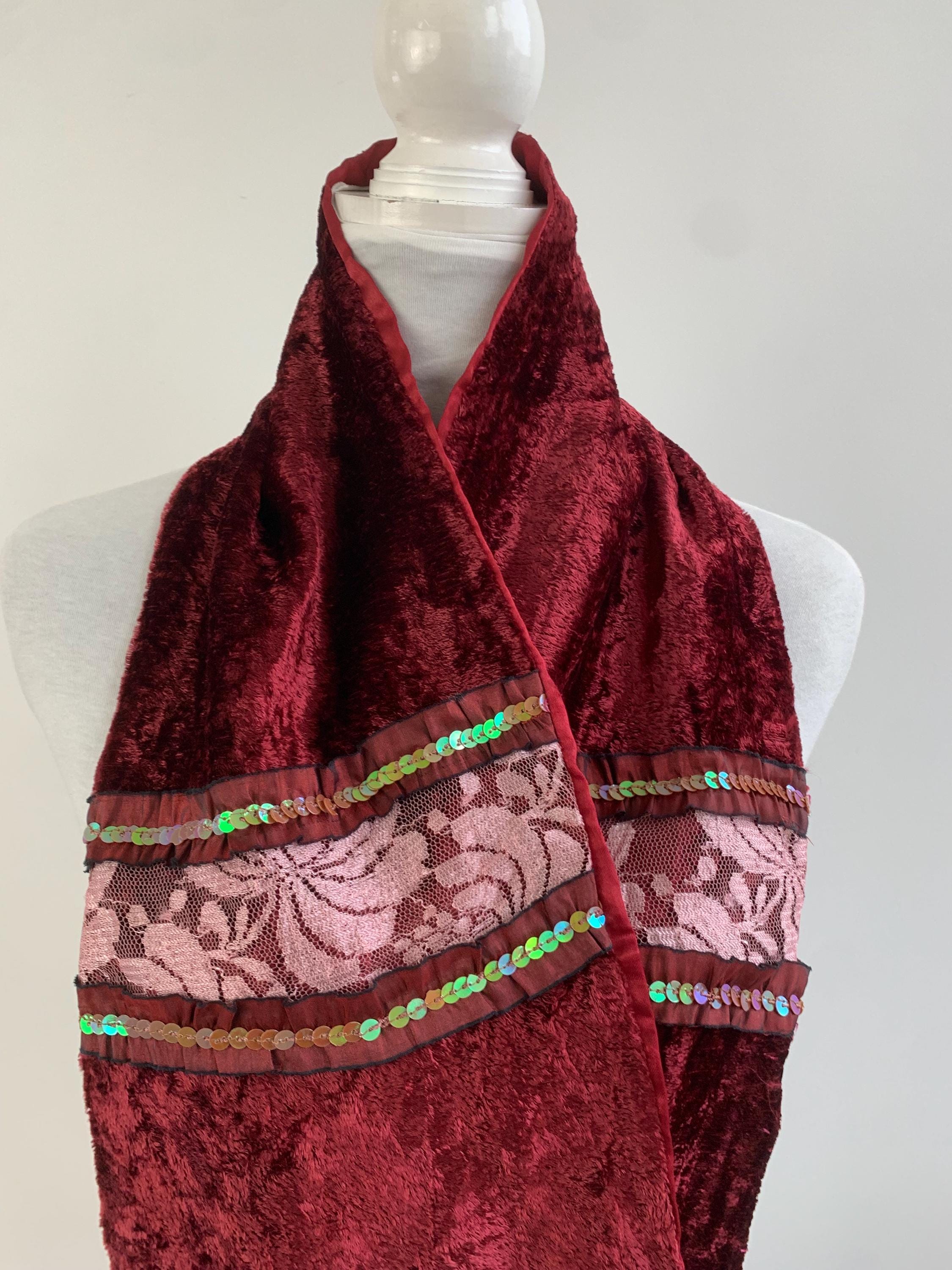Make a glamorous statement with this rich, luxurious vintage deep red velvet scarf. This beautiful velvet narrow stope captures the opulent, maximalist trends of the late 1990s and early Y2K era. The main body is crafted from a plush, crushed burgundy velvet, which provides a stunning depth of color and softness.