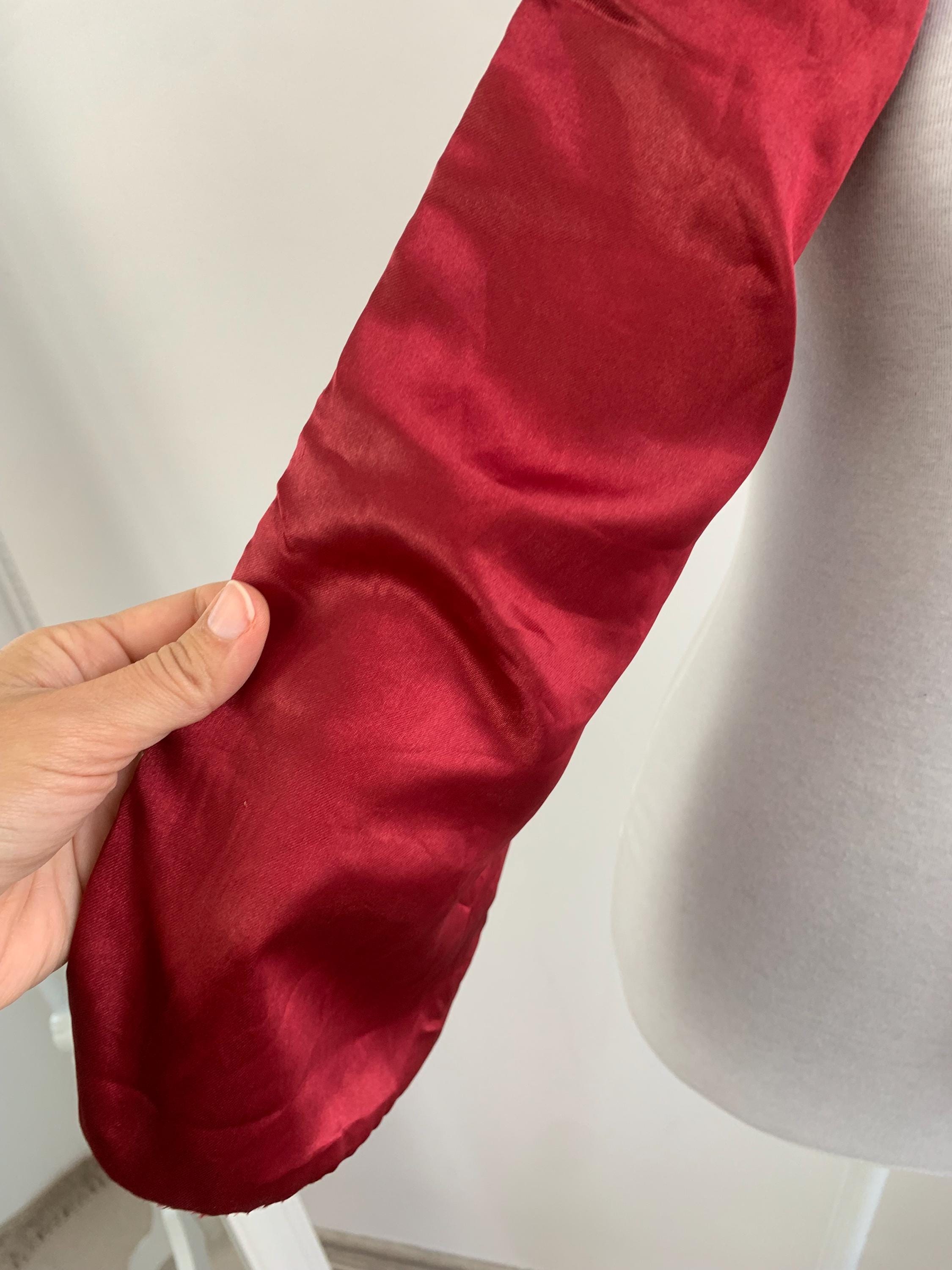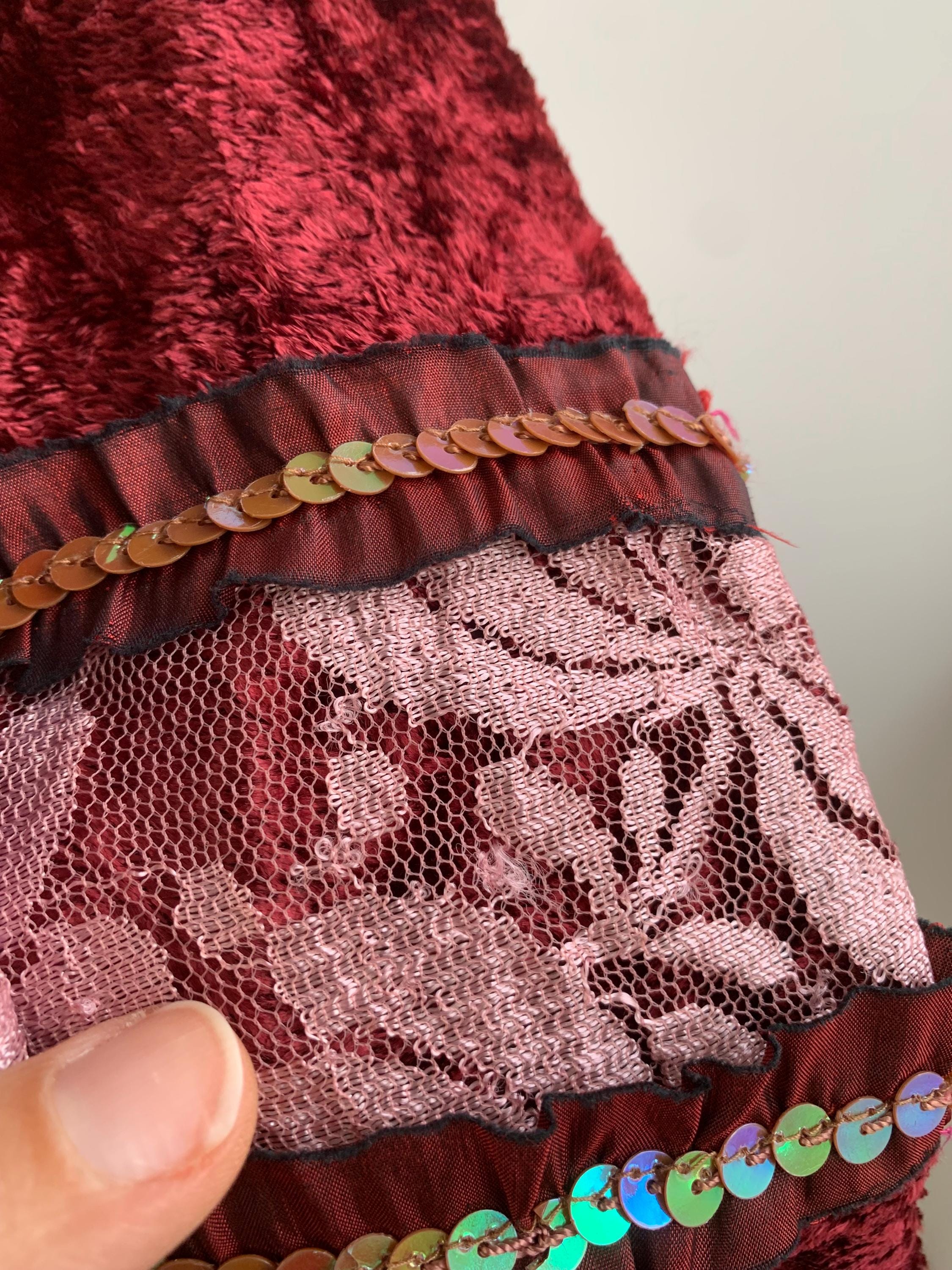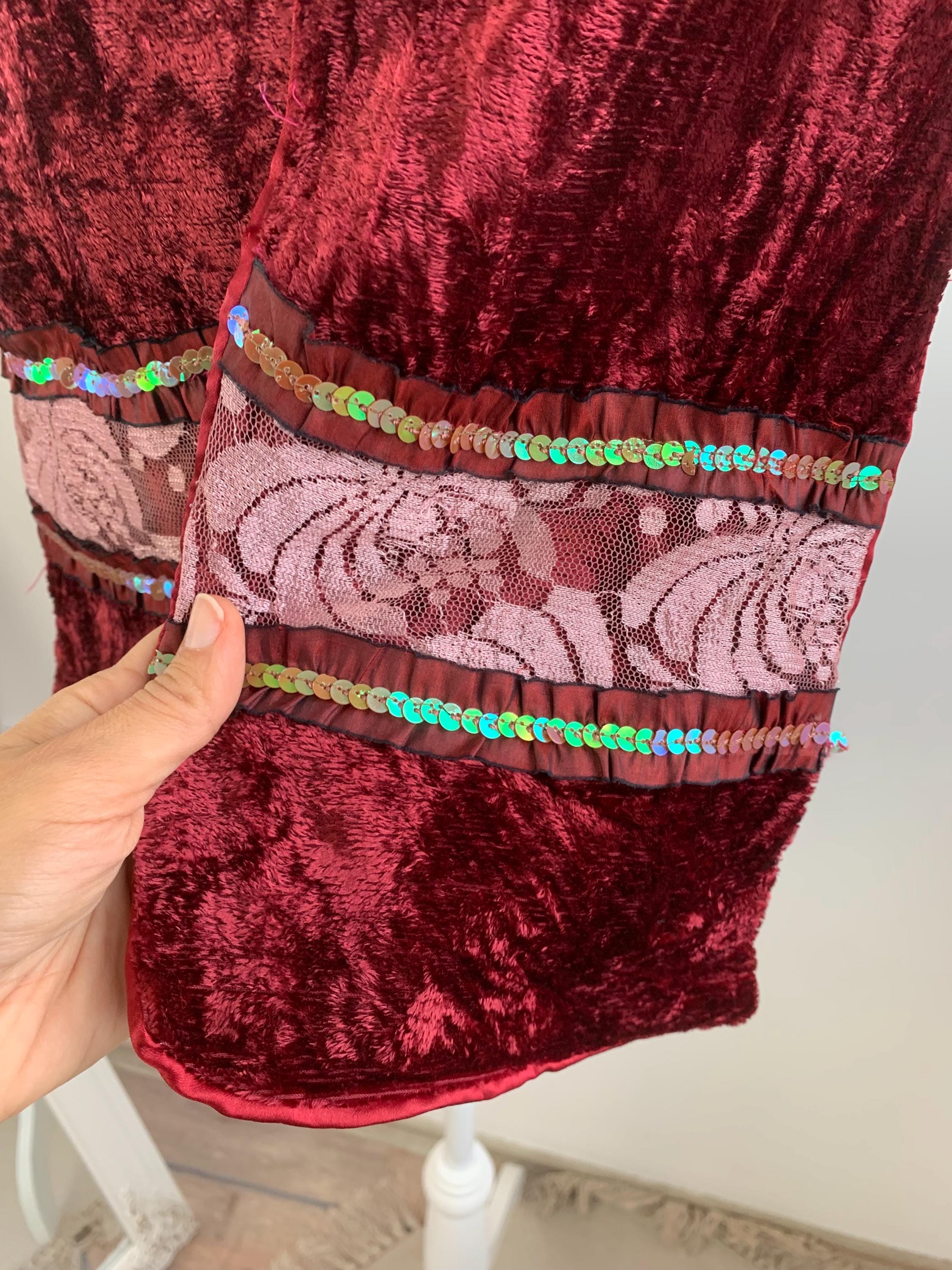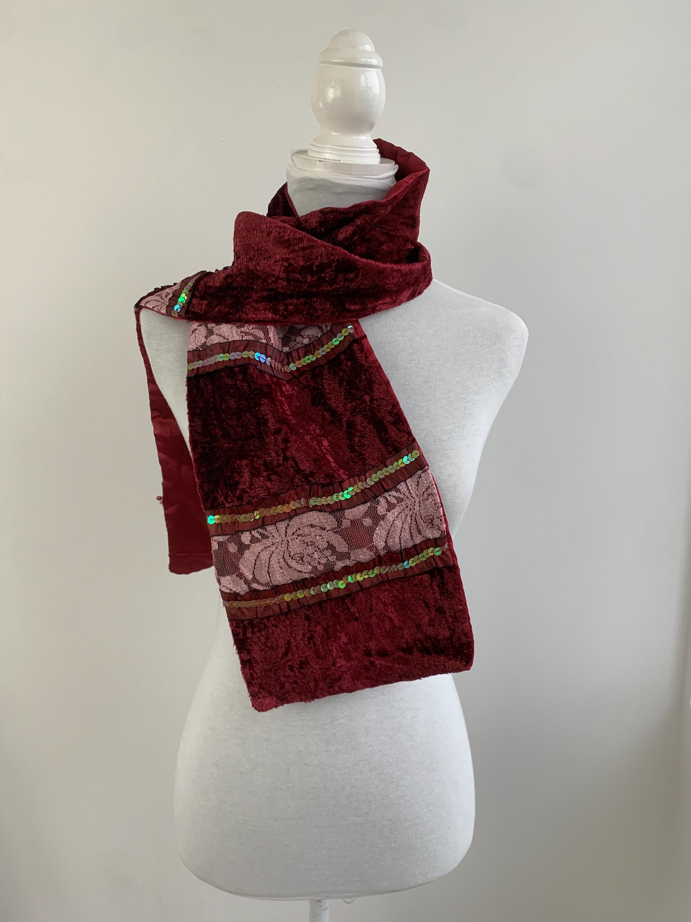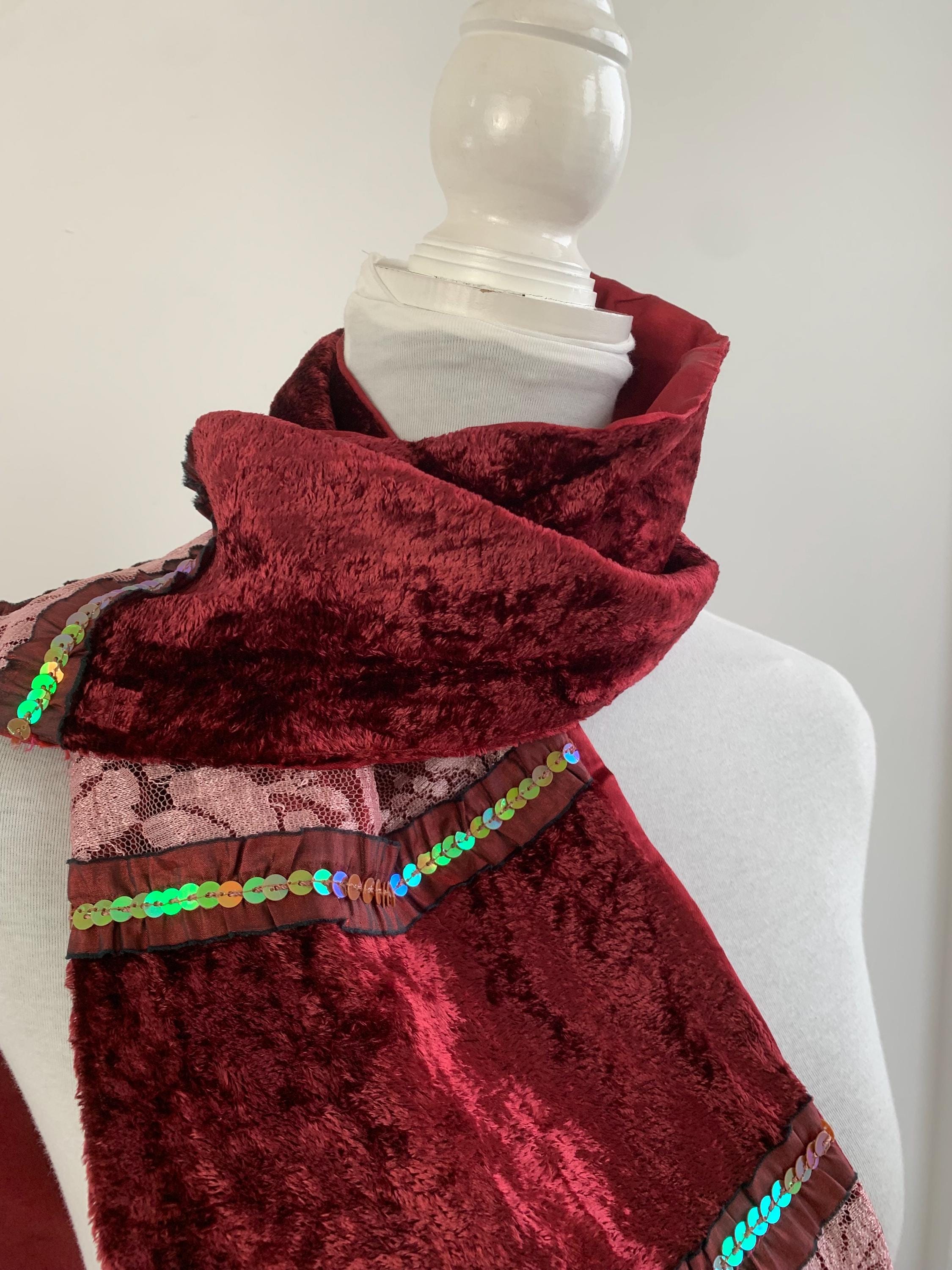 Make a glamorous statement with this rich, luxurious vintage deep red velvet scarf. This beautiful velvet narrow stope captures the opulent, maximalist trends of the late 1990s and early Y2K era. The main body is crafted from a plush, crushed burgundy velvet, which provides a stunning depth of color and softness.