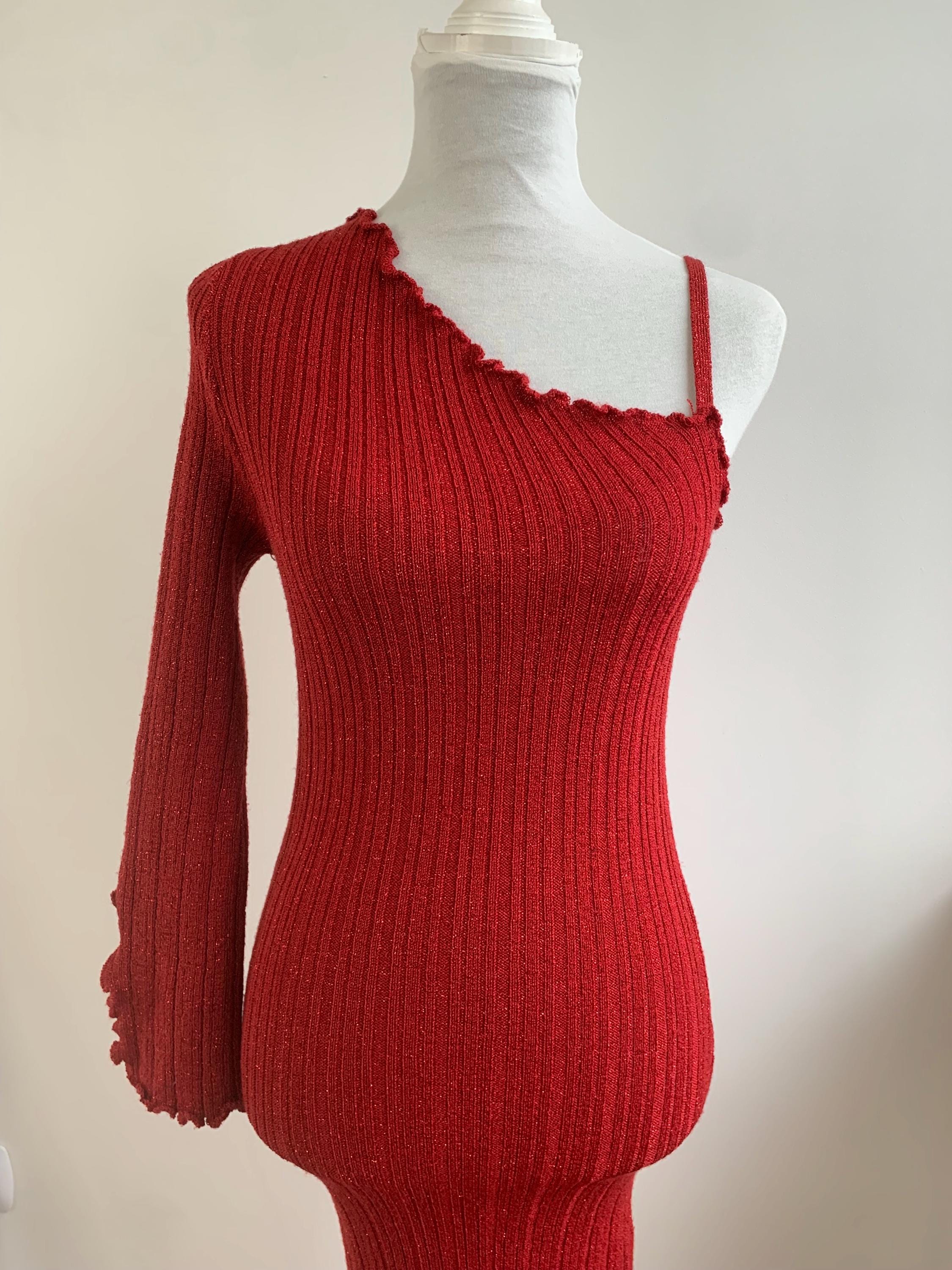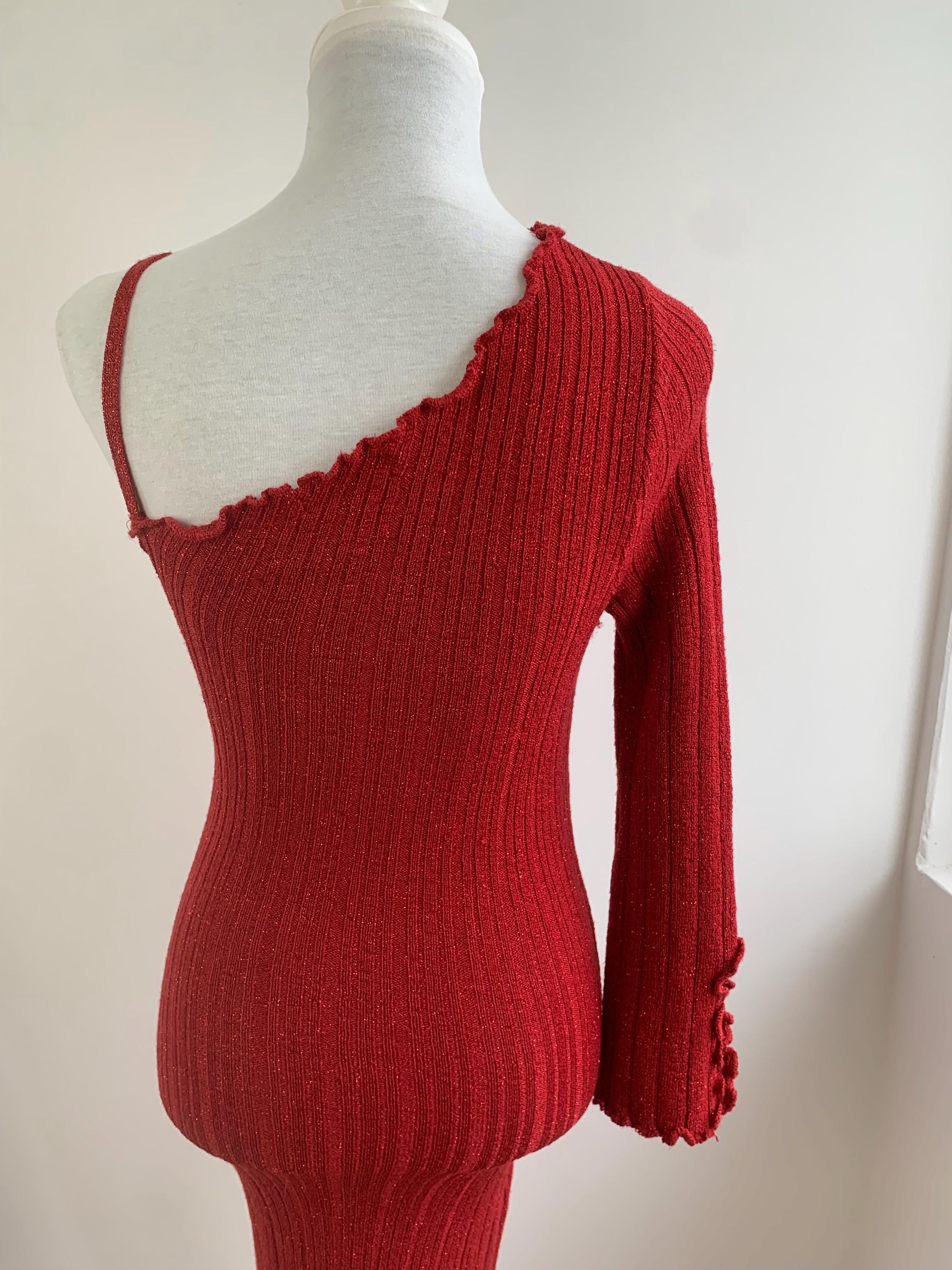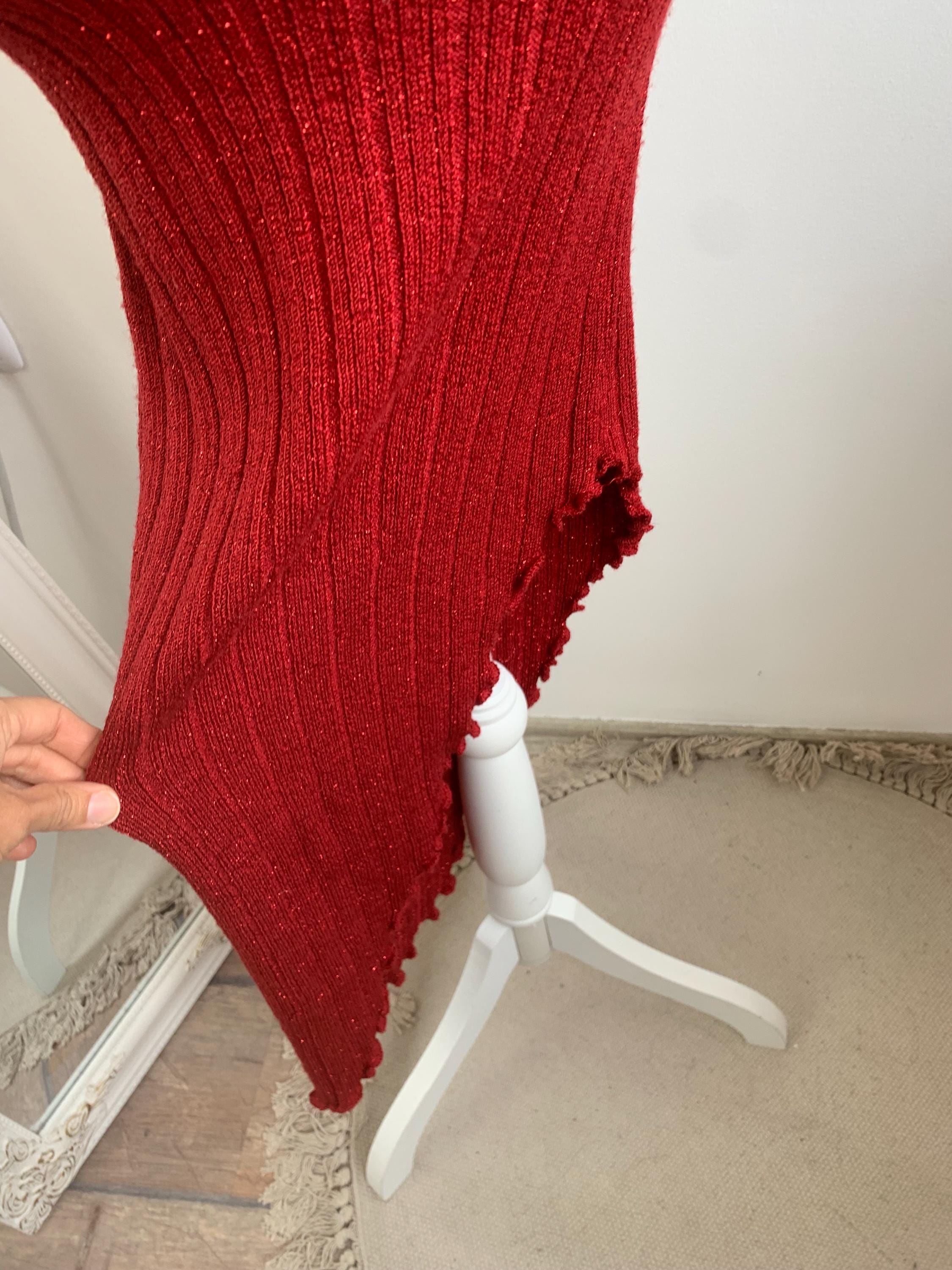 Make a dazzling entrance with this striking vintage 90s/Y2K rib knit dress. The vibrant ruby red color is shot through with subtle metallic Lurex threads, giving the entire garment a beautiful, head-turning shimmer that catches the light with every move.