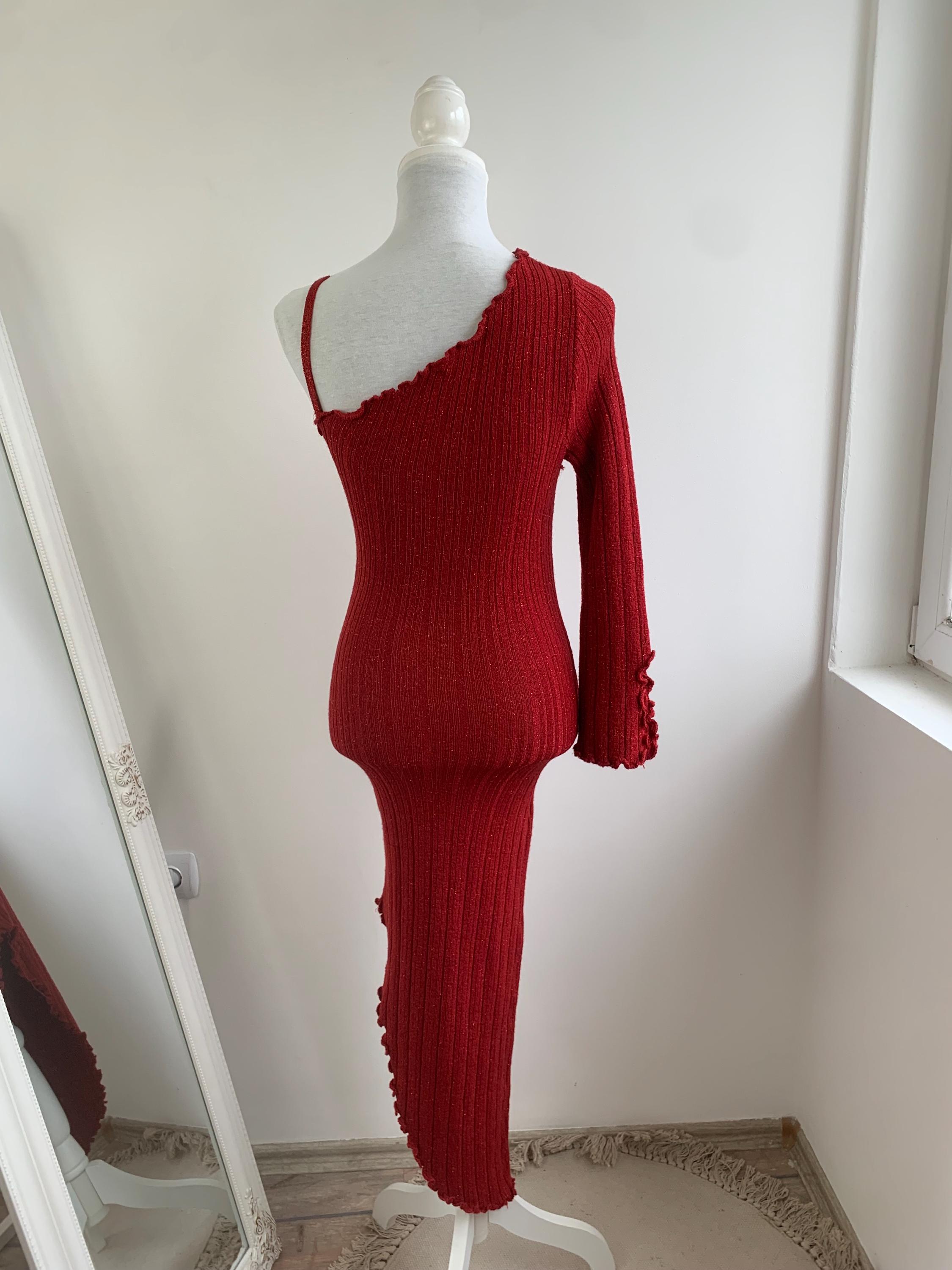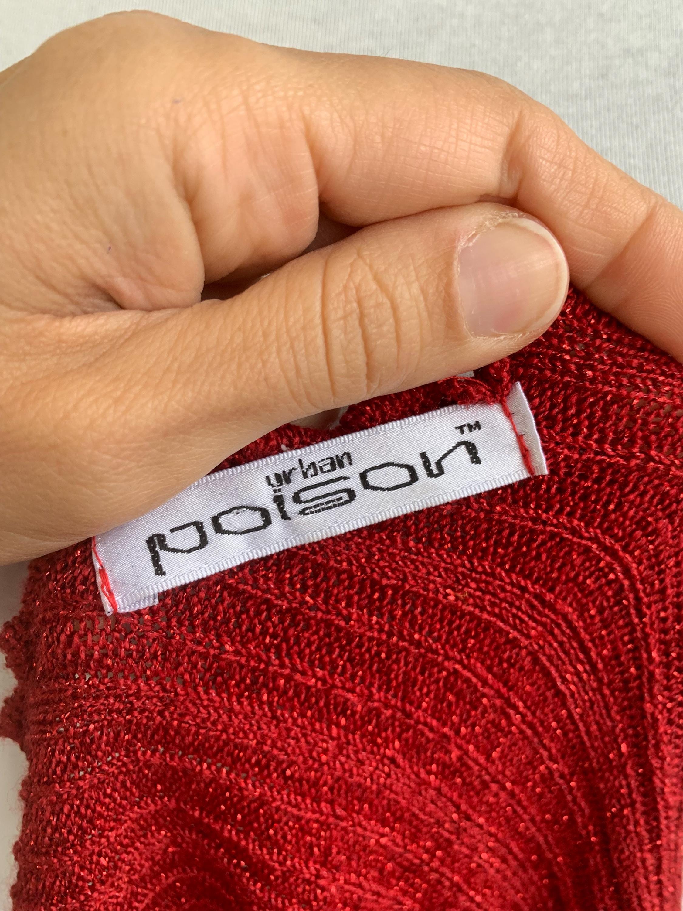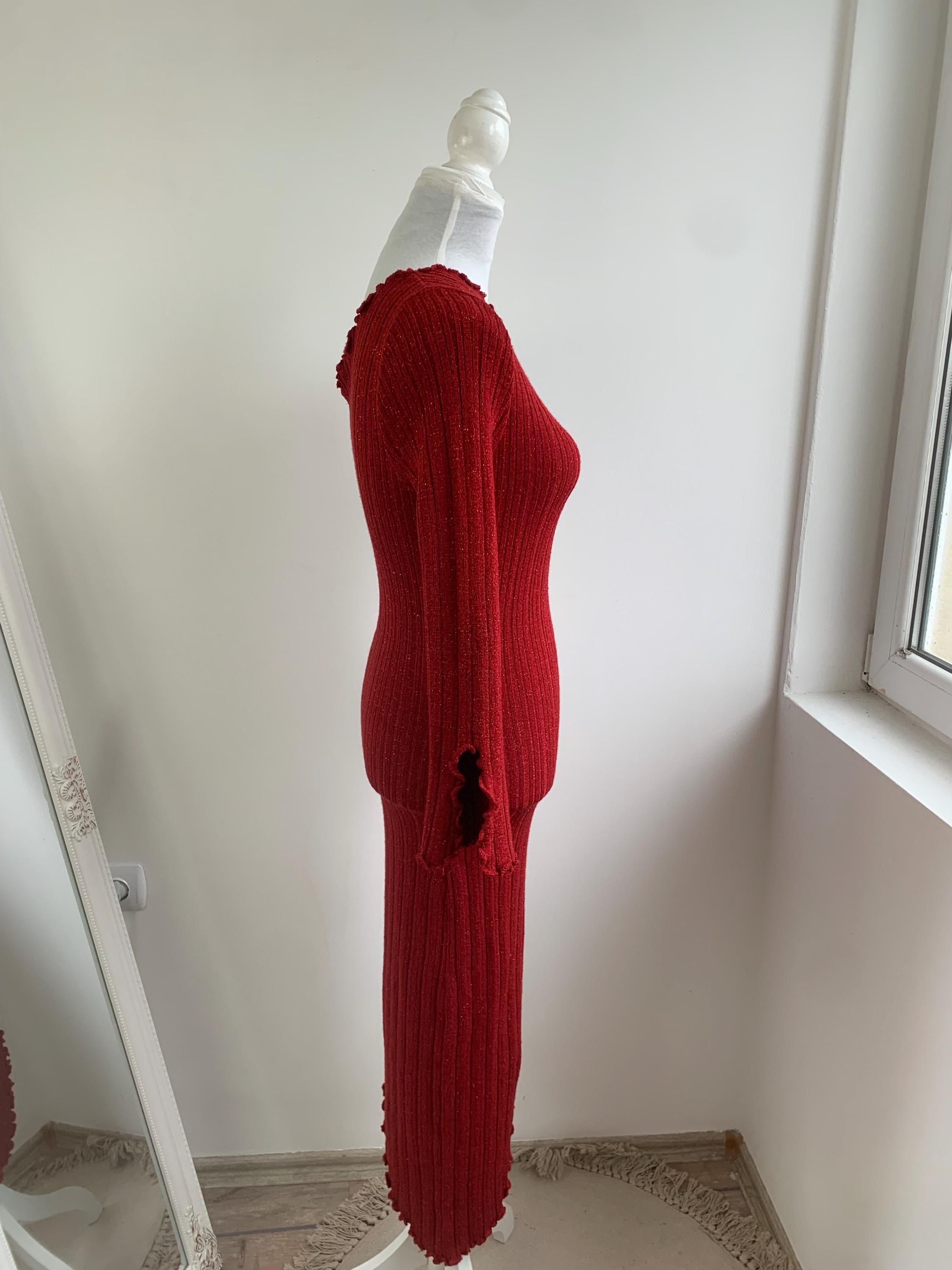 Make a dazzling entrance with this striking vintage 90s/Y2K rib knit dress. The vibrant ruby red color is shot through with subtle metallic Lurex threads, giving the entire garment a beautiful, head-turning shimmer that catches the light with every move.