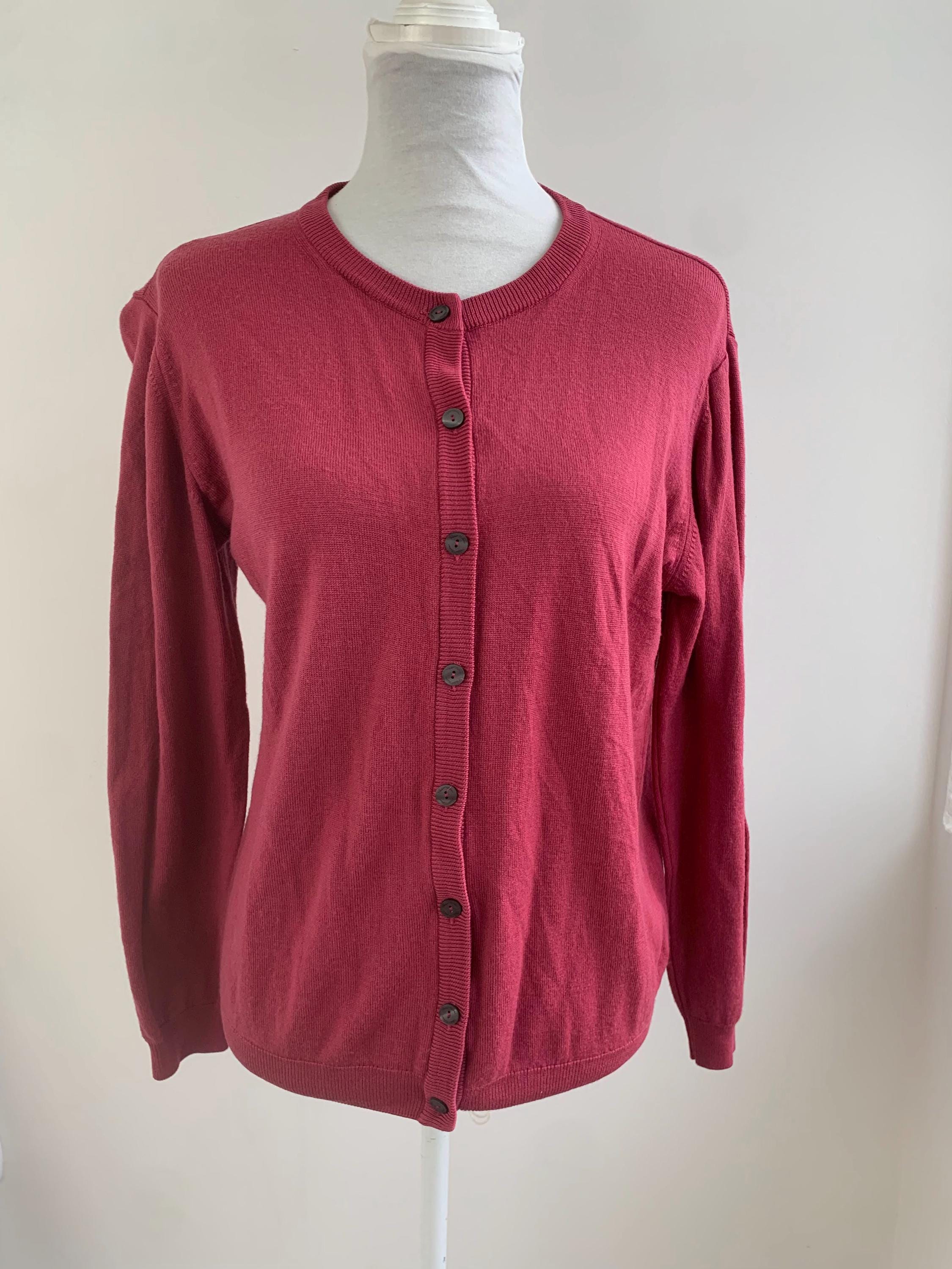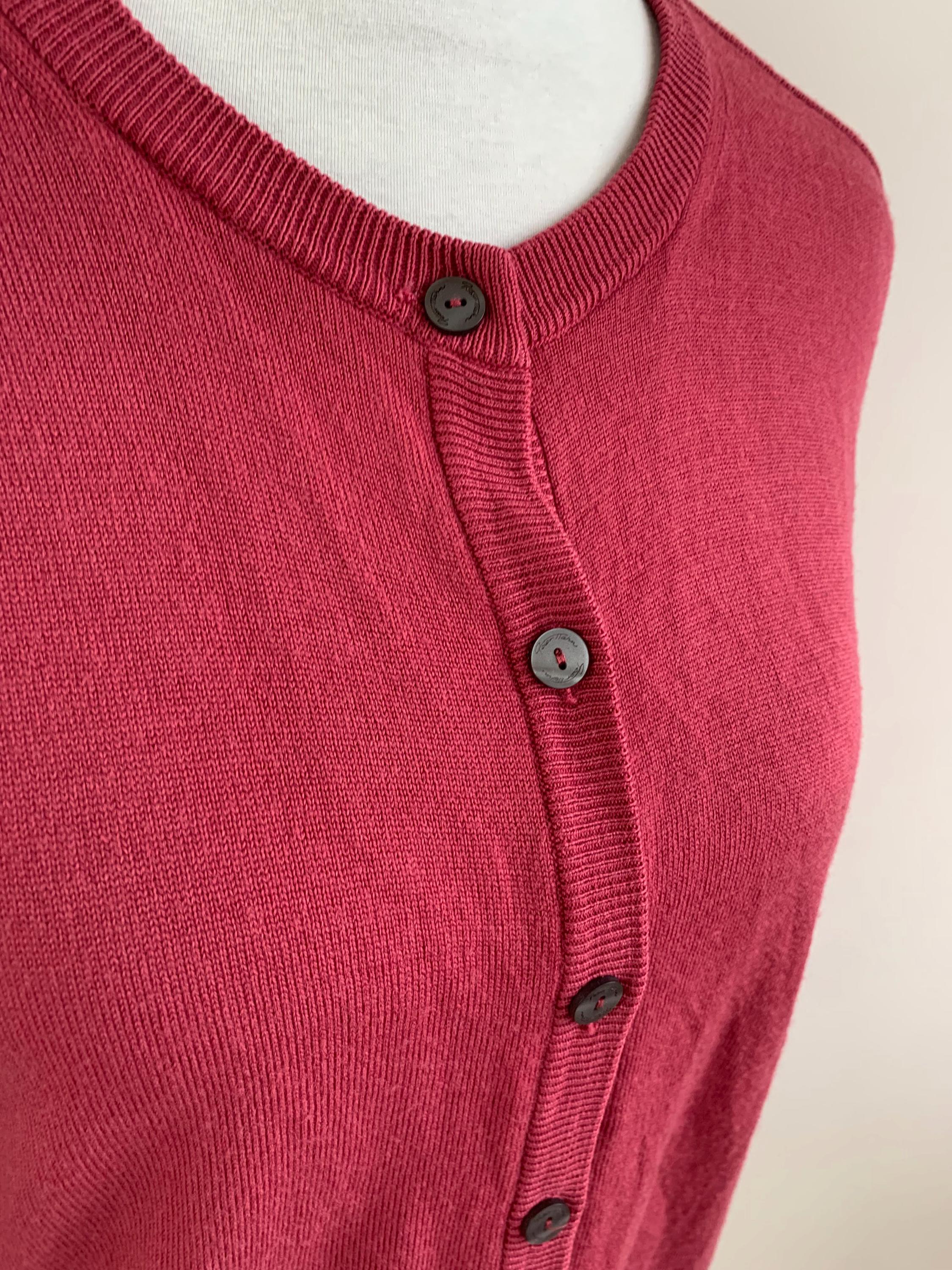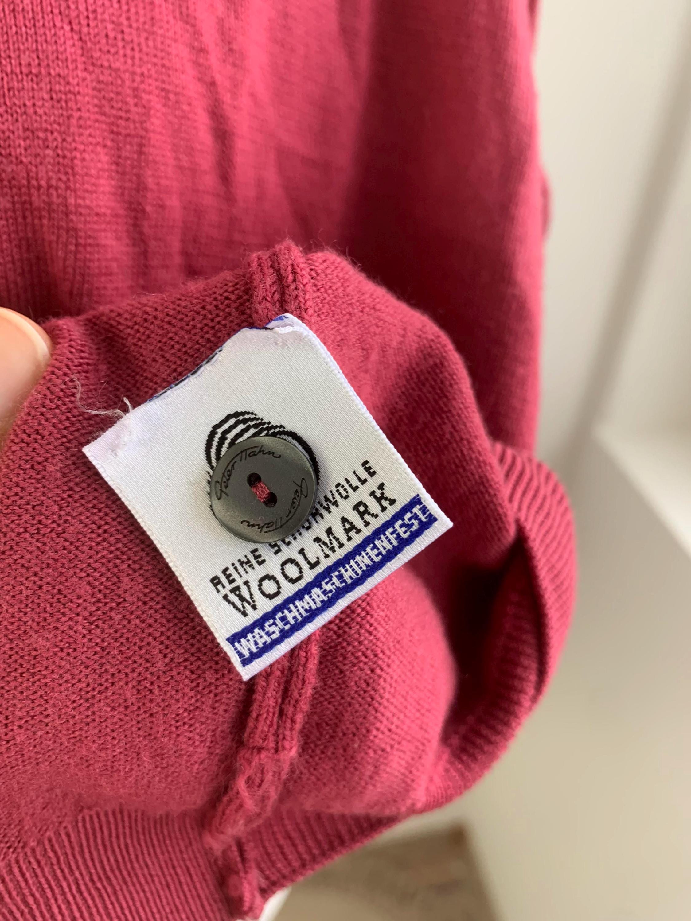 Wrap yourself in the luxurious comfort of this beautiful vintage Peter Hahn pure wool cardigan. Crafted from 100% pure Tasmanian wool—a fine, premium merino wool known for its softness and warmth without the bulk—this sweater is a timeless piece of knitwear. The rich color is a gorgeous, deep magenta or berry pink, perfect for adding a pop of color to your wardrobe.