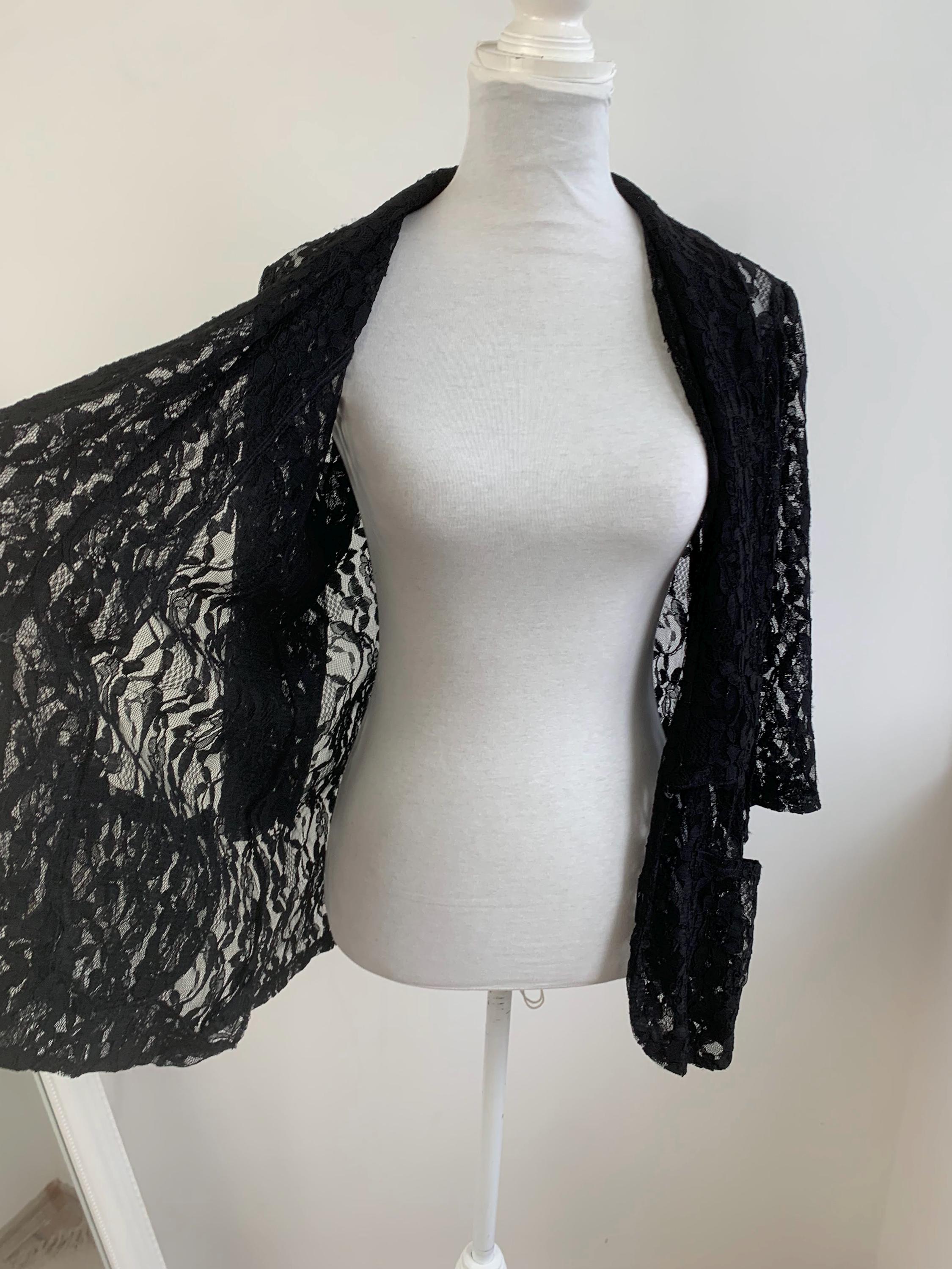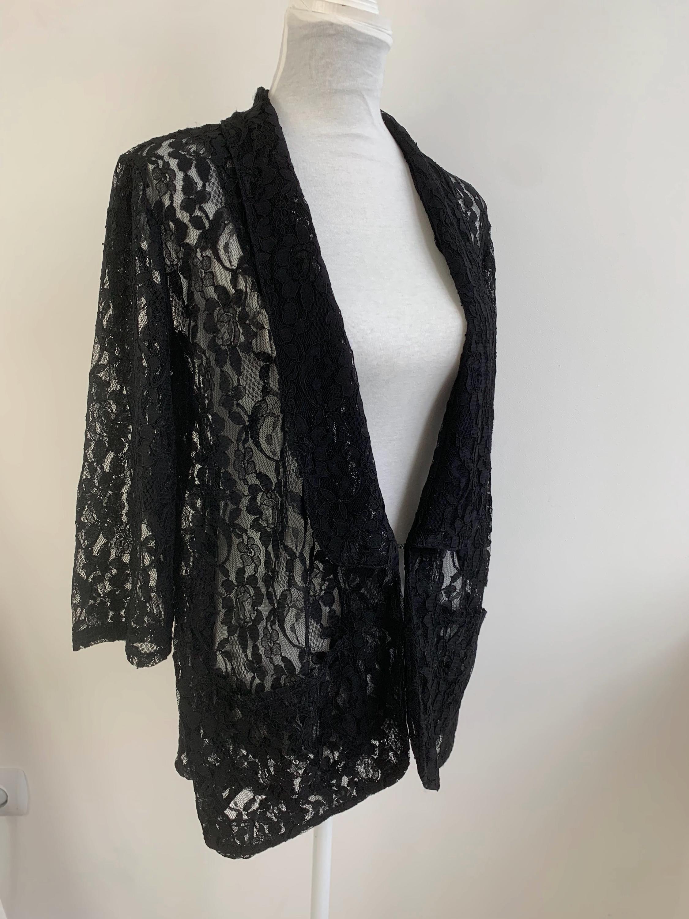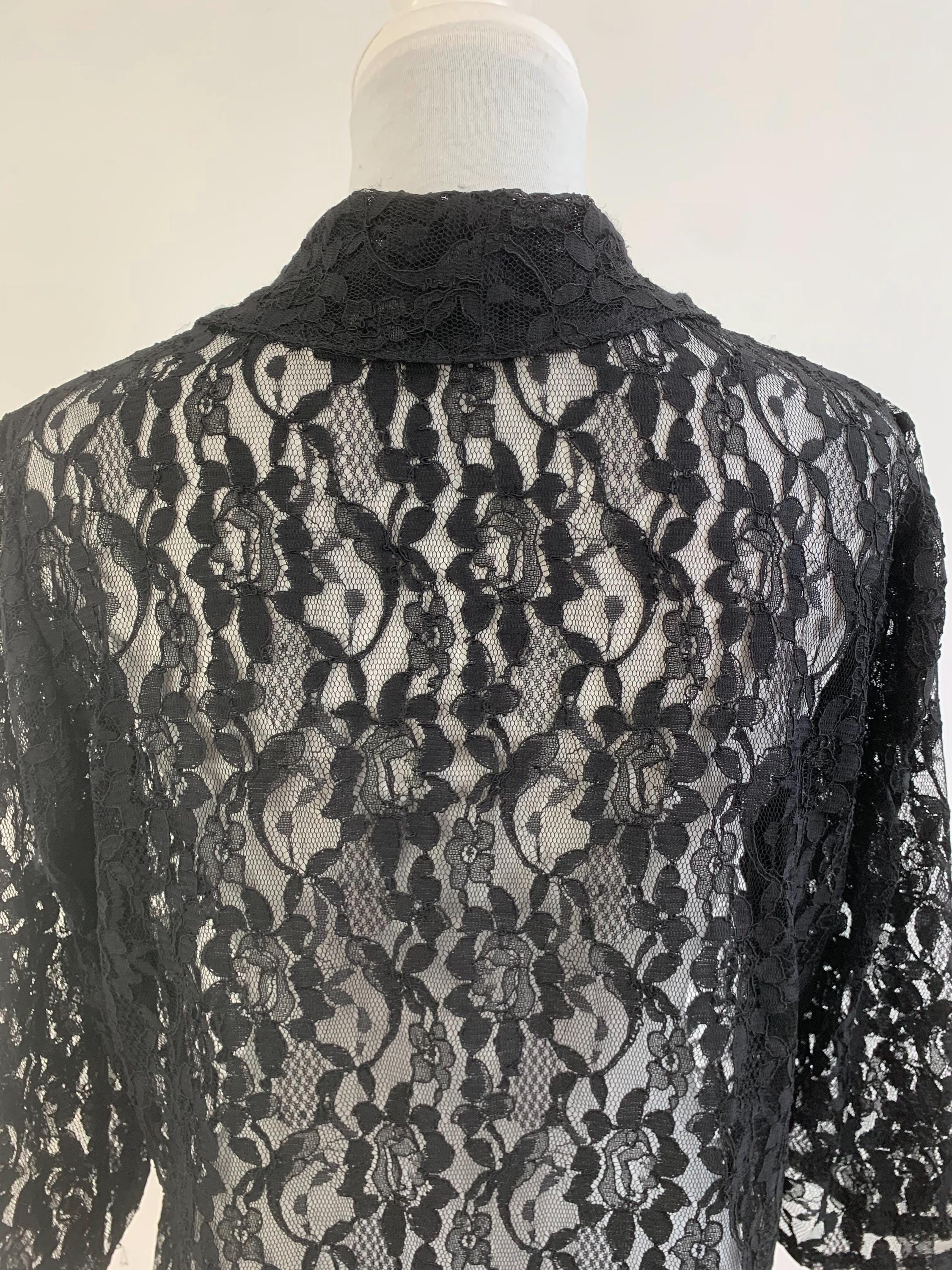 This striking vintage black lace jacket in size L/XL is a timeless piece that effortlessly transitions from a chic daytime cover-up to an elegant evening essential. Dating back to the 1990s era, this sheer, open-front cardigan features a beautiful, intricate floral lace pattern. It has a relaxed, unlined fit and 3/4 sleeves, making it perfect for layering over a camisole or sleeveless dress. The oversized shawl lapel collar adds a sophisticated touch, while the lightweight, airy fabric makes it comfortable to wear year-round. It's a versatile piece of vintage apparel ideal for special occasions, Gothic-inspired looks, weddings, or adding a touch of romance and texture to everyday outfits. It can be worn open for a flowing look or closed with the simple hook-and-eye closure at the front.