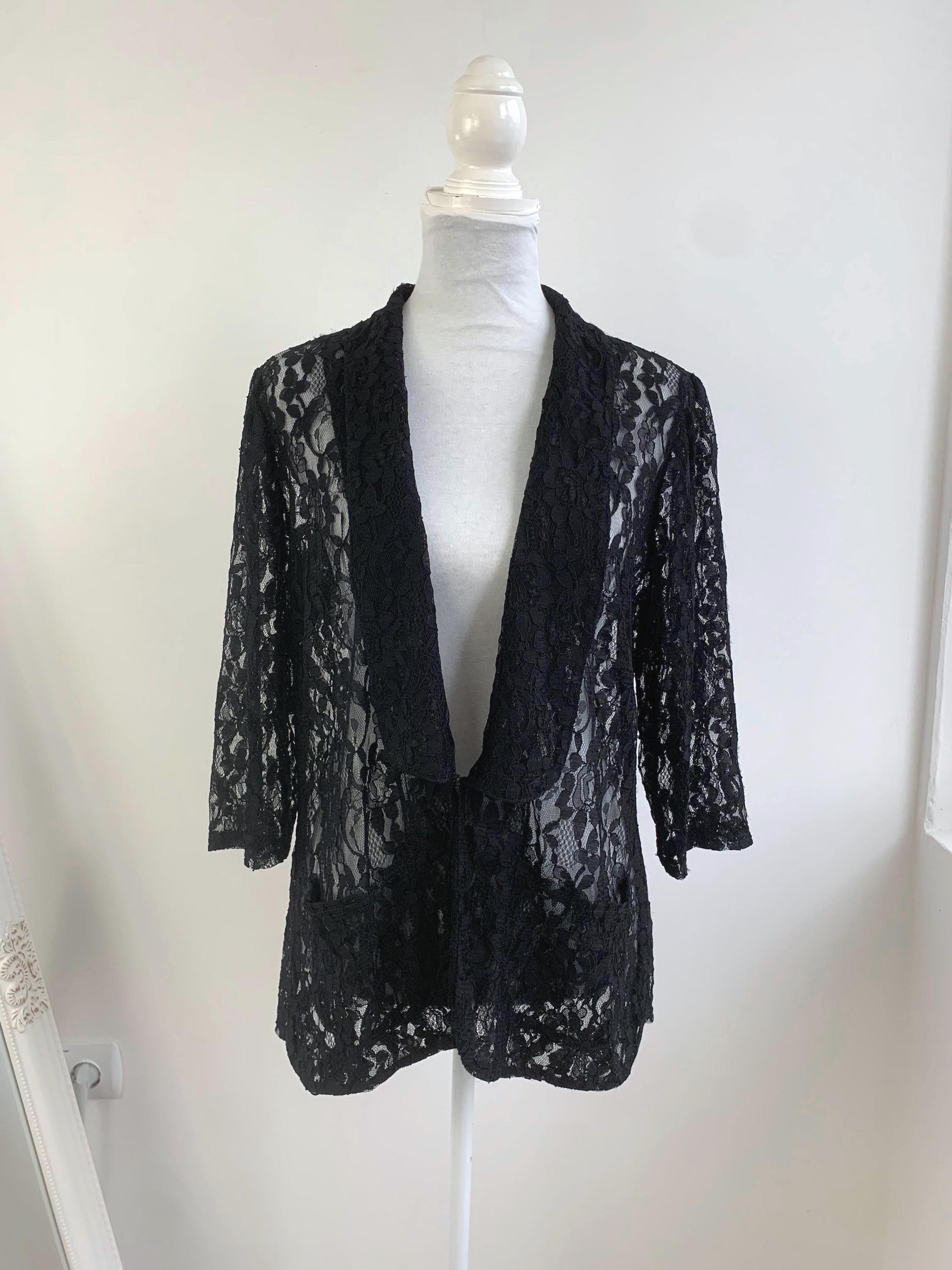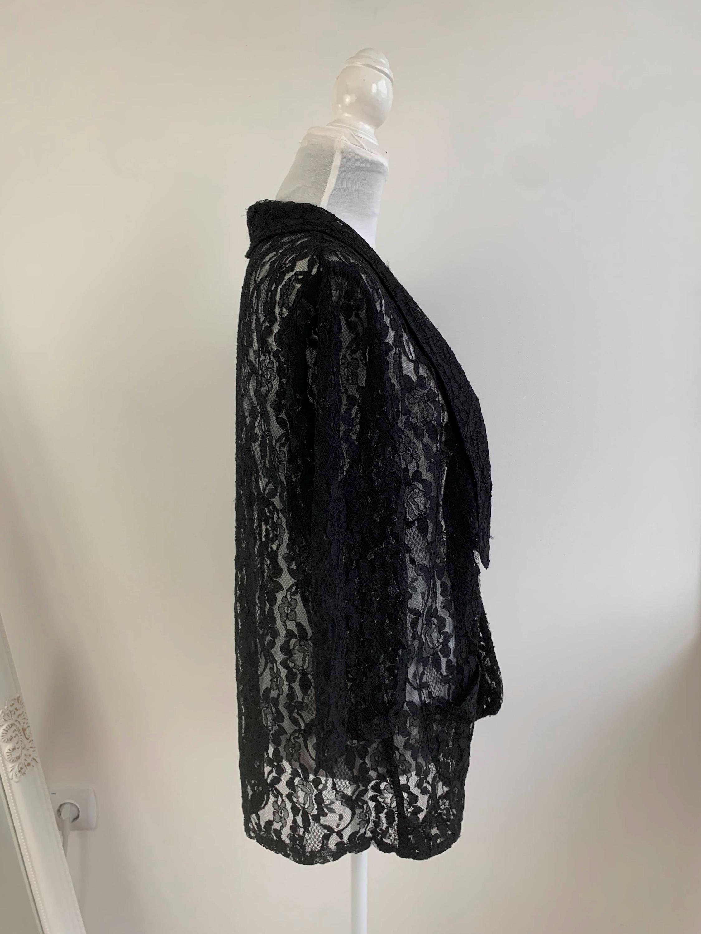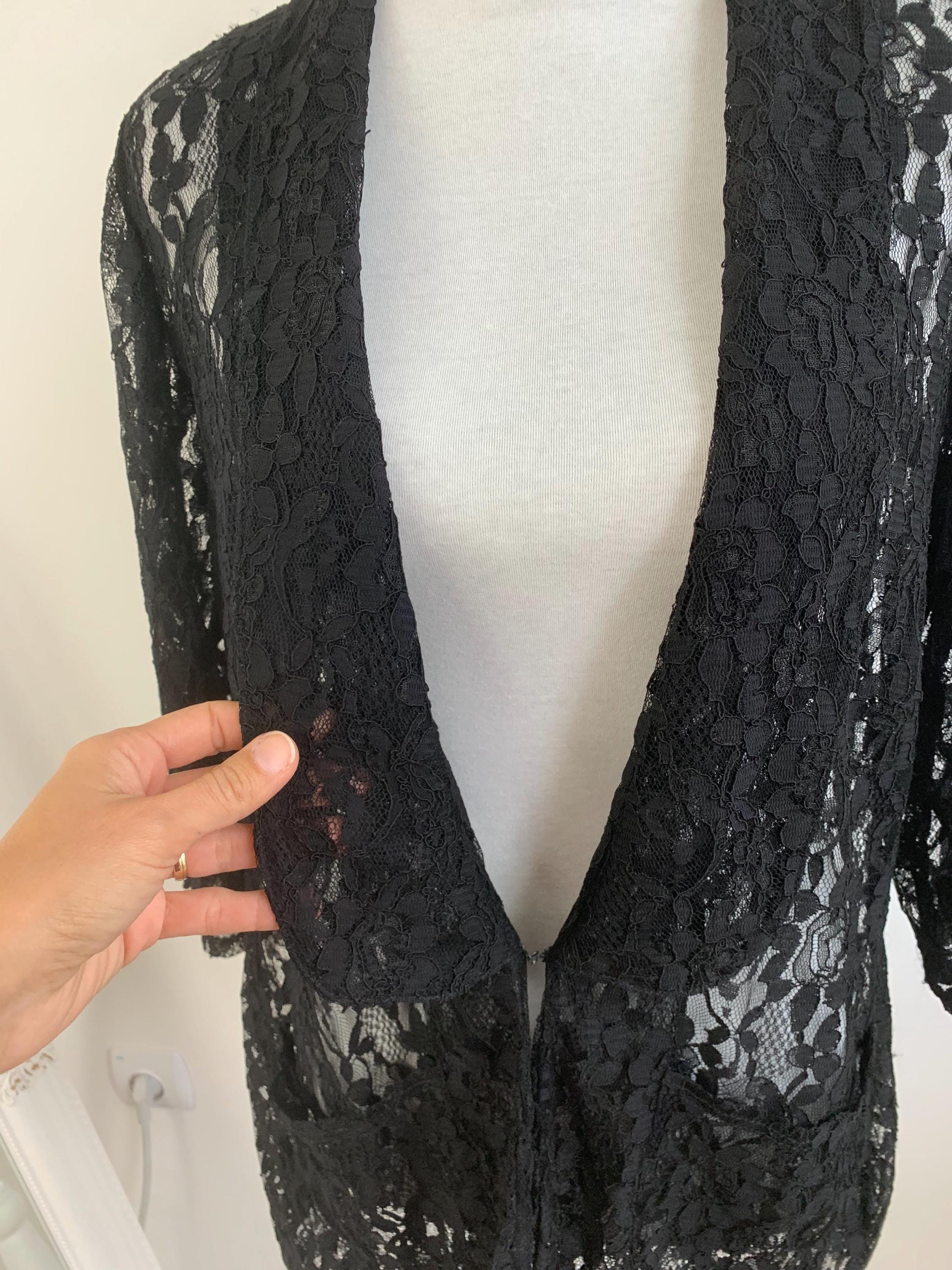 This striking vintage black lace jacket in size L/XL is a timeless piece that effortlessly transitions from a chic daytime cover-up to an elegant evening essential. Dating back to the 1990s era, this sheer, open-front cardigan features a beautiful, intricate floral lace pattern. It has a relaxed, unlined fit and 3/4 sleeves, making it perfect for layering over a camisole or sleeveless dress. The oversized shawl lapel collar adds a sophisticated touch, while the lightweight, airy fabric makes it comfortable to wear year-round. It's a versatile piece of vintage apparel ideal for special occasions, Gothic-inspired looks, weddings, or adding a touch of romance and texture to everyday outfits. It can be worn open for a flowing look or closed with the simple hook-and-eye closure at the front.
