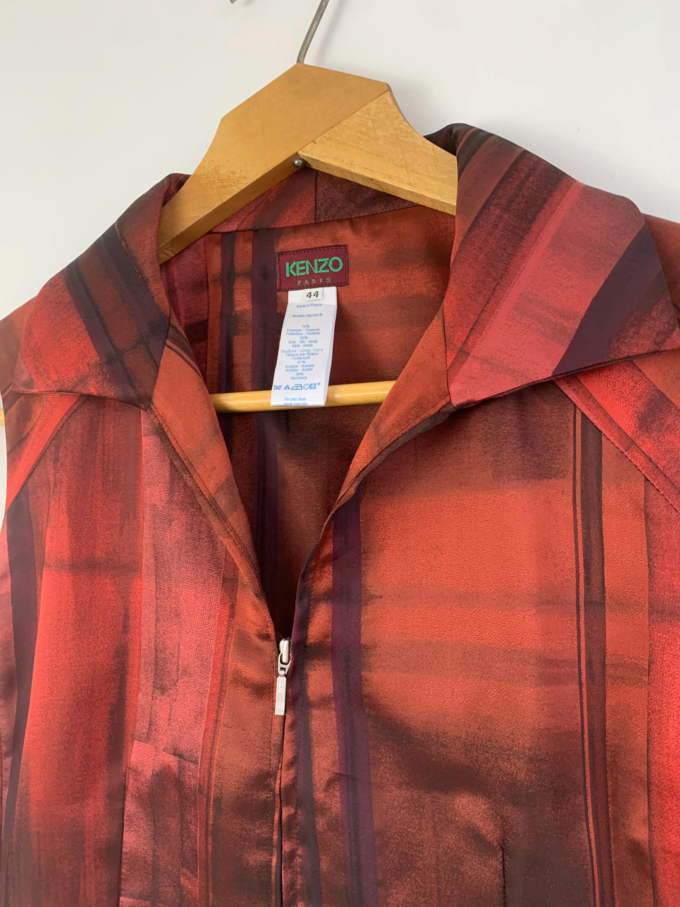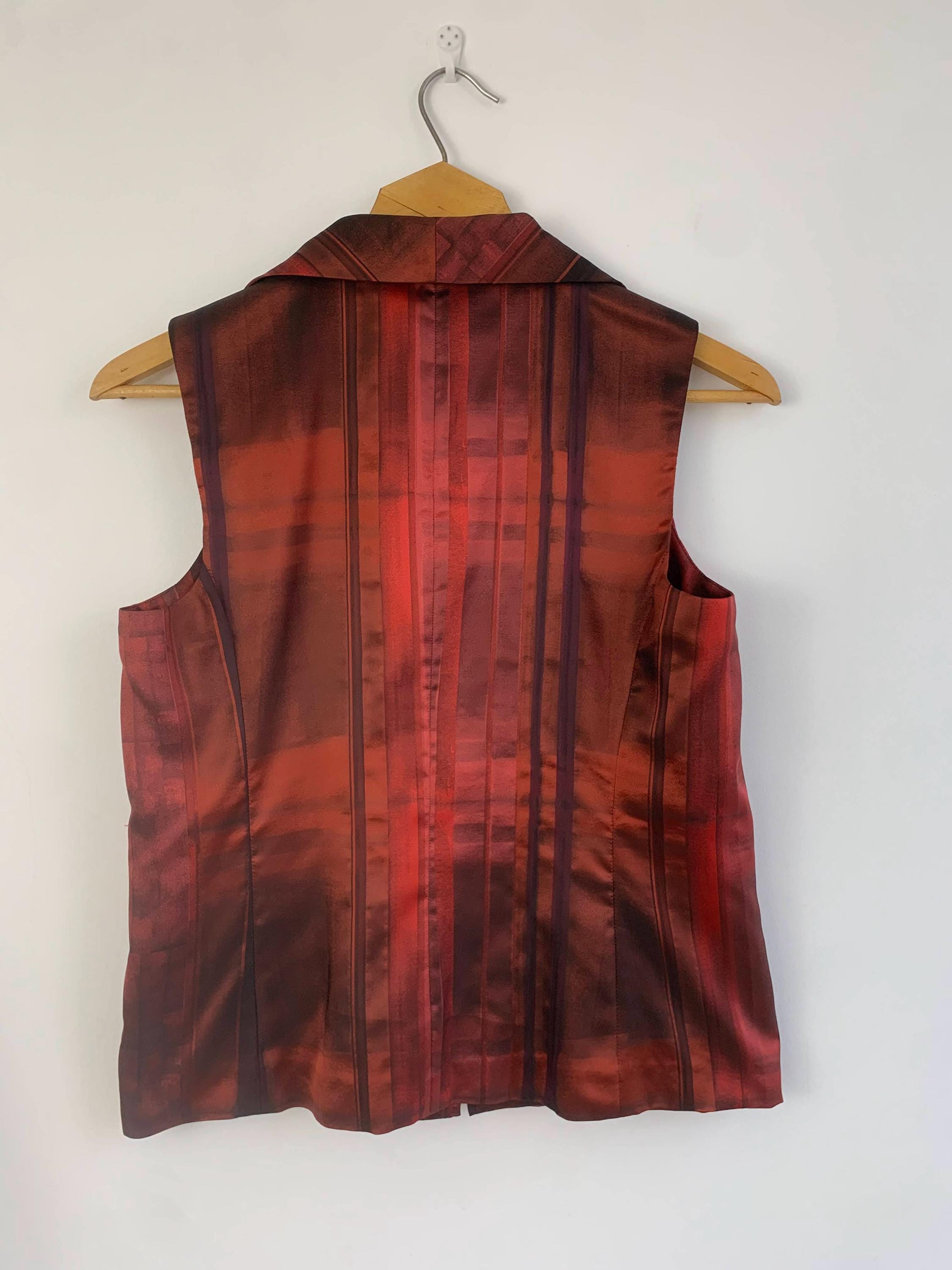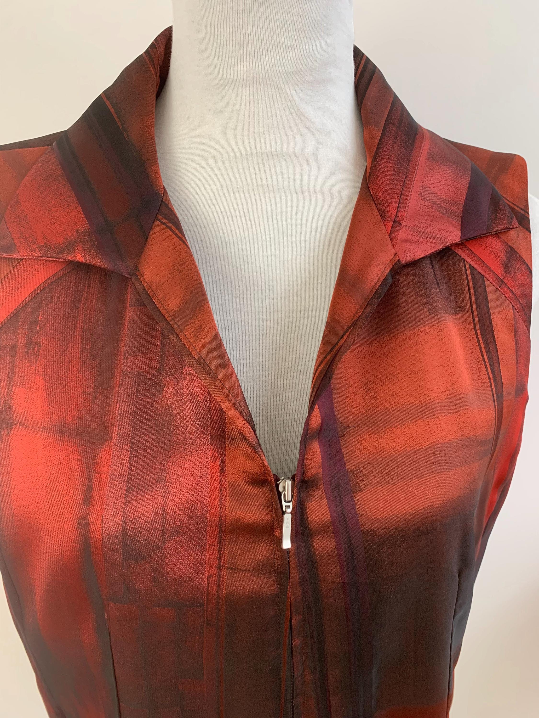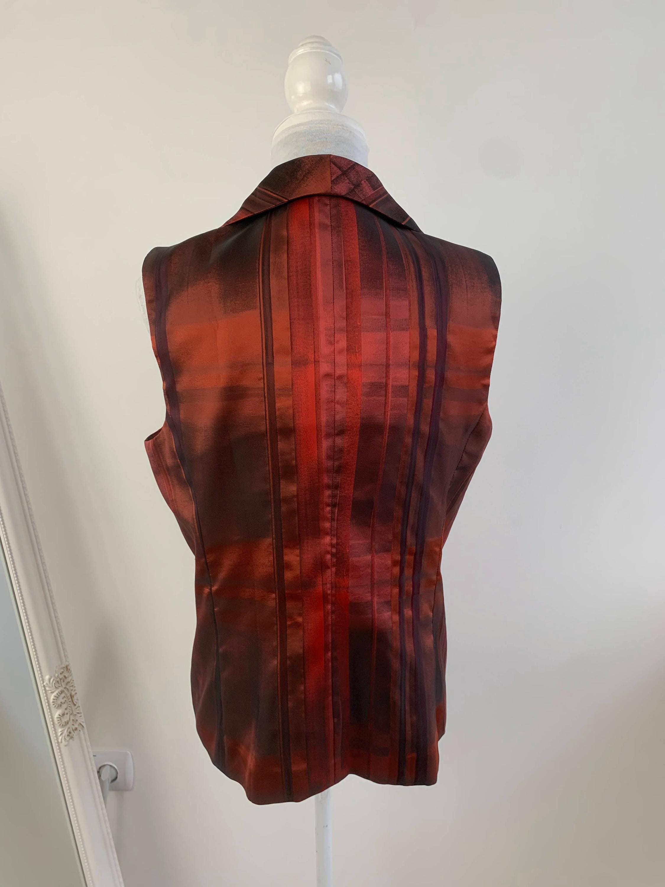 Step into the world of French designer fashion with this exquisite vintage Kenzo Paris vest for women in size L. This sophisticated sleeveless top from the late 90s, showcases Kenzo's mastery of fabric and color. The luxurious silk blend material has a beautiful subtle sheen, and the rich, abstract print features striking shades of red, burgundy, and black, giving it an iridescent effect reminiscent of a brushstroke pattern. It features a sharp, pointed collar and a full-zip front closure, making it versatile for layering or wearing on its own. The fitted, tailored silhouette and hidden zipper pockets provide a comfortable and flattering fit. This is a rare, high-end vintage designer piece that will elevate your formal wear, business attire, or sophisticated casual look.