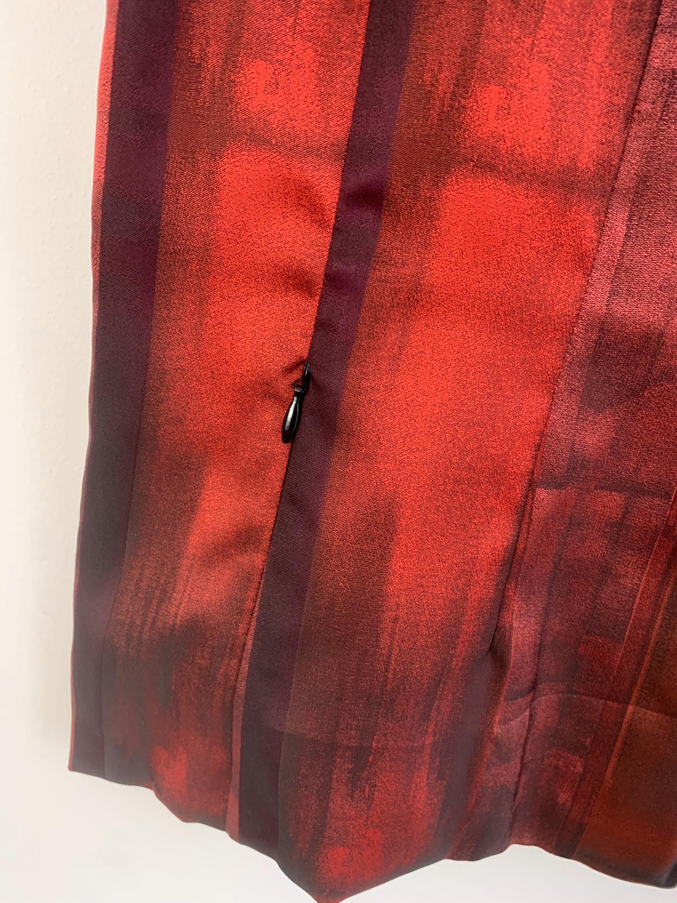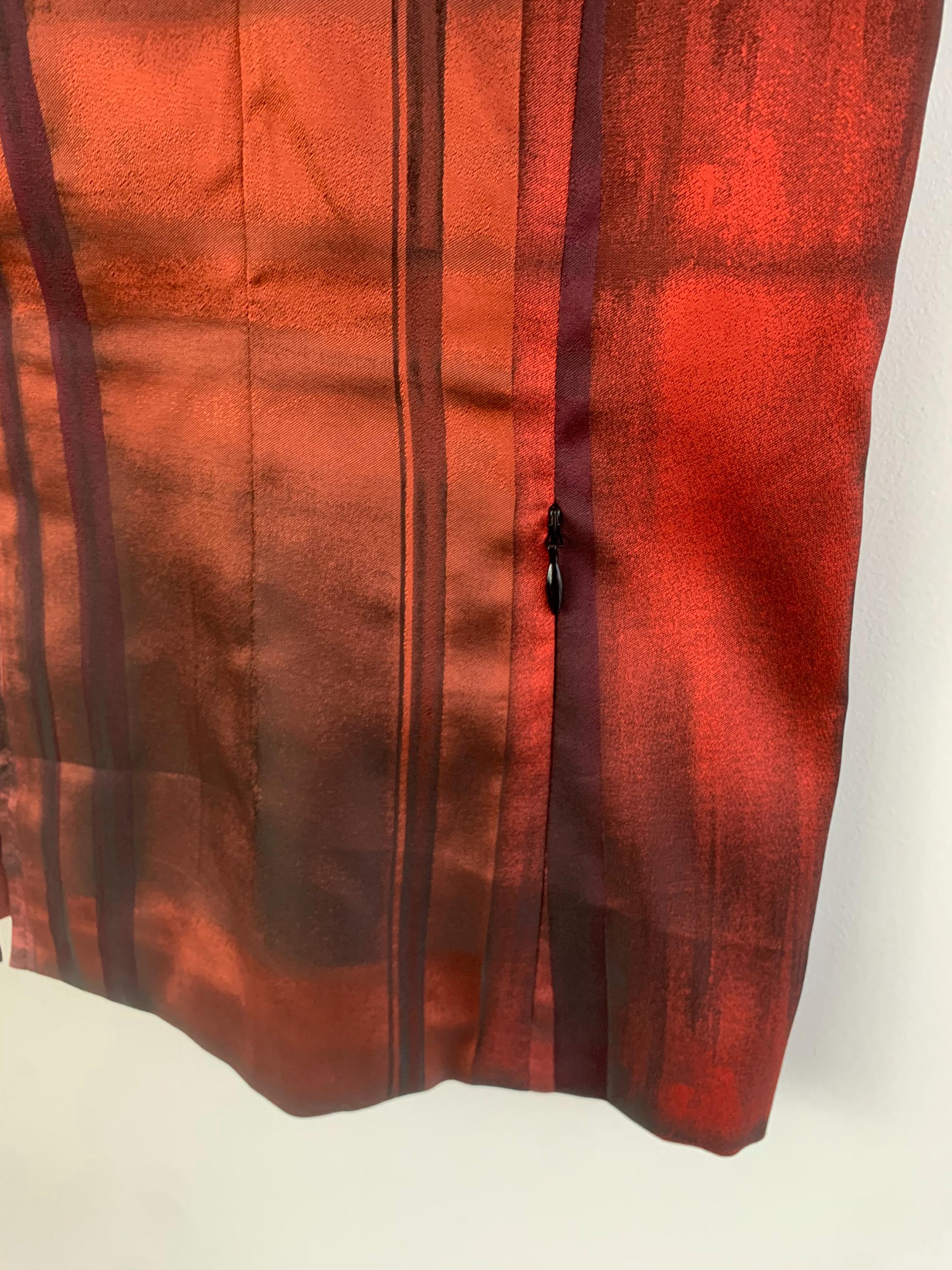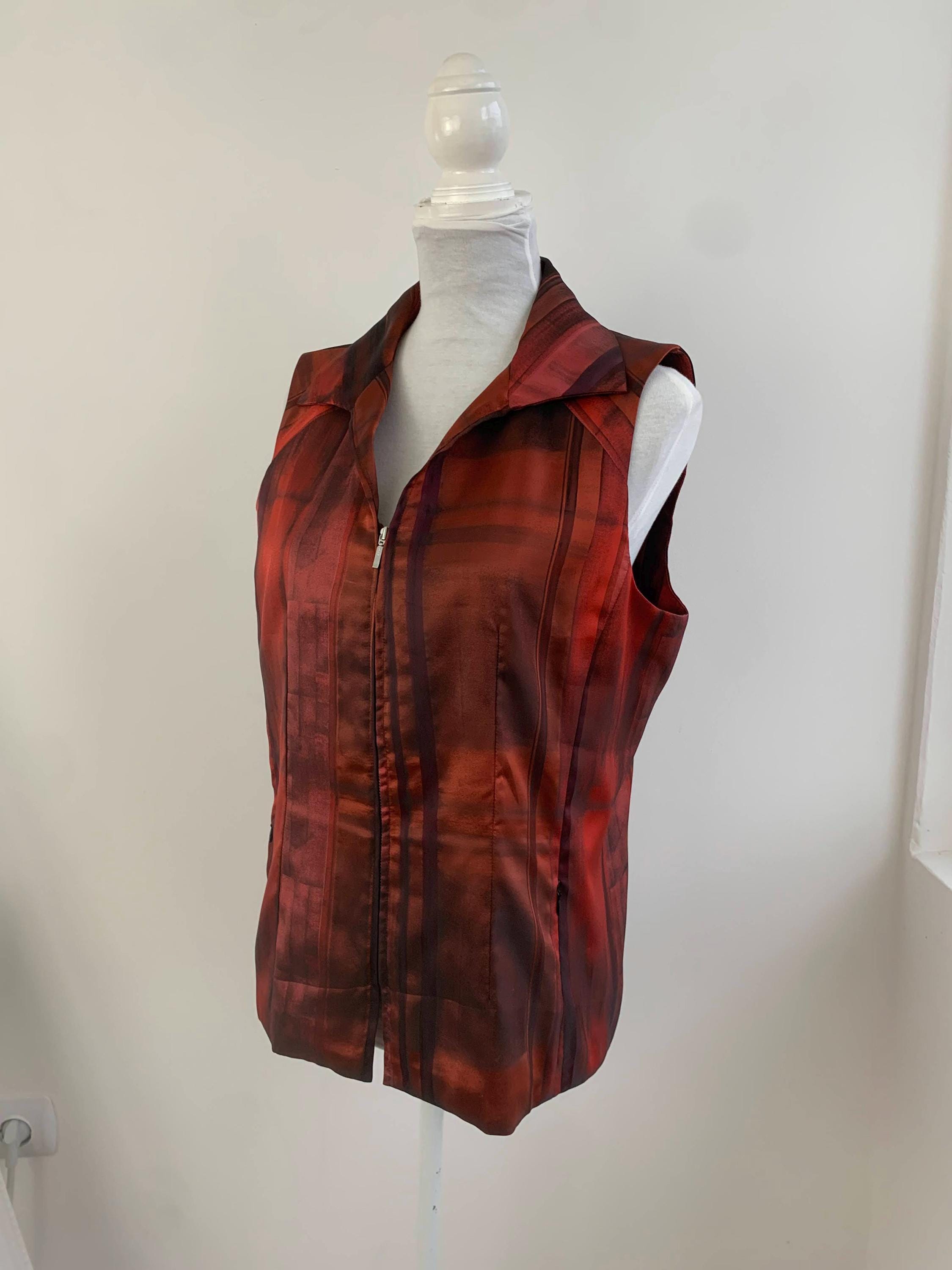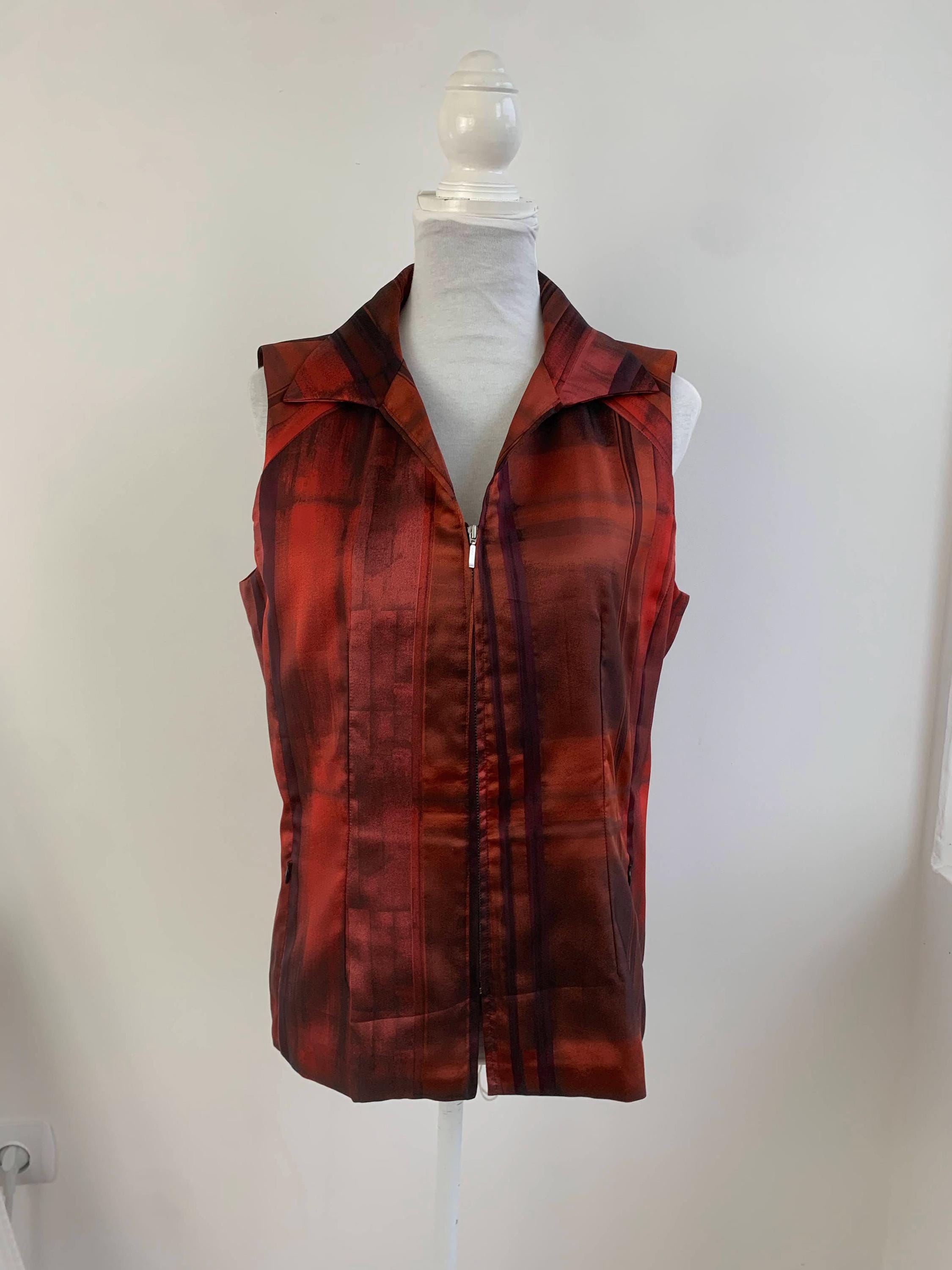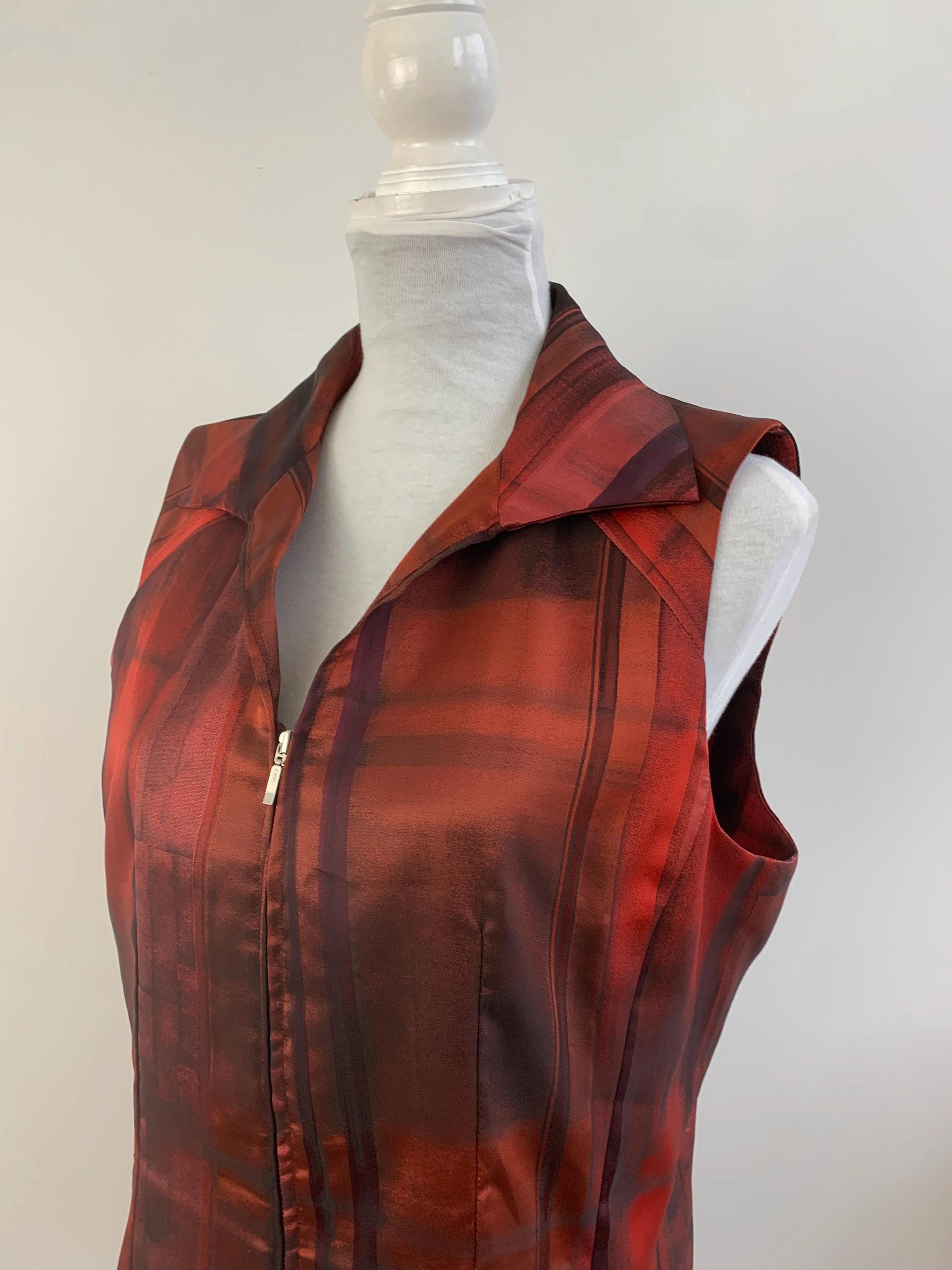 Step into the world of French designer fashion with this exquisite vintage Kenzo Paris vest for women in size L. This sophisticated sleeveless top from the late 90s, showcases Kenzo's mastery of fabric and color. The luxurious silk blend material has a beautiful subtle sheen, and the rich, abstract print features striking shades of red, burgundy, and black, giving it an iridescent effect reminiscent of a brushstroke pattern. It features a sharp, pointed collar and a full-zip front closure, making it versatile for layering or wearing on its own. The fitted, tailored silhouette and hidden zipper pockets provide a comfortable and flattering fit. This is a rare, high-end vintage designer piece that will elevate your formal wear, business attire, or sophisticated casual look.