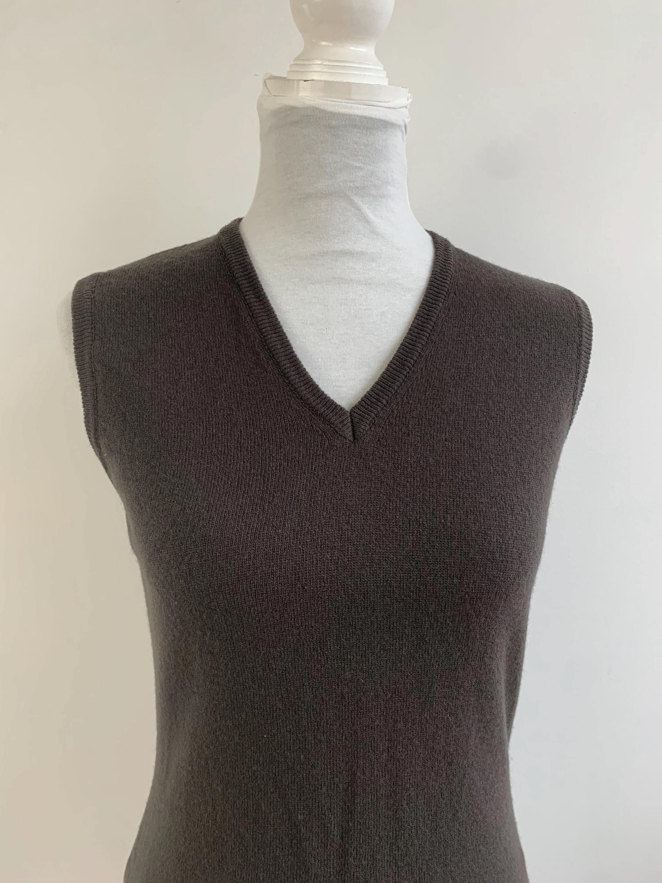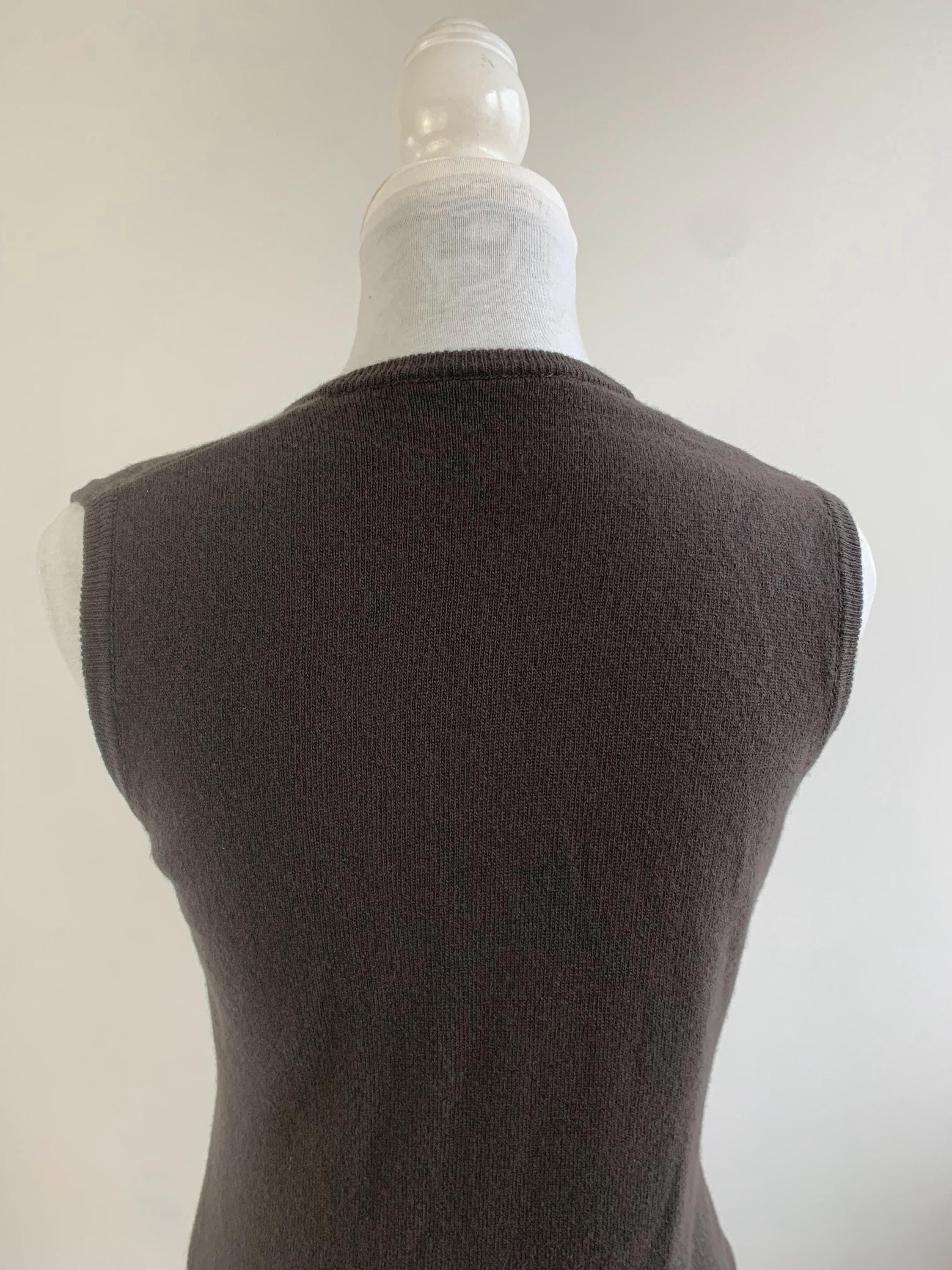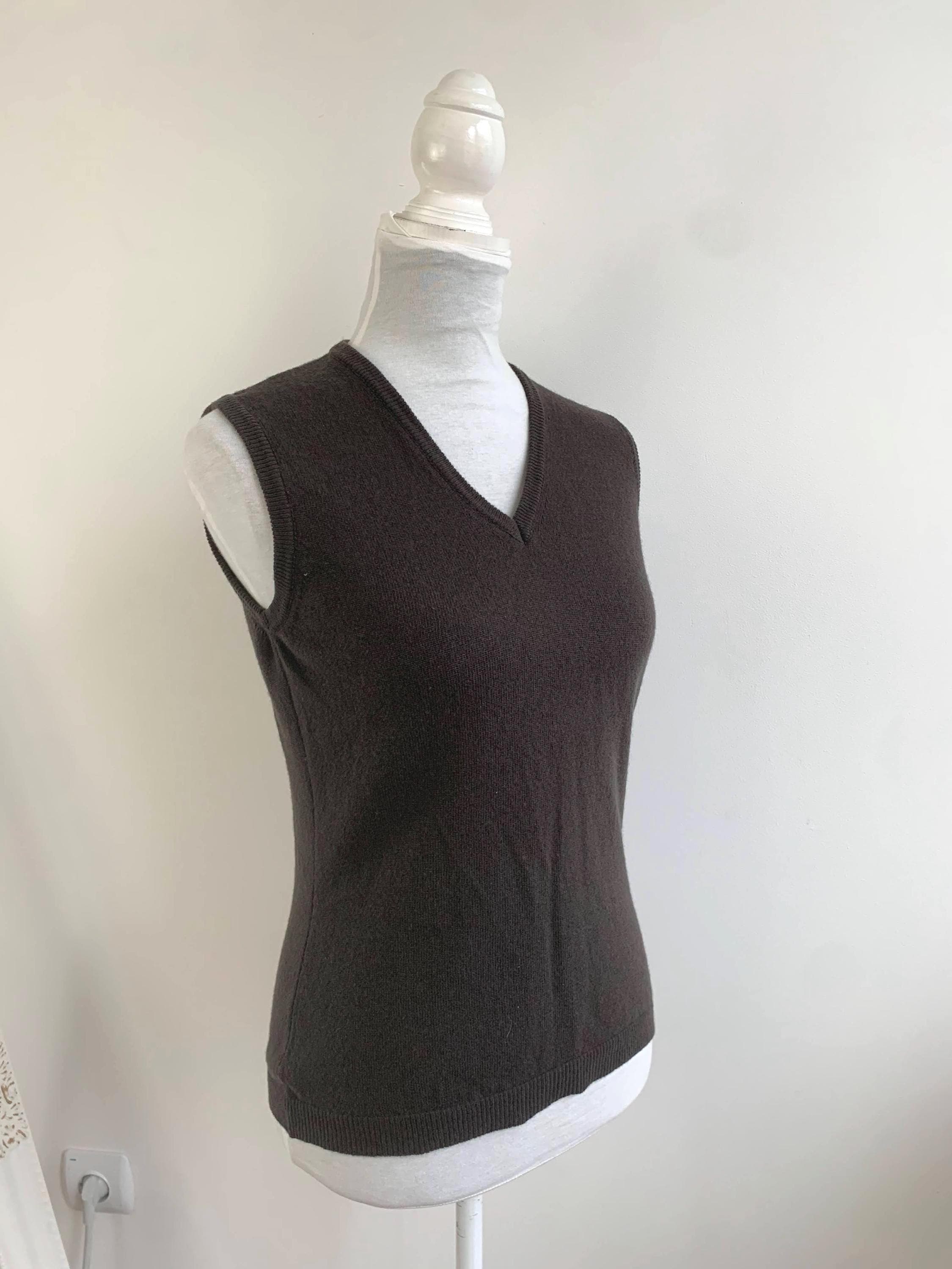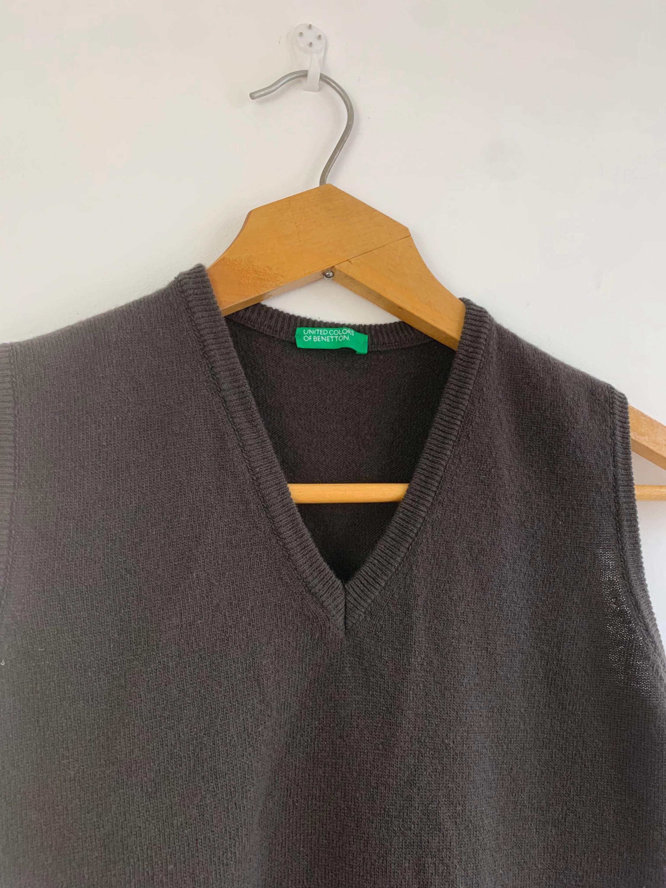 This classic dark brown sweater vest is a beautiful example of timeless 90s fashion from United Colors of Benetton in size S. Crafted from luxurious 100% wool, this piece is incredibly soft, lightweight, and perfect for layering through the transitional seasons. The deep, rich khaki brown color and minimalist V-neck design make it an exceptionally versatile wardrobe staple. This pure wool knit vest embodies the quintessential preppy and minimalist styles that are so popular today. Layer it over a crisp white button-down for a classic academic look, wear it alone as a chic sleeveless knit top, or pair it with wide-leg trousers for a contemporary silhouette. Its slim-fit, Italian styling offers a sophisticated, flattering look. This vintage Benetton piece is a high-quality, sustainable addition to any closet, ideal for those who appreciate classic 90s aesthetic and natural fibers.