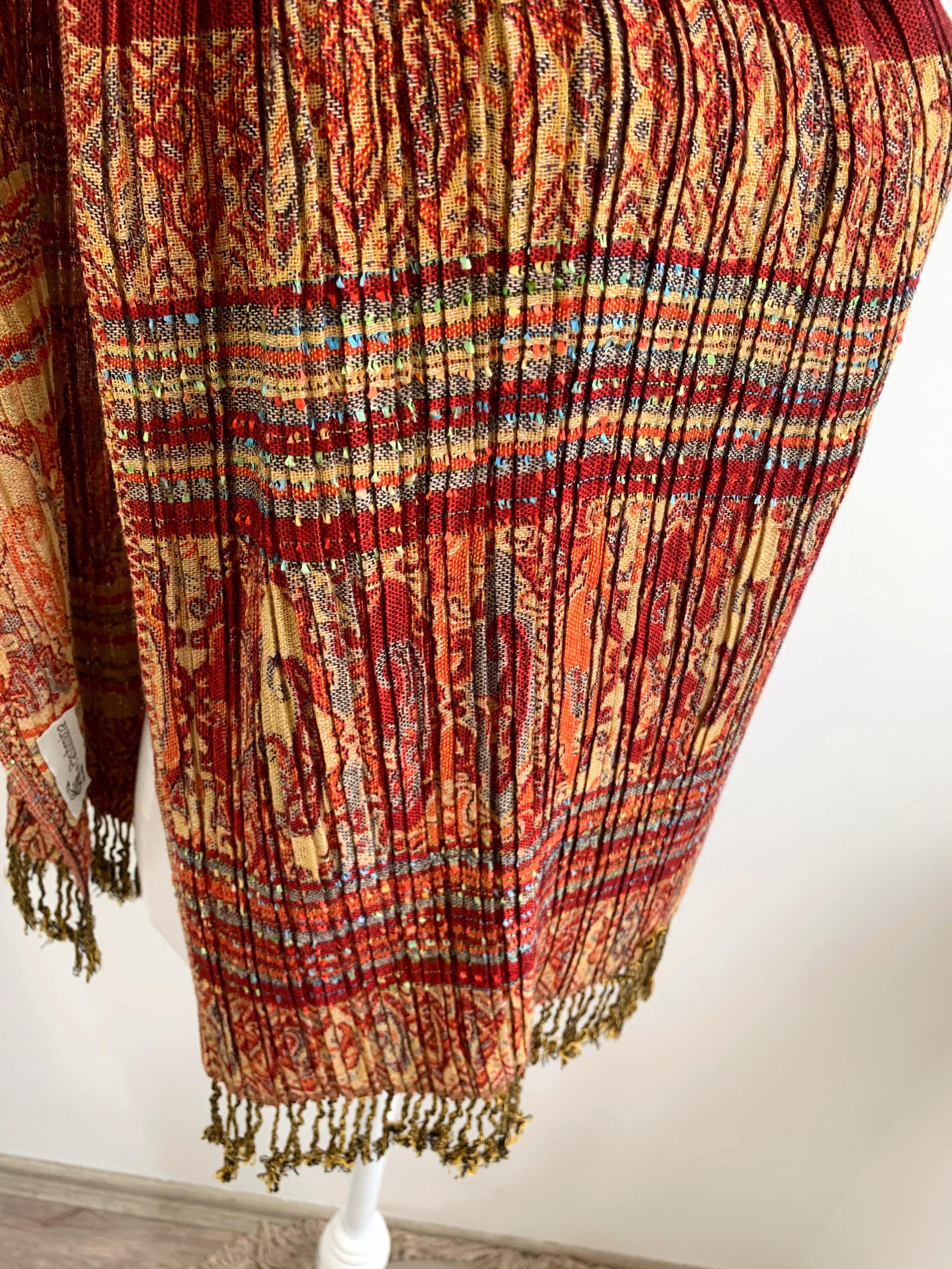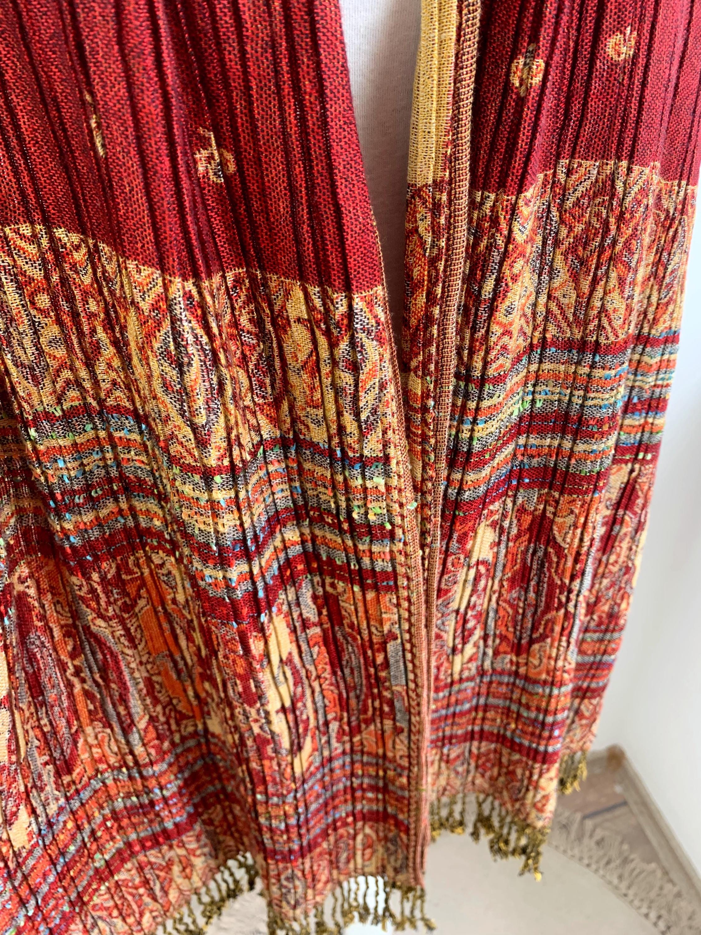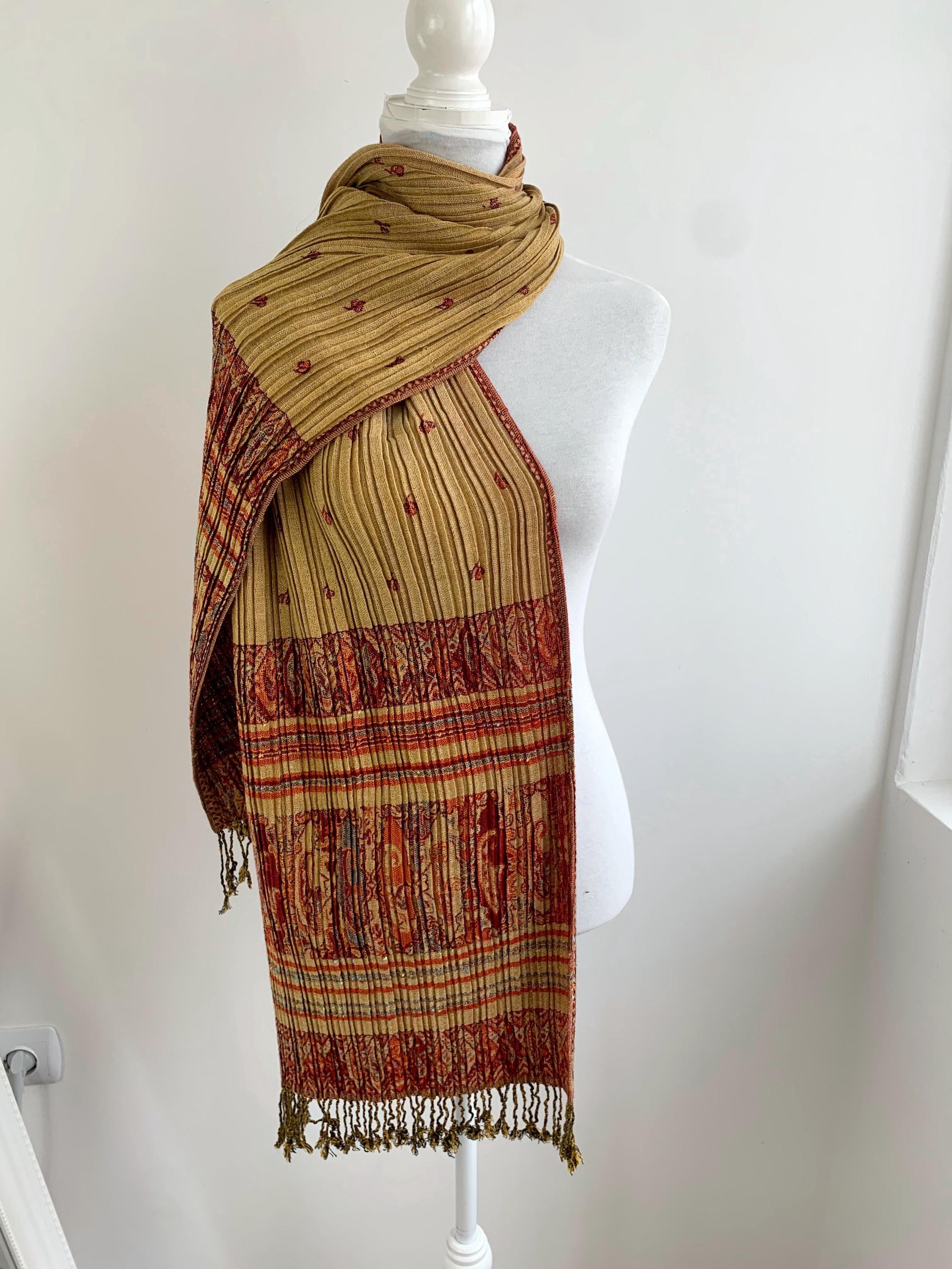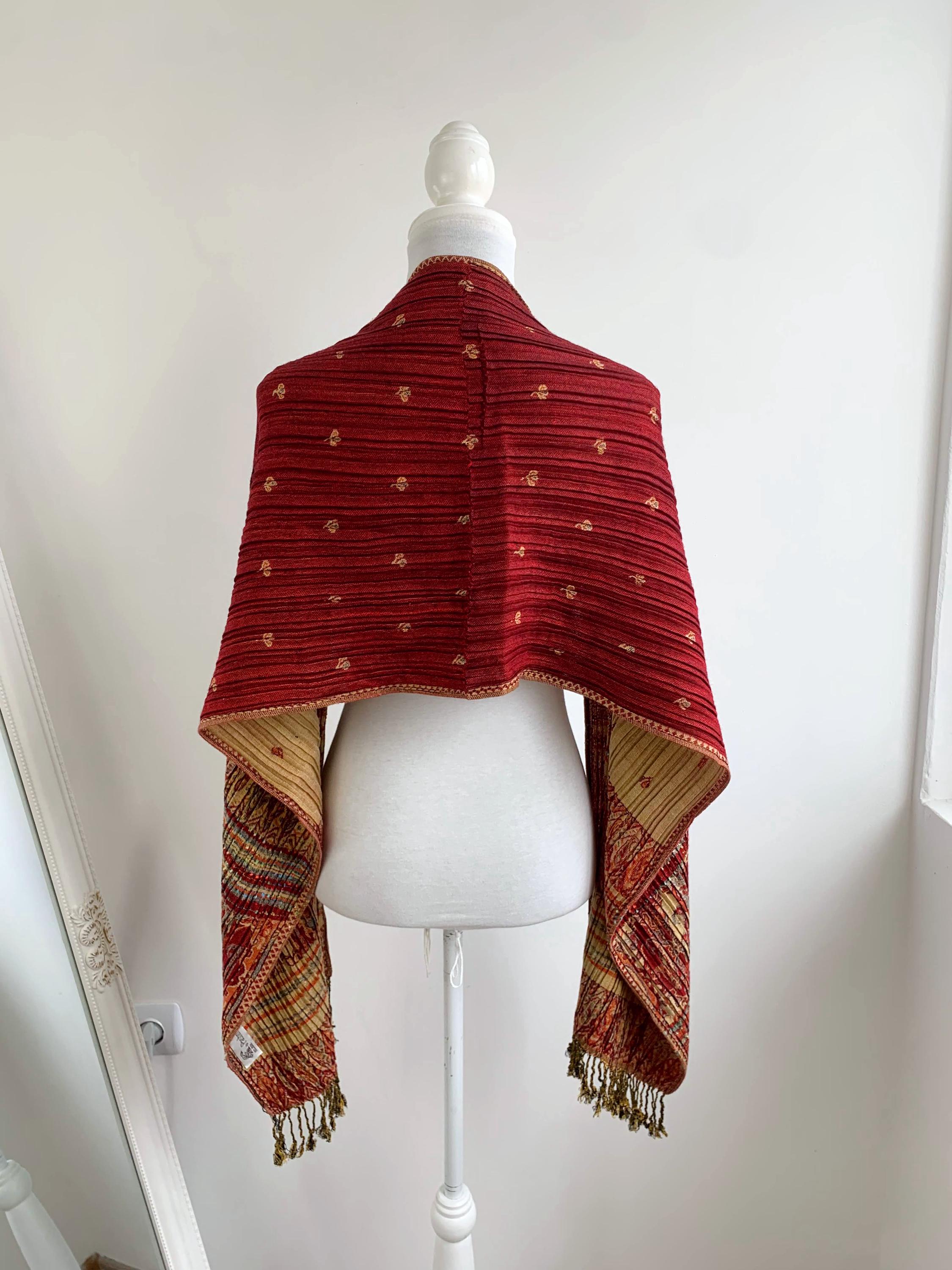 This exquisite vintage Y2K reversible pashmina shawl is a true statement piece, perfect for adding a touch of bohemian elegance and luxurious warmth to any outfit. The unique, finely pleated texture gives it a beautiful structure and drape. A Wonderful versatile accessory for all seasons.