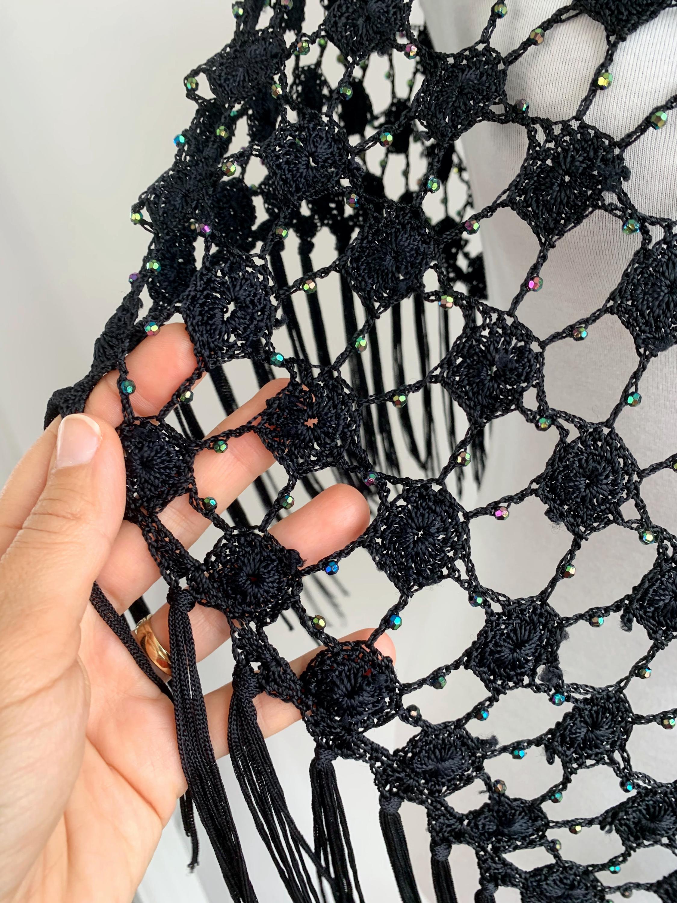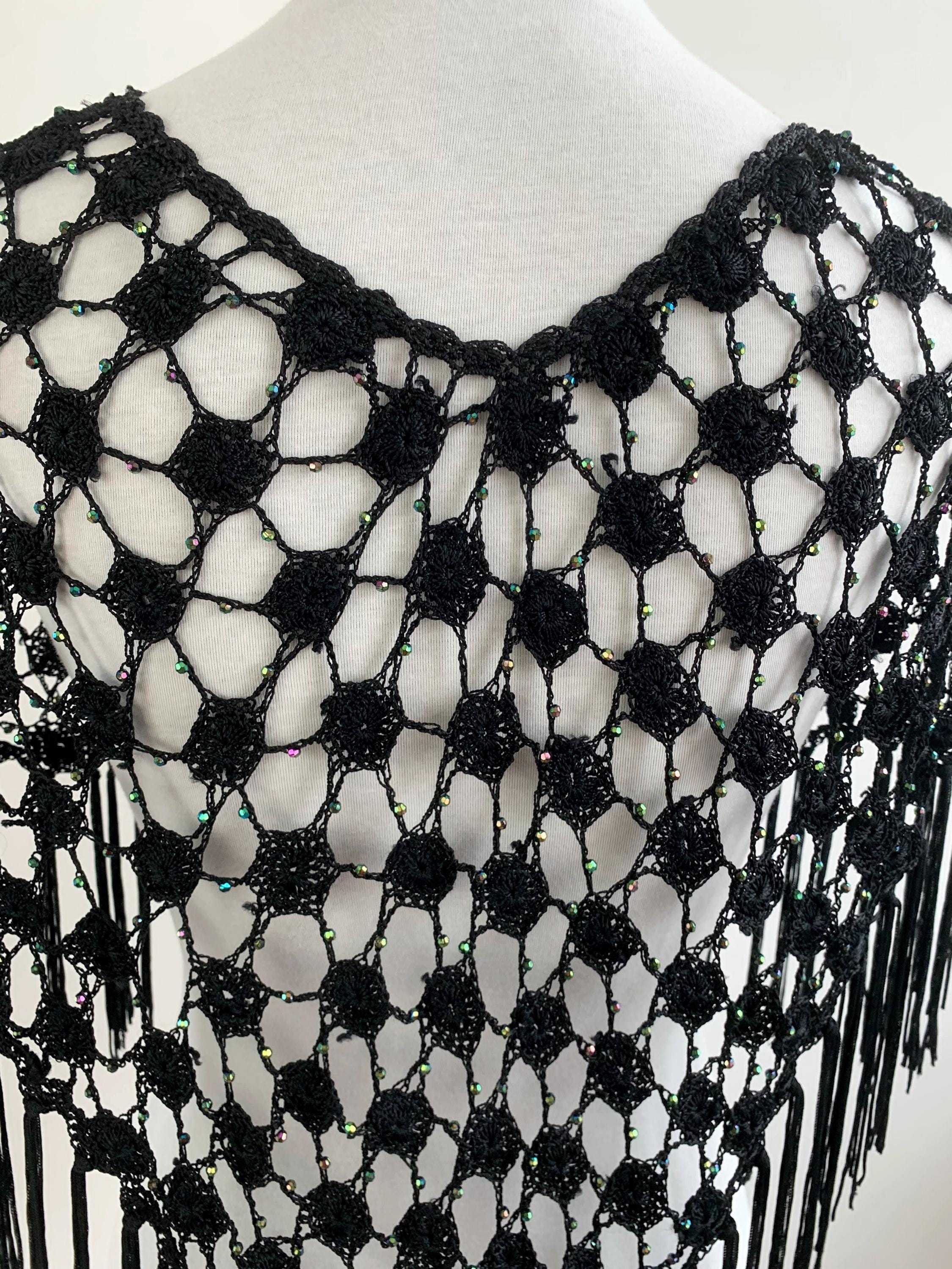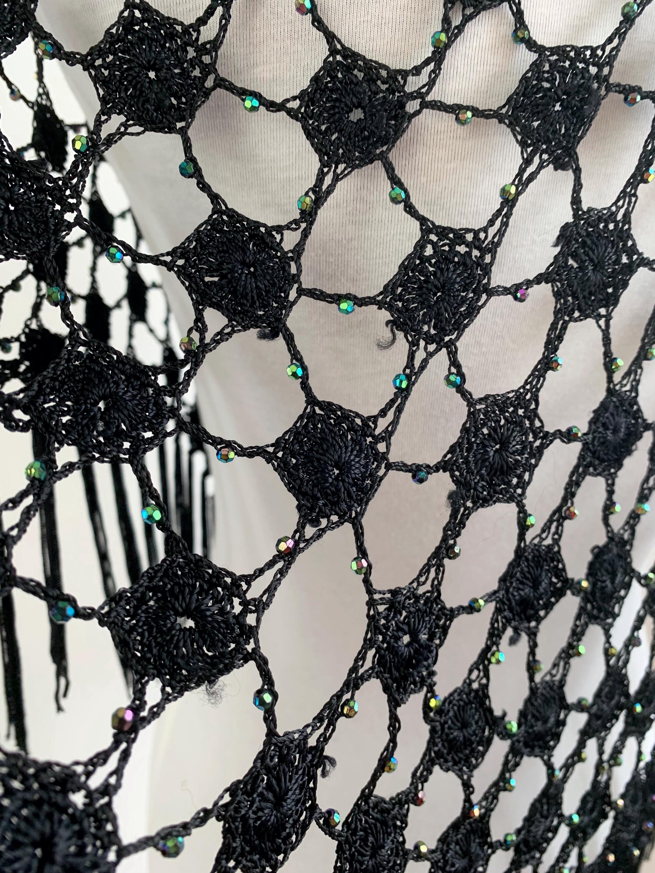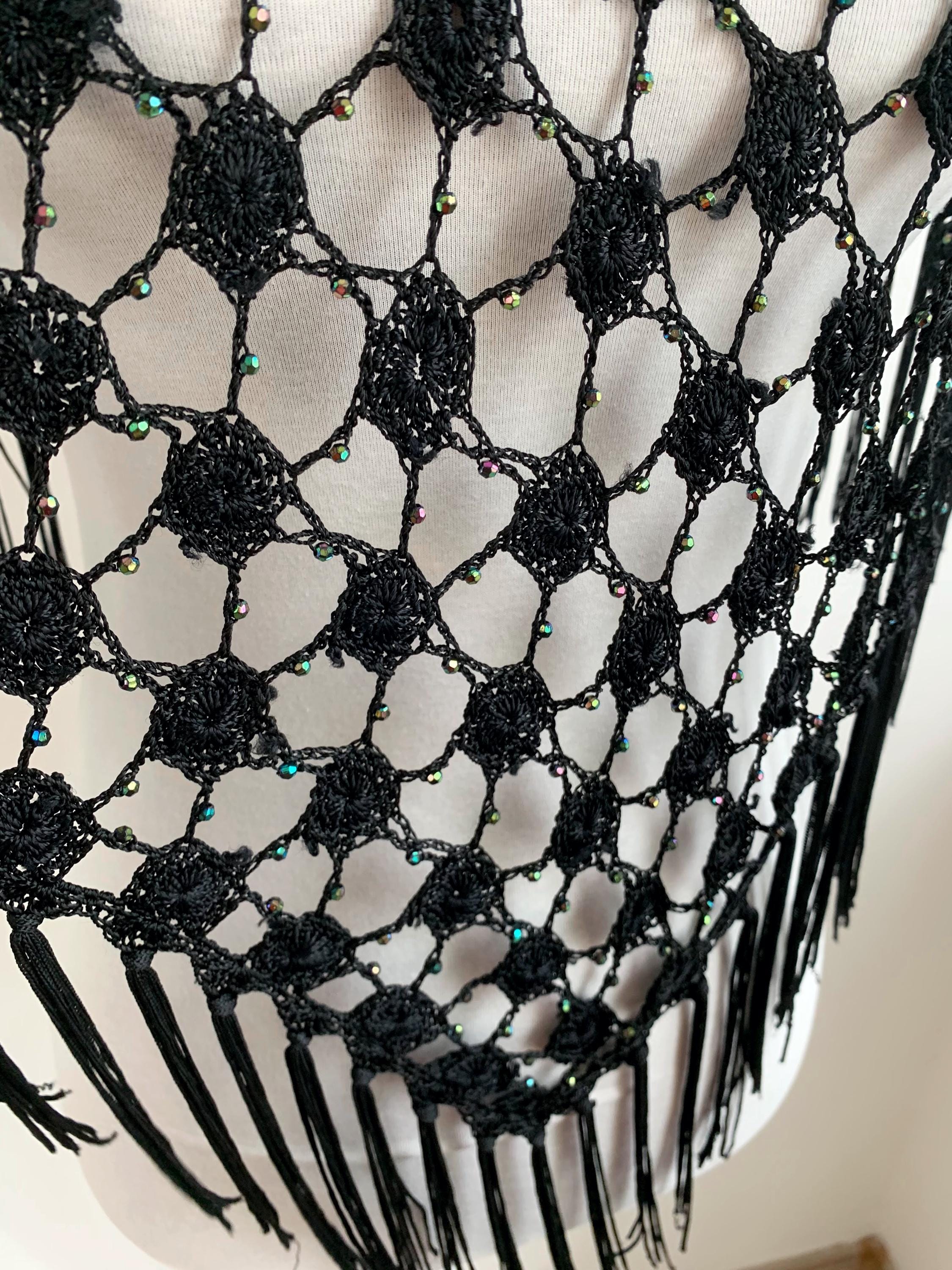 Make a striking entrance with this captivating vintage black crochet shawl with beads and tassels. This black crochet shawl immediately evokes a sense of 70s disco glamour and Bohemian style, perfect for layering over any outfit. The beautiful, large open crochet lace pattern is intricately detailed, featuring shimmering iridescent microbeads woven throughout the net. These tiny, multicolored beads catch the light with every movement, creating a subtle sparkle that transitions effortlessly from a summer festival accessory to a glamorous evening cover-up.