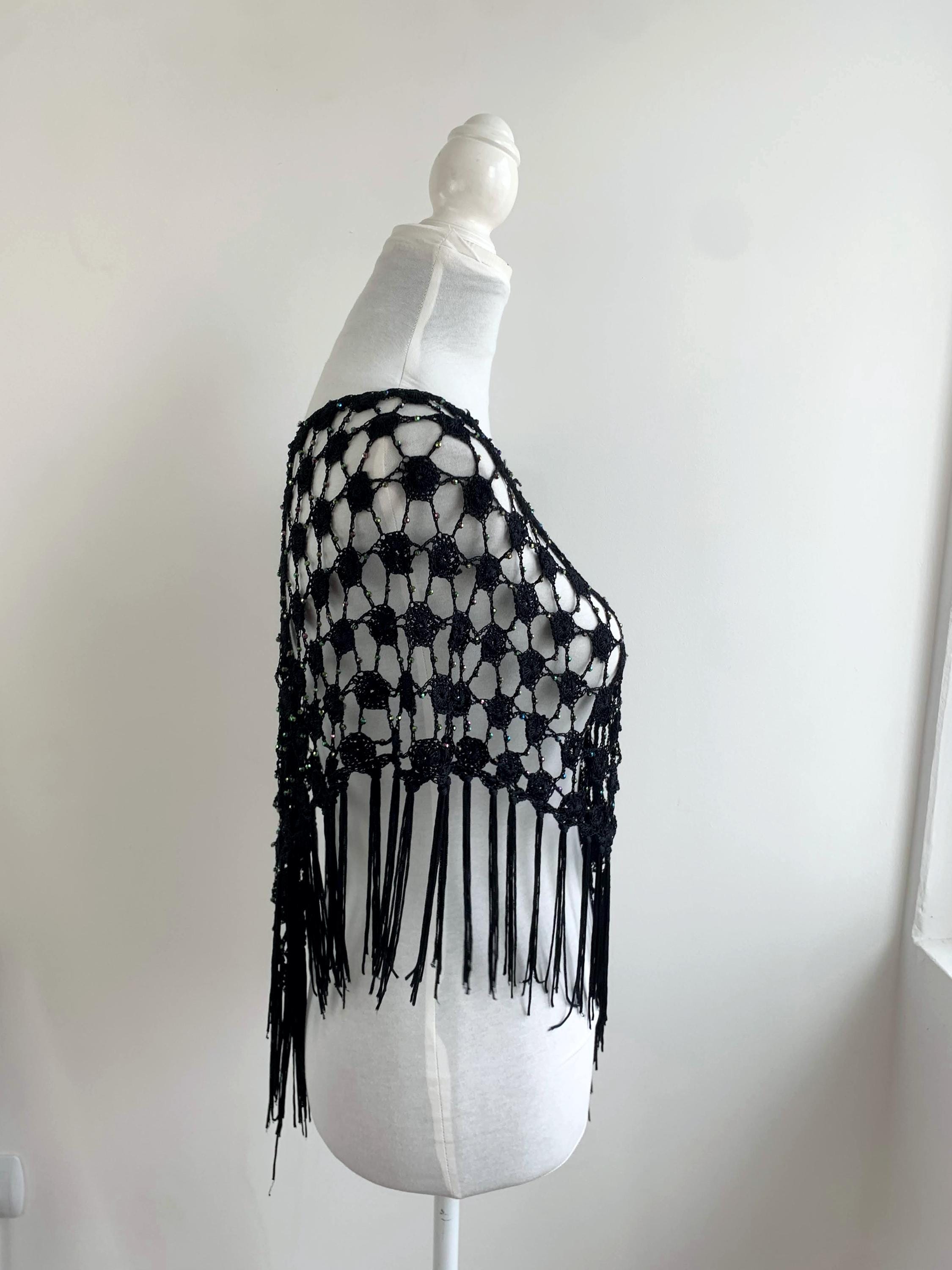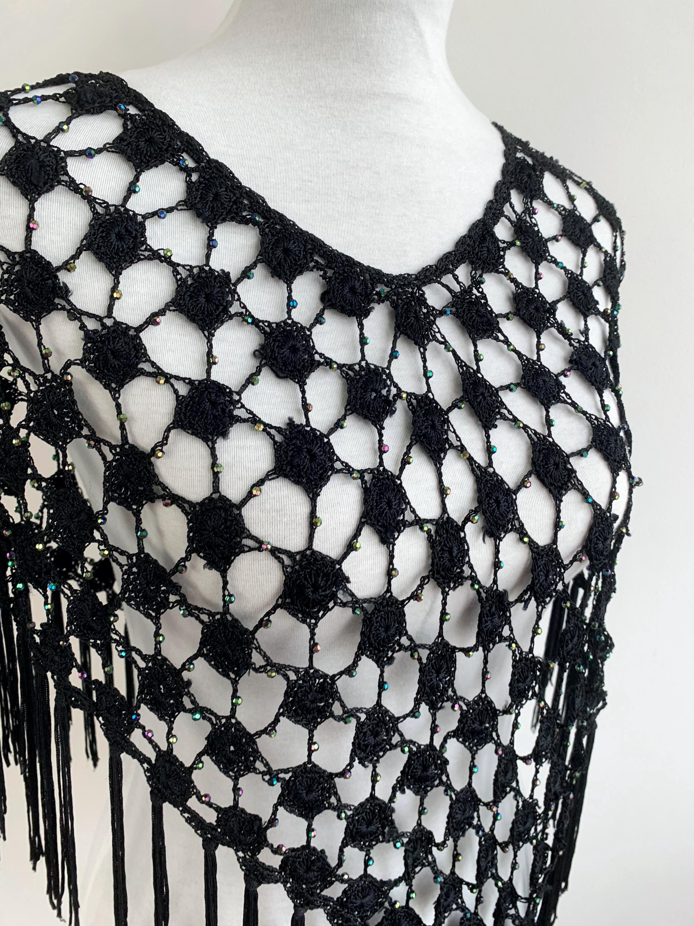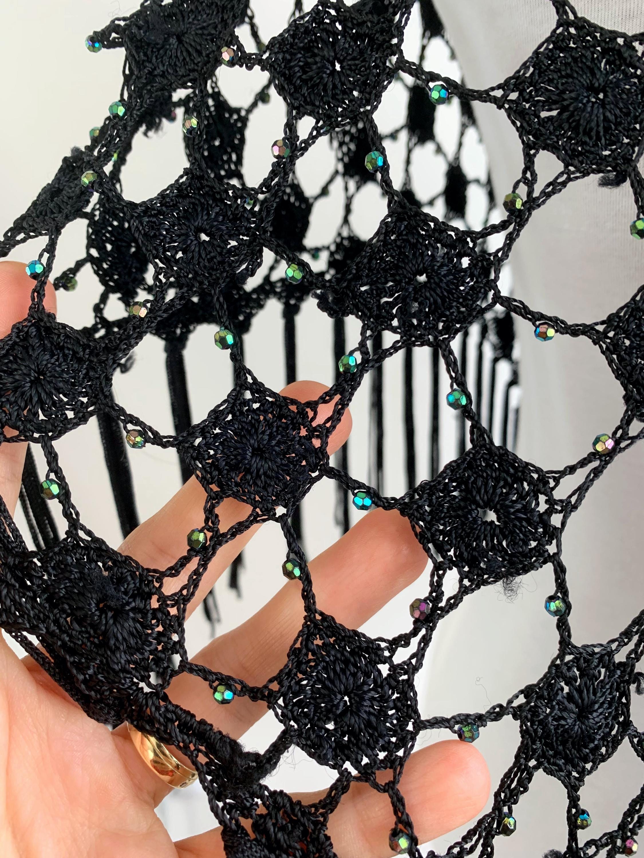 Make a striking entrance with this captivating vintage black crochet shawl with beads and tassels. This black crochet shawl immediately evokes a sense of 70s disco glamour and Bohemian style, perfect for layering over any outfit. The beautiful, large open crochet lace pattern is intricately detailed, featuring shimmering iridescent microbeads woven throughout the net. These tiny, multicolored beads catch the light with every movement, creating a subtle sparkle that transitions effortlessly from a summer festival accessory to a glamorous evening cover-up.