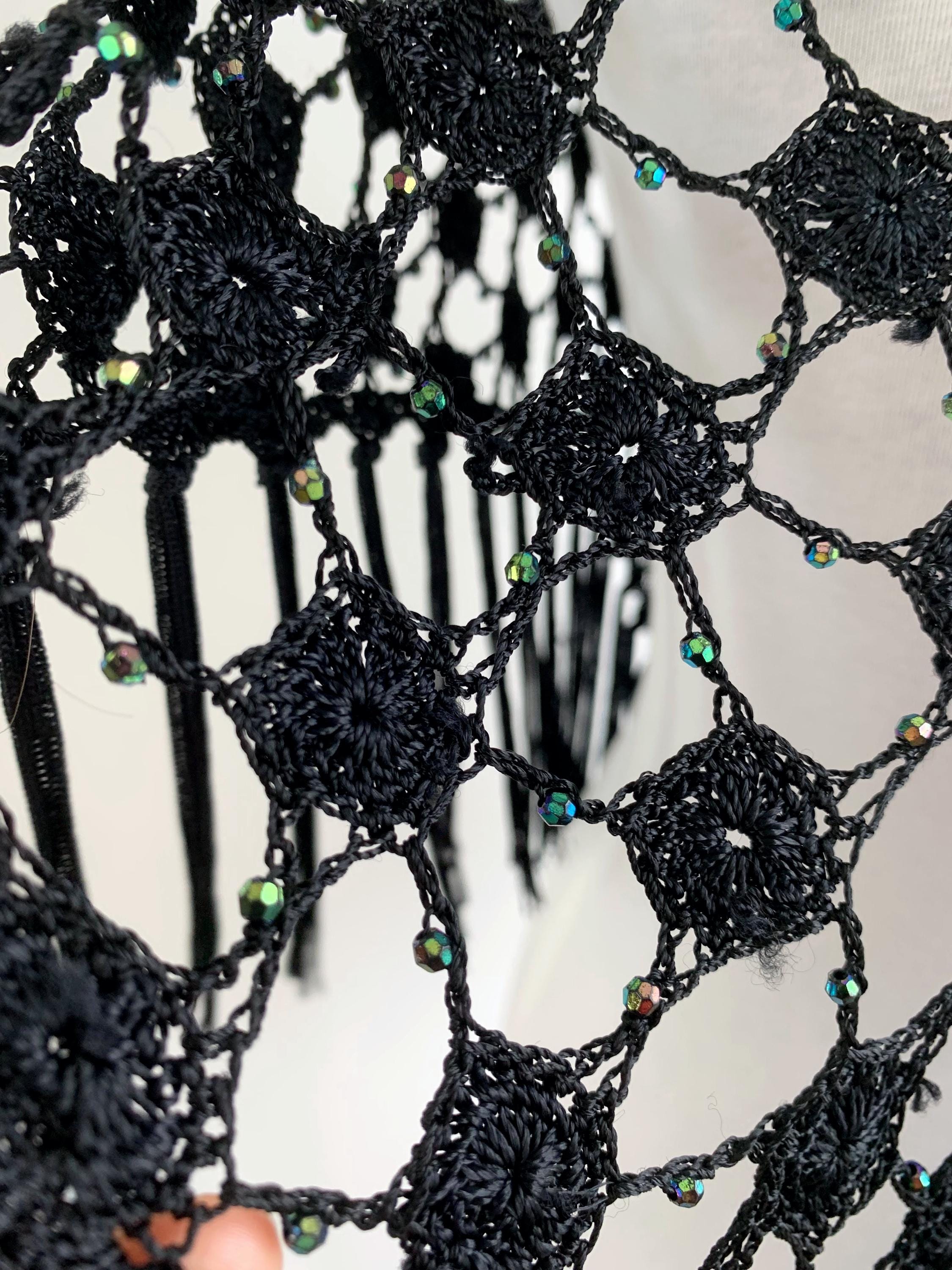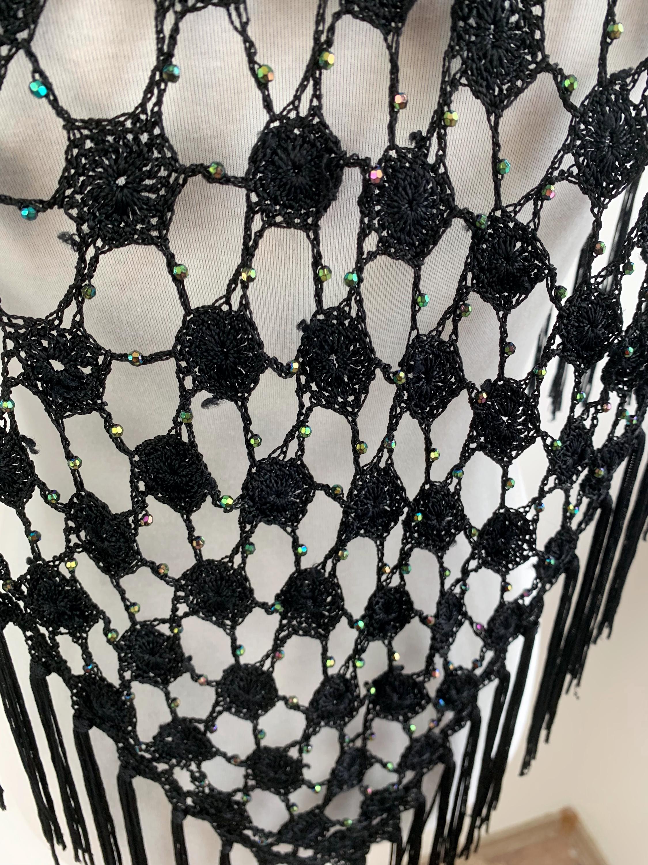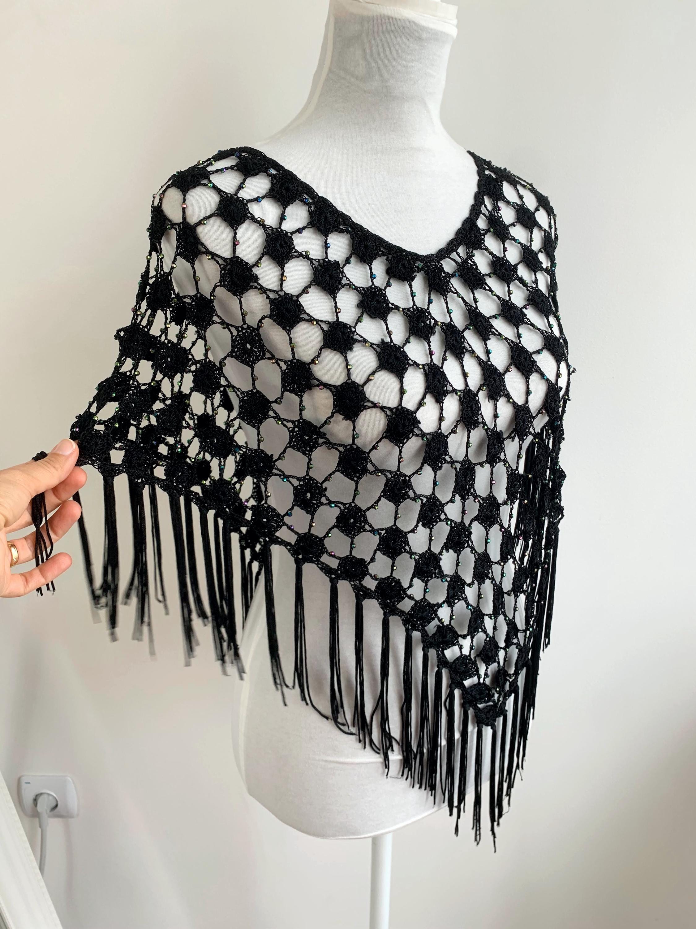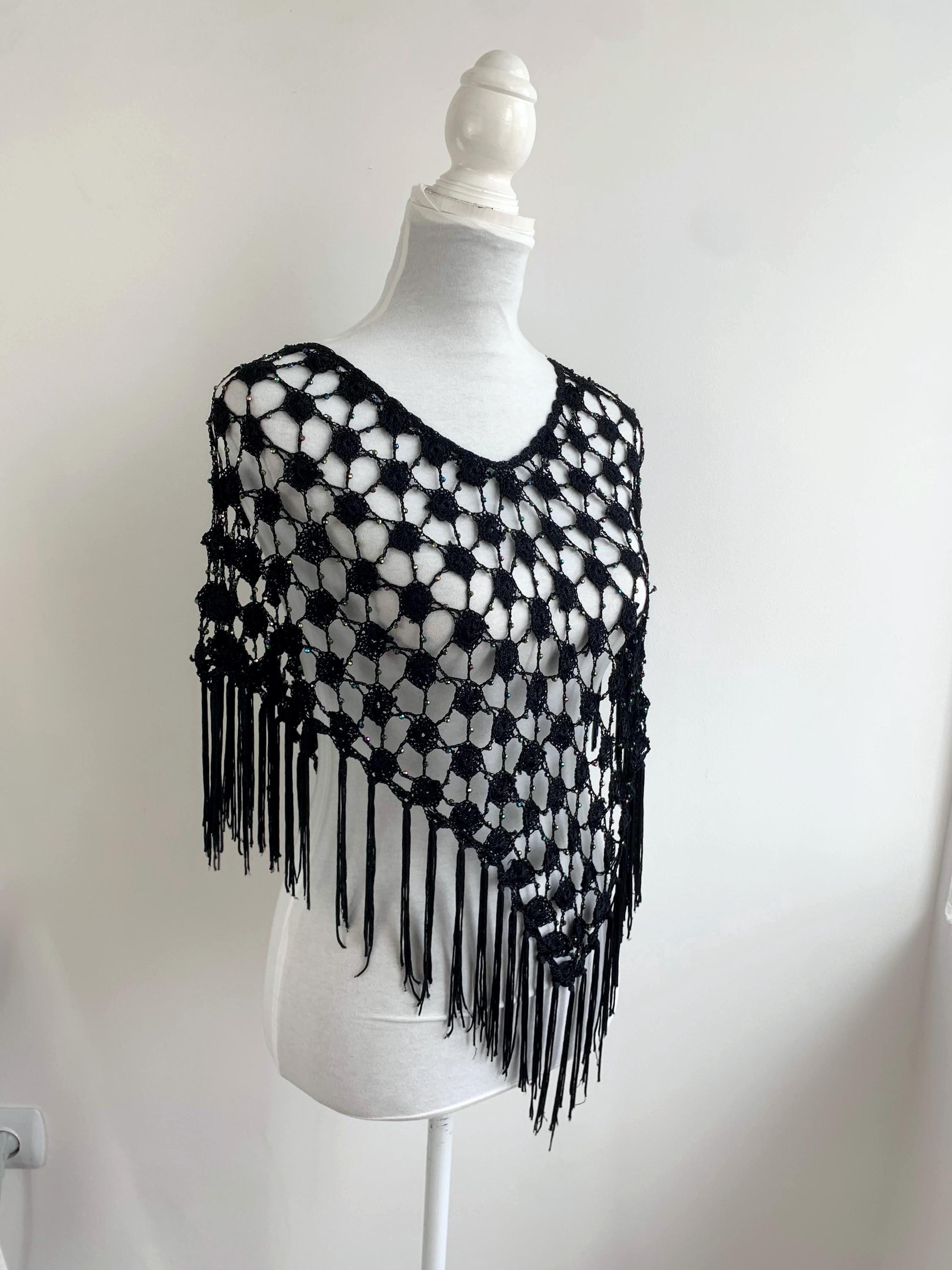 Make a striking entrance with this captivating vintage black crochet shawl with beads and tassels. This black crochet shawl immediately evokes a sense of 70s disco glamour and Bohemian style, perfect for layering over any outfit. The beautiful, large open crochet lace pattern is intricately detailed, featuring shimmering iridescent microbeads woven throughout the net. These tiny, multicolored beads catch the light with every movement, creating a subtle sparkle that transitions effortlessly from a summer festival accessory to a glamorous evening cover-up.