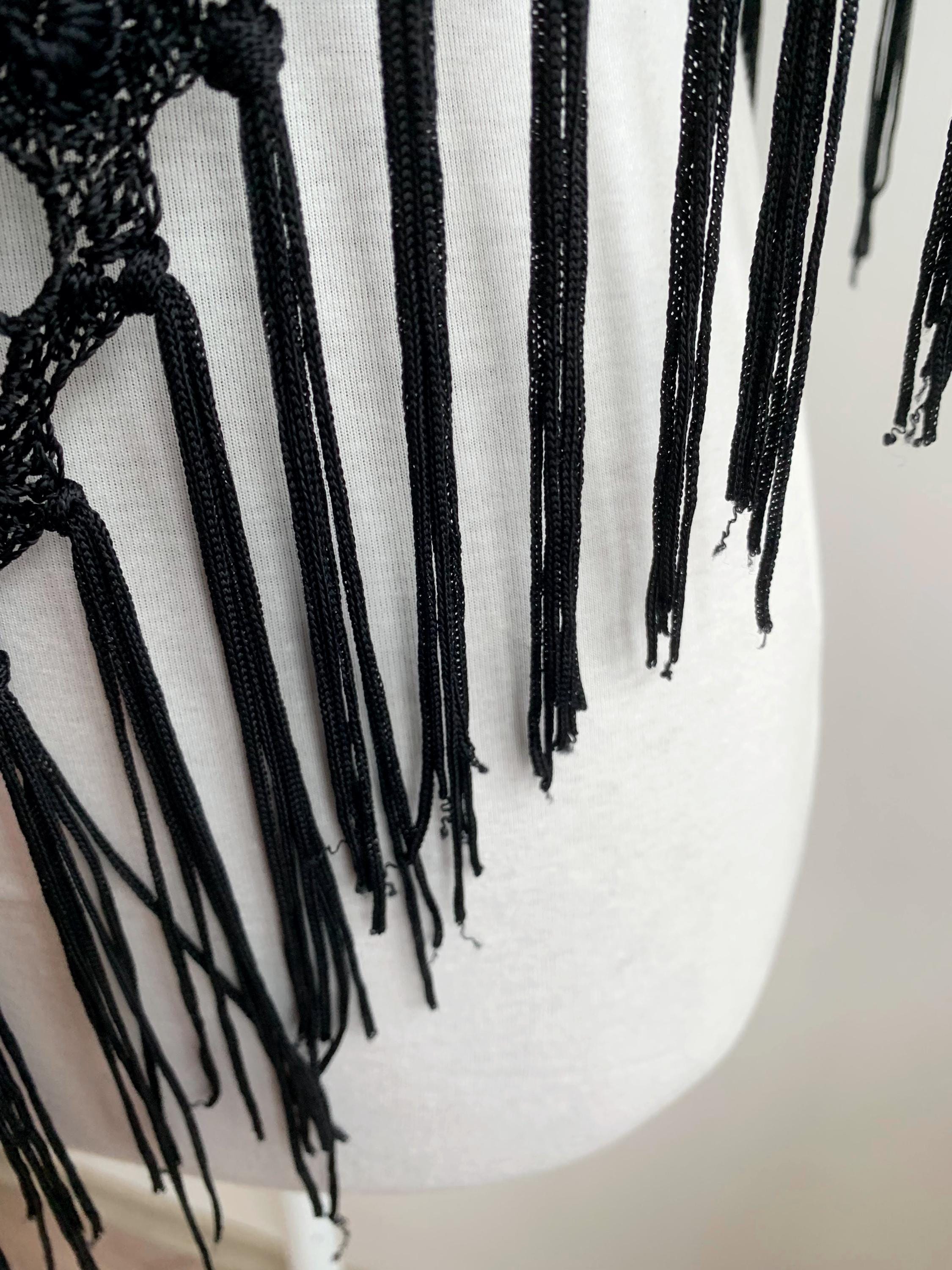 This black evening shawl is cut in a poncho capelet style, designed to drape elegantly over the shoulders and finished with a dramatic fringe along the entire bottom edge. It has a generous width, allowing it to be worn draped over the shoulders or tied at the front. The black color ensures versatility, while the textured crochet and fringe add depth and movement. It's a fantastic vintage accessory for dancers, costume designers, or anyone seeking a unique, eye-catching piece of sustainable fashion.