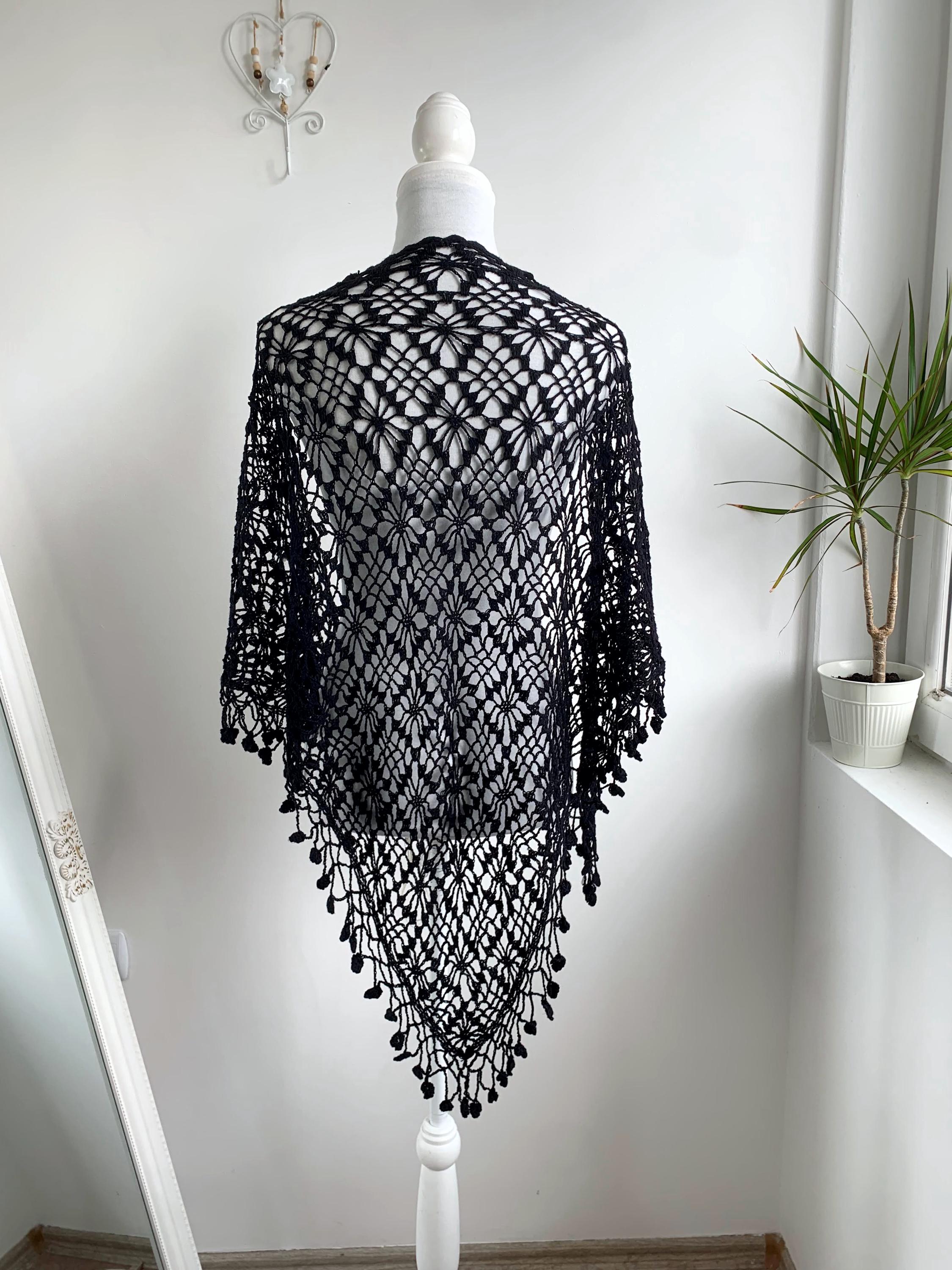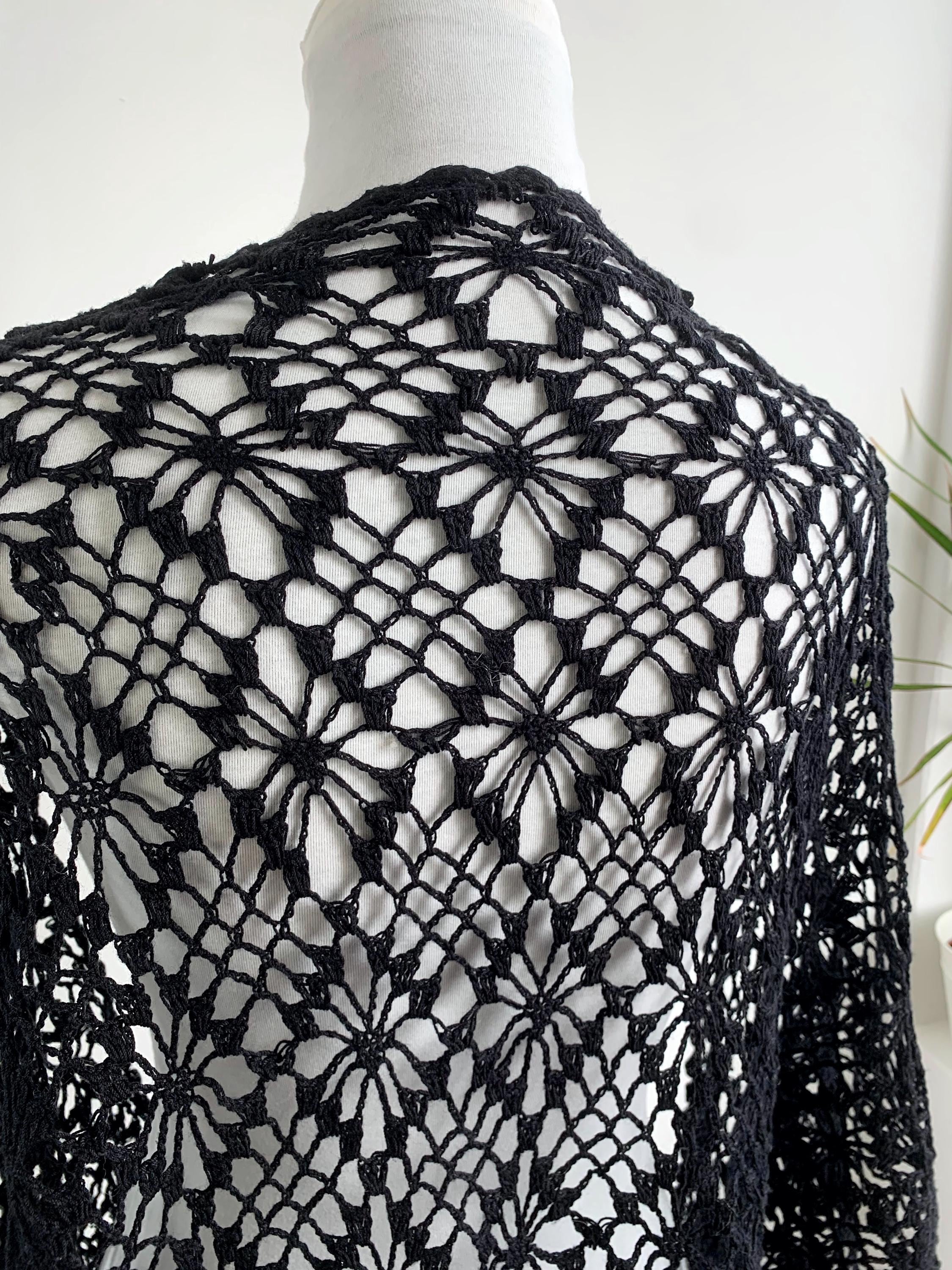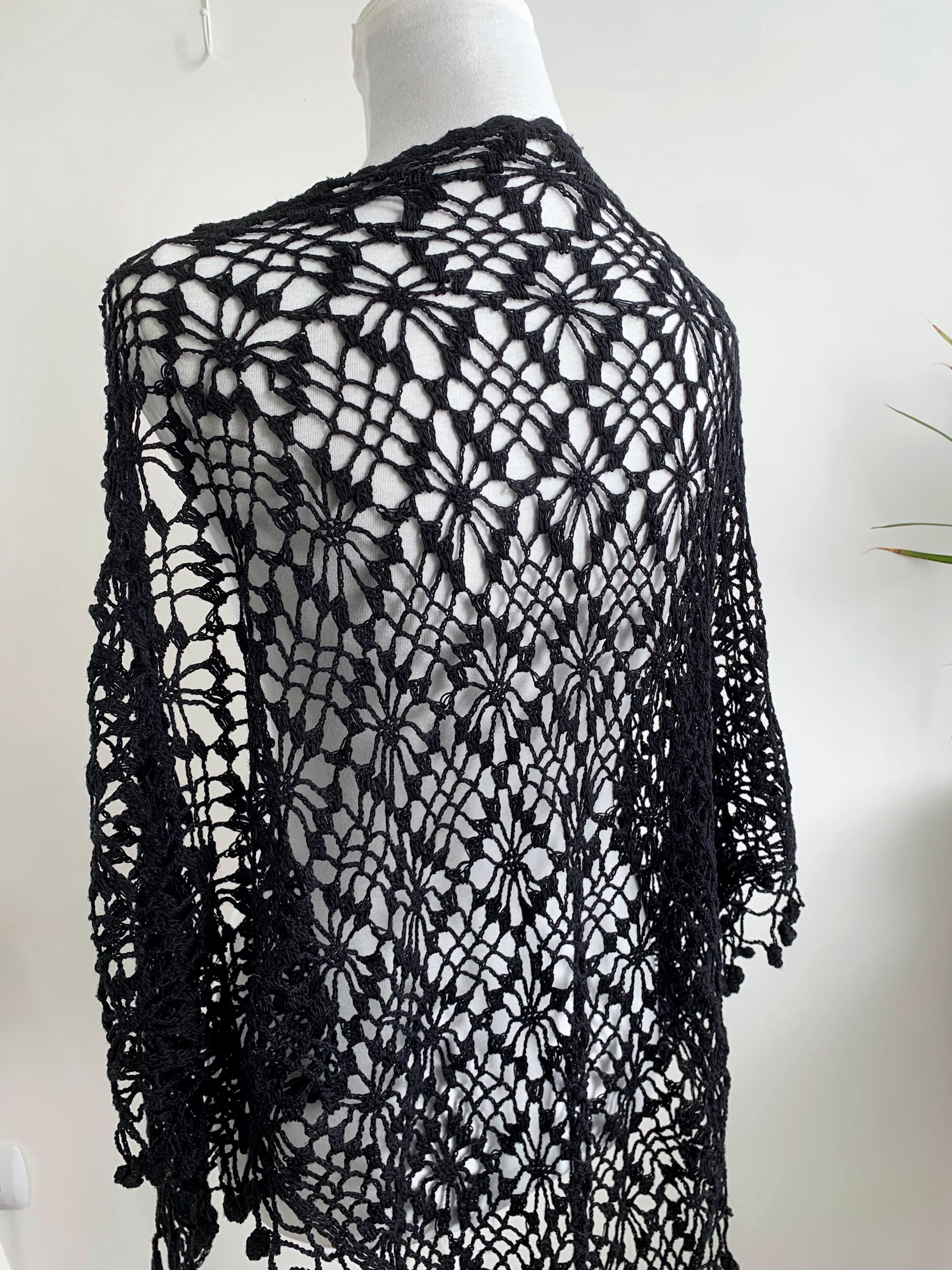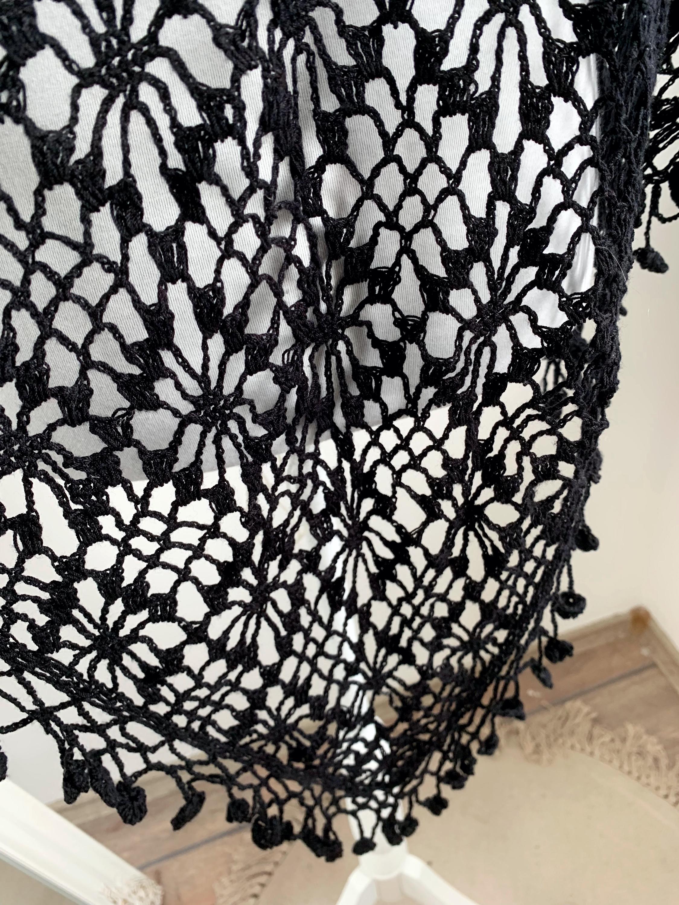 This is a vintage 90s handmade crochet lace shawl with tassels, made of soft cotton yarn. This boho triangle shawl can be worn as a shoulder wrap shawl or as a bib scarf. This Spanish Piano wrap has open weave geometric pattern with delicate fringe at the bottom with floral accents. Beautiful piano shawl that will be the perfect retro accessory for your outfit. Amazing sustainable gift for a vintage lover.