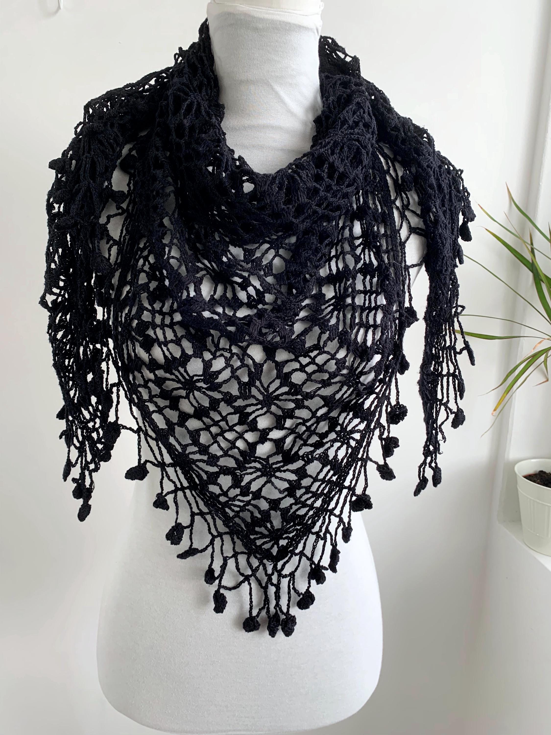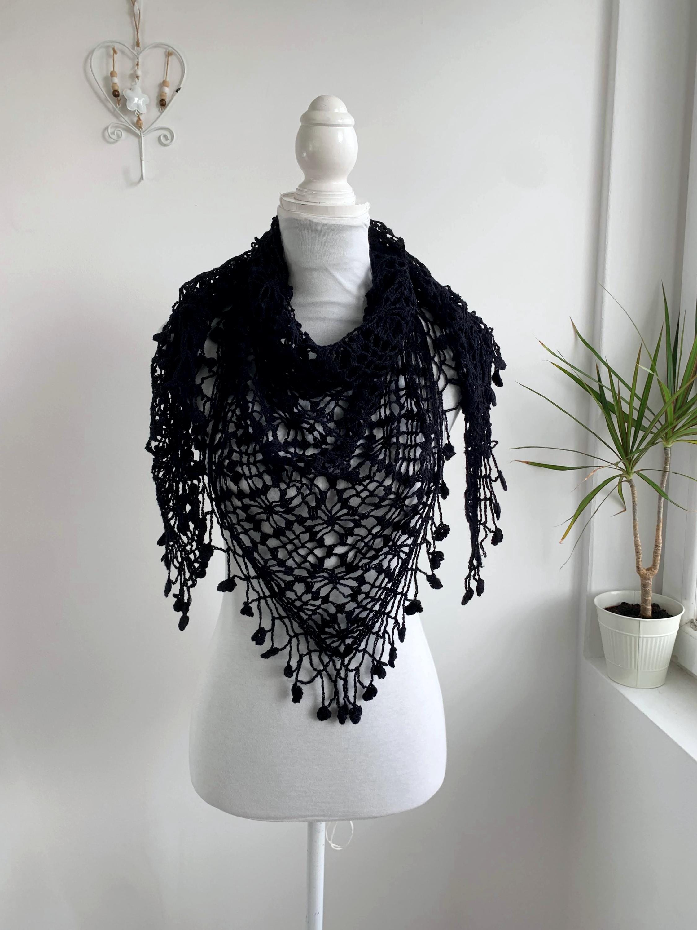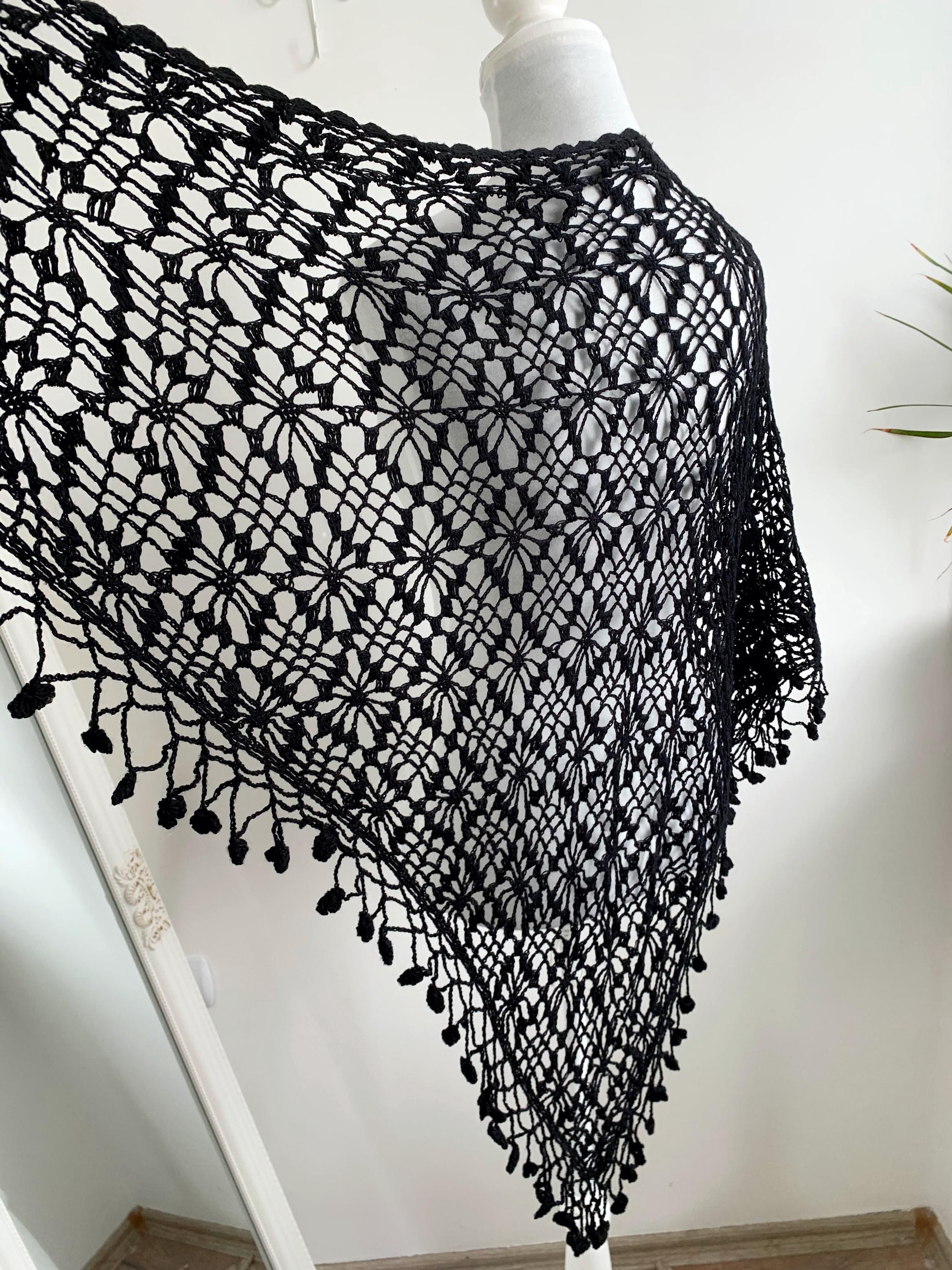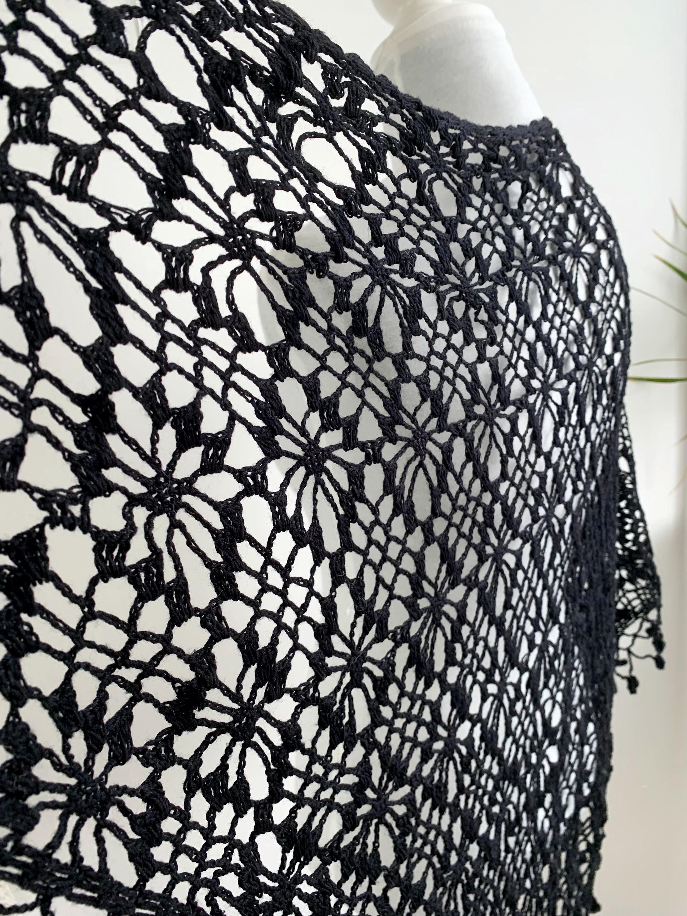 This is a vintage 90s handmade crochet lace shawl with tassels, made of soft cotton yarn. This boho triangle shawl can be worn as a shoulder wrap shawl or as a bib scarf. This Spanish Piano wrap has open weave geometric pattern with delicate fringe at the bottom with floral accents. Beautiful piano shawl that will be the perfect retro accessory for your outfit. Amazing sustainable gift for a vintage lover.