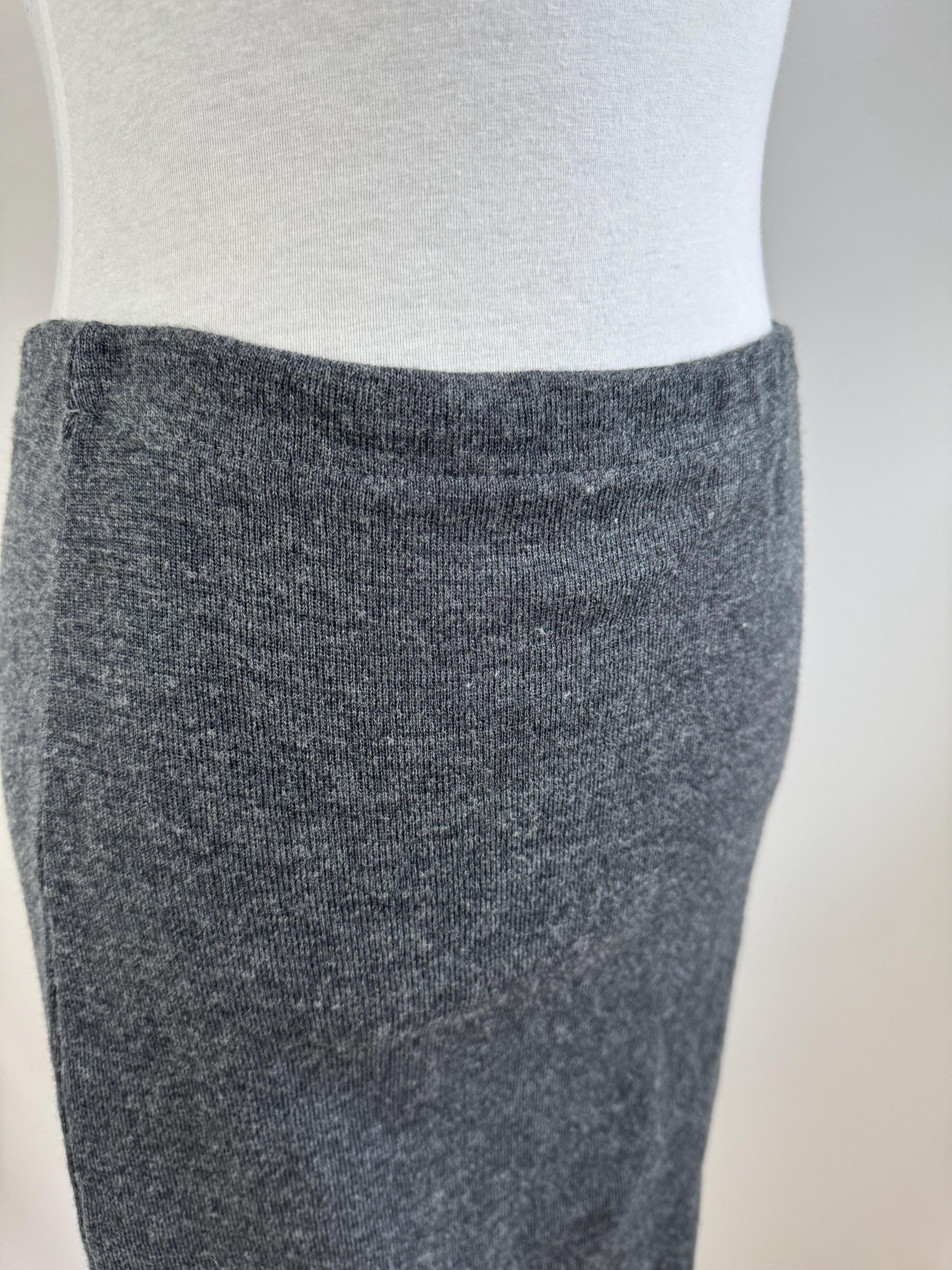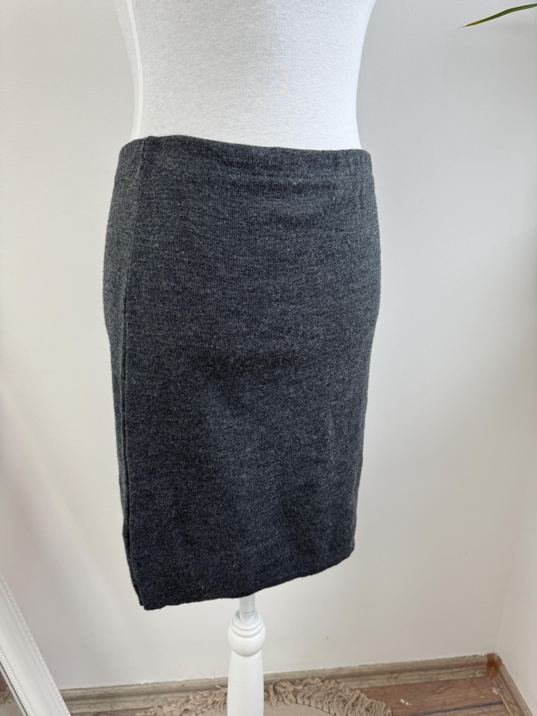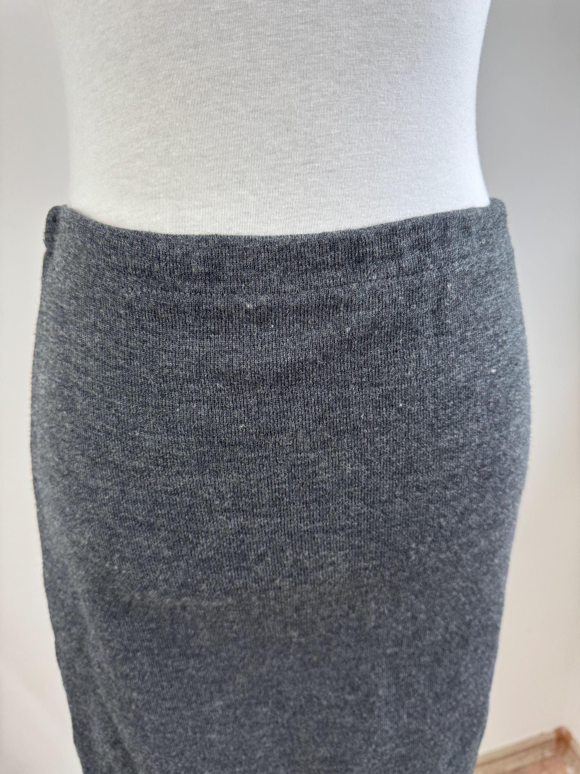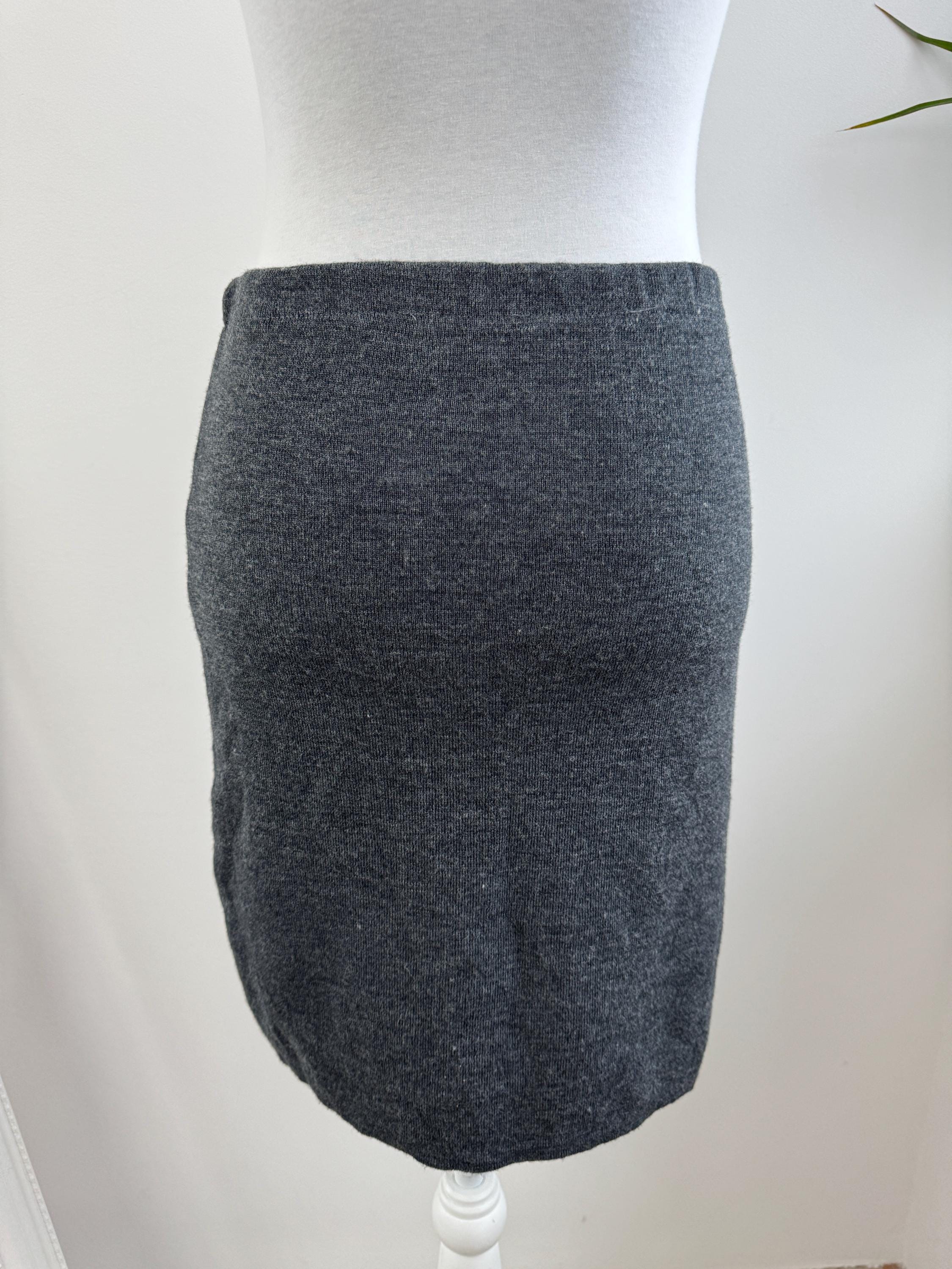 The dark charcoal color makes this knitted pencil skirt incredibly versatile and easy to style with almost anything . The construction is designed for ultimate comfort, featuring a stretchy, elastic waistband and a simple pull-on style that fits a wide range of sizes (as noted in the measurements). This grey wool skirt truly embodies the understated, high-quality style of 90s French fashion. Invest in sustainable fashion and upgrade your cold-weather wardrobe with this beautifully made, effortless retro midi skirt.