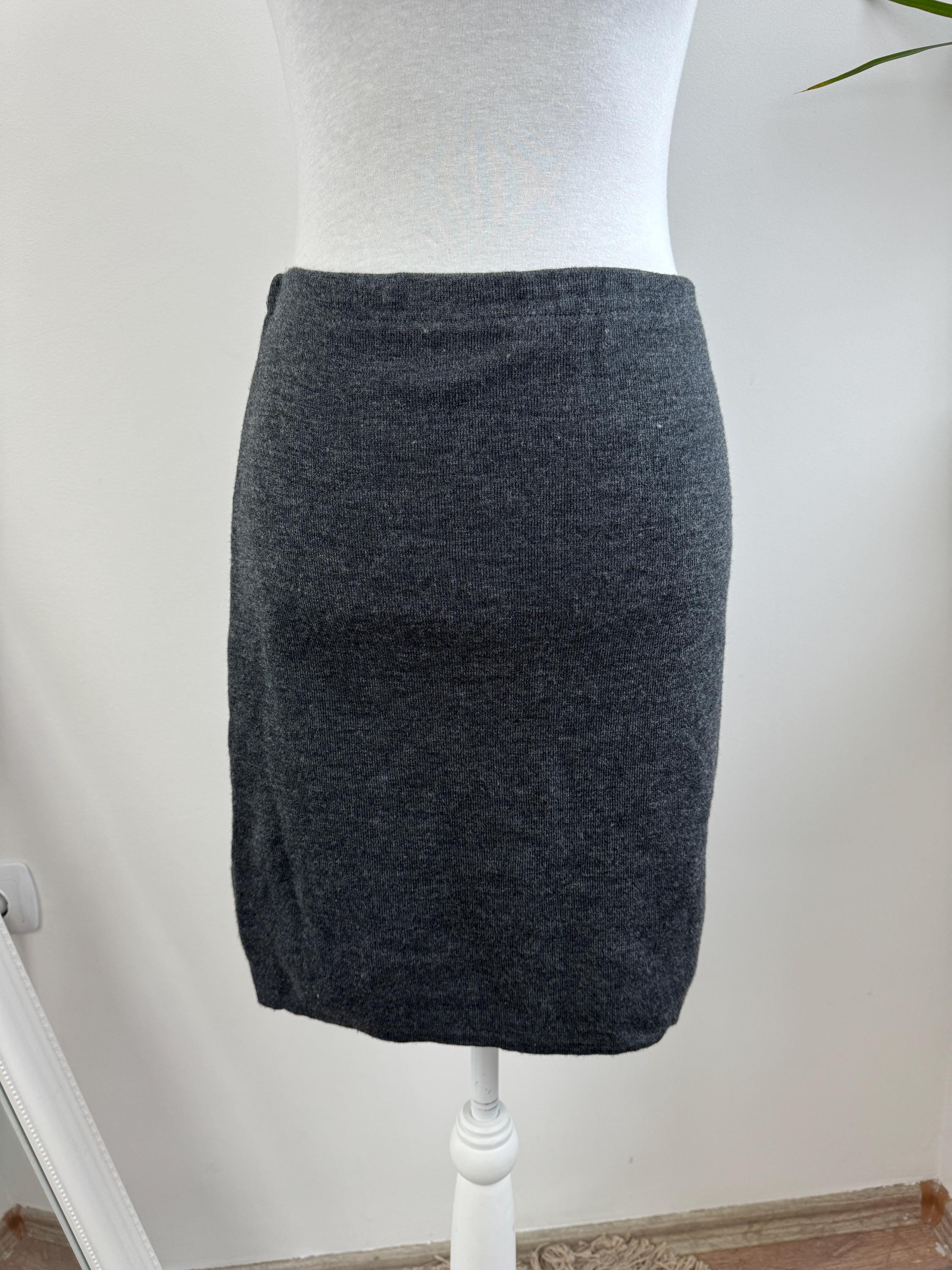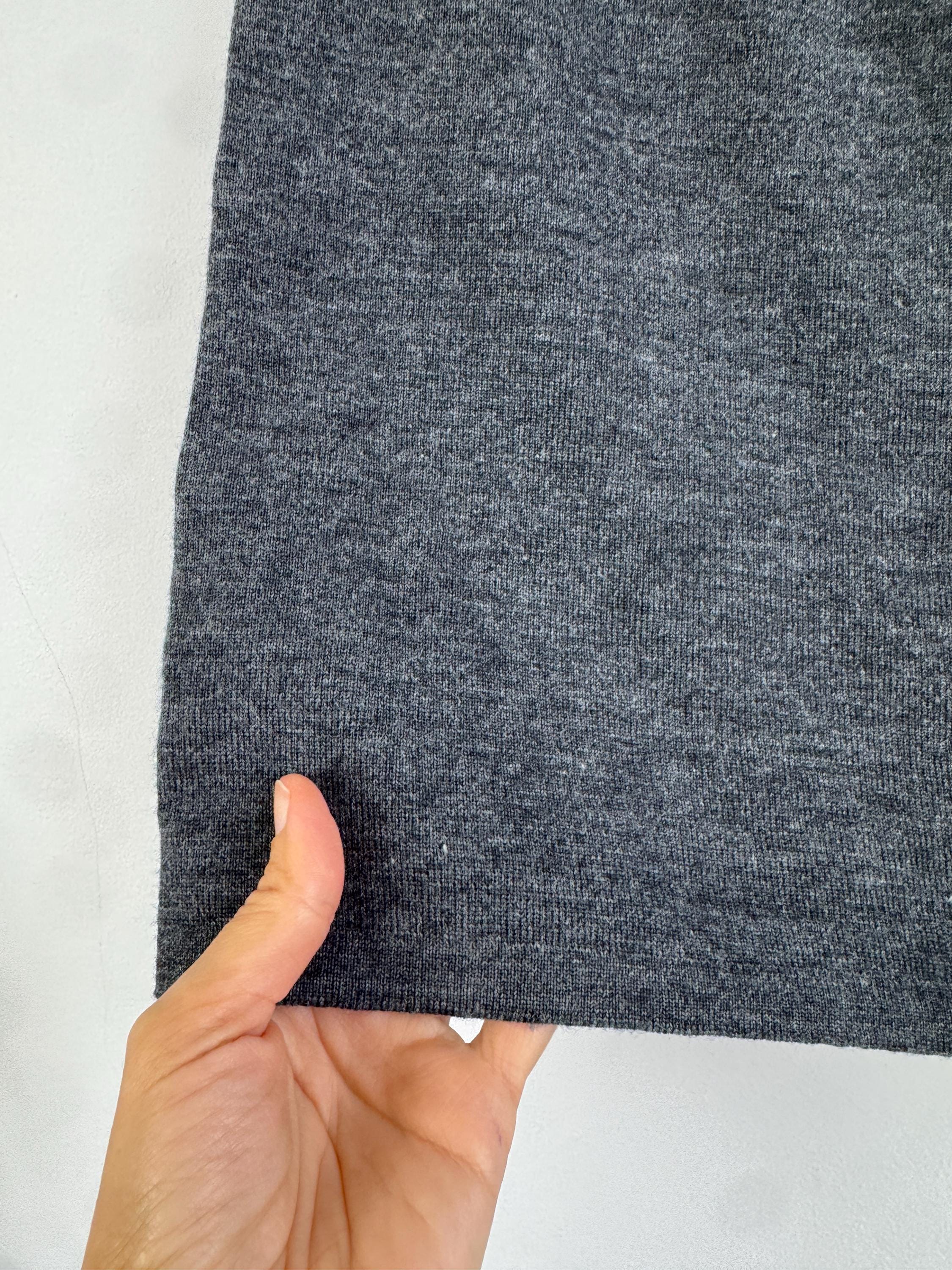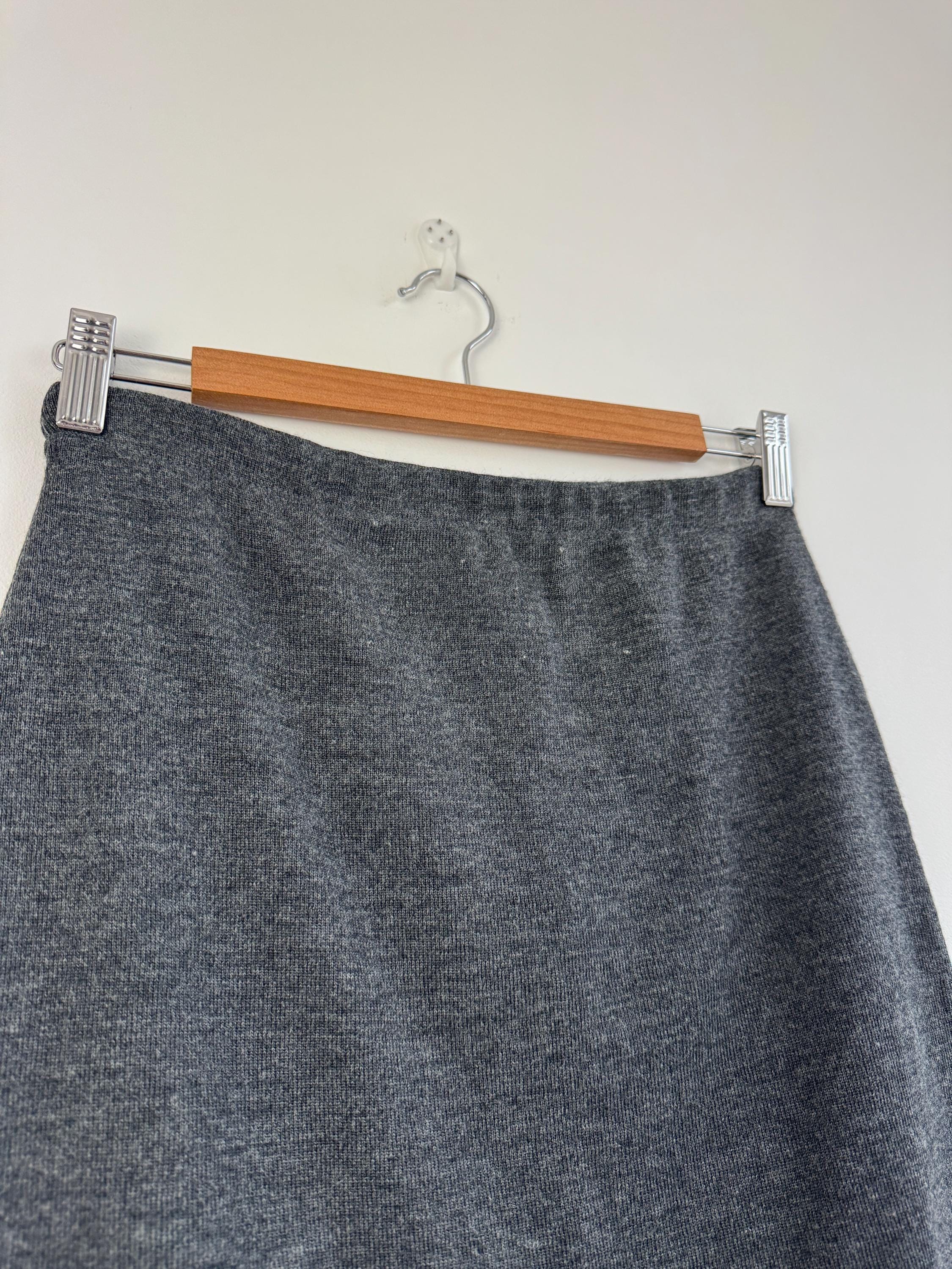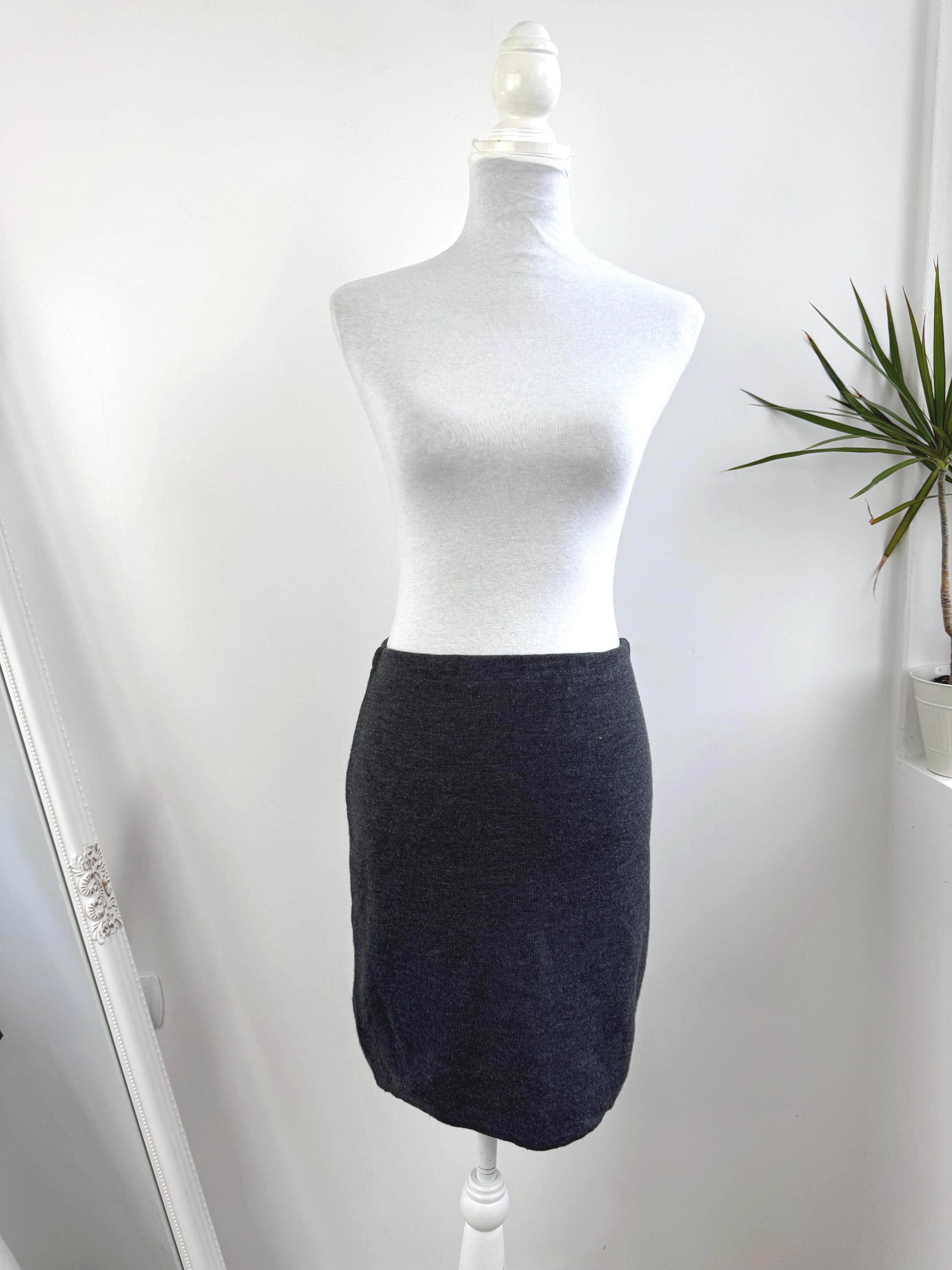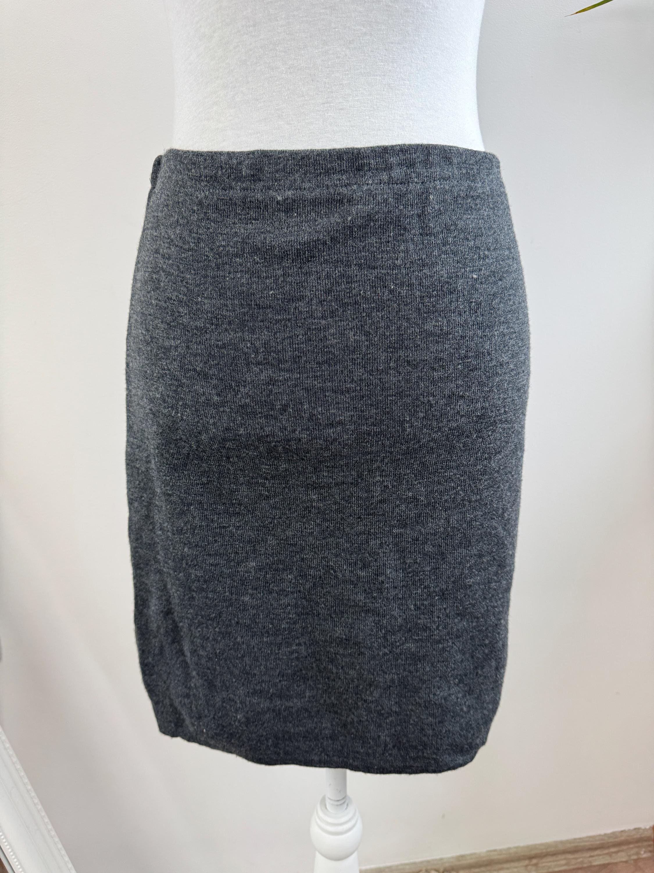 The dark charcoal color makes this knitted pencil skirt incredibly versatile and easy to style with almost anything . The construction is designed for ultimate comfort, featuring a stretchy, elastic waistband and a simple pull-on style that fits a wide range of sizes (as noted in the measurements). This grey wool skirt truly embodies the understated, high-quality style of 90s French fashion. Invest in sustainable fashion and upgrade your cold-weather wardrobe with this beautifully made, effortless retro midi skirt.