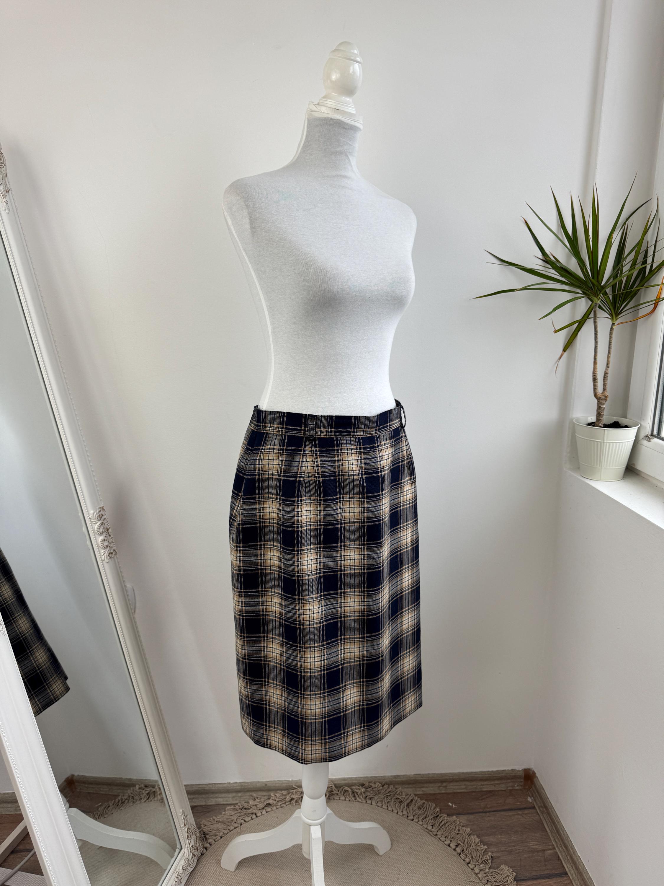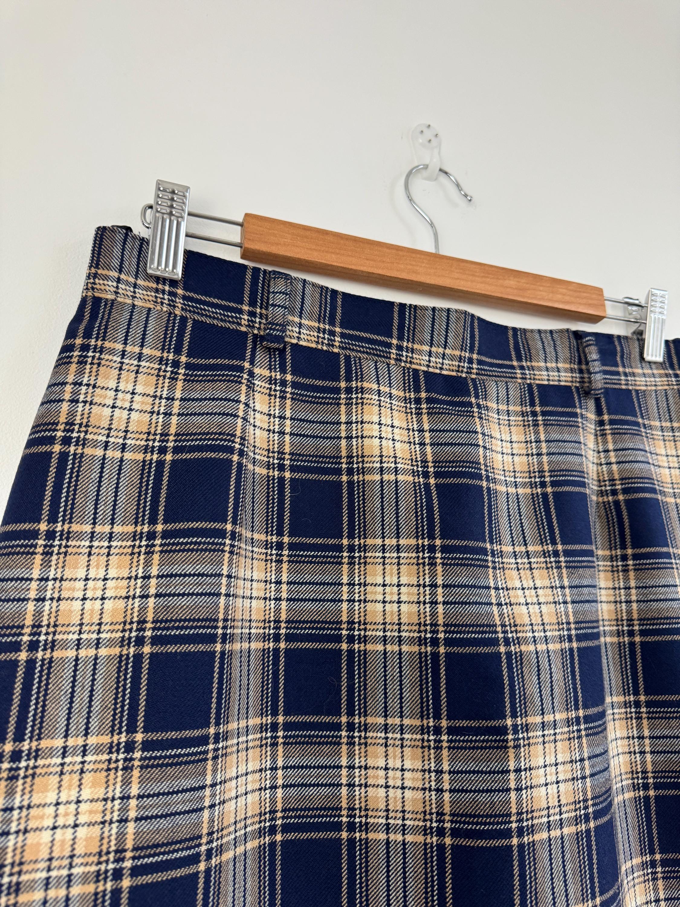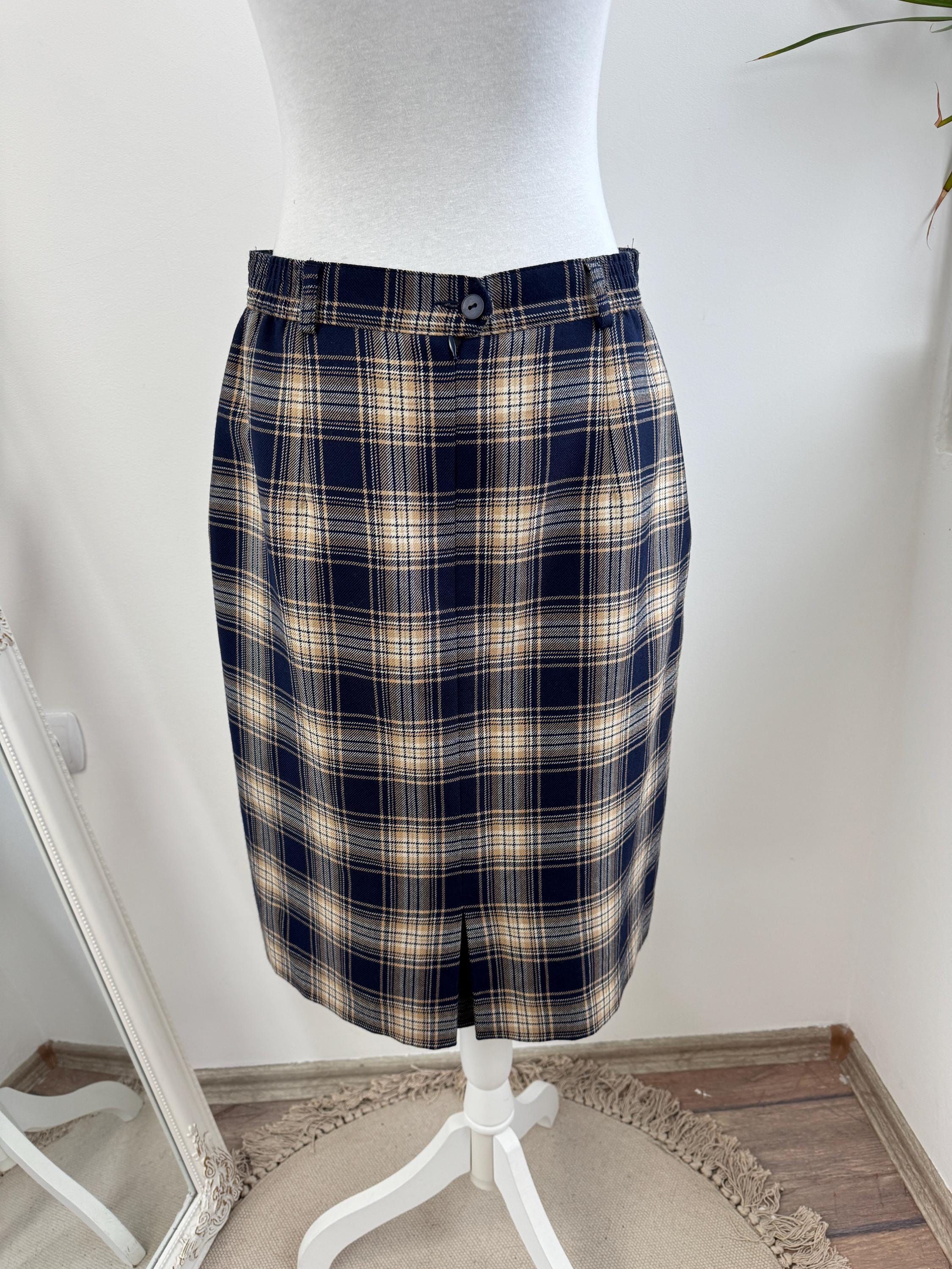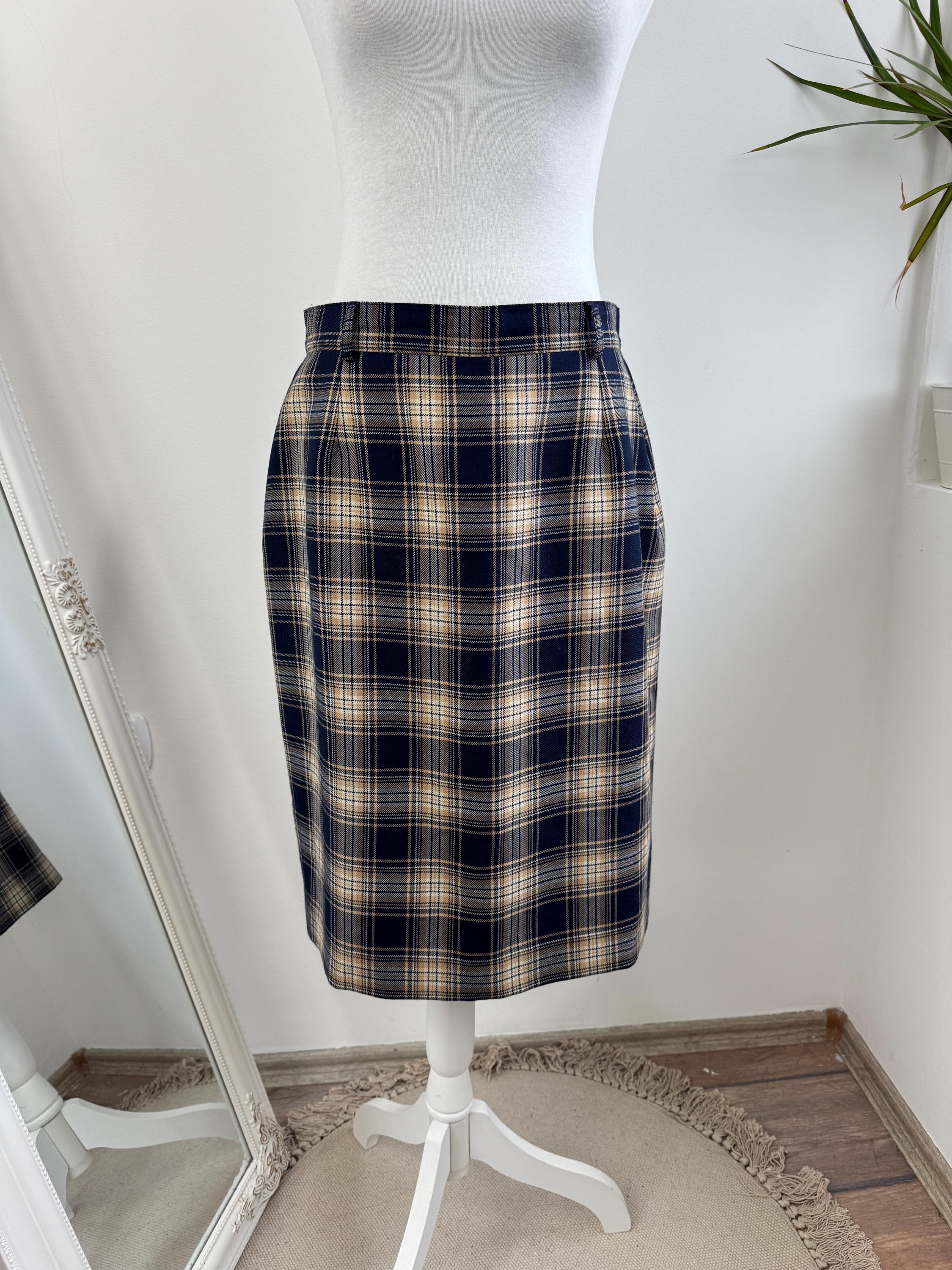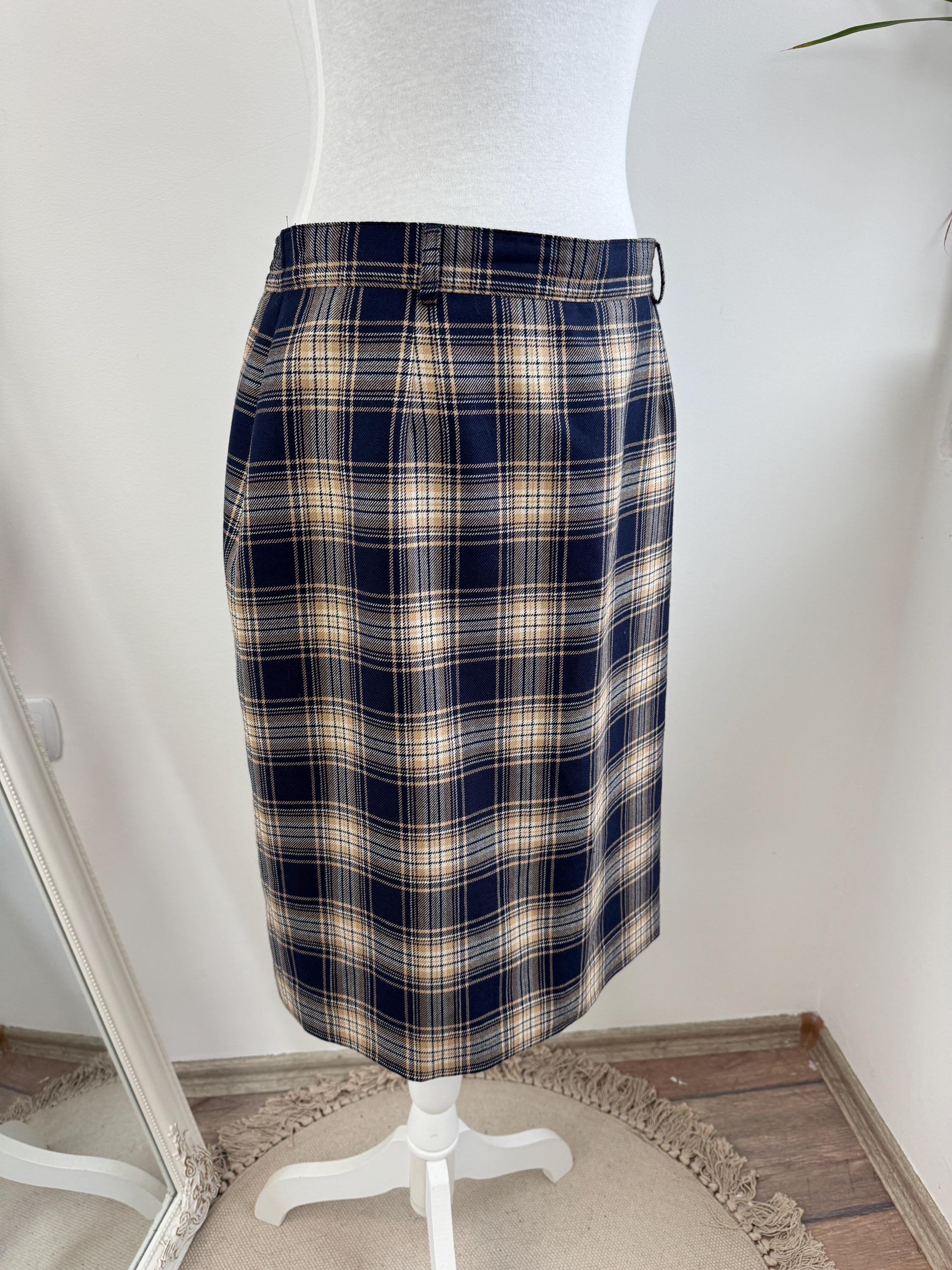 Embrace classic sophistication with this beautifully crafted vintage plaid pencil skirt from the brand Lucia. This timeless piece was Made in West Germany (R.F.A.) and captures the essence of classic 80s early 90s tailoring. The fabric features a rich tartan check pattern in versatile tones of deep navy blue, warm beige/camel, and a subtle touch of brown.