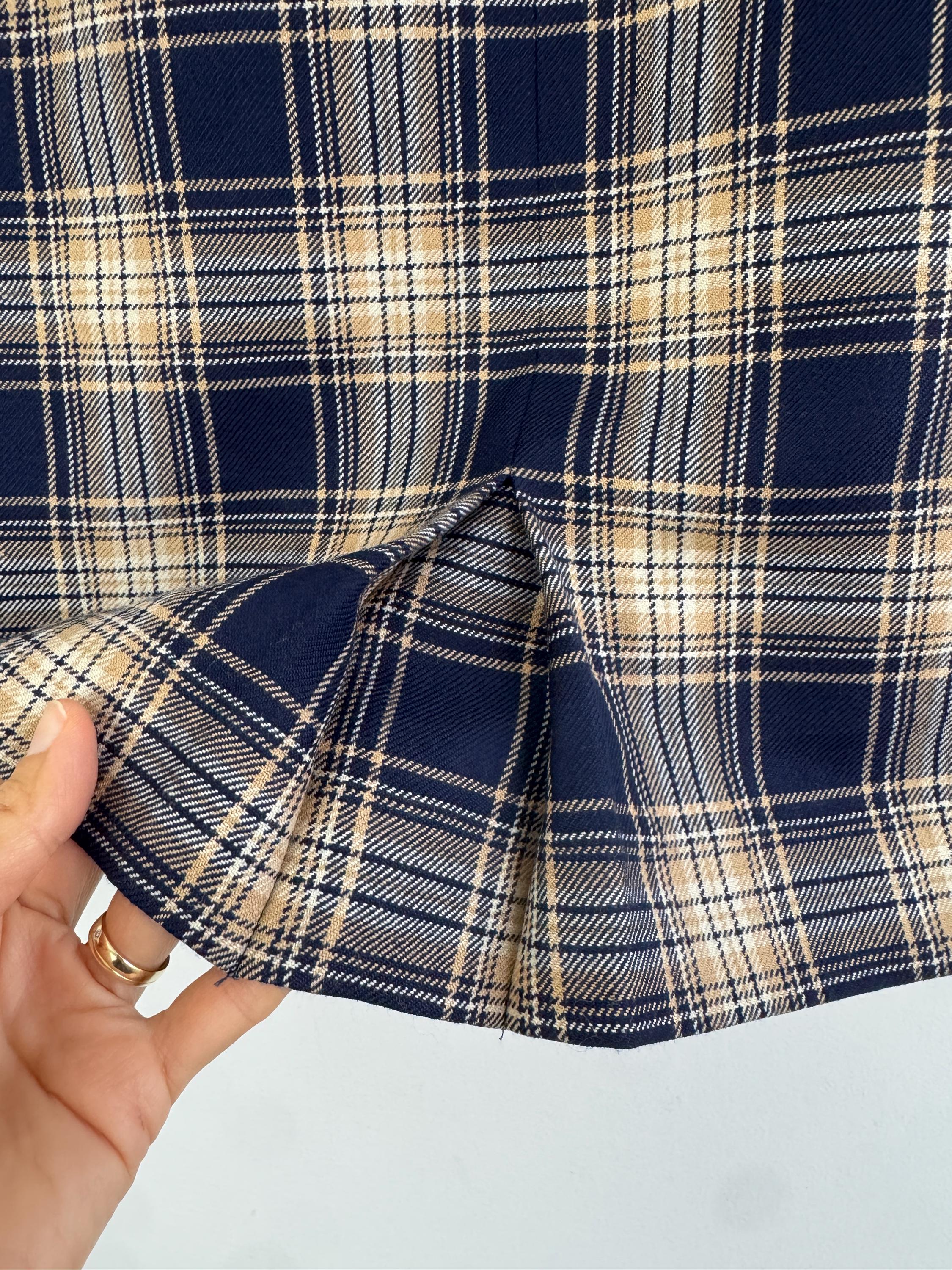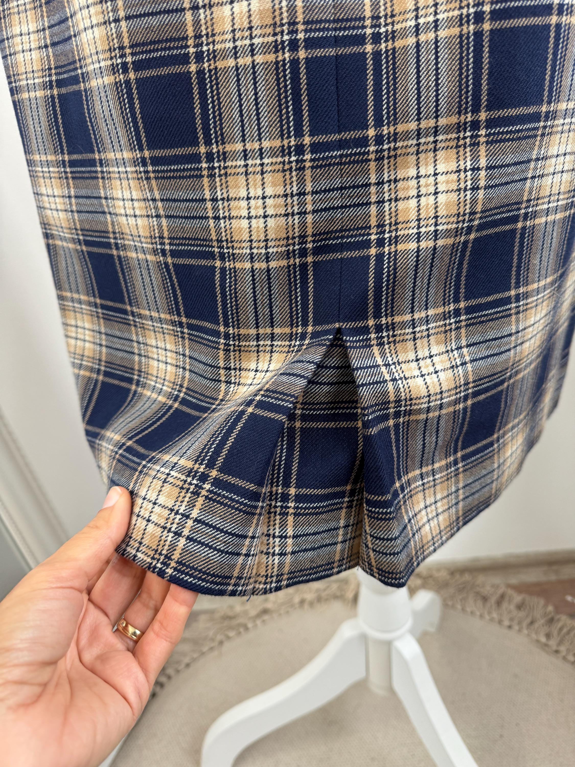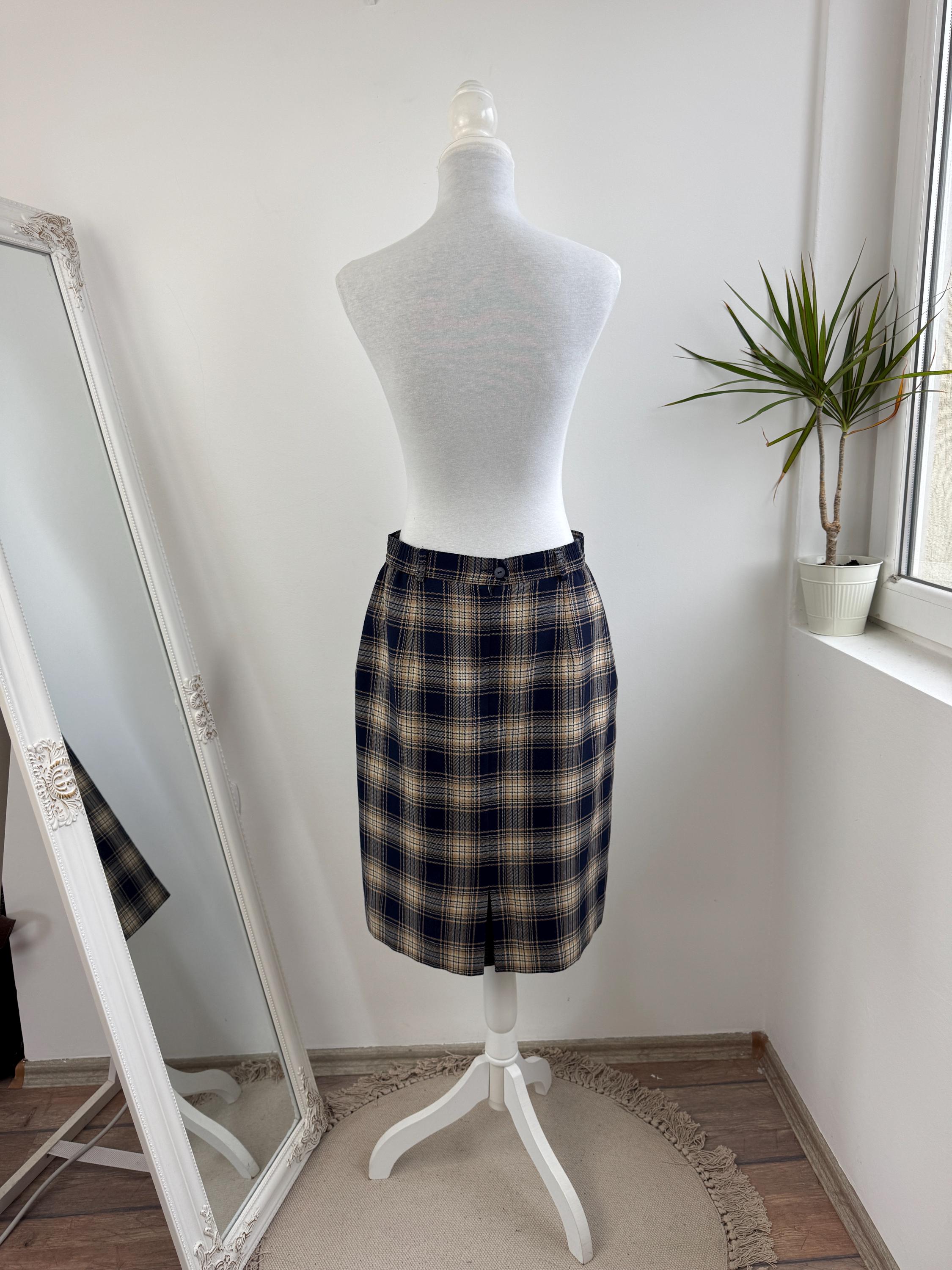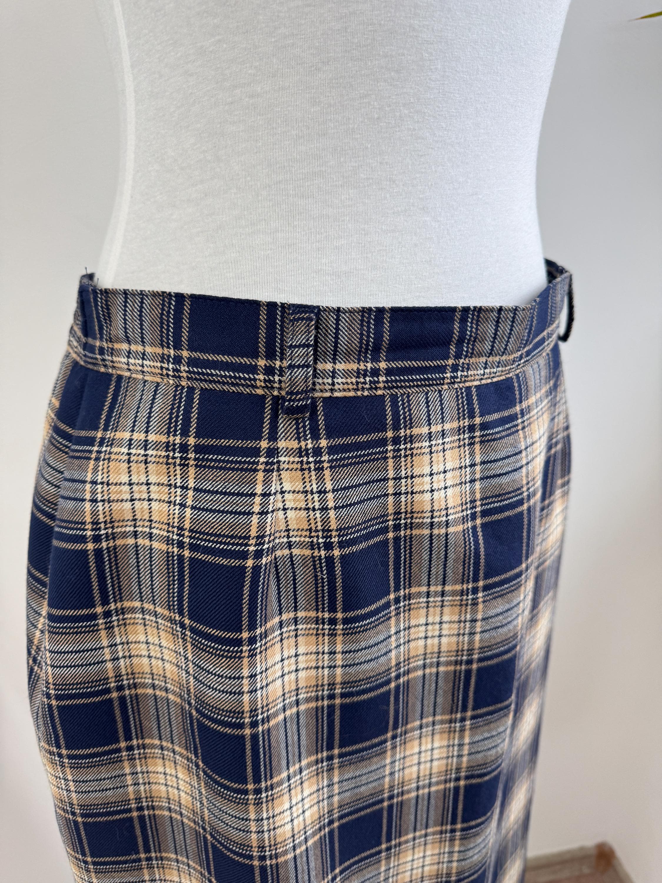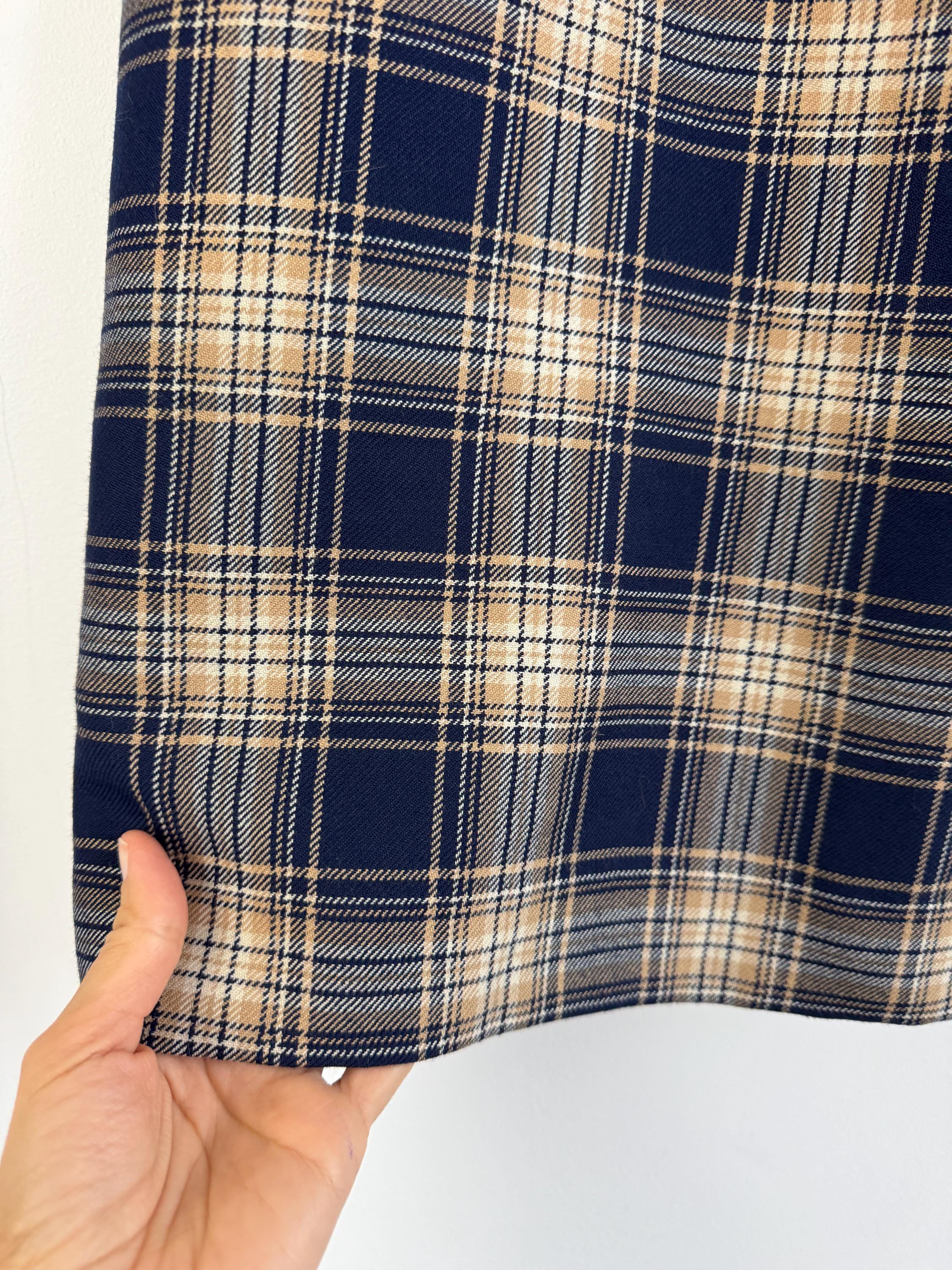 Embrace classic sophistication with this beautifully crafted vintage plaid pencil skirt from the brand Lucia. This timeless piece was Made in West Germany (R.F.A.) and captures the essence of classic 80s early 90s tailoring. The fabric features a rich tartan check pattern in versatile tones of deep navy blue, warm beige/camel, and a subtle touch of brown.