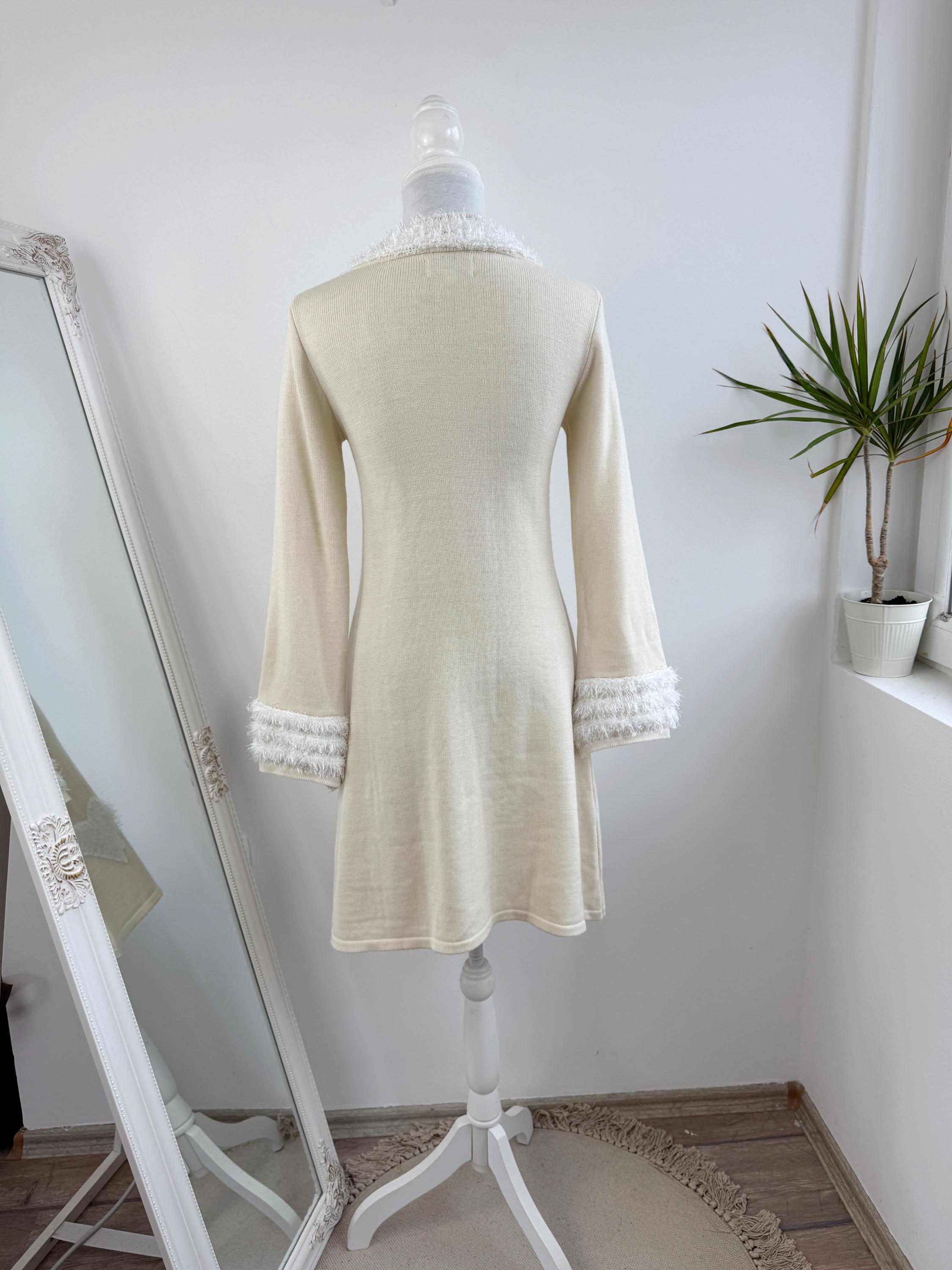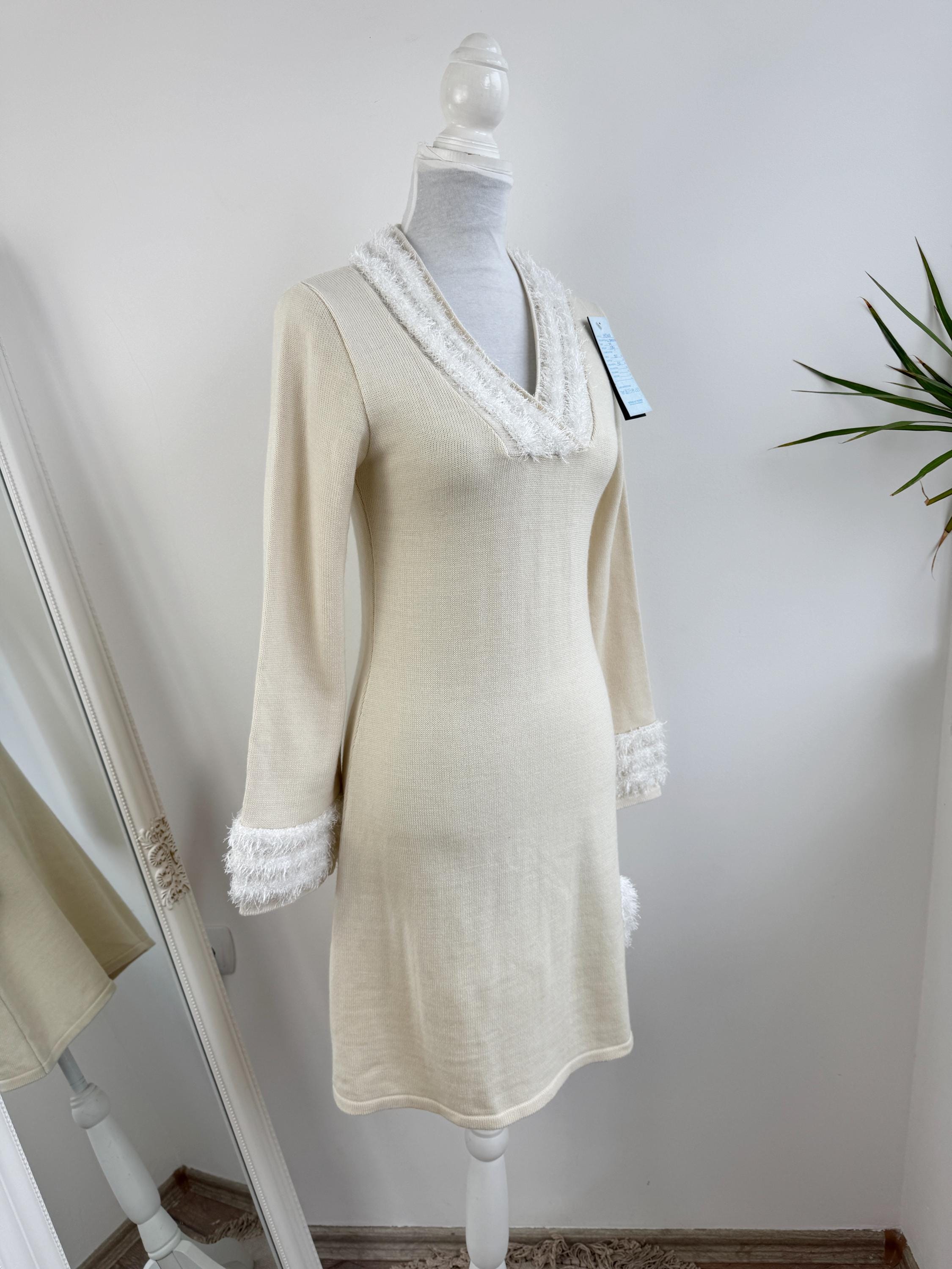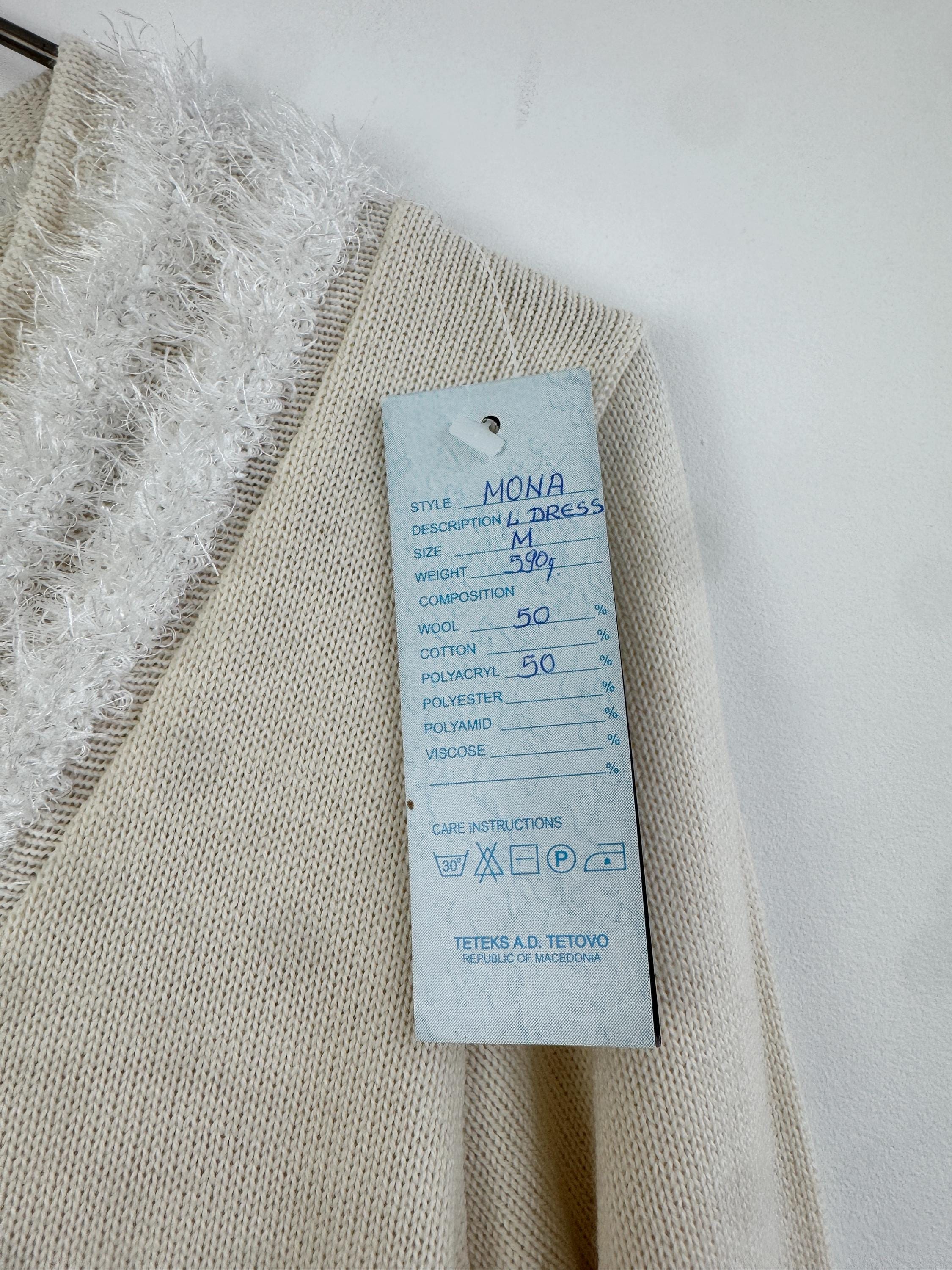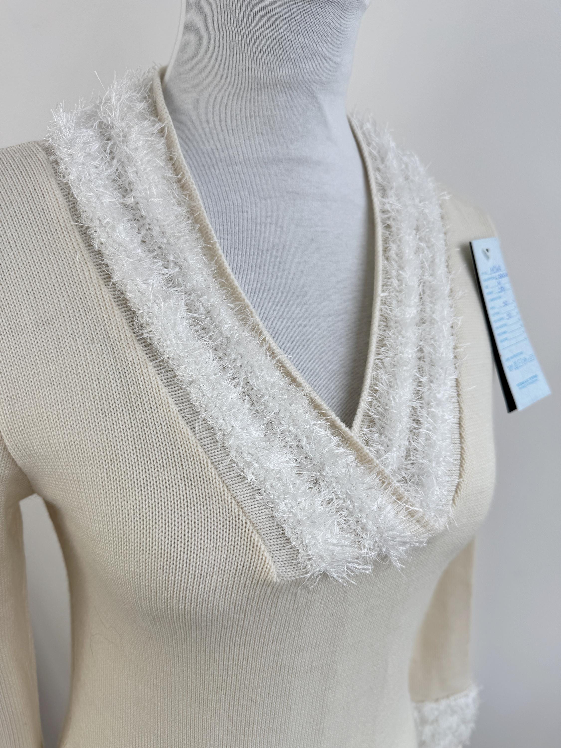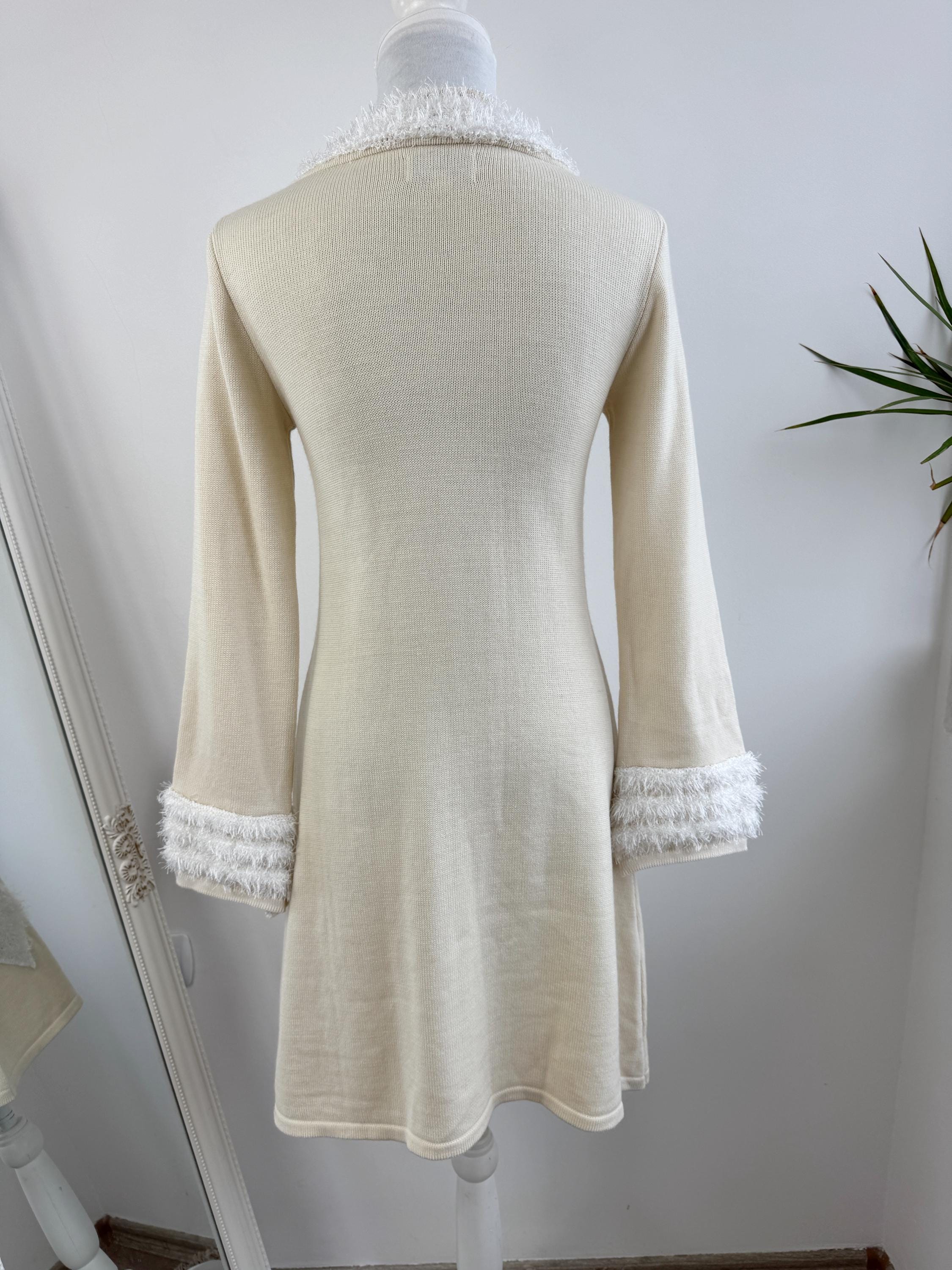 Step into cozy-chic style with this adorable vintage knit sweater dress by Gunn's in Size M a blend of cozy 50% wool/ 50% acrylic fabric. This cream knit dress perfectly captures the sweet, soft aesthetic of Y2K fashion and modern Cottagecore trends. Crafted in a lovely light cream beige tone, the dress features a flattering V-neckline and long sleeves with shaggy trim.