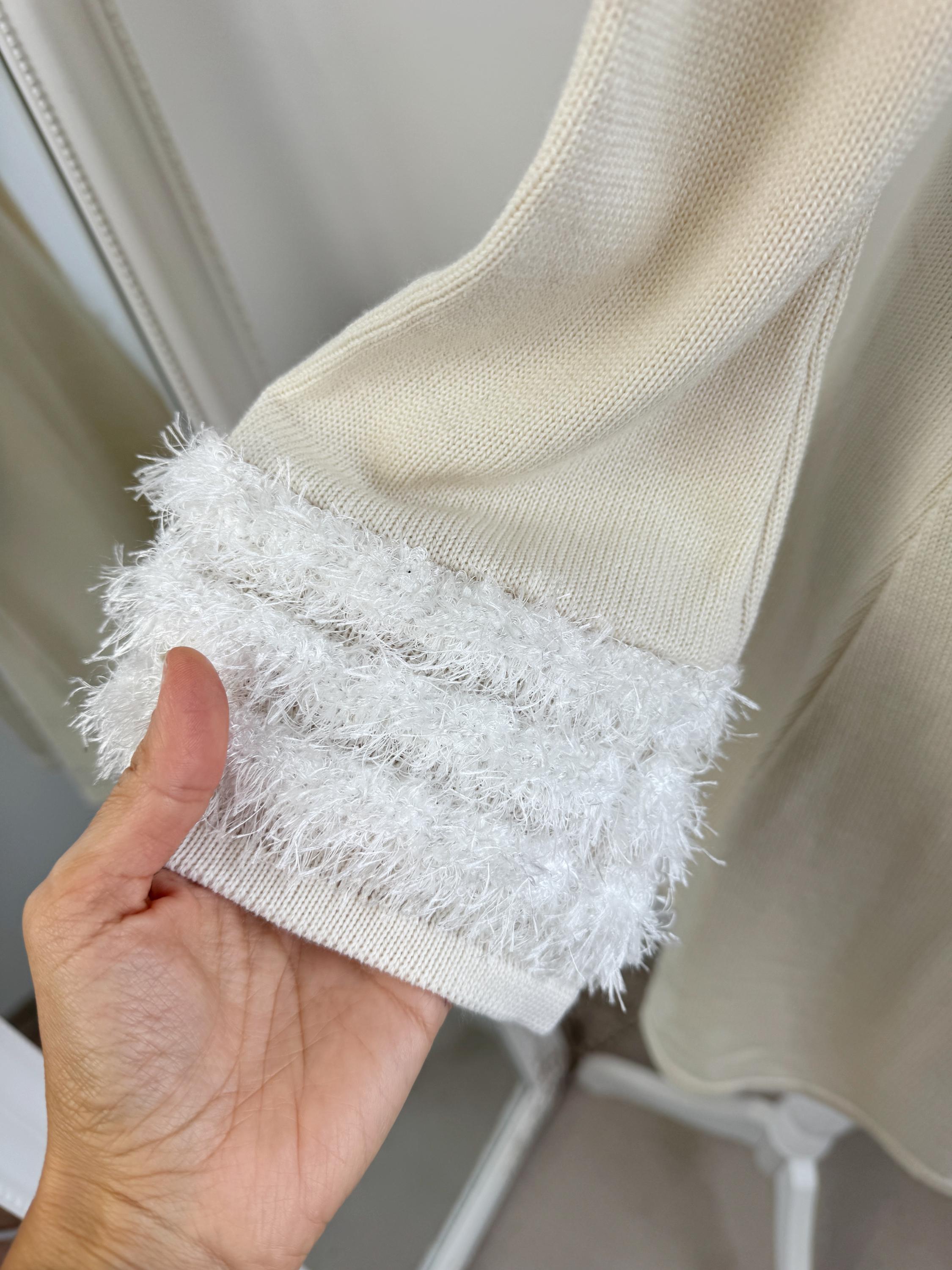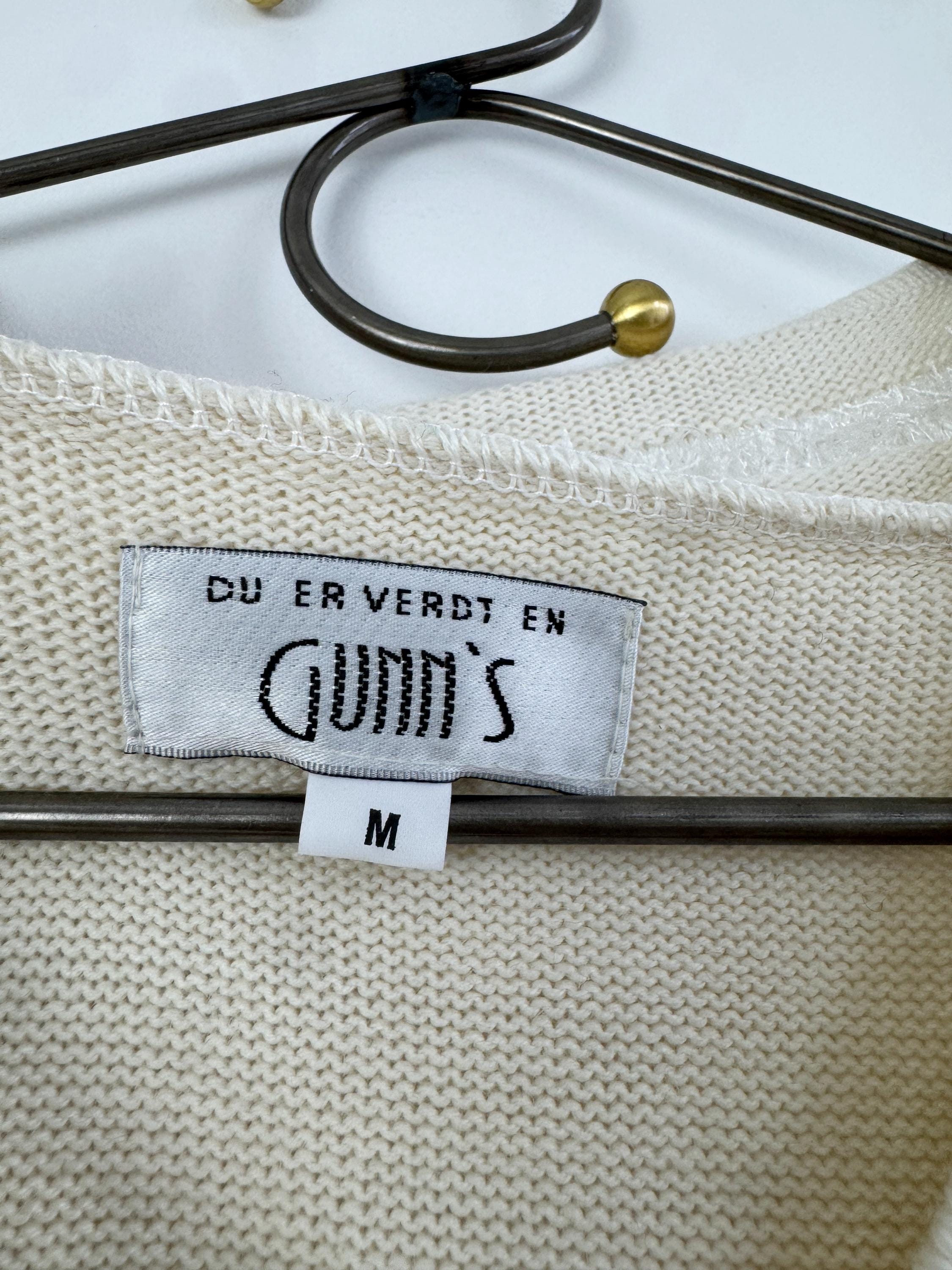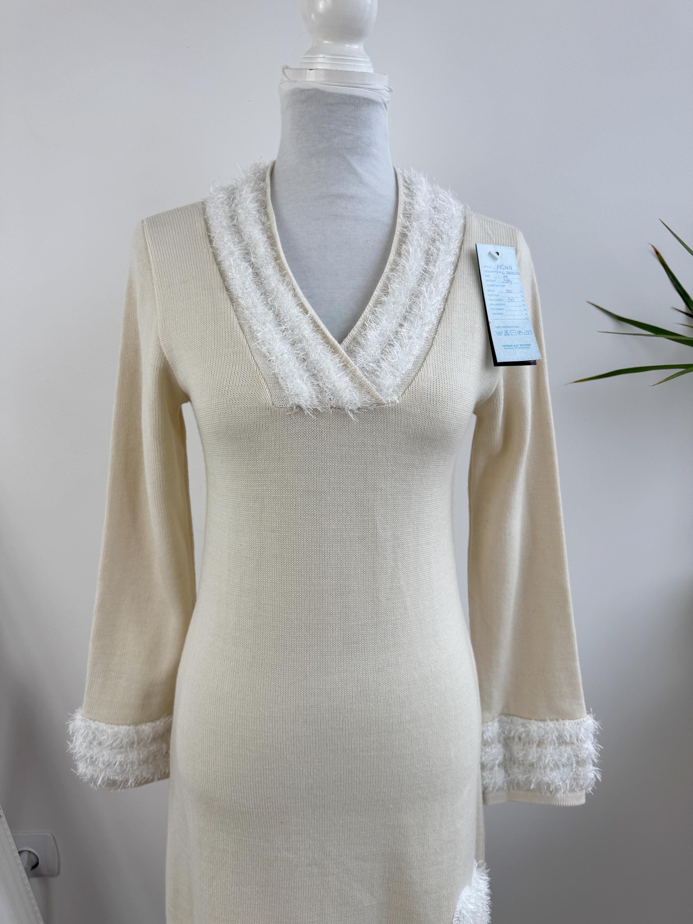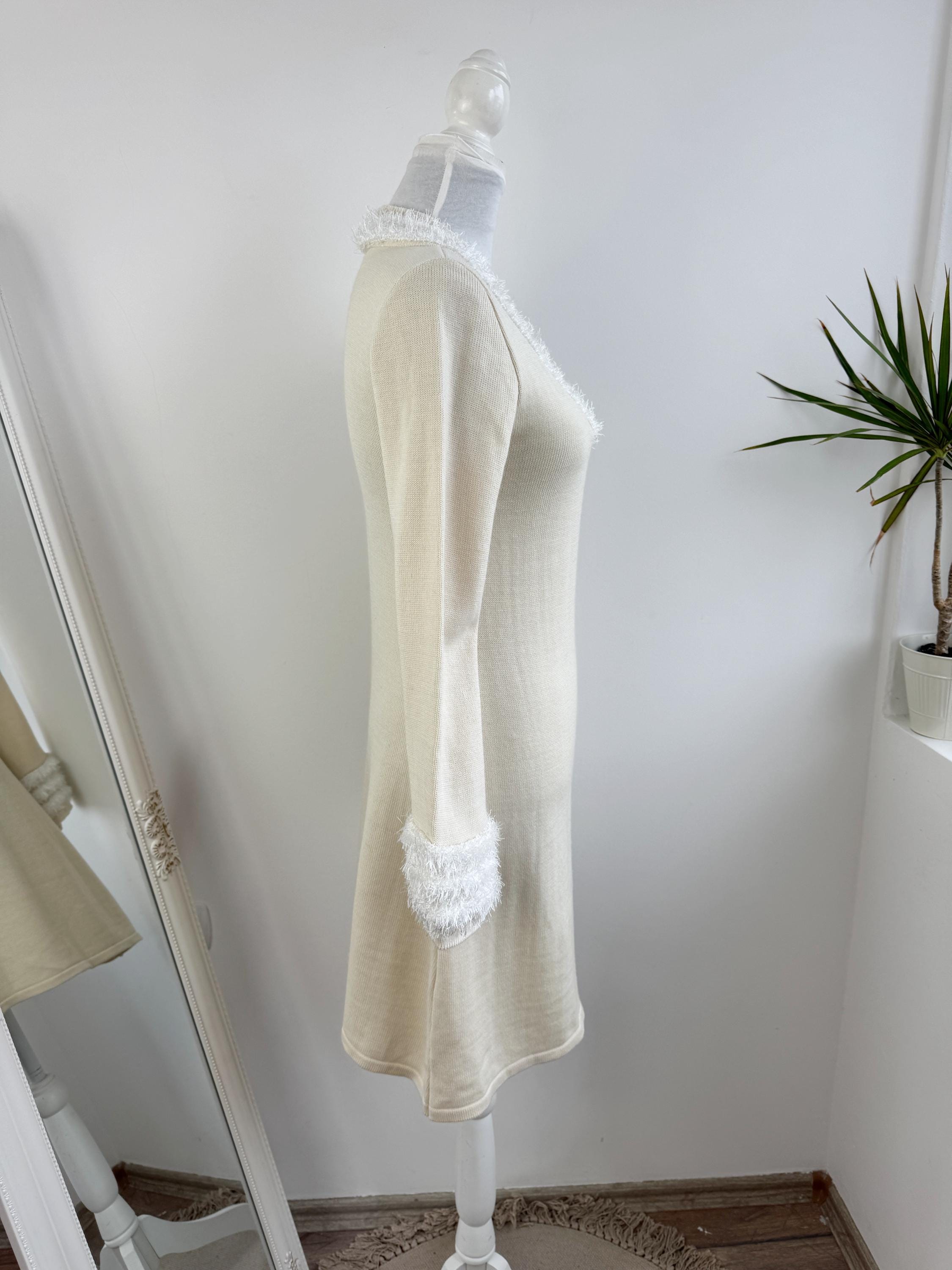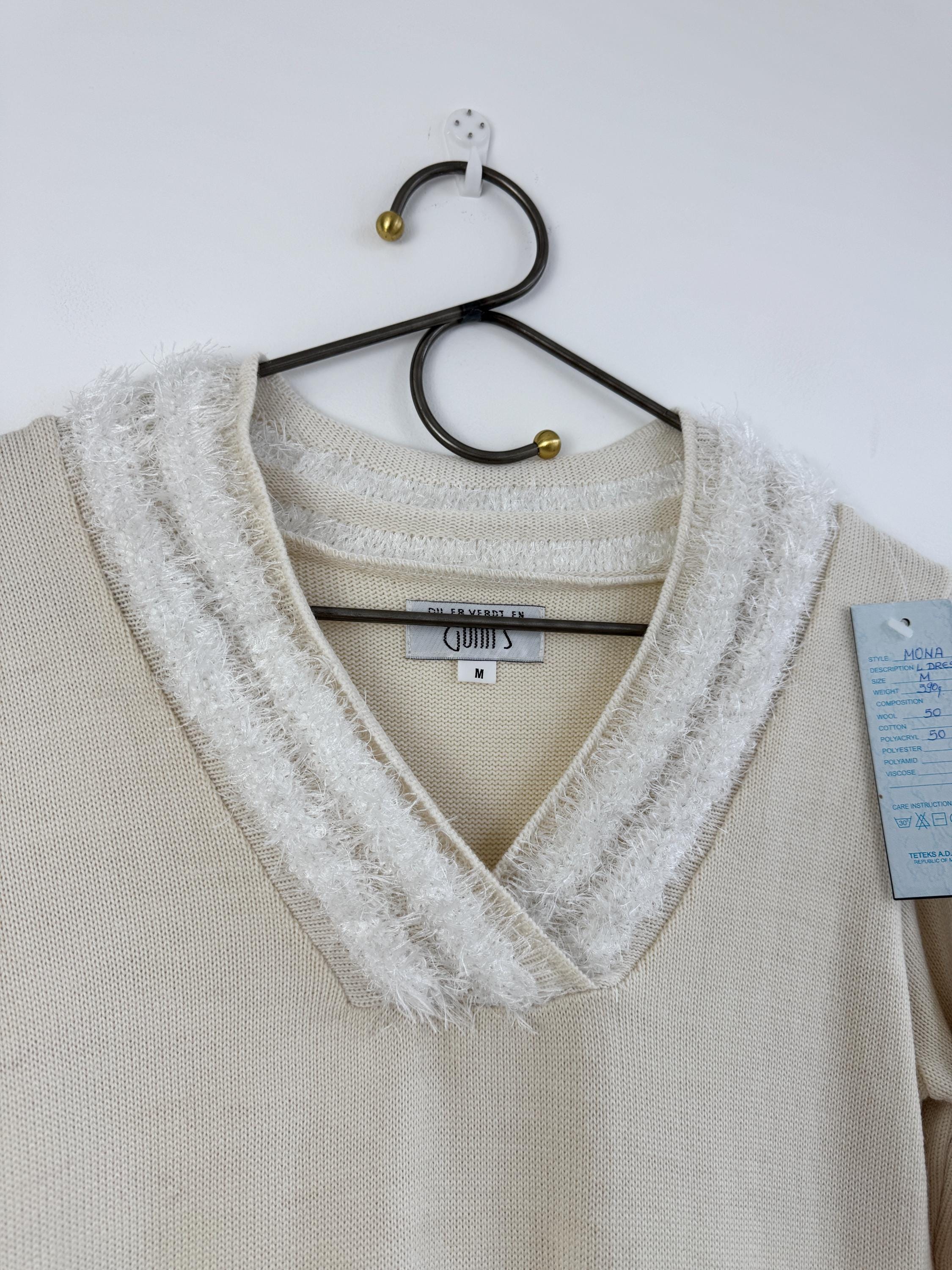 Step into cozy-chic style with this adorable vintage knit sweater dress by Gunn's in Size M a blend of cozy 50% wool/ 50% acrylic fabric. This cream knit dress perfectly captures the sweet, soft aesthetic of Y2K fashion and modern Cottagecore trends. Crafted in a lovely light cream beige tone, the dress features a flattering V-neckline and long sleeves with shaggy trim.