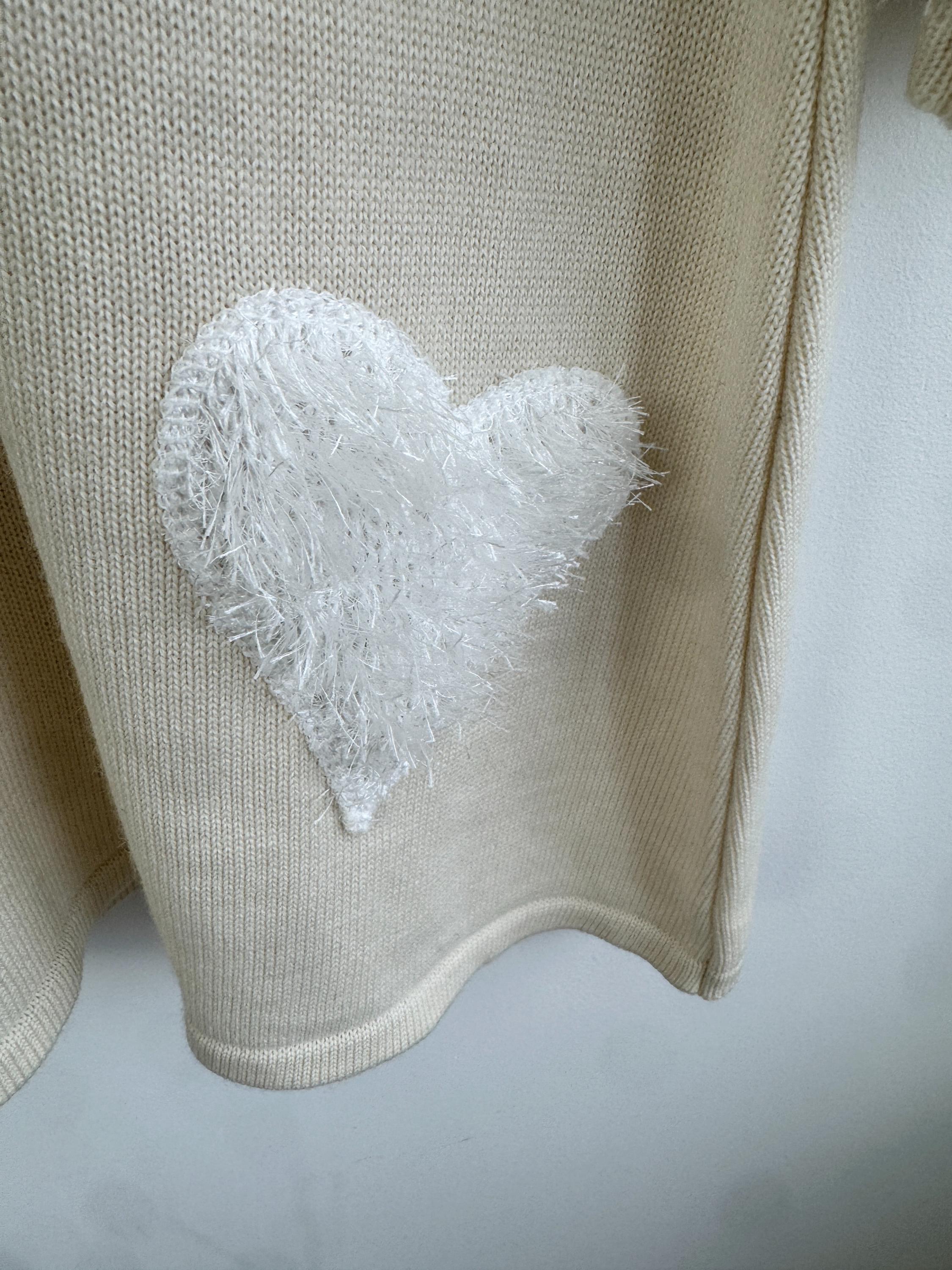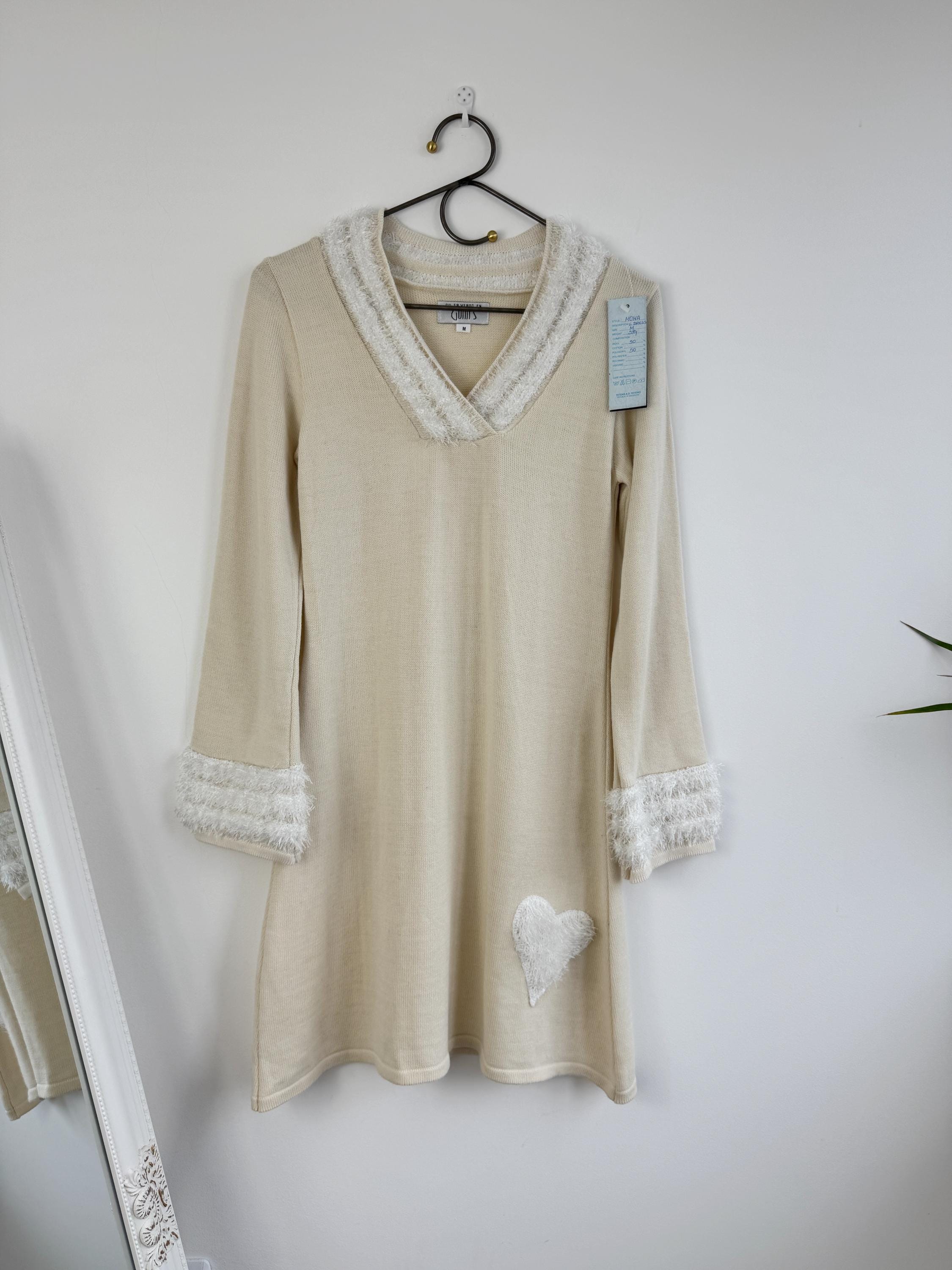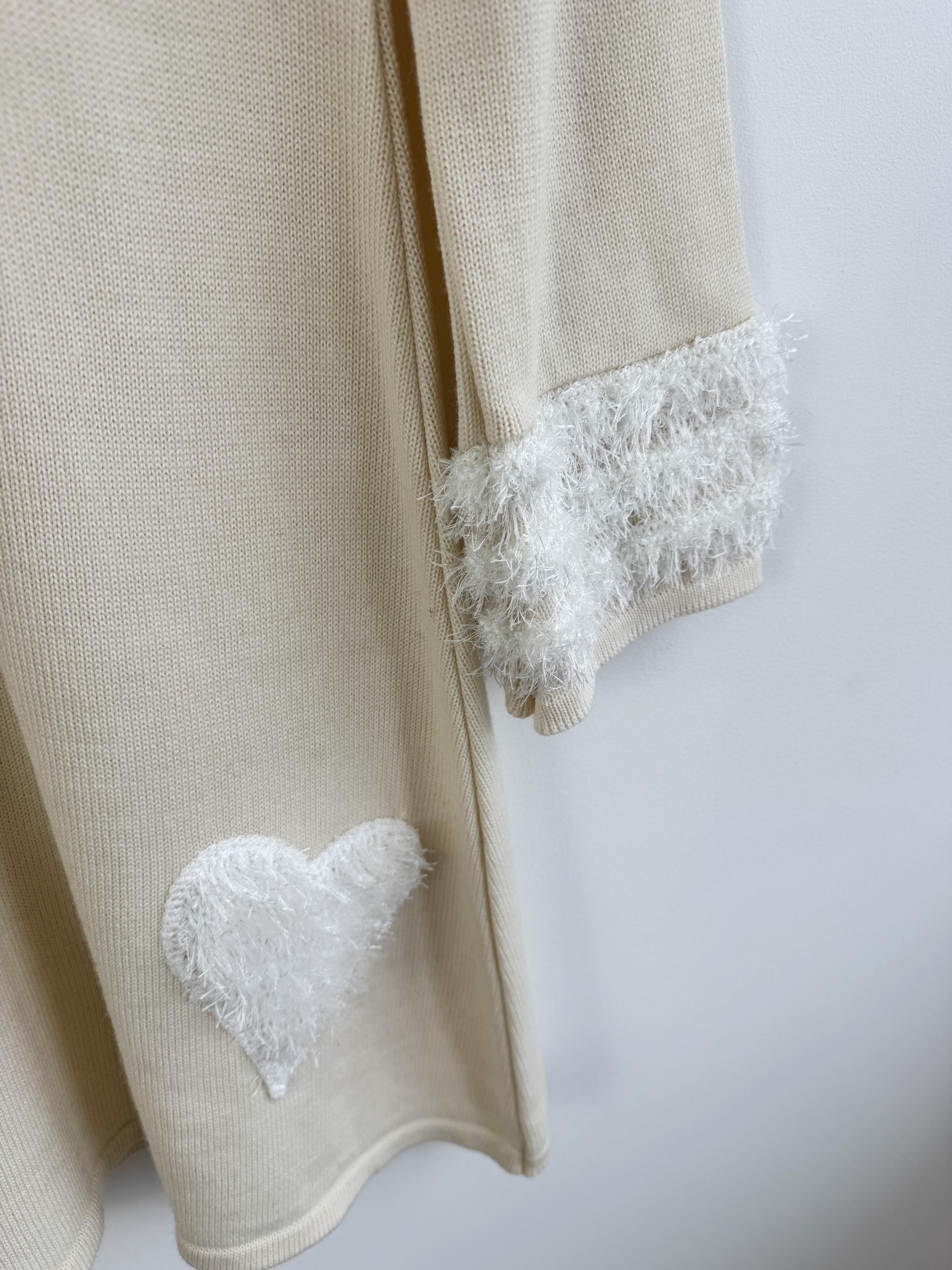 The real charm lies in the unique fuzzy accents: a shaggy white trim details the V-neck and cuffs, and a delicate white fluffy heart appliqué rests near the hem. The knit is comfortable, stretchy, and perfect for layering during the cooler months. Based on the measurements and stretchy nature, it fits beautifully as a mini dress or a longer tunic top depending on your height.