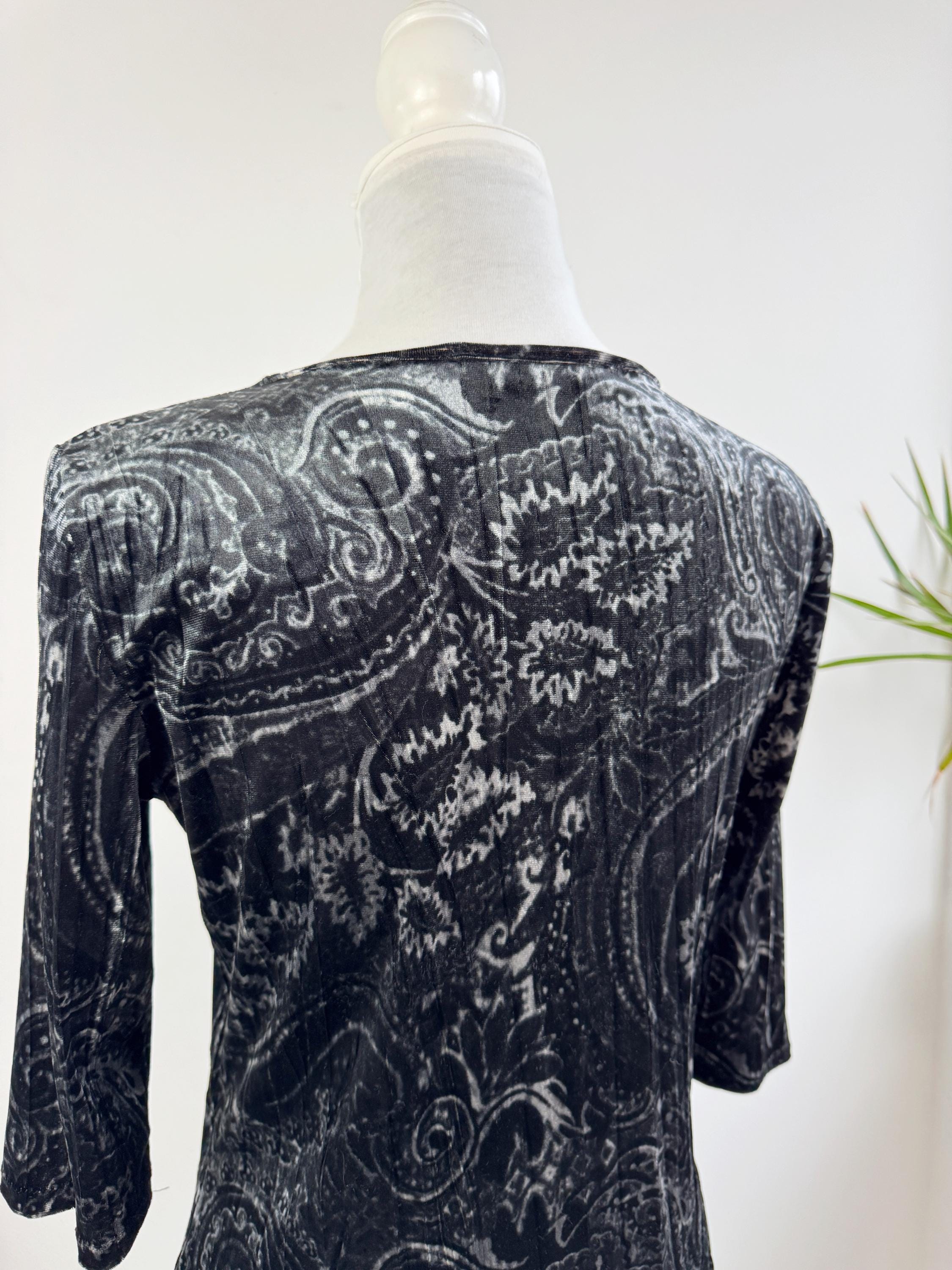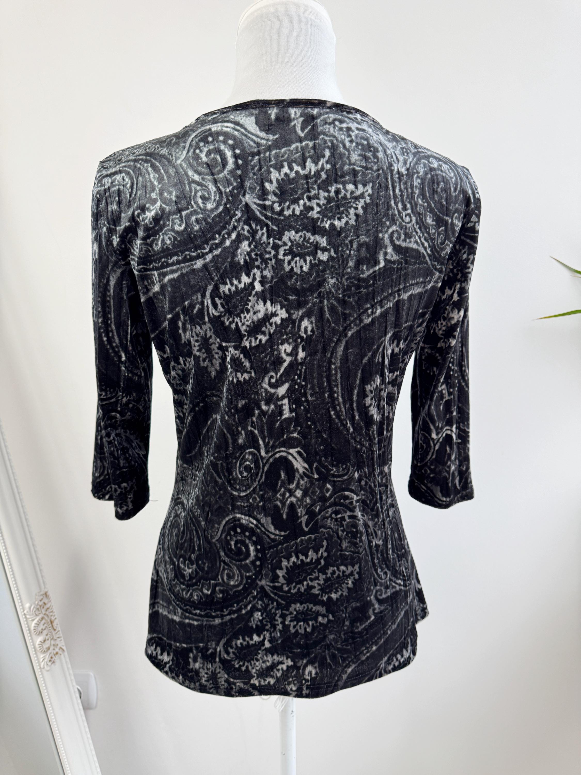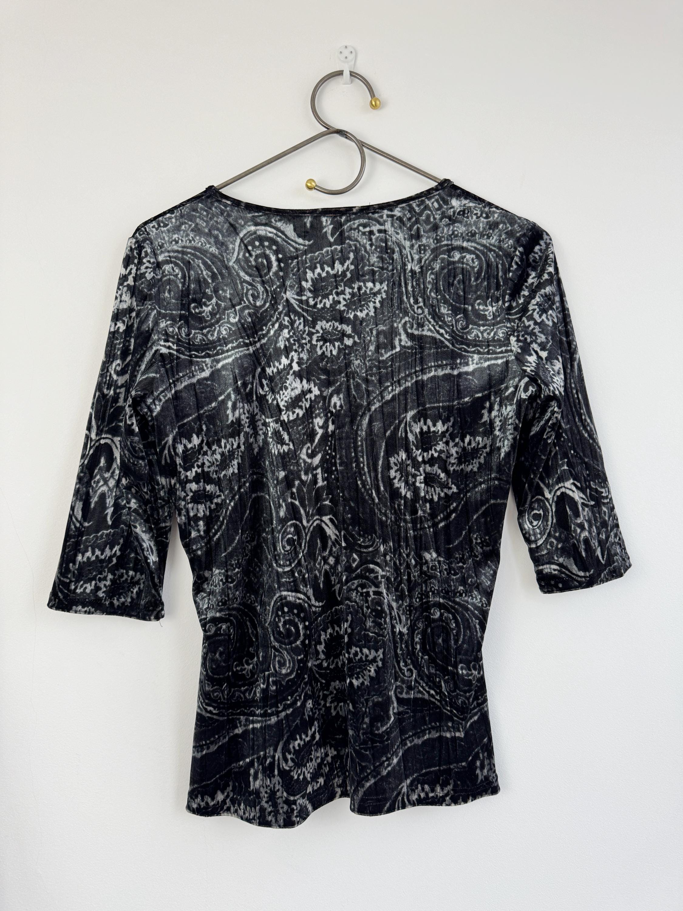 This is a stunning vintage crushed velvet top from KappAhl in size S from the late 90s and Y2K era. This elegant black silver grey top features an all-over intricate paisley print in contrasting shades of silvery-grey and black, offering a beautiful shimmer as the light catches the velvet texture.