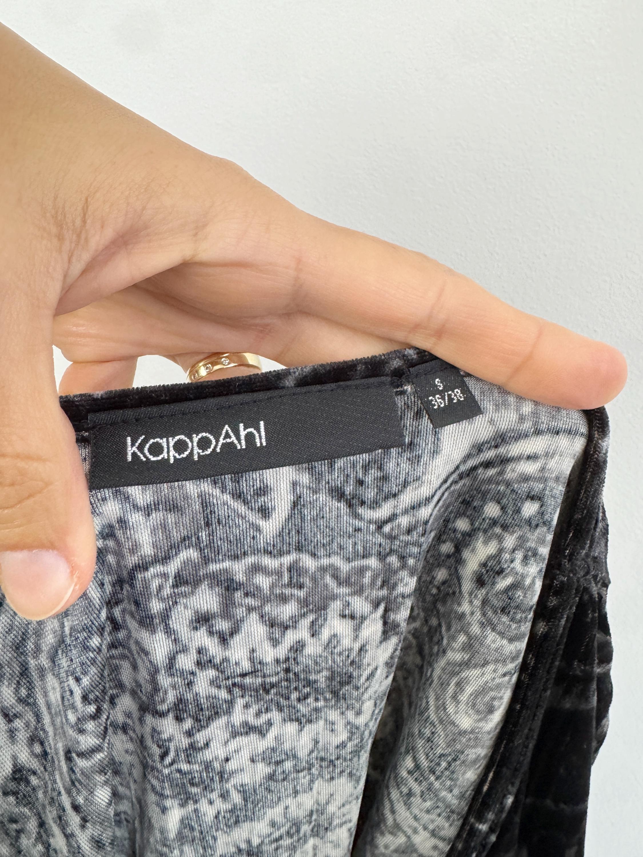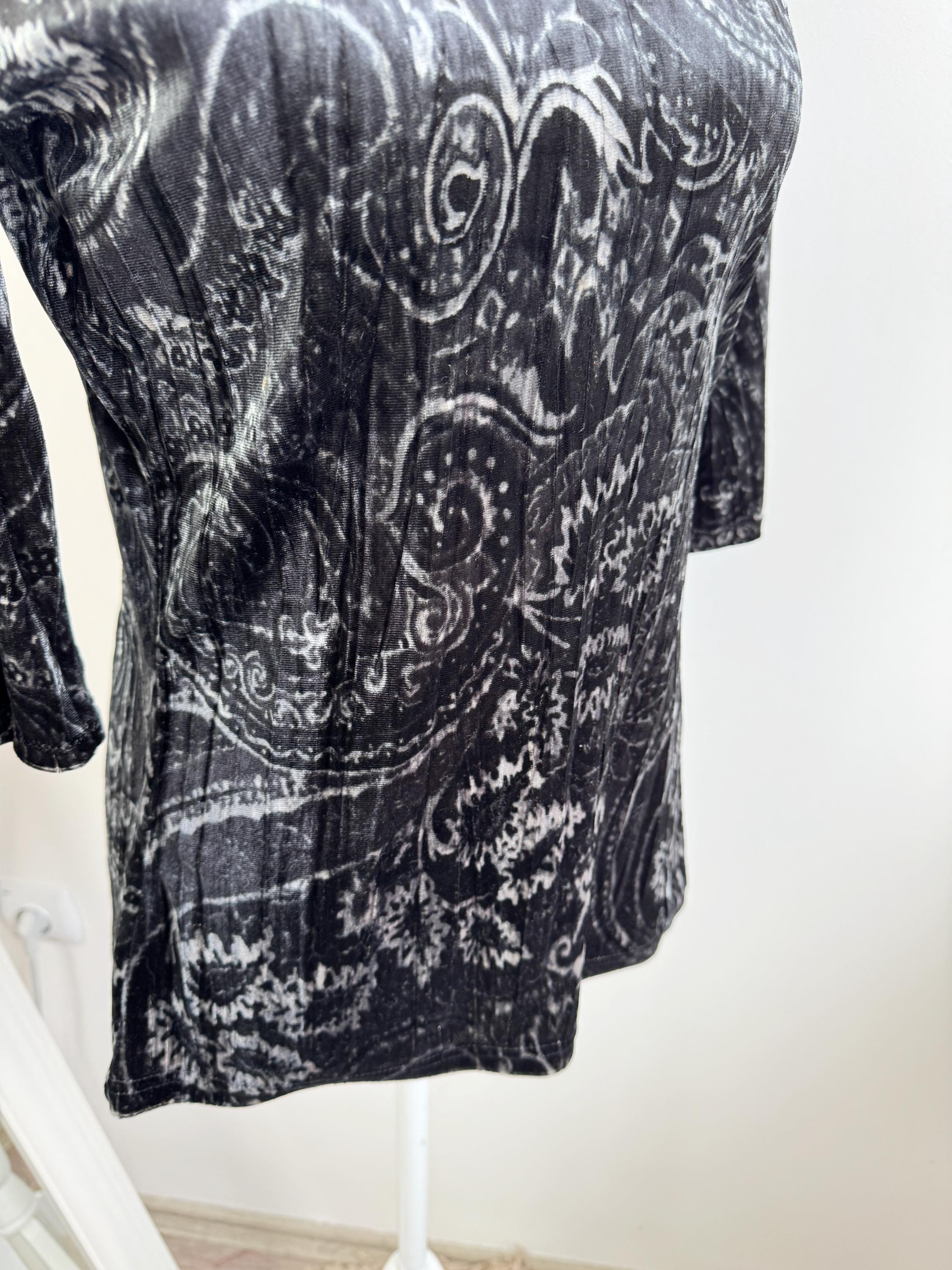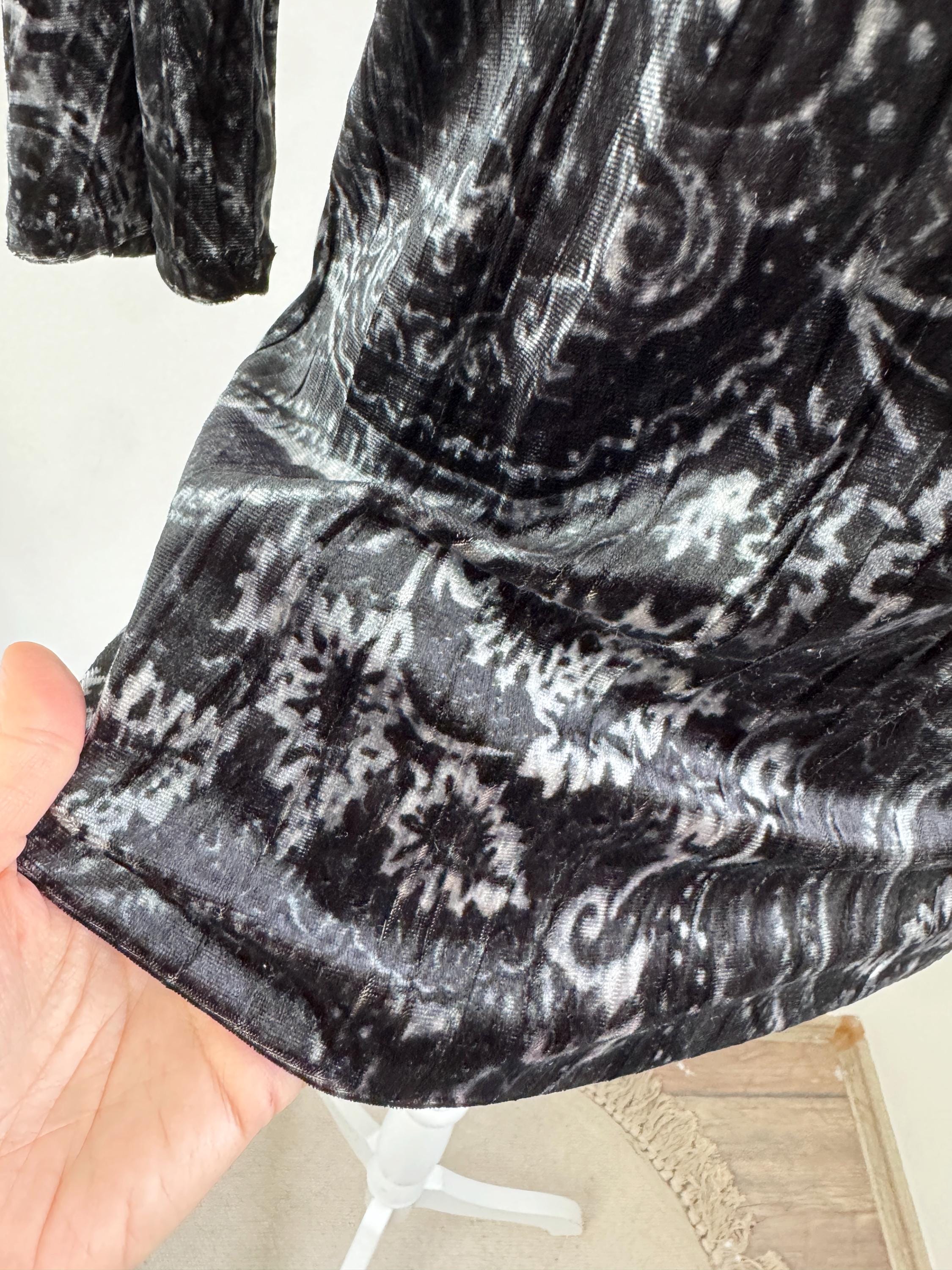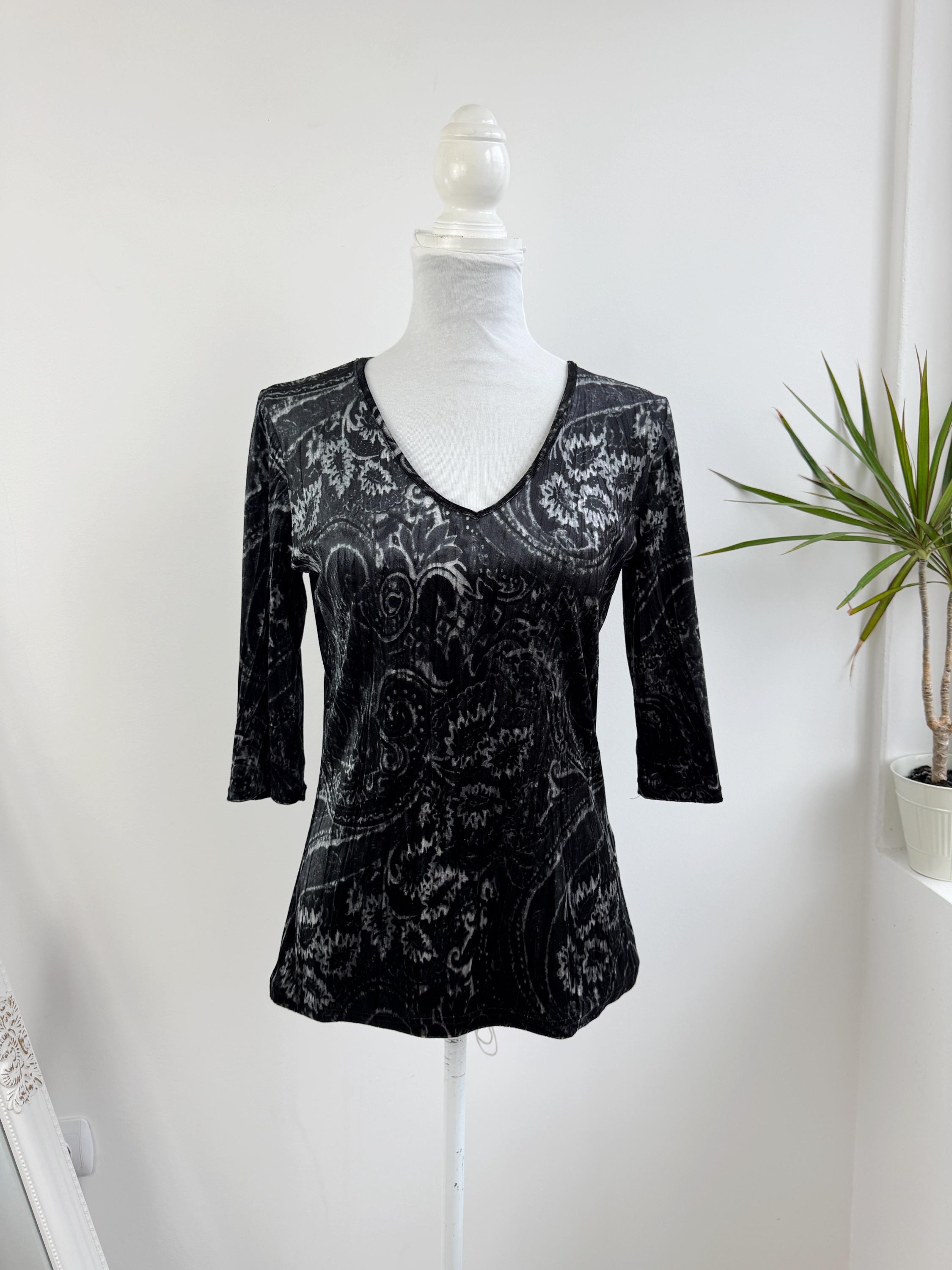 This is a stunning vintage crushed velvet top from KappAhl in size S from the late 90s and Y2K era. This elegant black silver grey top features an all-over intricate paisley print in contrasting shades of silvery-grey and black, offering a beautiful shimmer as the light catches the velvet texture.