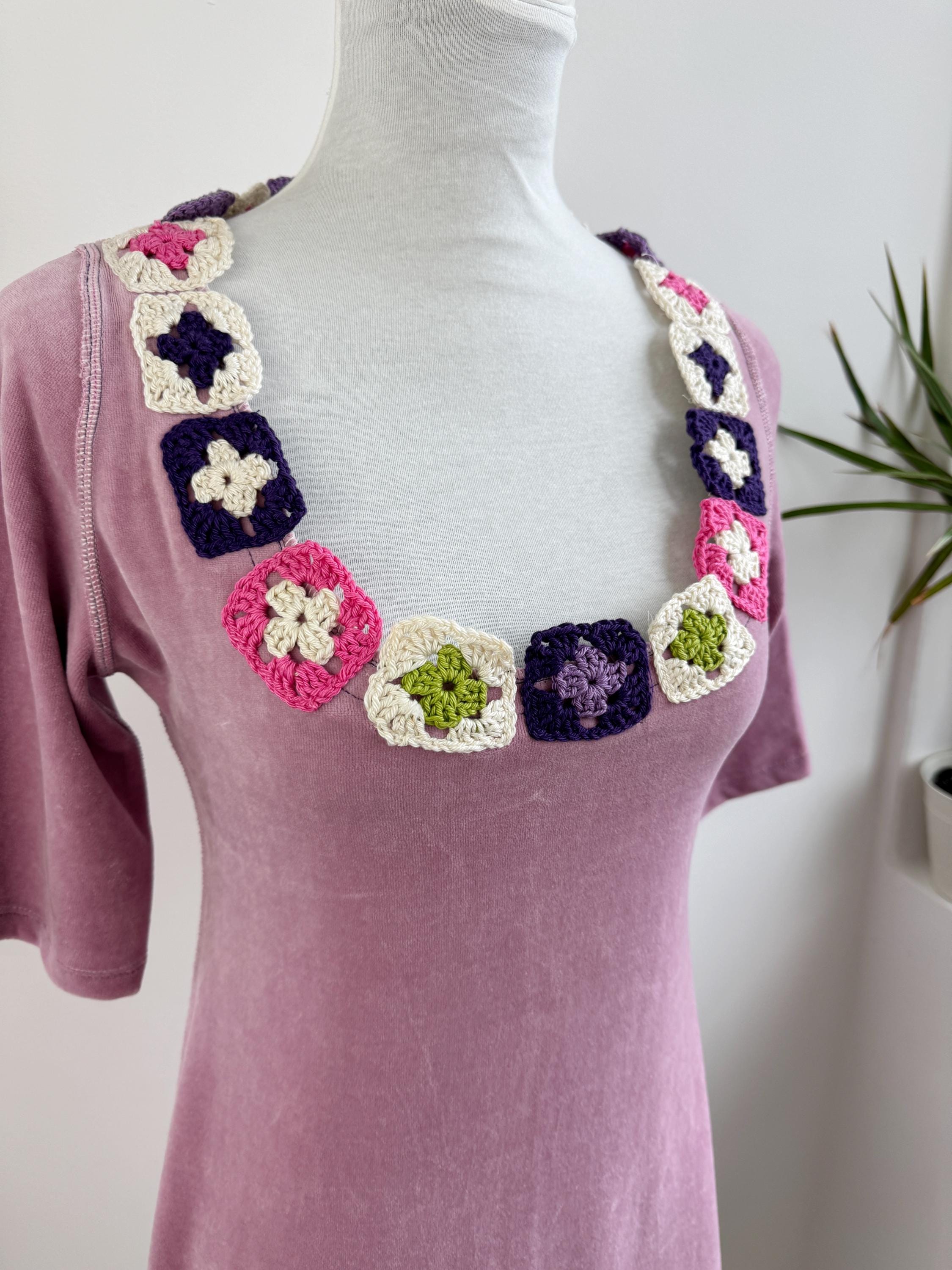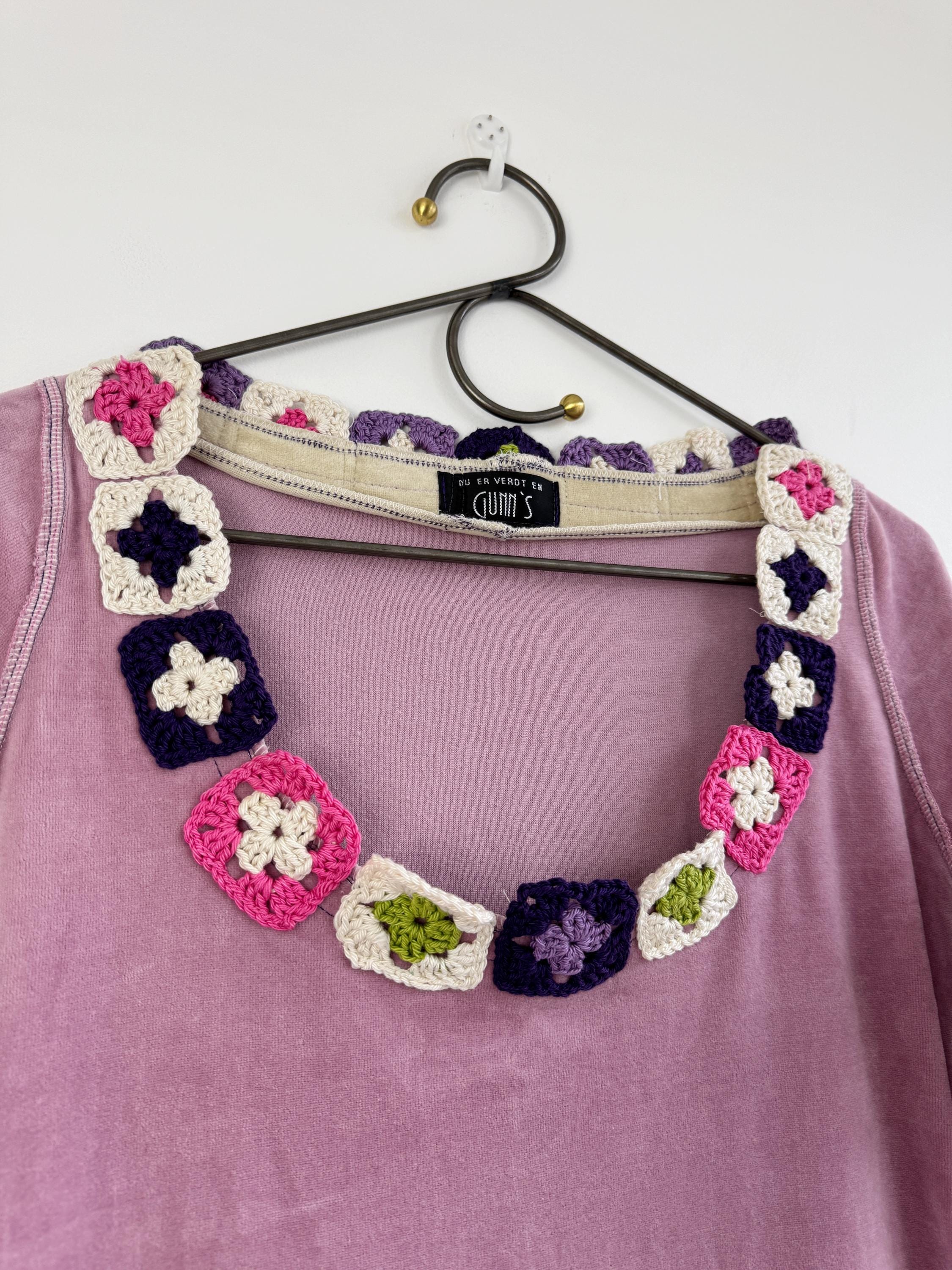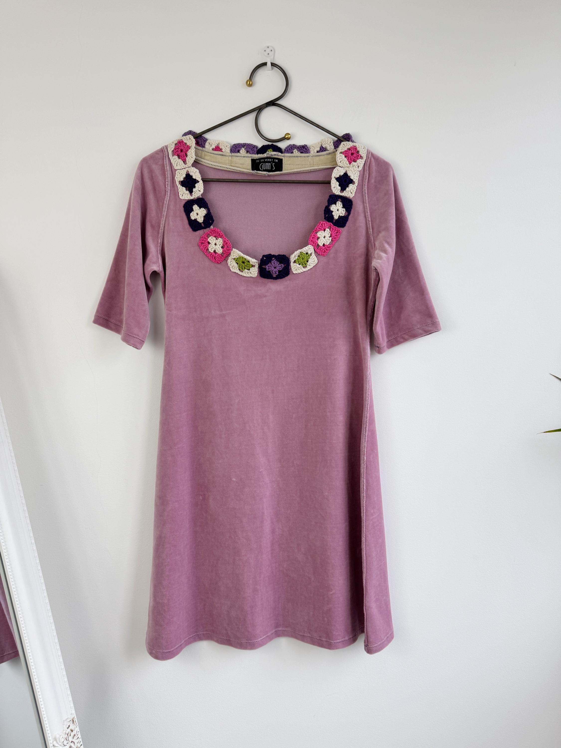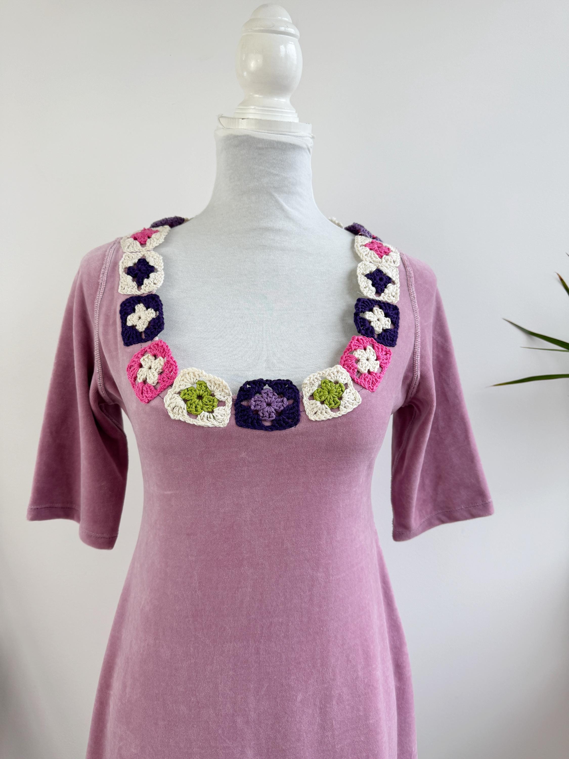 The star of this pink velvet dress is the spectacular crochet granny square collar, which features floral motifs in a fun color palette of purple, magenta, cream, and olive green. The soft texture and vibrant neckline make this retro velour tunic perfect for transitioning seasons.