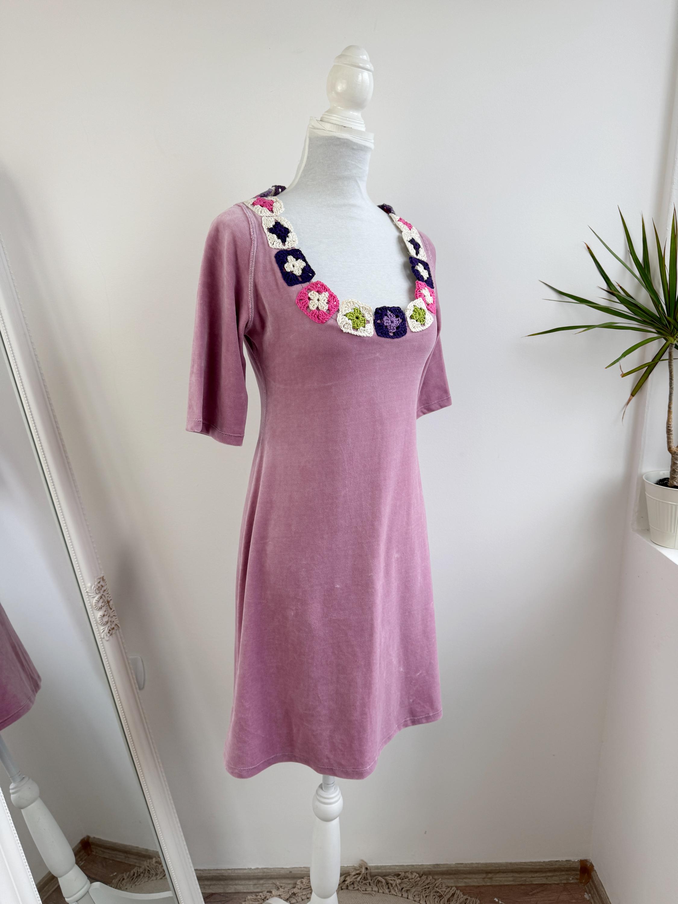 🎨 Color: Dusty Pink/Mauve (Dress) and Multi-color (Purple, Pink, Green, Cream crochet)