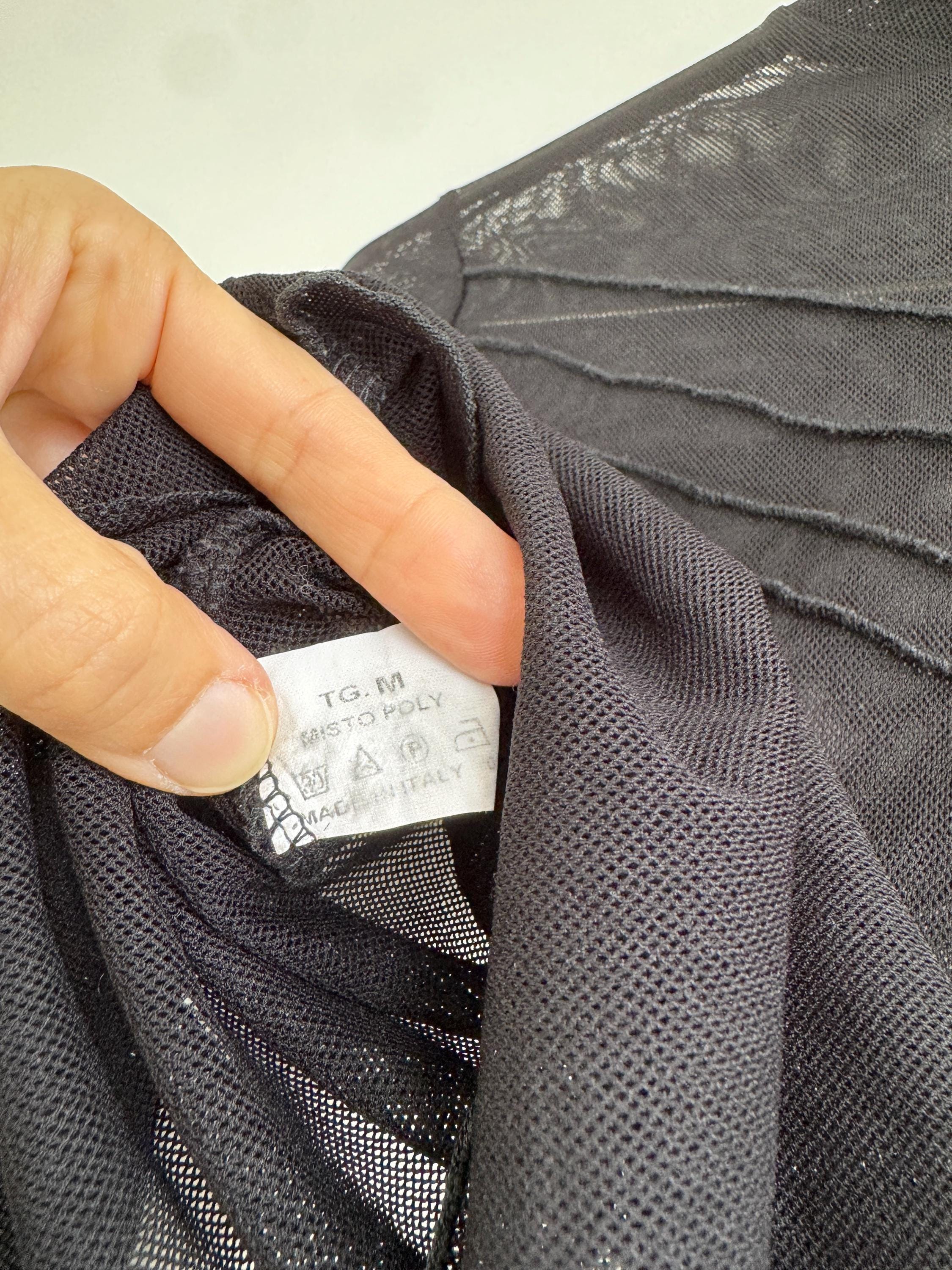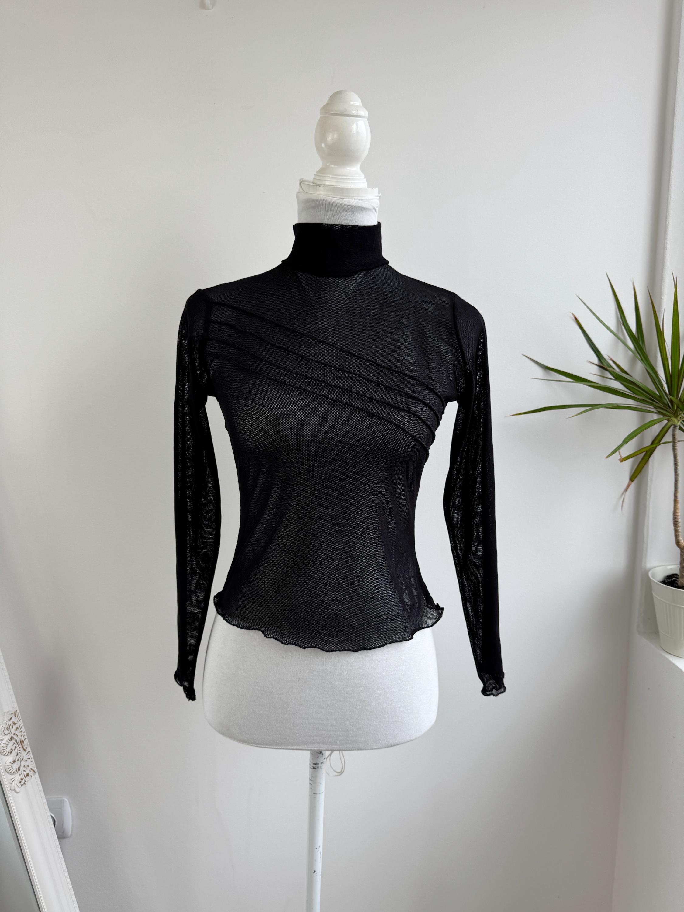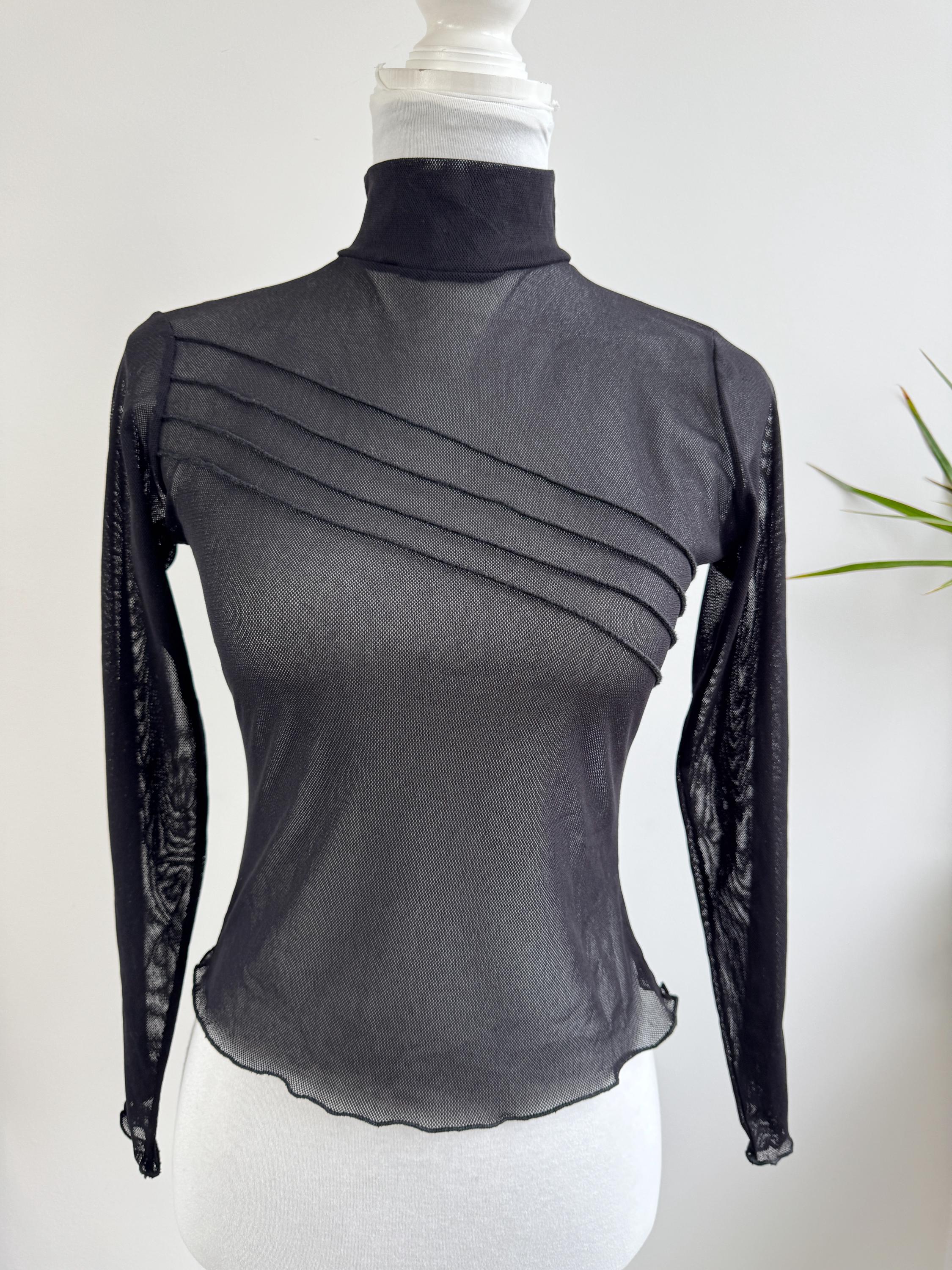 Elevate your wardrobe with our stunning Black Sheer Tulle Top in size S/M! This see-through, stretchy polyester crop top features long sleeves and a chic high turtle neck, perfect for layering or making a bold statement. Tailored in Italy, it's design offers a flattering fit that blends elegance with comfort. Whether paired with high-waisted jeans or a stylish skirt, this overlay top is a must-have for any fashion-forward individual. Embrace sophistication and versatility with this exquisite piece!
