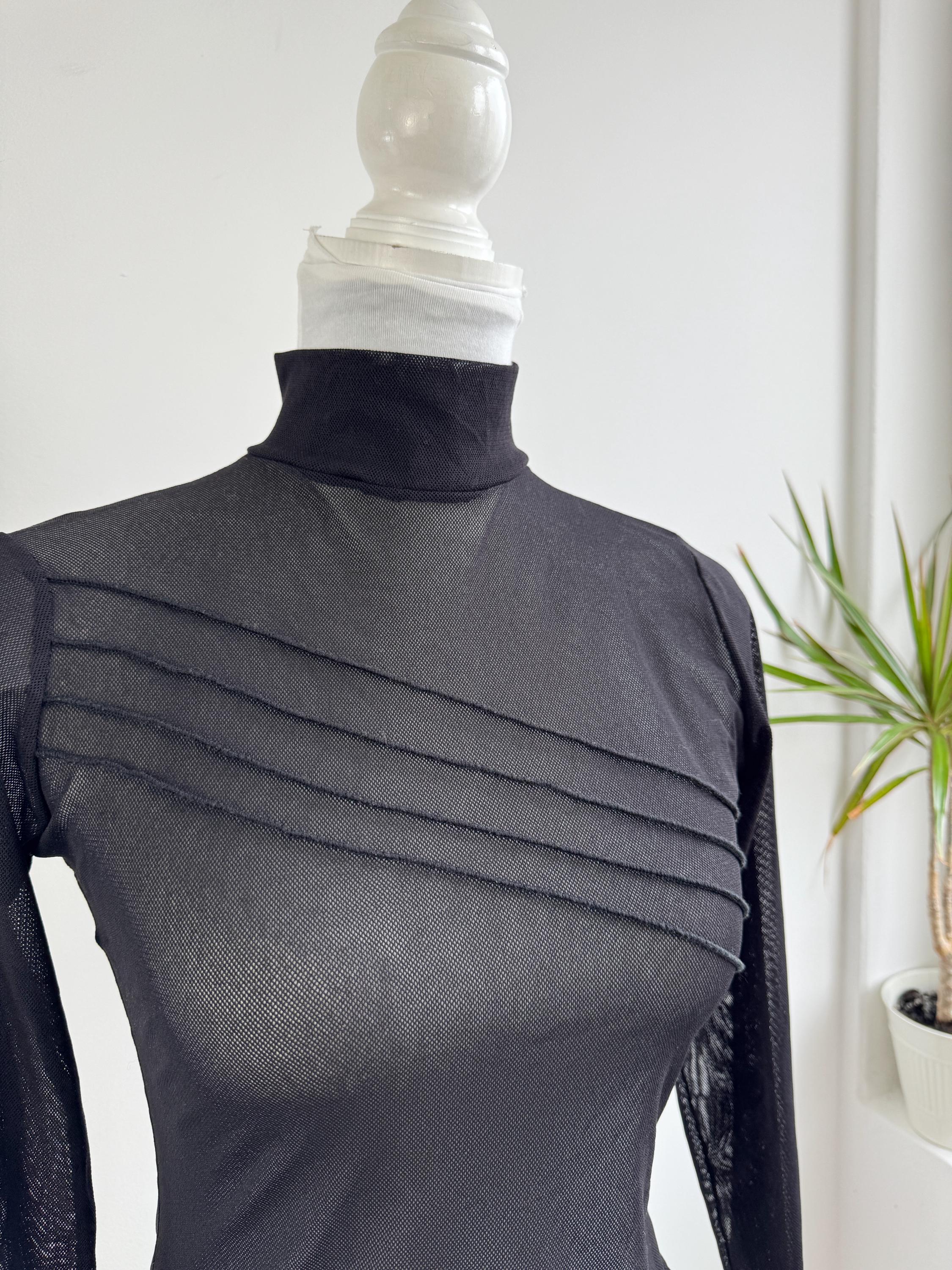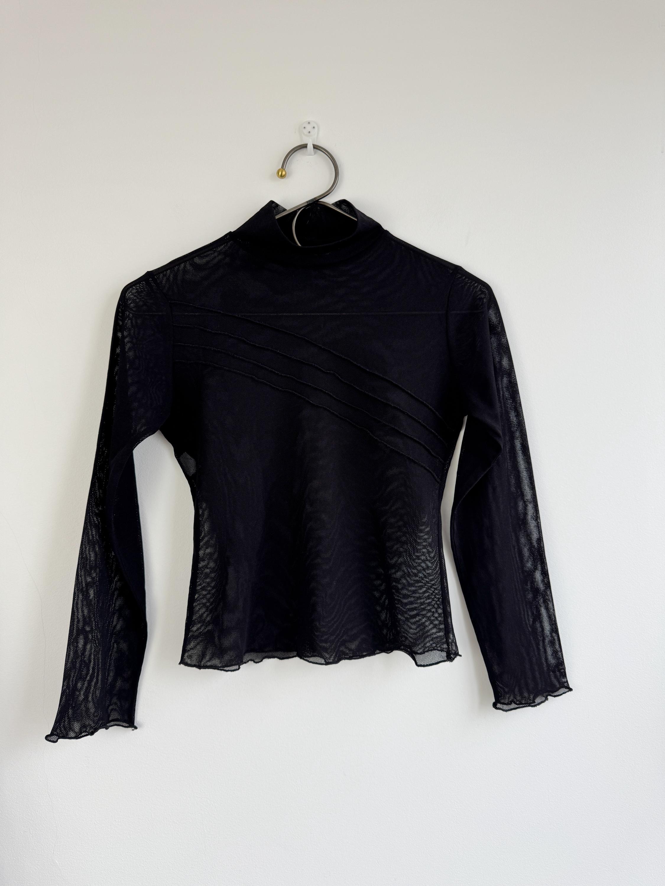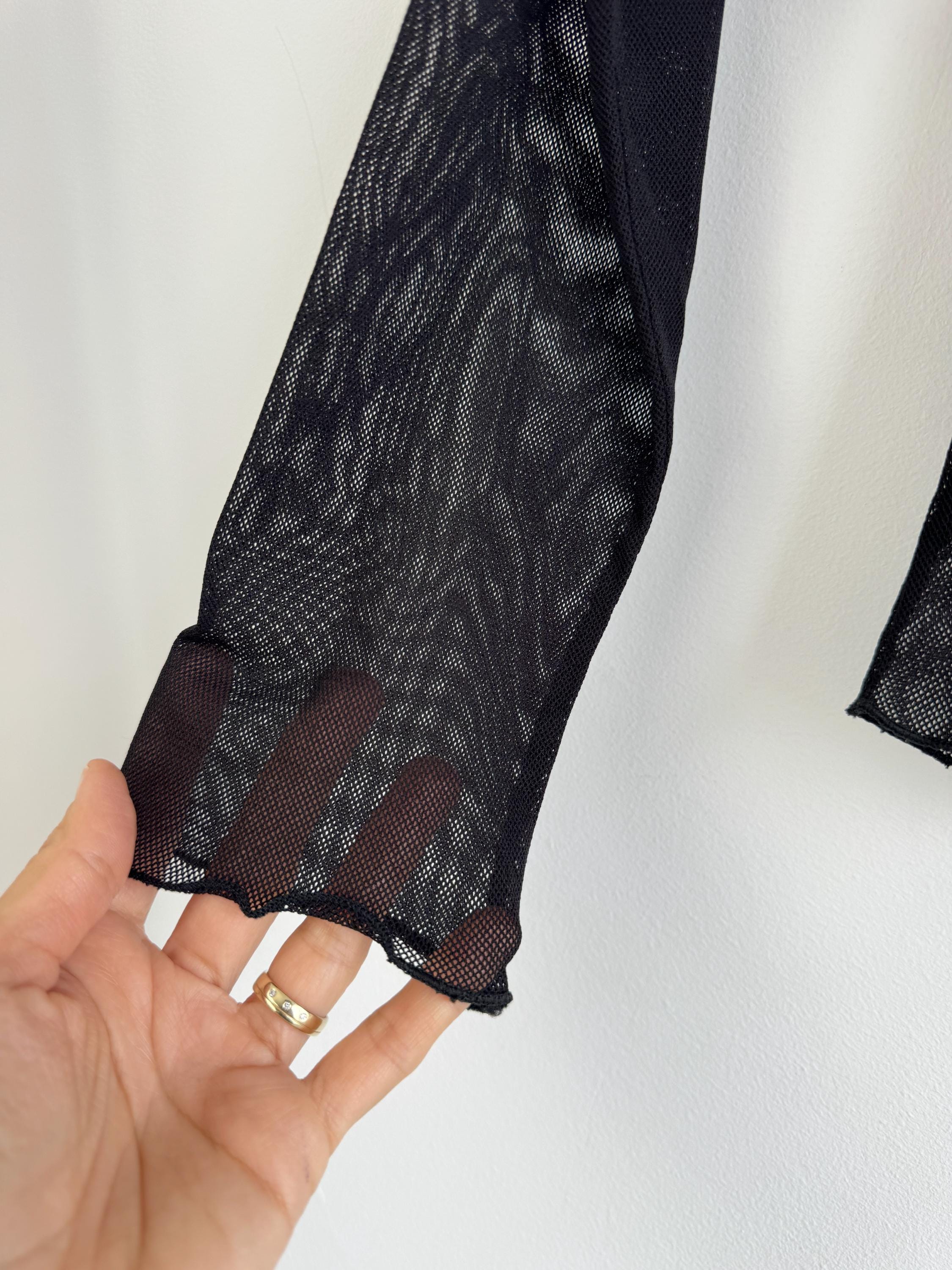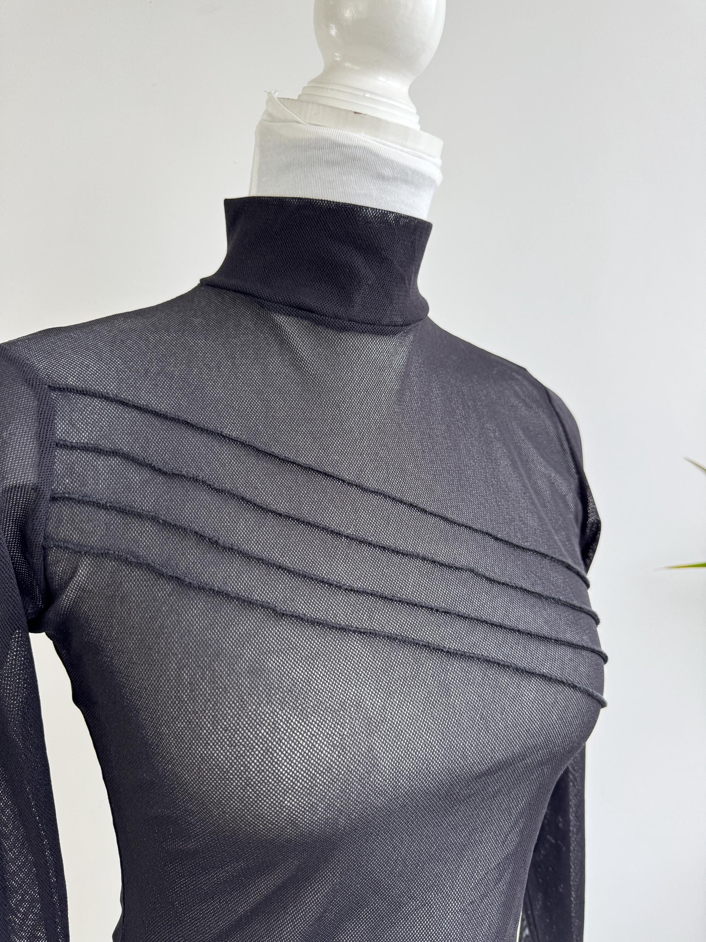 Elevate your wardrobe with our stunning Black Sheer Tulle Top in size S/M! This see-through, stretchy polyester crop top features long sleeves and a chic high turtle neck, perfect for layering or making a bold statement. Tailored in Italy, it's design offers a flattering fit that blends elegance with comfort. Whether paired with high-waisted jeans or a stylish skirt, this overlay top is a must-have for any fashion-forward individual. Embrace sophistication and versatility with this exquisite piece!