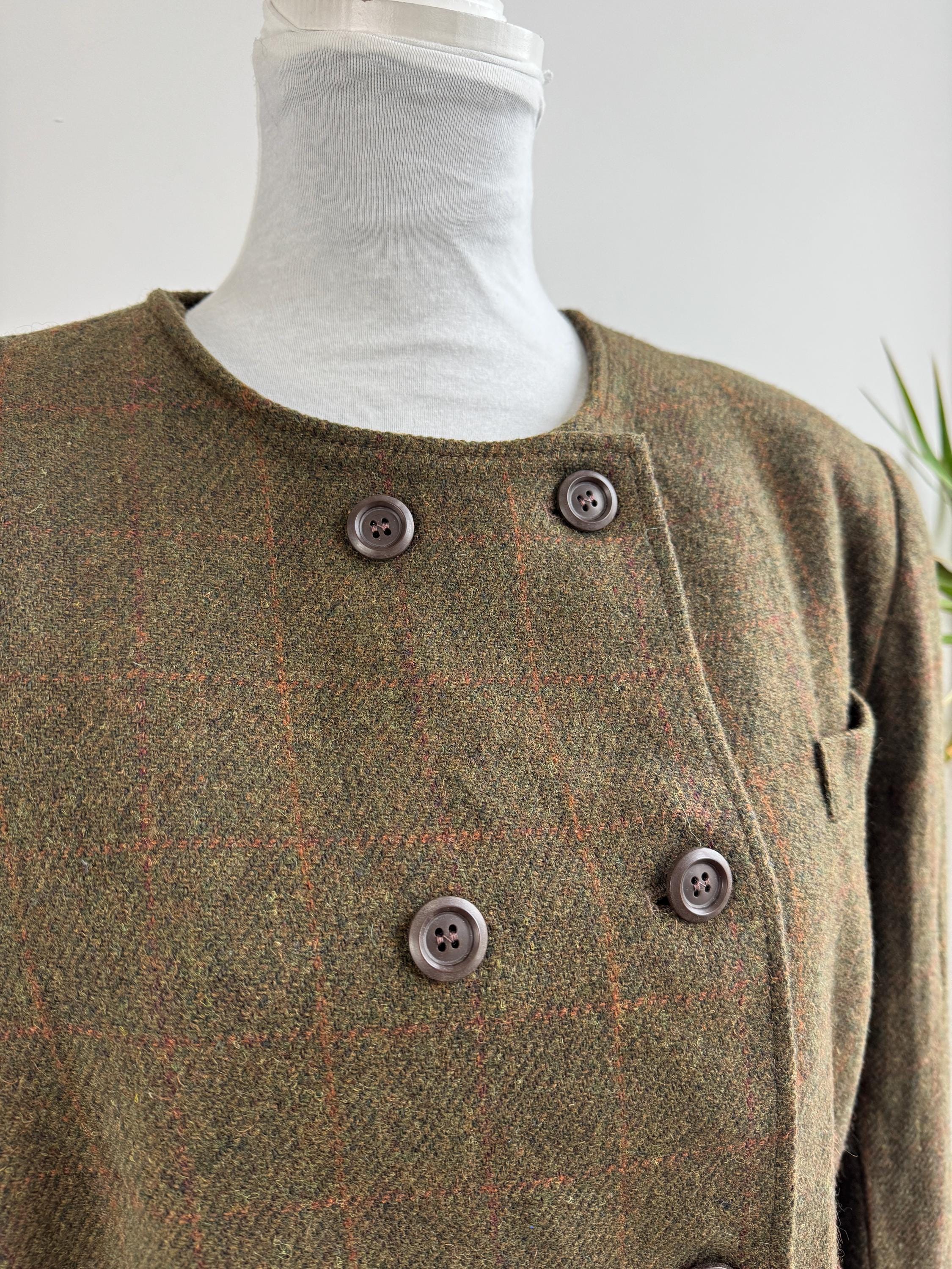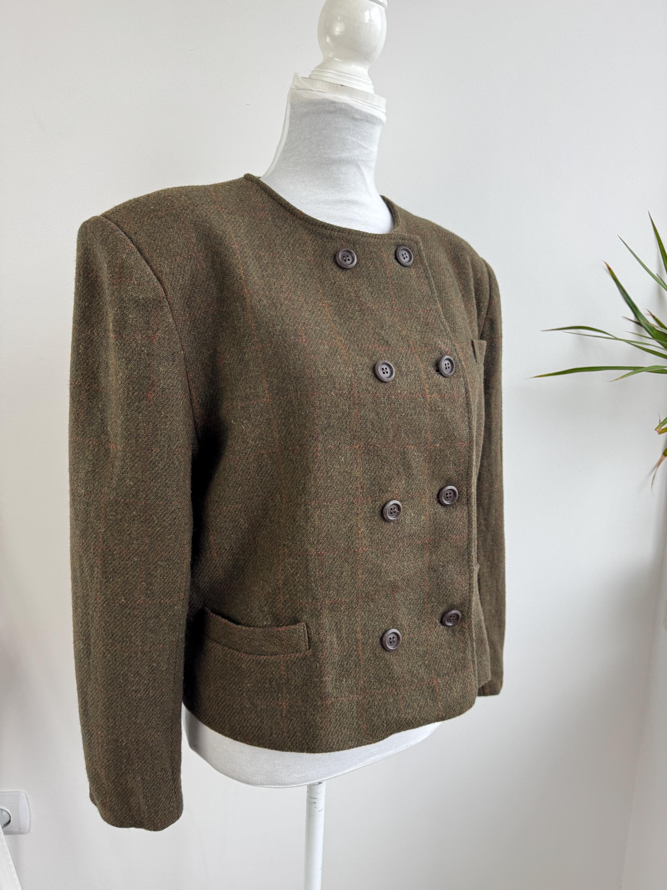The unique design details—the double-breasted closure with eight round buttons and the elegant collarless, crew neck style—give it a sophisticated, retro look. It has a chic, cropped length that pairs wonderfully with high-waisted trousers, pencil skirts, or even layered over a flowy dress for a modern Cottagecore or Dark Academia aesthetic. This wool jacket is fully lined and includes small shoulder pads (consistent with 80s/90s styling) and two front pockets.