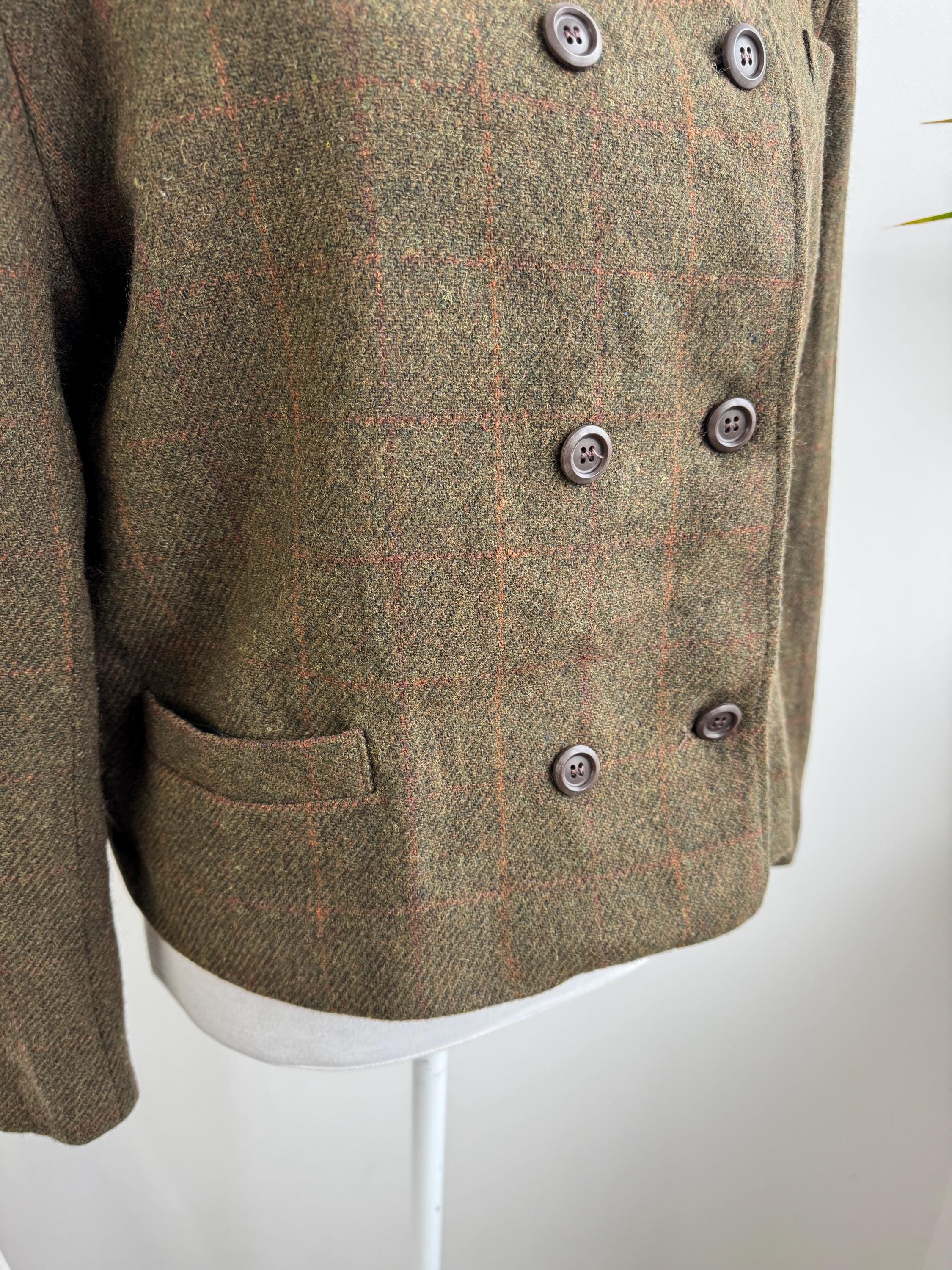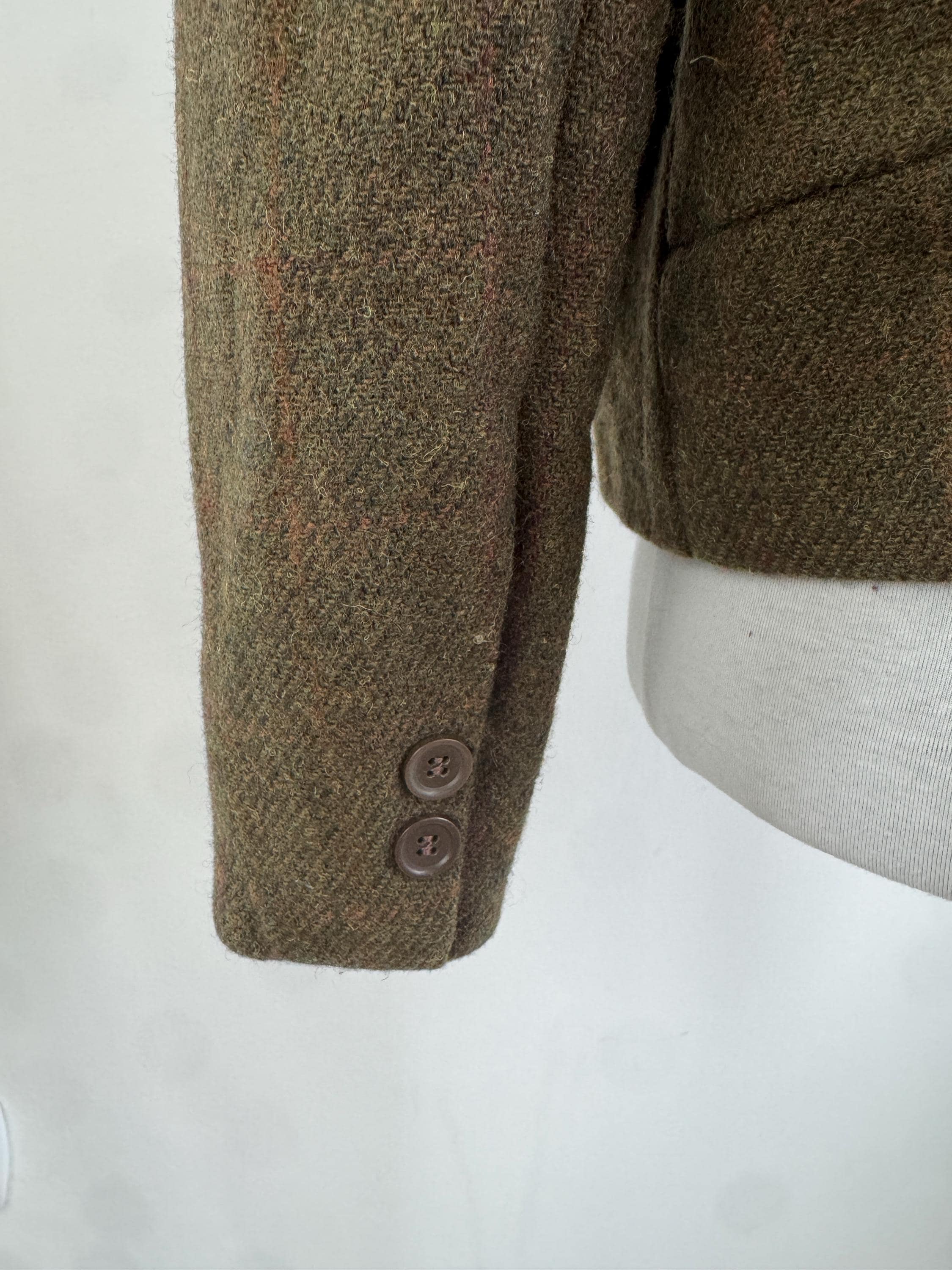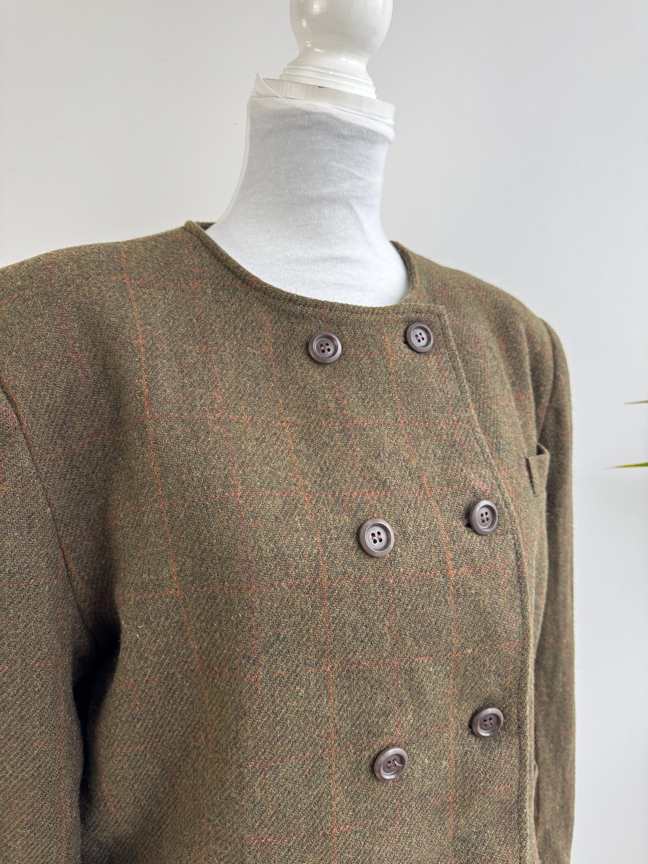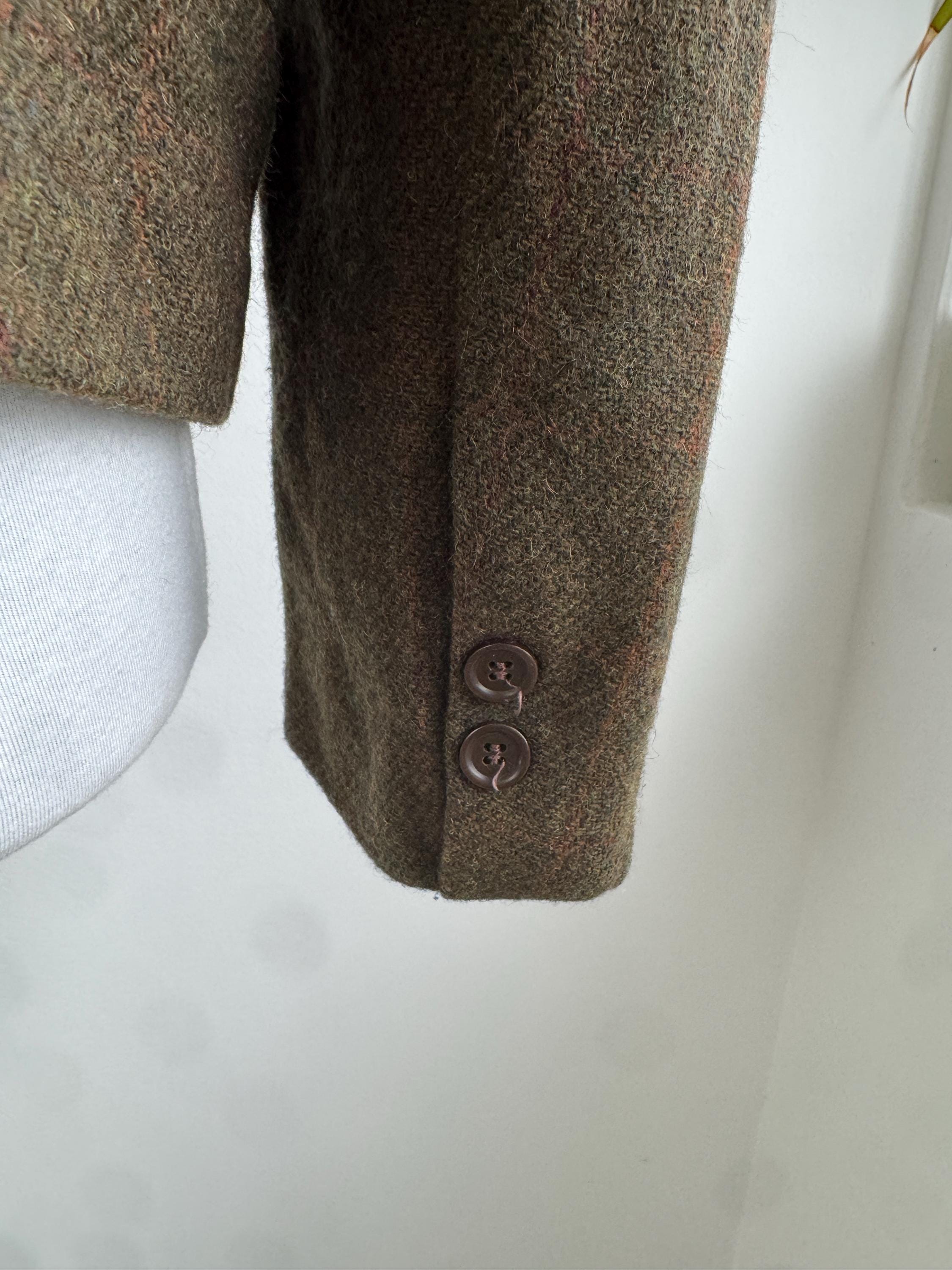 This gorgeous vintage tweed jacket is the perfect autumn and winter layering piece. It features a rich, earthy blend of olive, brown, and subtle reddish tones. The wool fabric is thick, warm, and structured, typical of high-quality vintage tailoring.