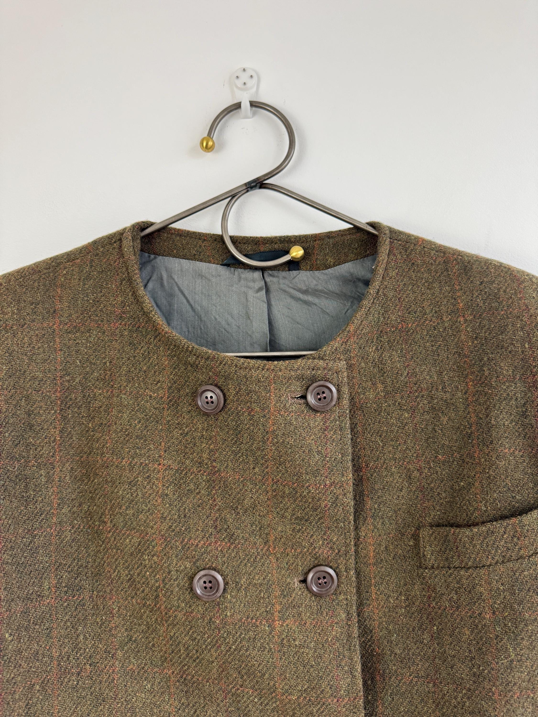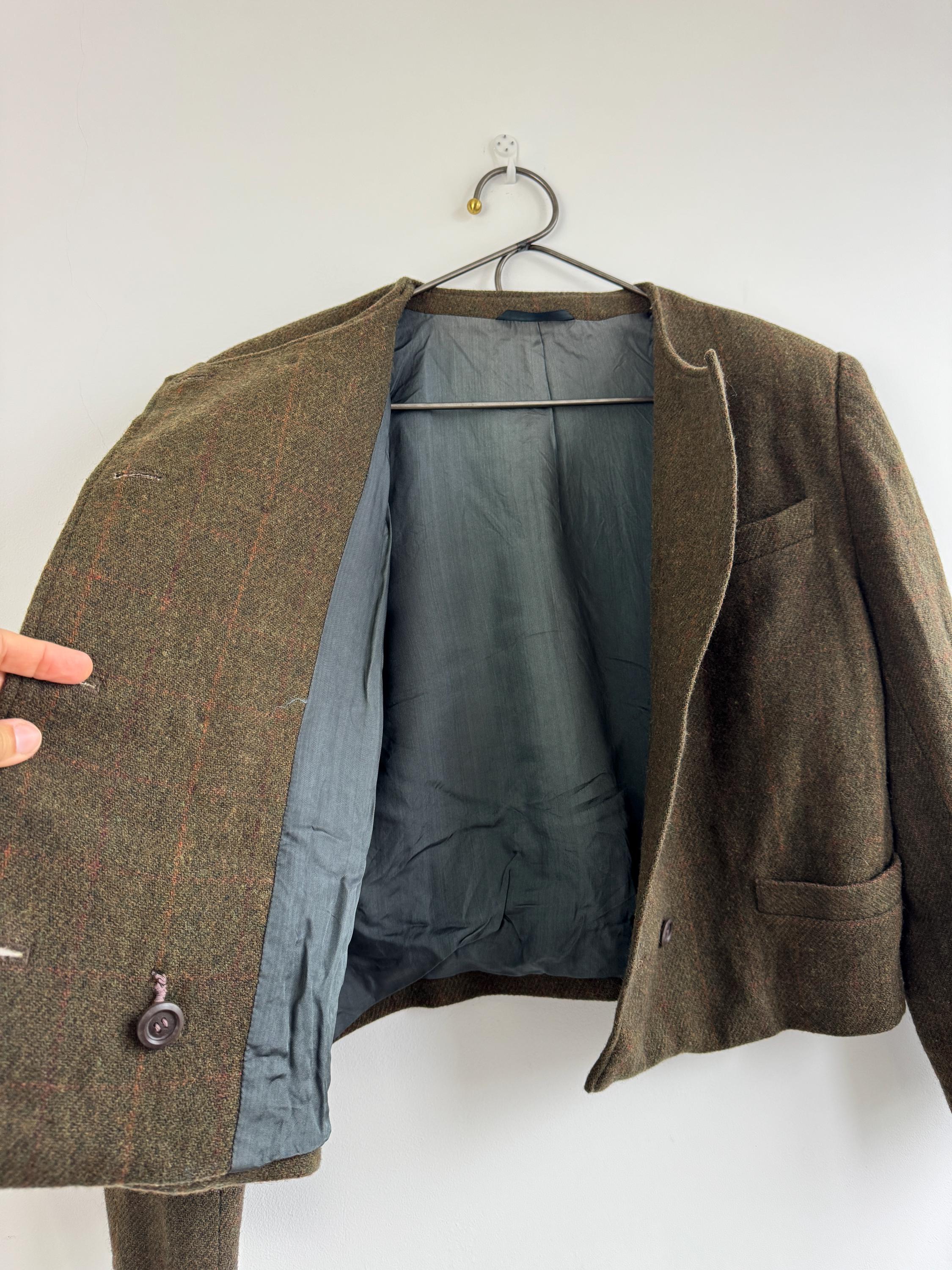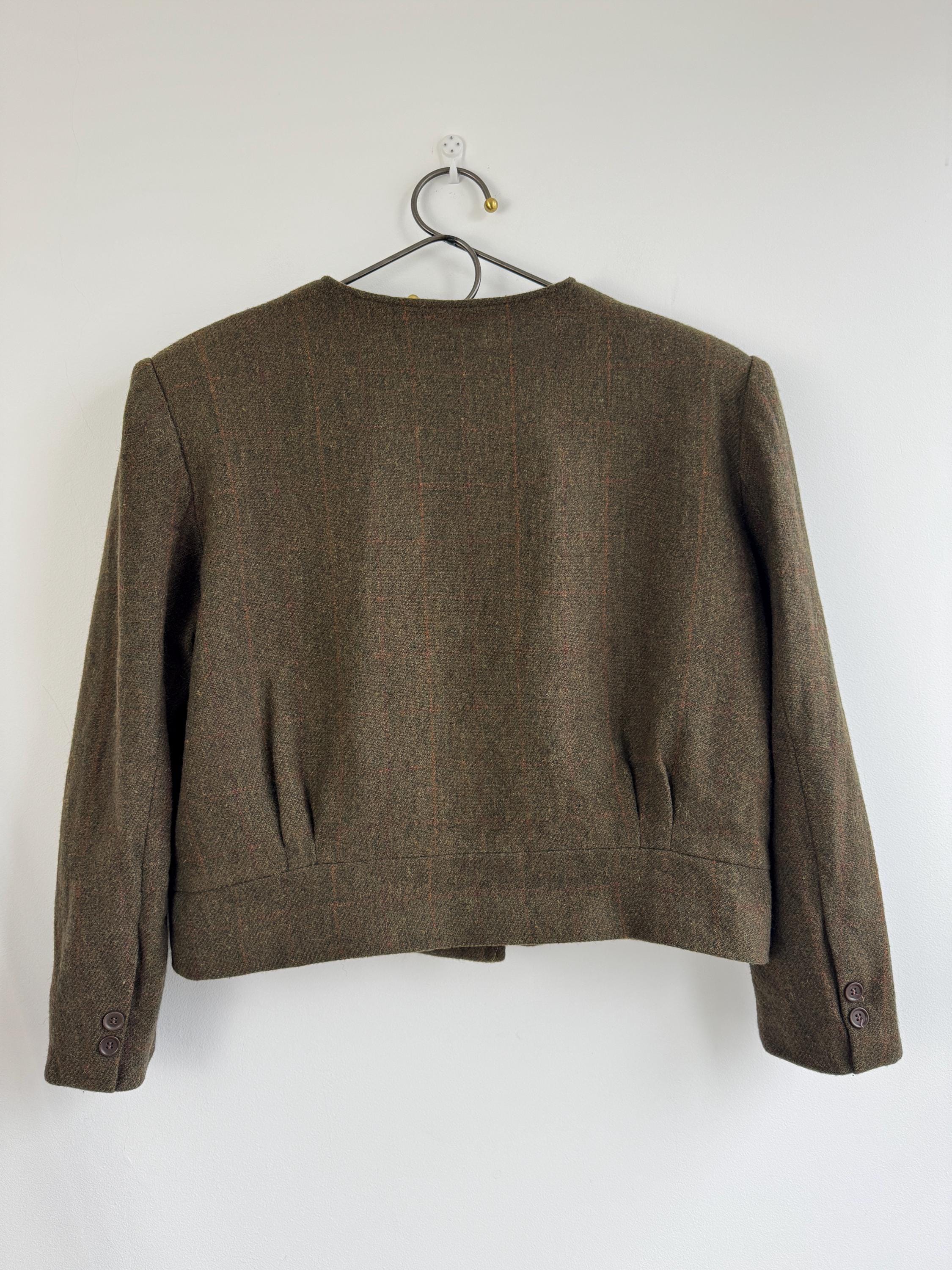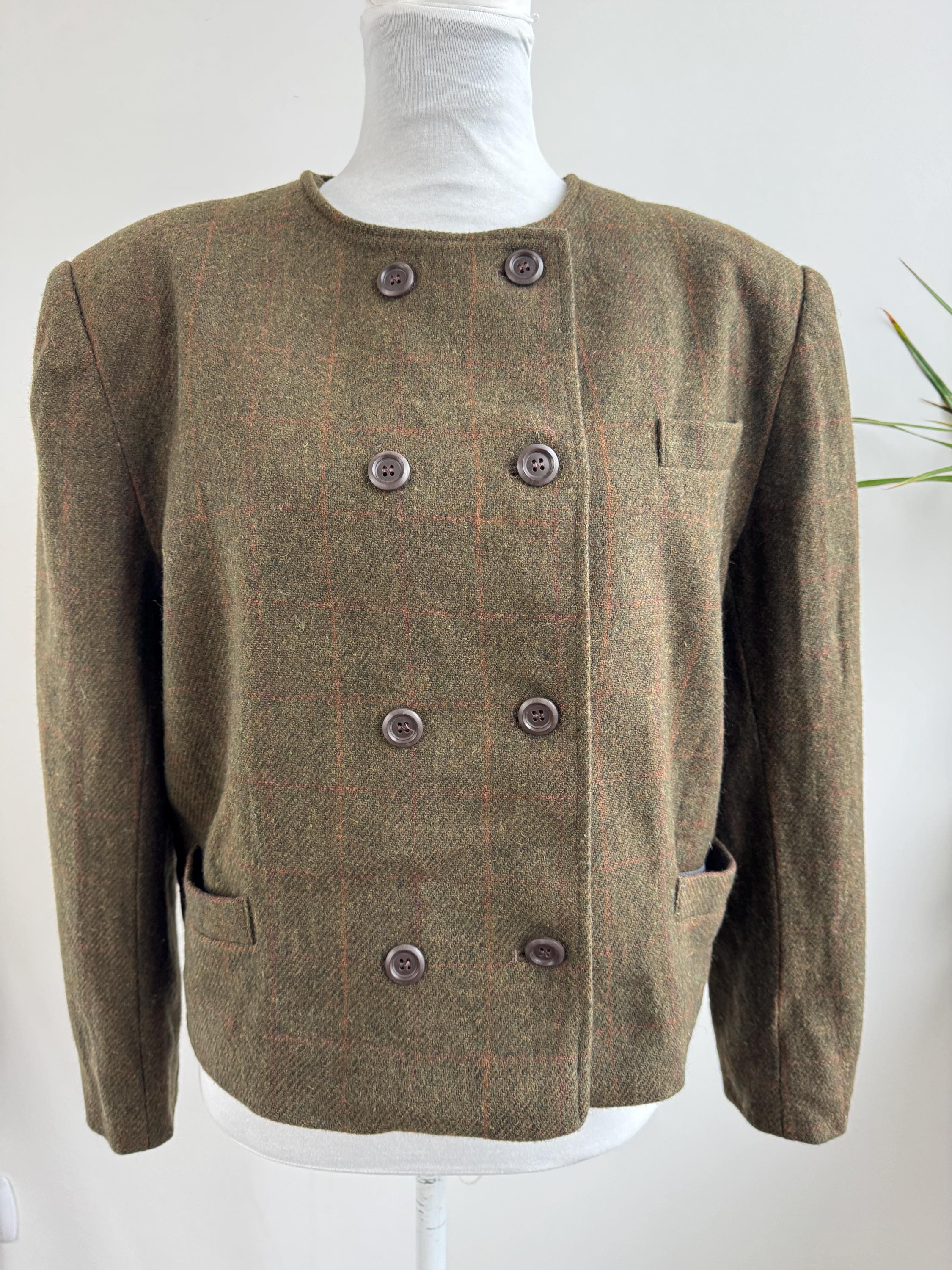 This gorgeous vintage tweed jacket is the perfect autumn and winter layering piece. It features a rich, earthy blend of olive, brown, and subtle reddish tones. The wool fabric is thick, warm, and structured, typical of high-quality vintage tailoring.