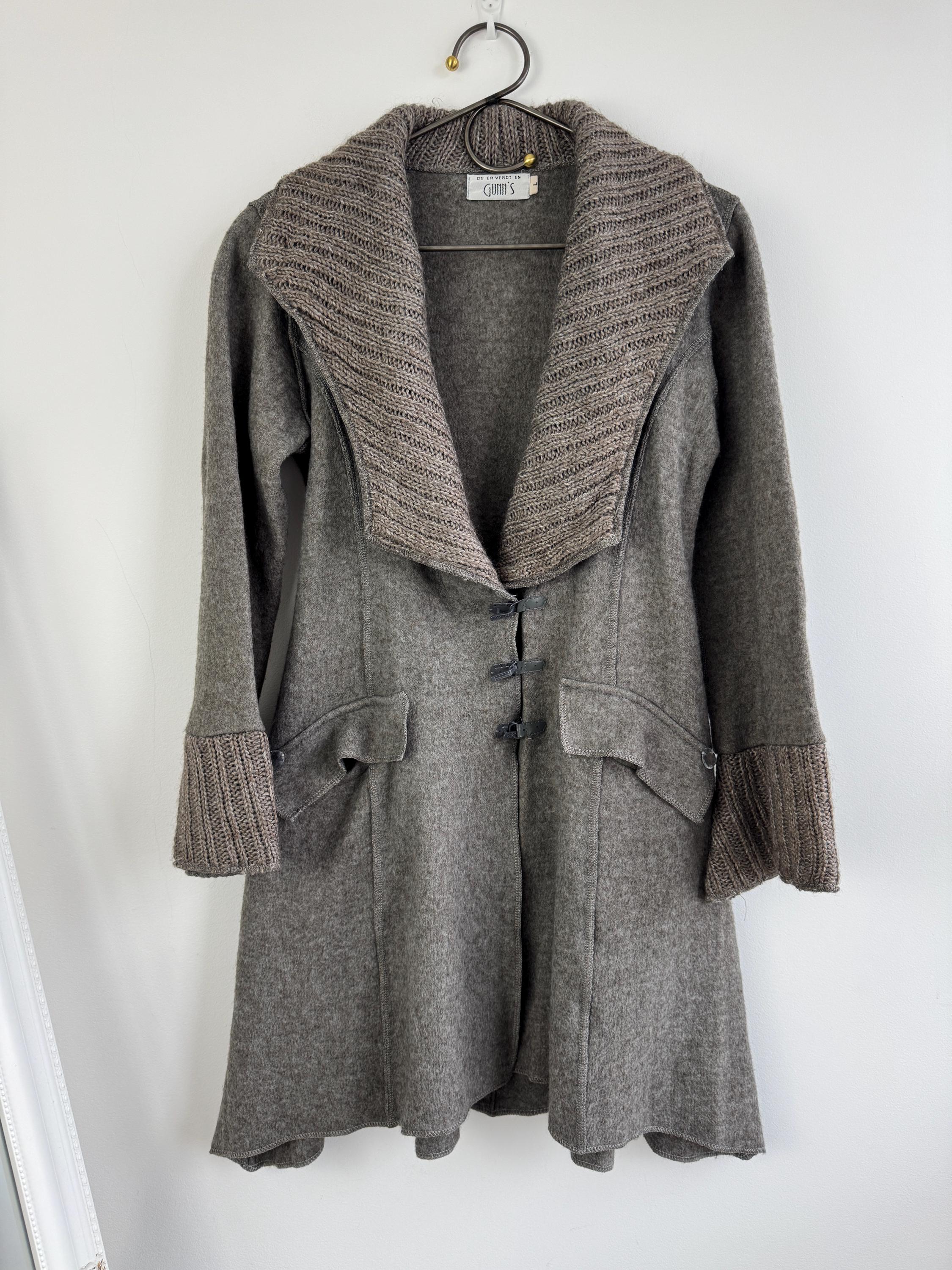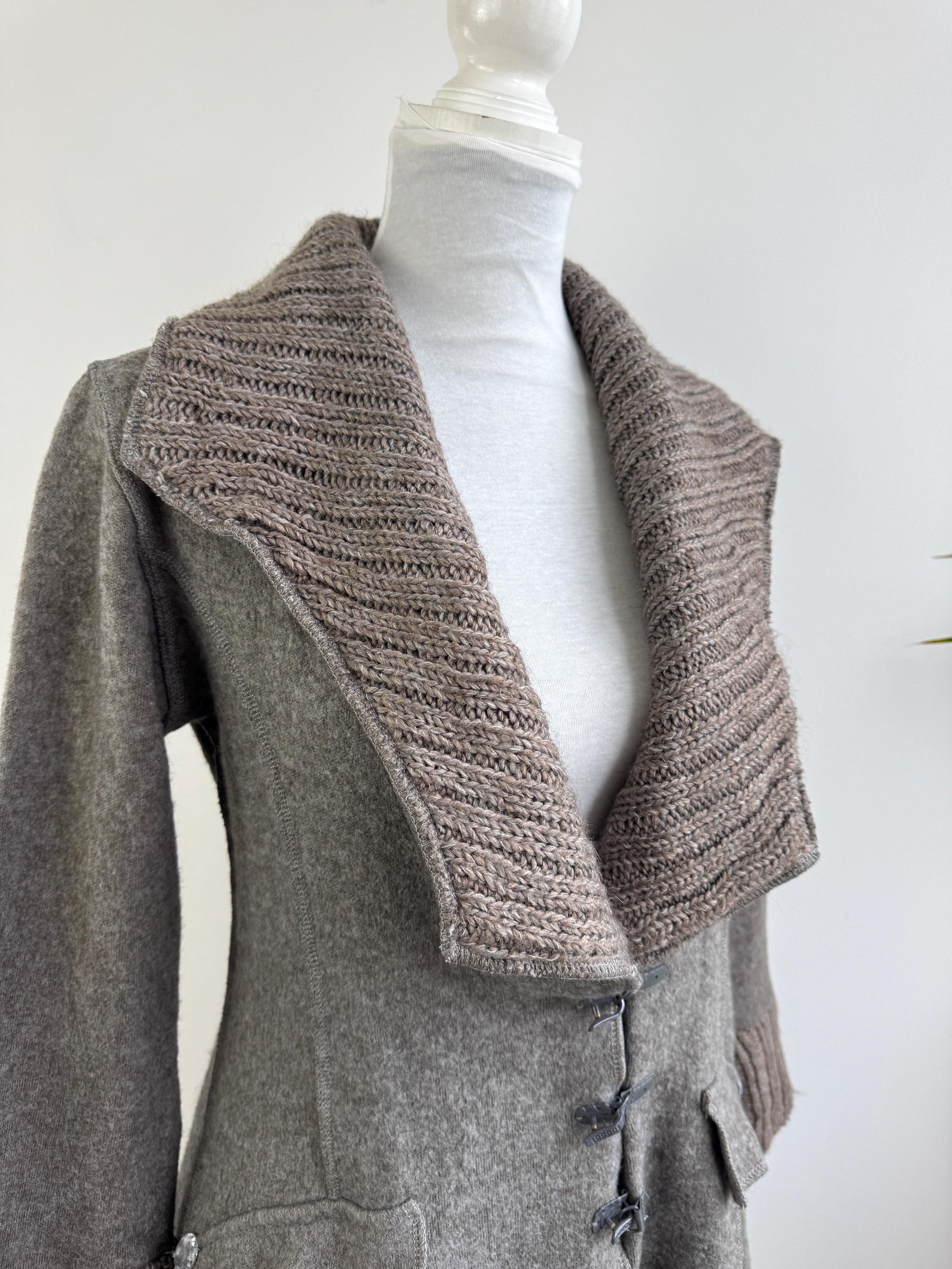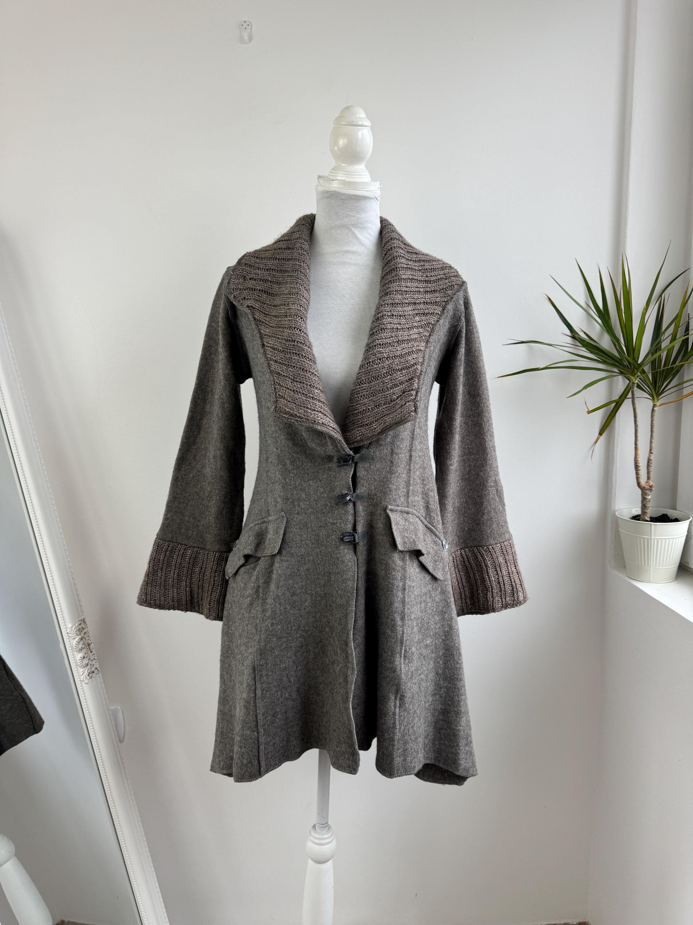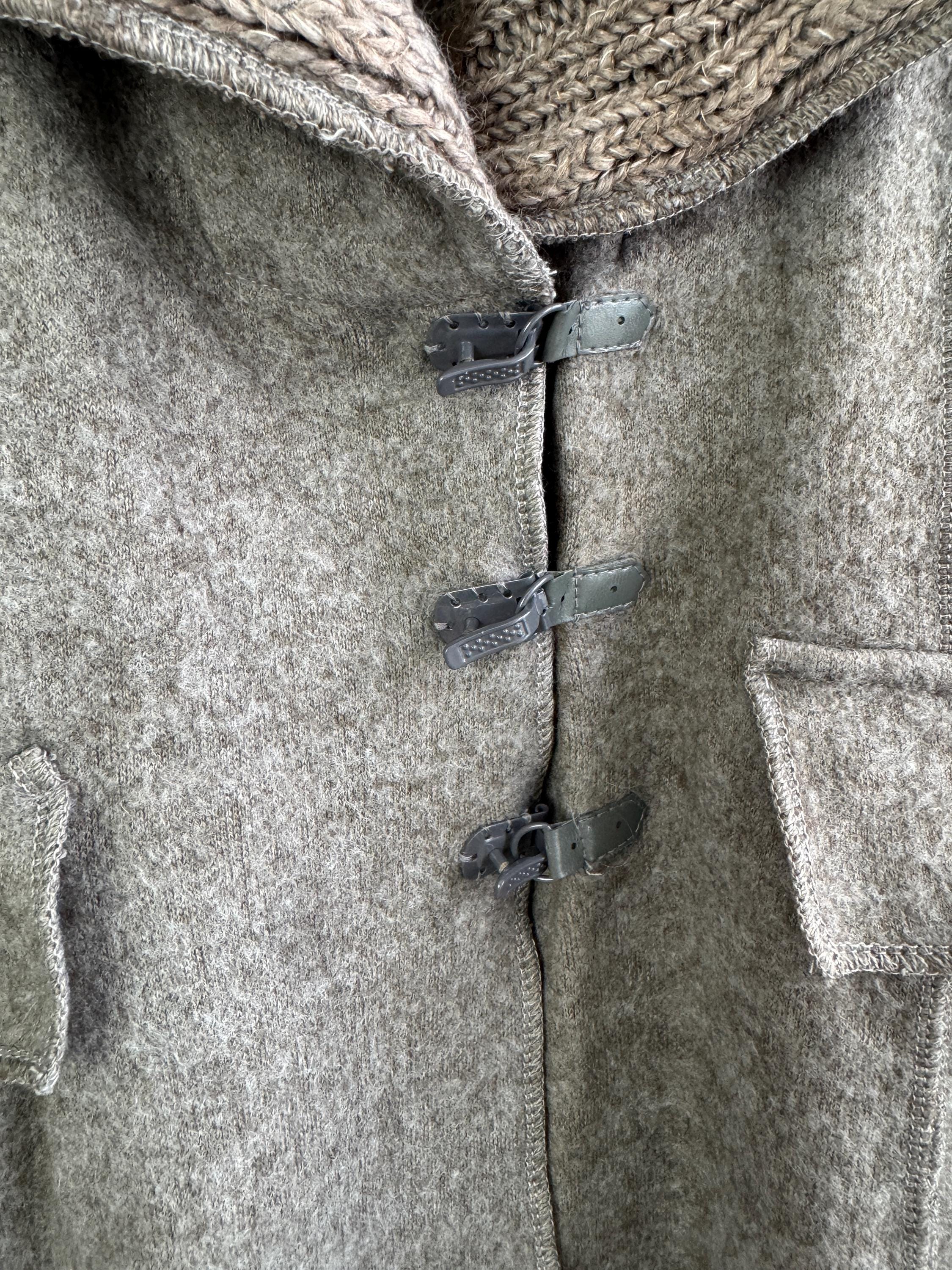 Step into a world of cozy, bohemian charm with this striking vintage grey wool coat by GUMM'S in size M/L. This is not just a wool midi coat; it's a statement piece, blending a structured felted wool body with luxurious, rustic knitted elements. The oversized, textured knitted shawl collar and wide, bell-shaped cuffs are the defining features, providing dramatic silhouette and warmth.