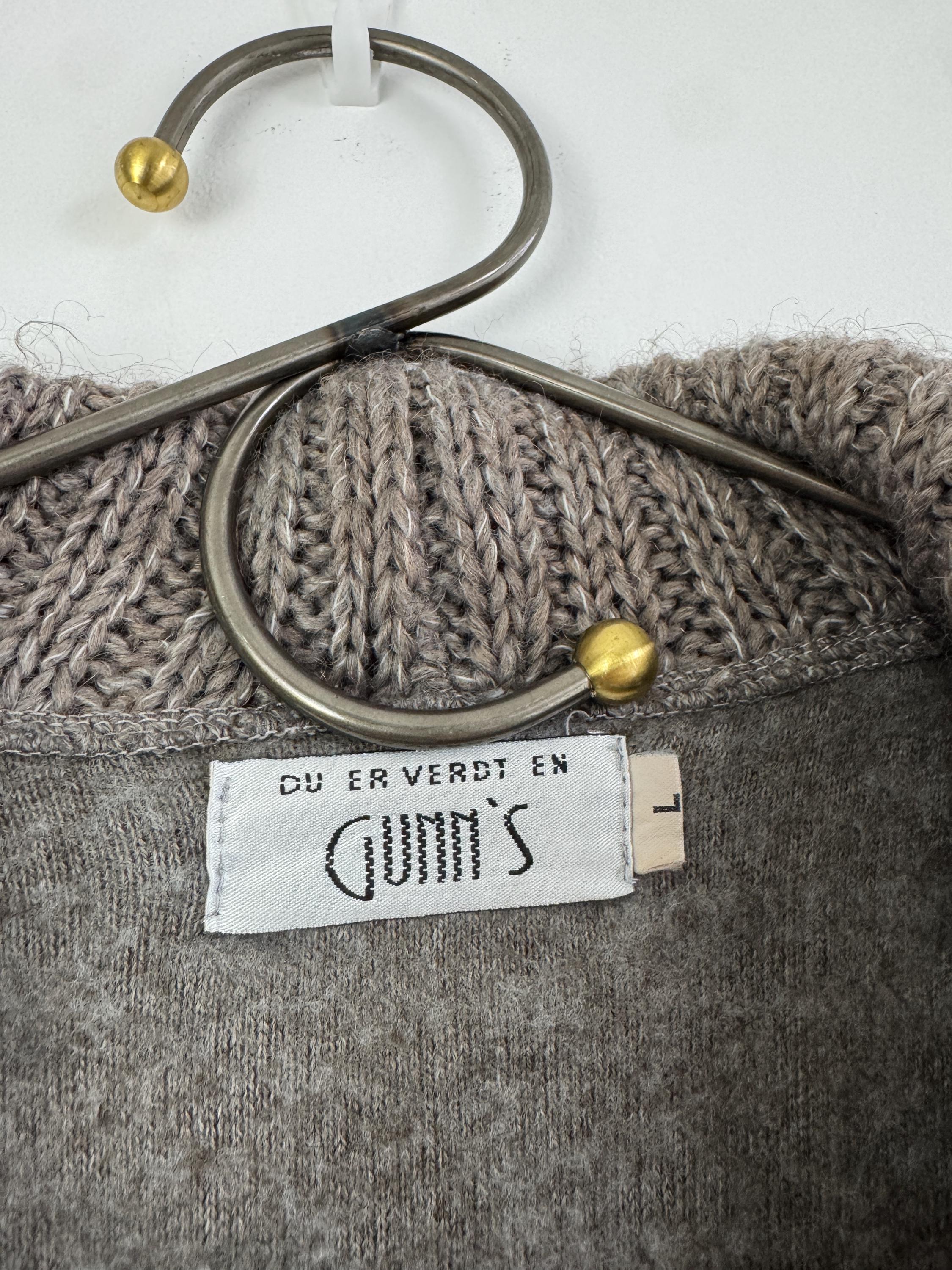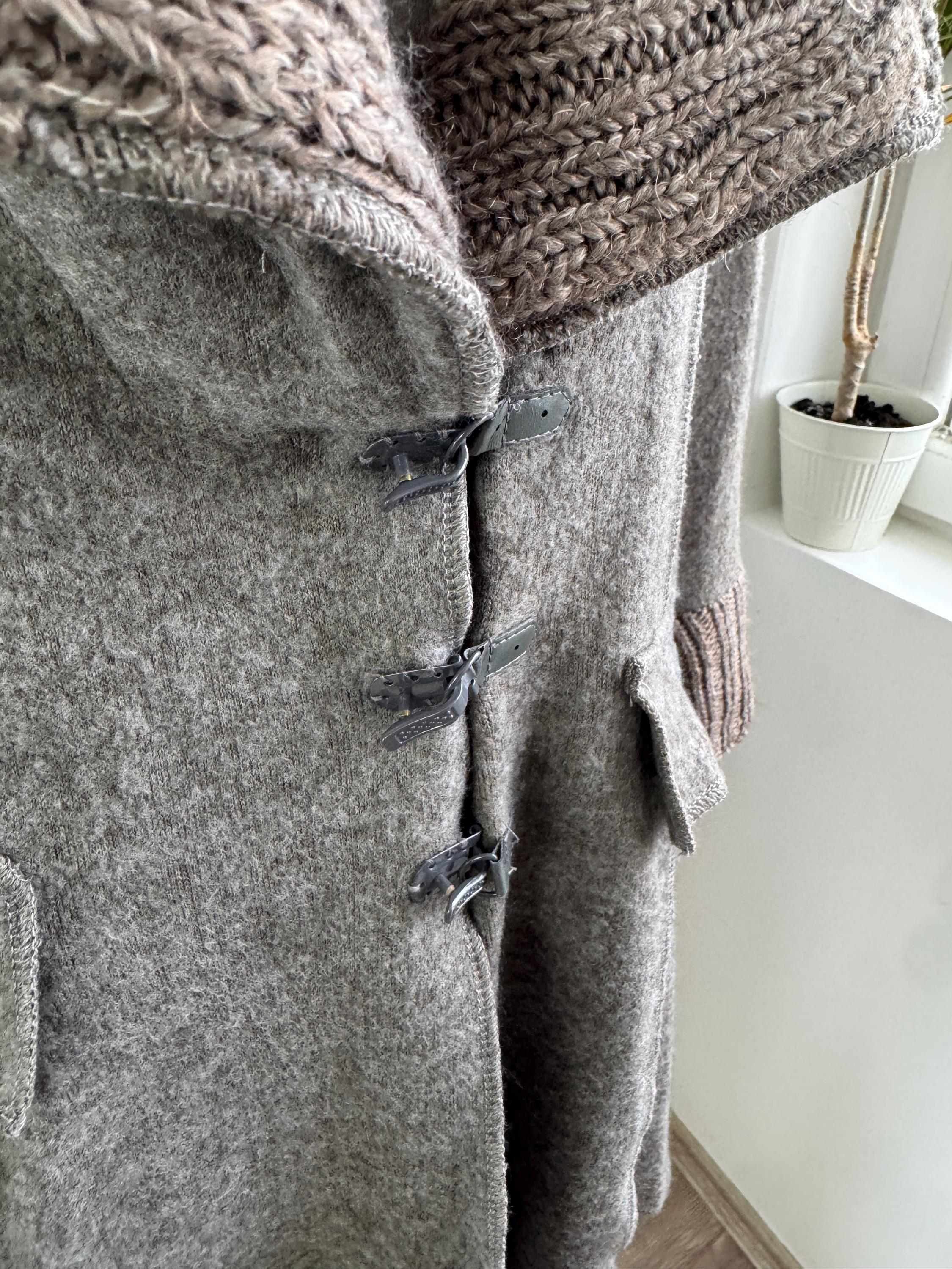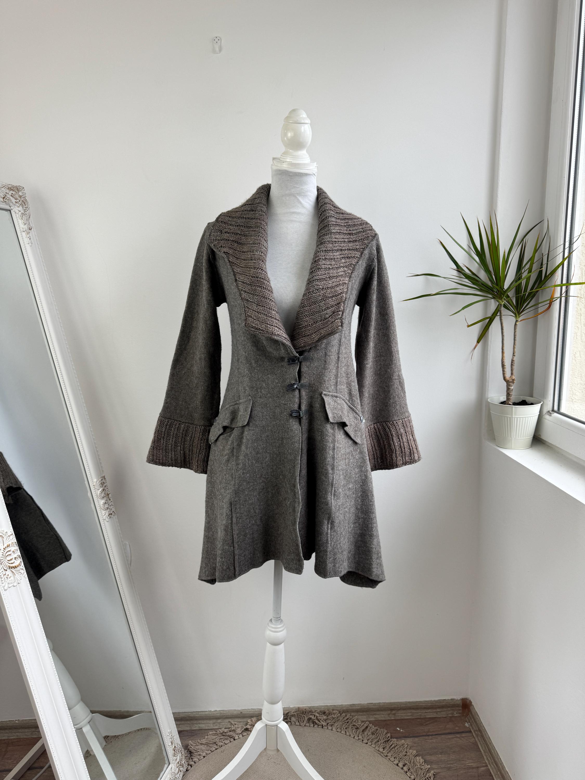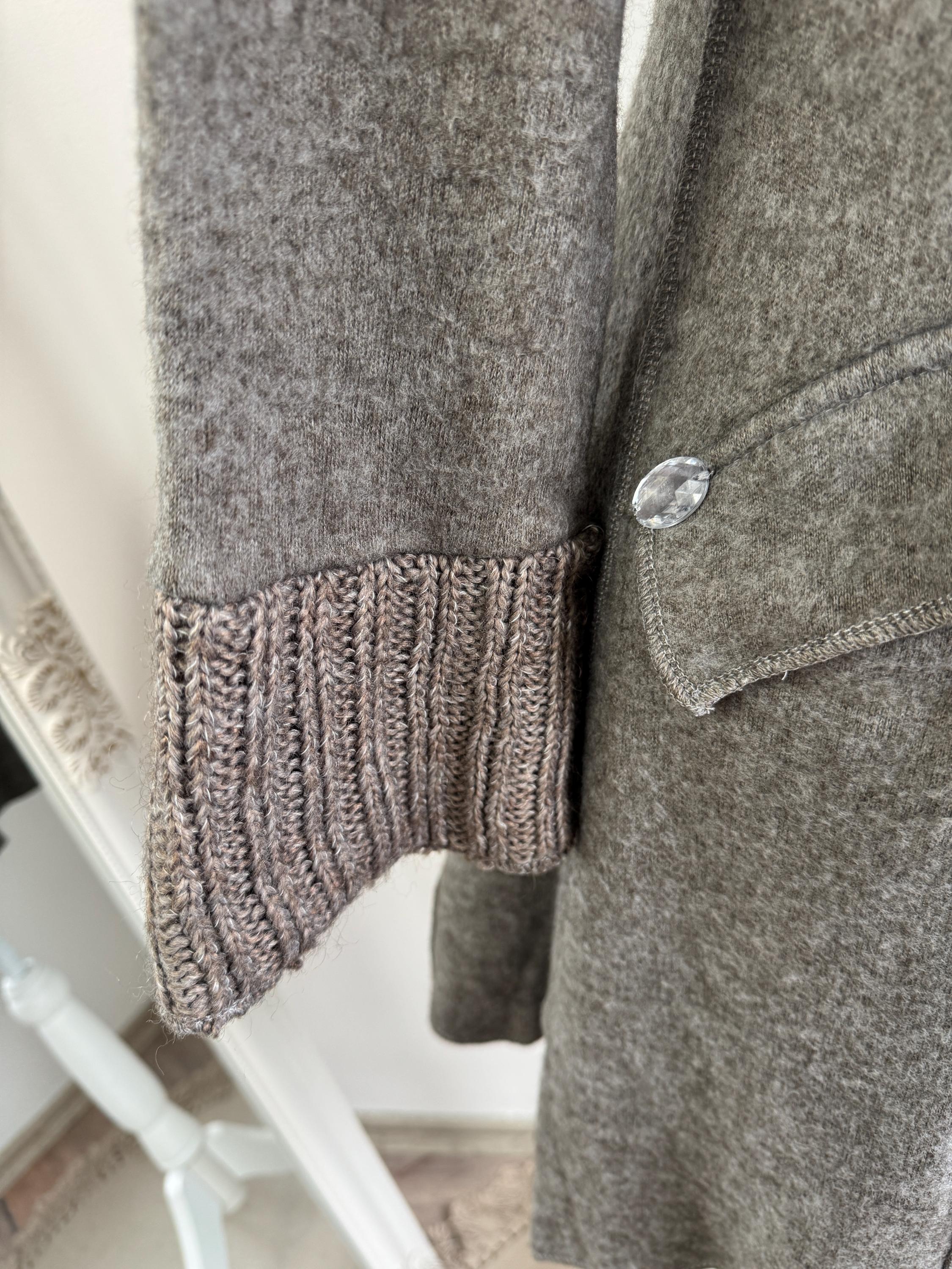 Step into a world of cozy, bohemian charm with this striking vintage grey wool coat by GUMM'S in size M/L. This is not just a wool midi coat; it's a statement piece, blending a structured felted wool body with luxurious, rustic knitted elements. The oversized, textured knitted shawl collar and wide, bell-shaped cuffs are the defining features, providing dramatic silhouette and warmth.