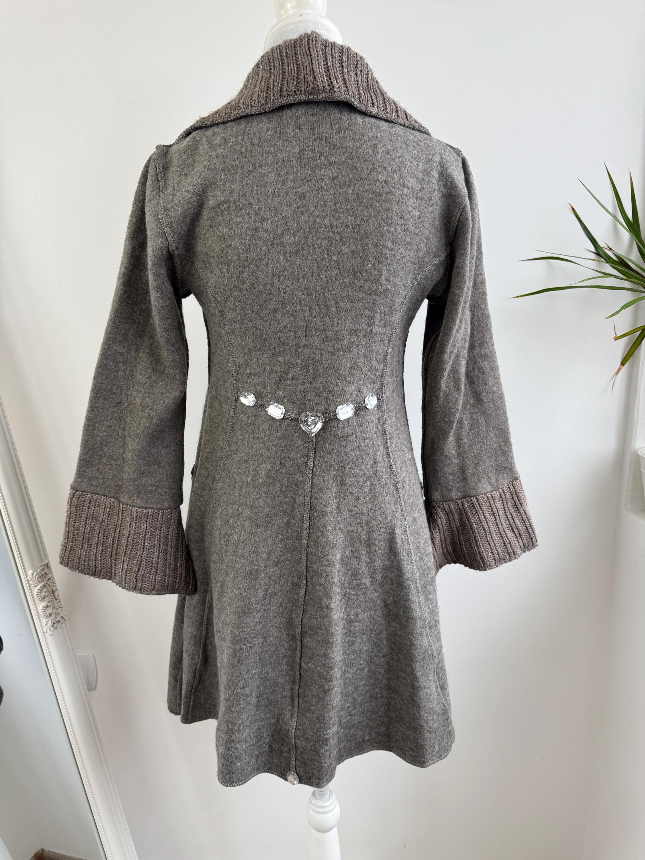 The coat has a soft, neutral taupe/brown color that is highly versatile. It features unique toggle closures down the front and a flattering A-line silhouette that drapes beautifully and flares. The back is subtly embellished with a curved line of crystal rhinestone hearts or jewels, adding a playful, fairy-tale quality that makes this piece truly stand out.