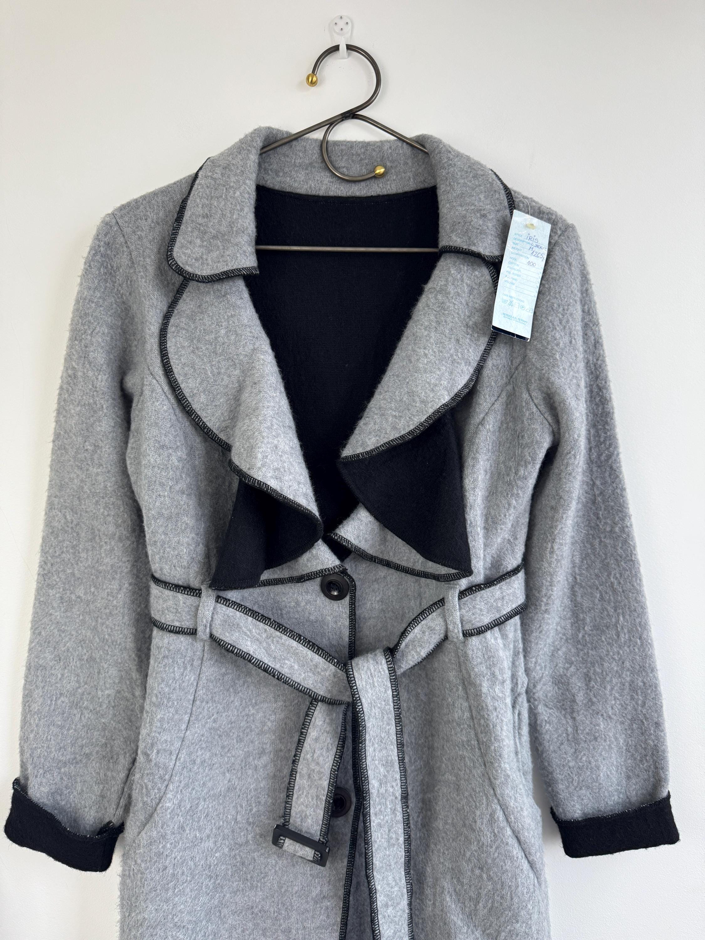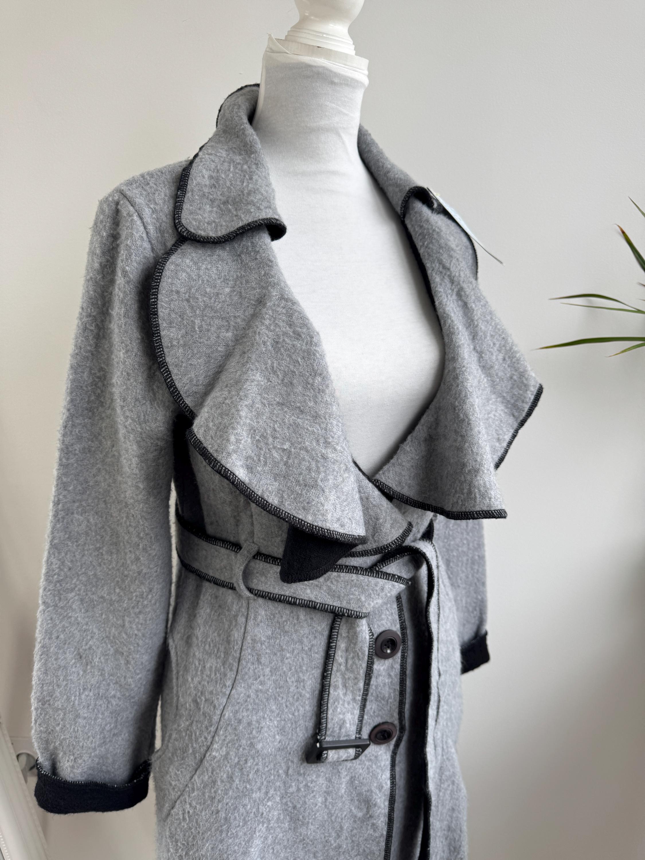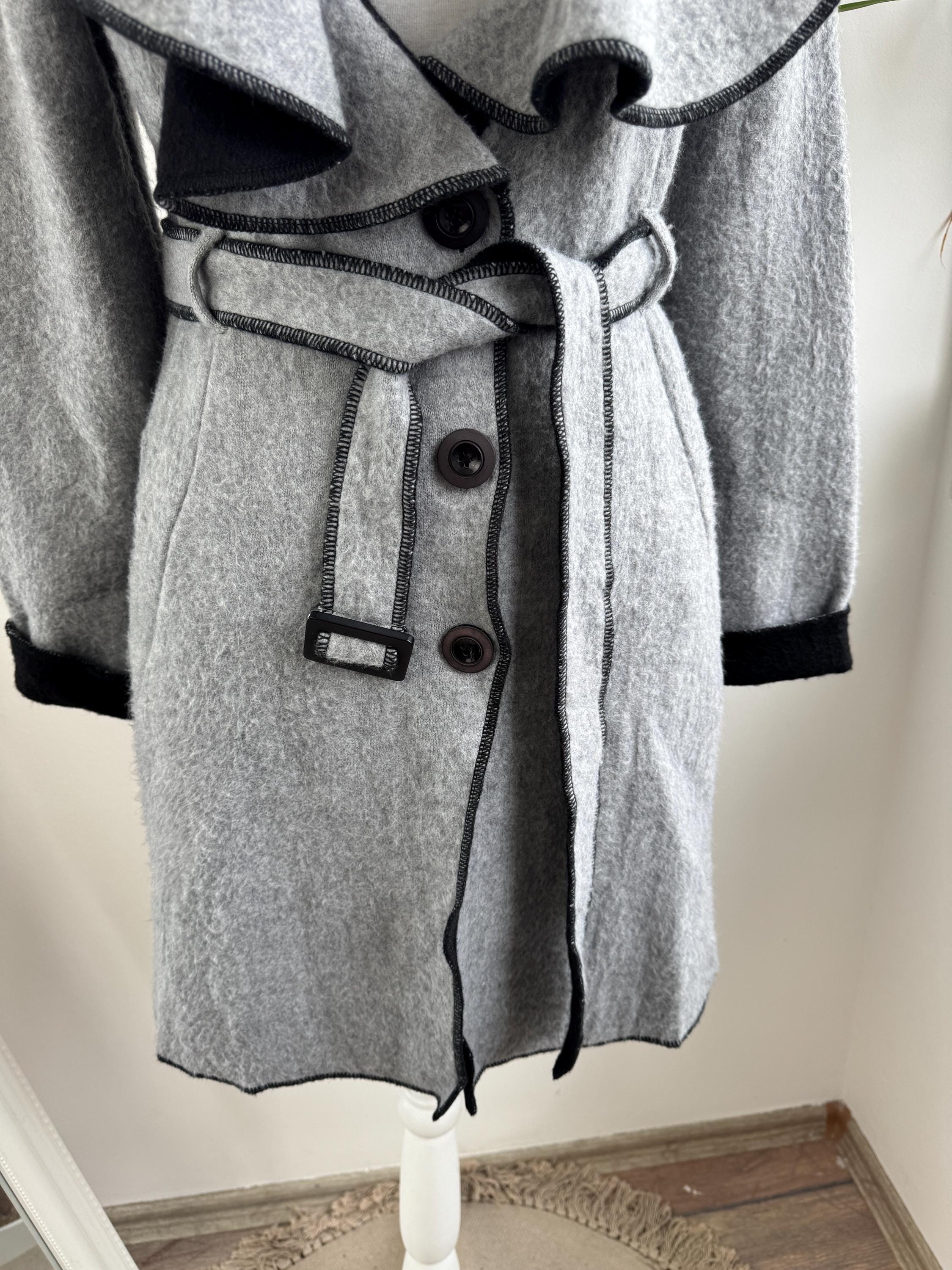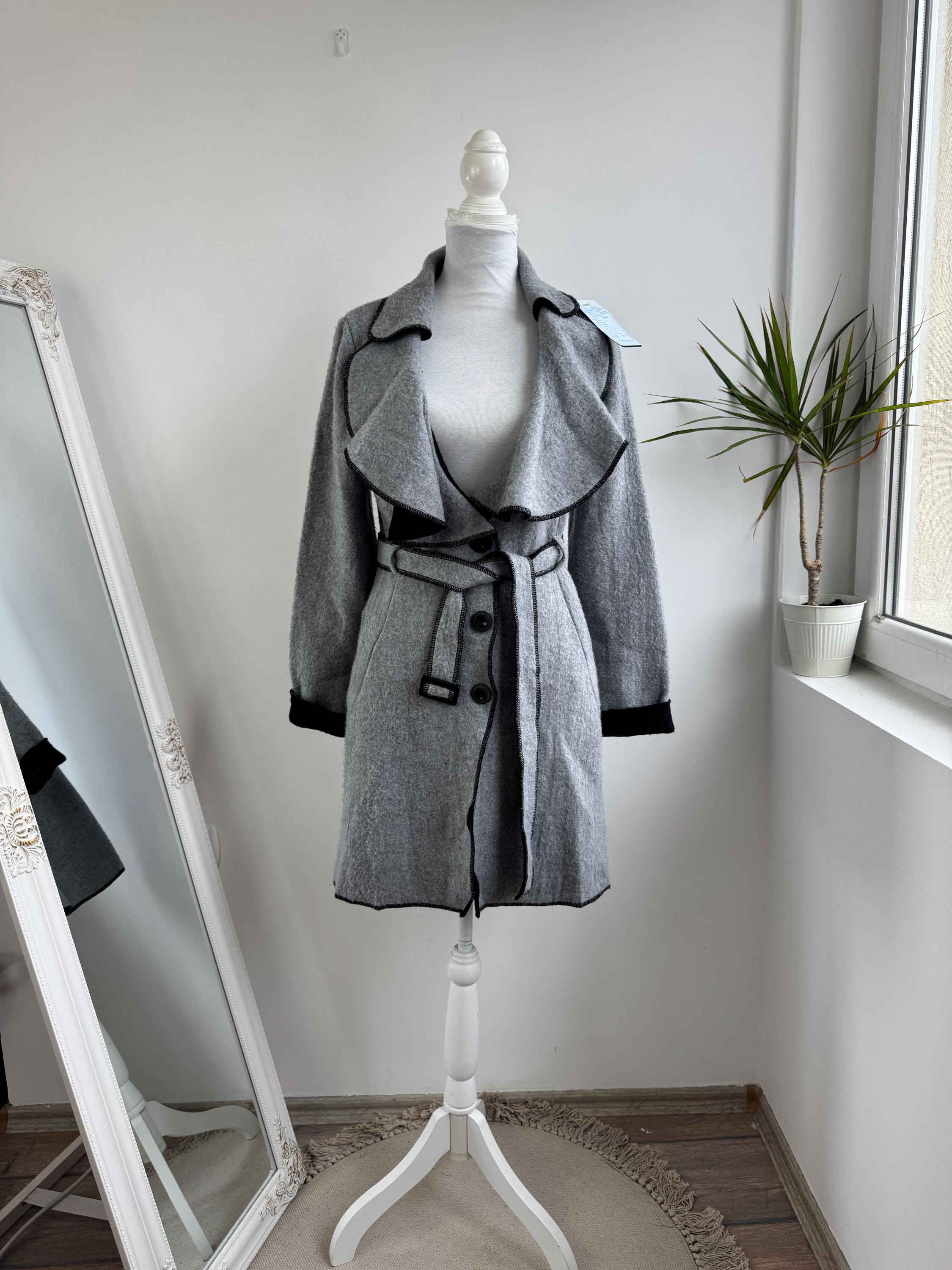 Crafted from 100% pure wool, the fabric has a beautiful, substantial drape ideal for layering over knitwear or a dress. There is no linning underneath. It has extra long belt and side pockets. The light grey body provides a versatile neutral base, dramatically contrasted by a shawl collar and elegant black trim. The statement ruffled collar and single-button closure create that iconic, flattering silhouette—chic, professional, and endlessly stylish. It’s an authentic piece of European vintage tailoring that brings a unique, high-quality touch to any modern outfit.