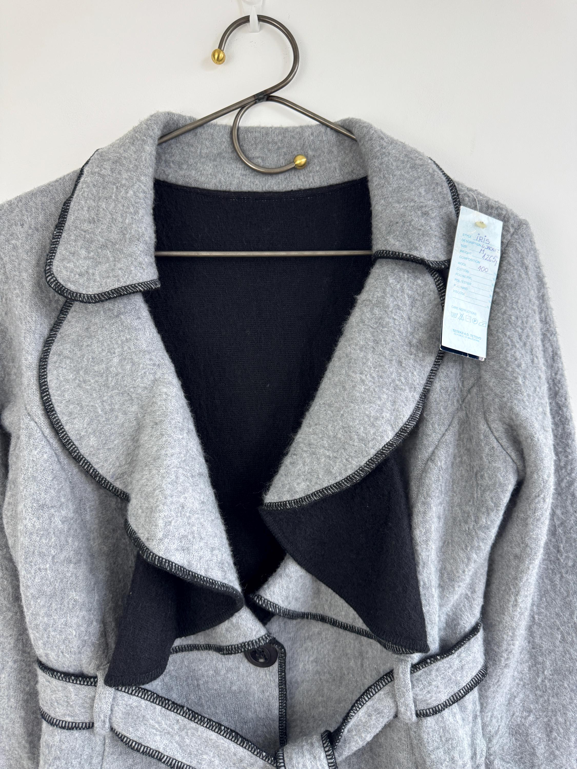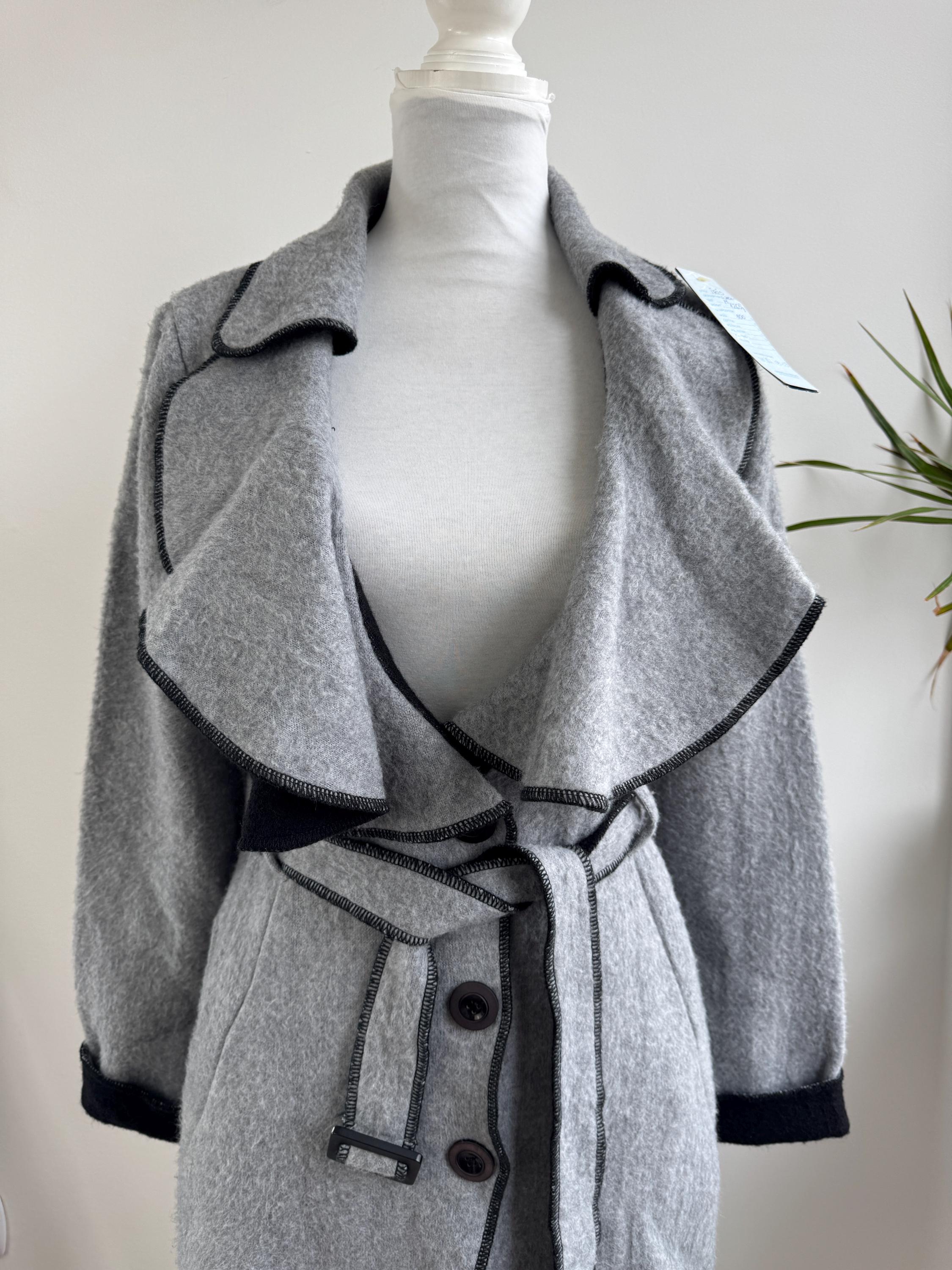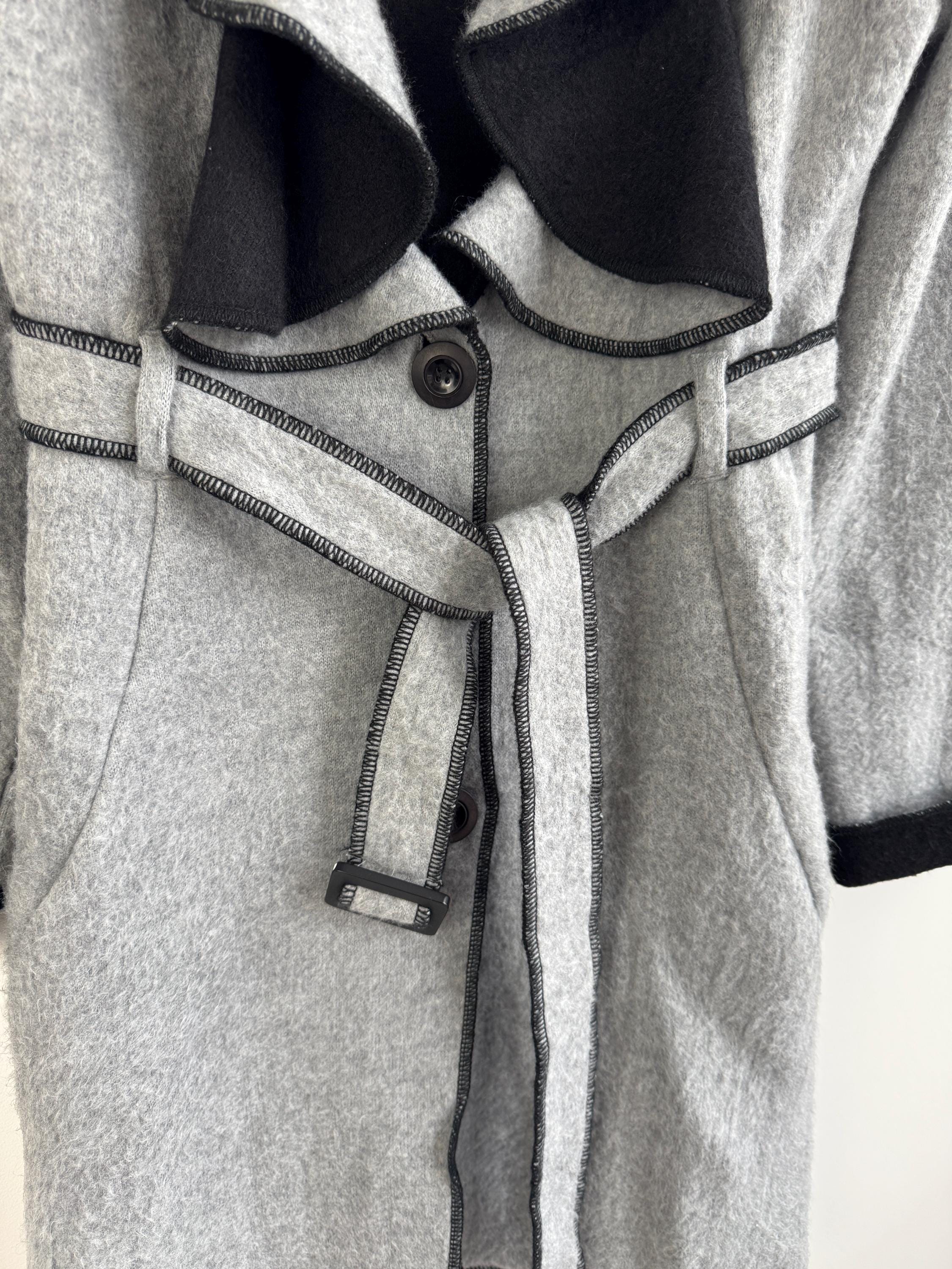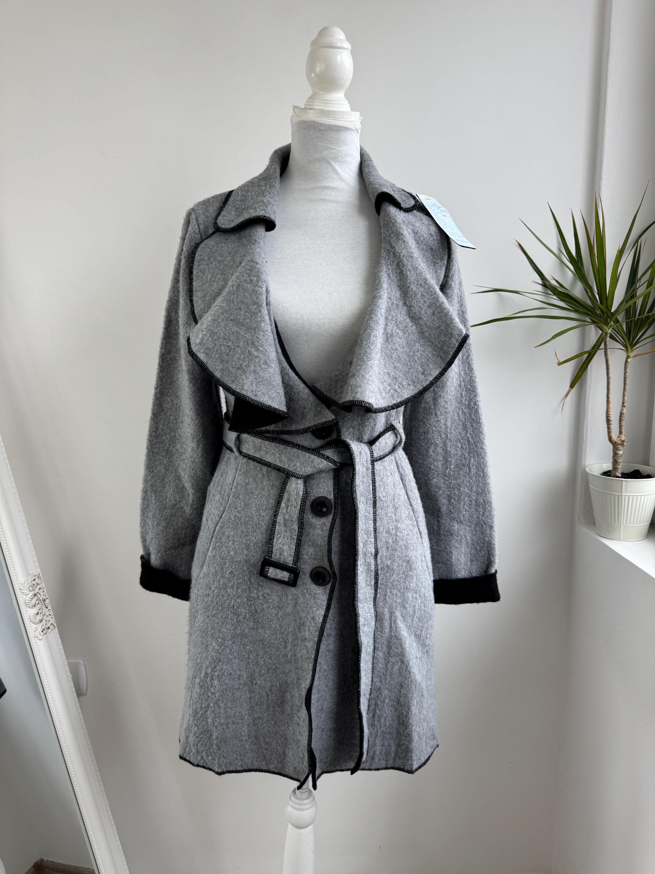 Crafted from 100% pure wool, the fabric has a beautiful, substantial drape ideal for layering over knitwear or a dress. There is no linning underneath. It has extra long belt and side pockets. The light grey body provides a versatile neutral base, dramatically contrasted by a shawl collar and elegant black trim. The statement ruffled collar and single-button closure create that iconic, flattering silhouette—chic, professional, and endlessly stylish. It’s an authentic piece of European vintage tailoring that brings a unique, high-quality touch to any modern outfit.