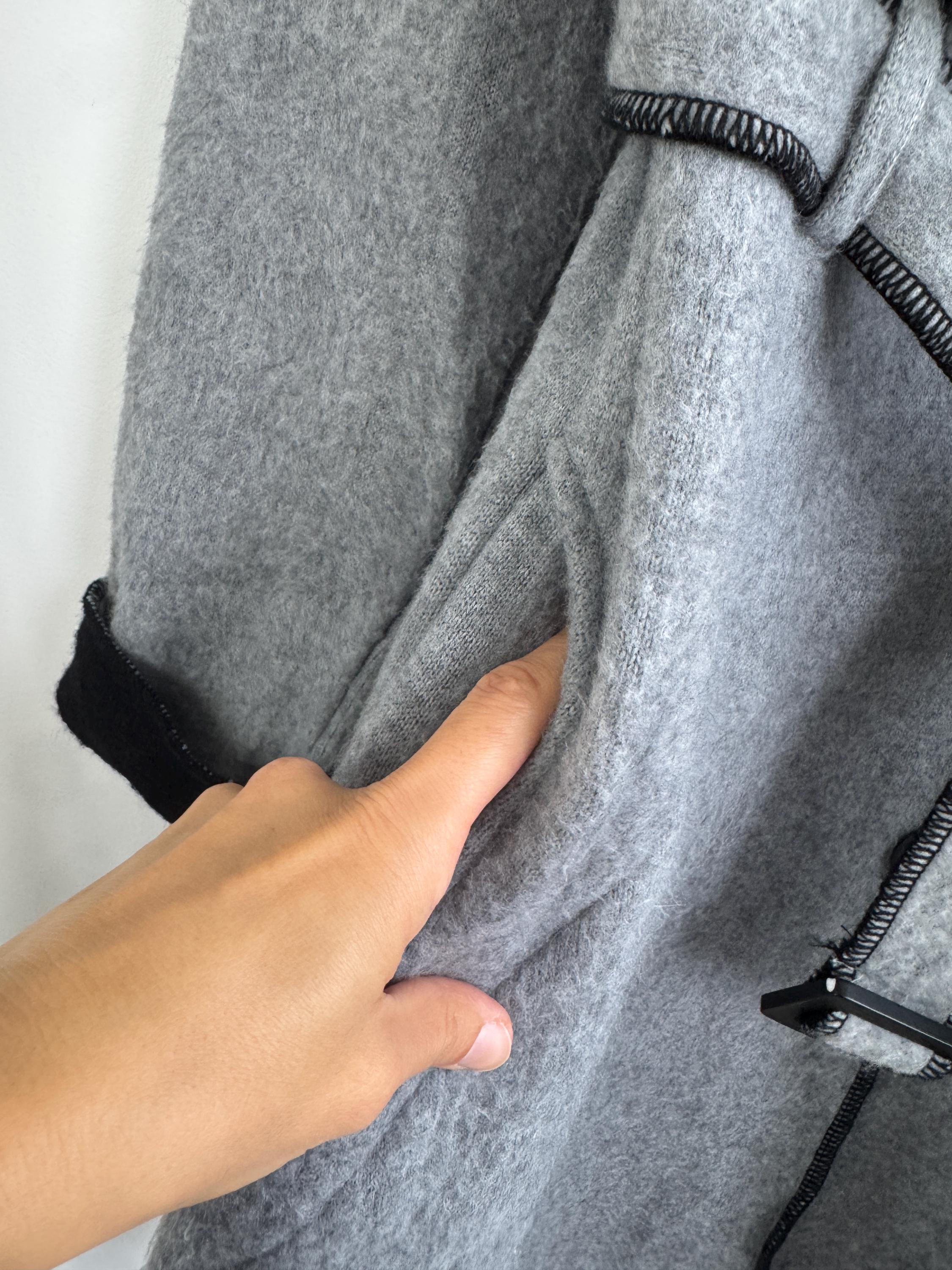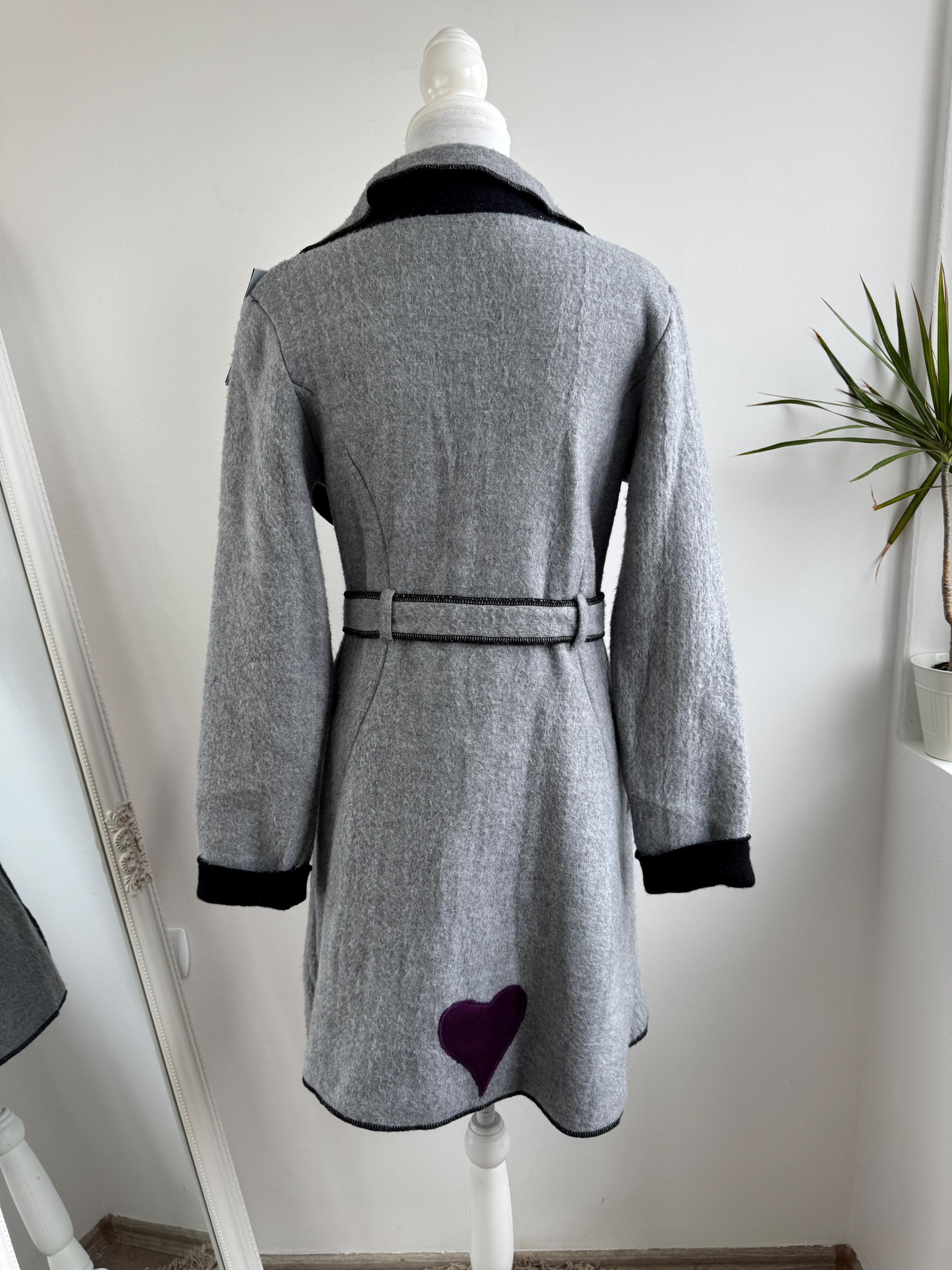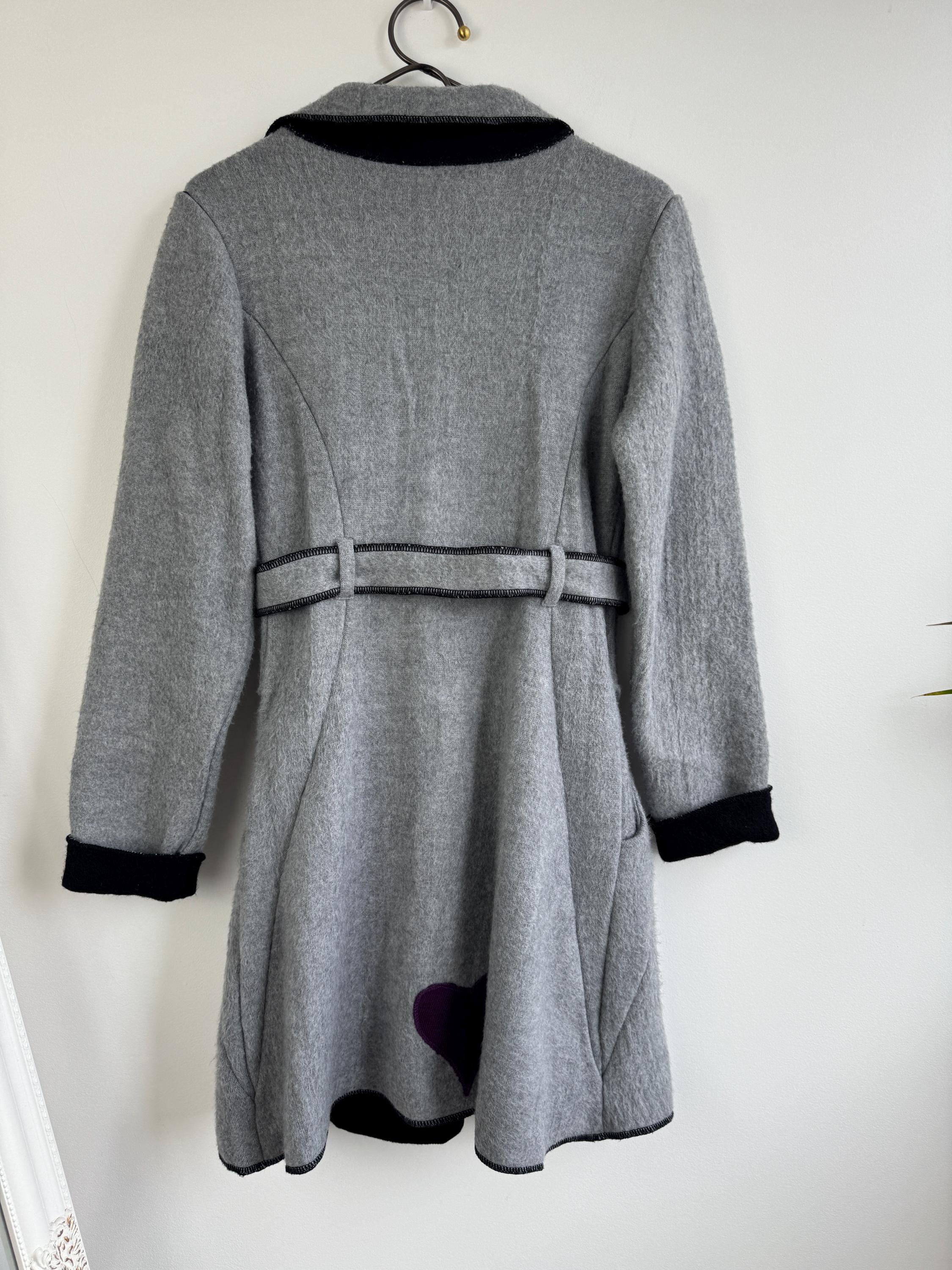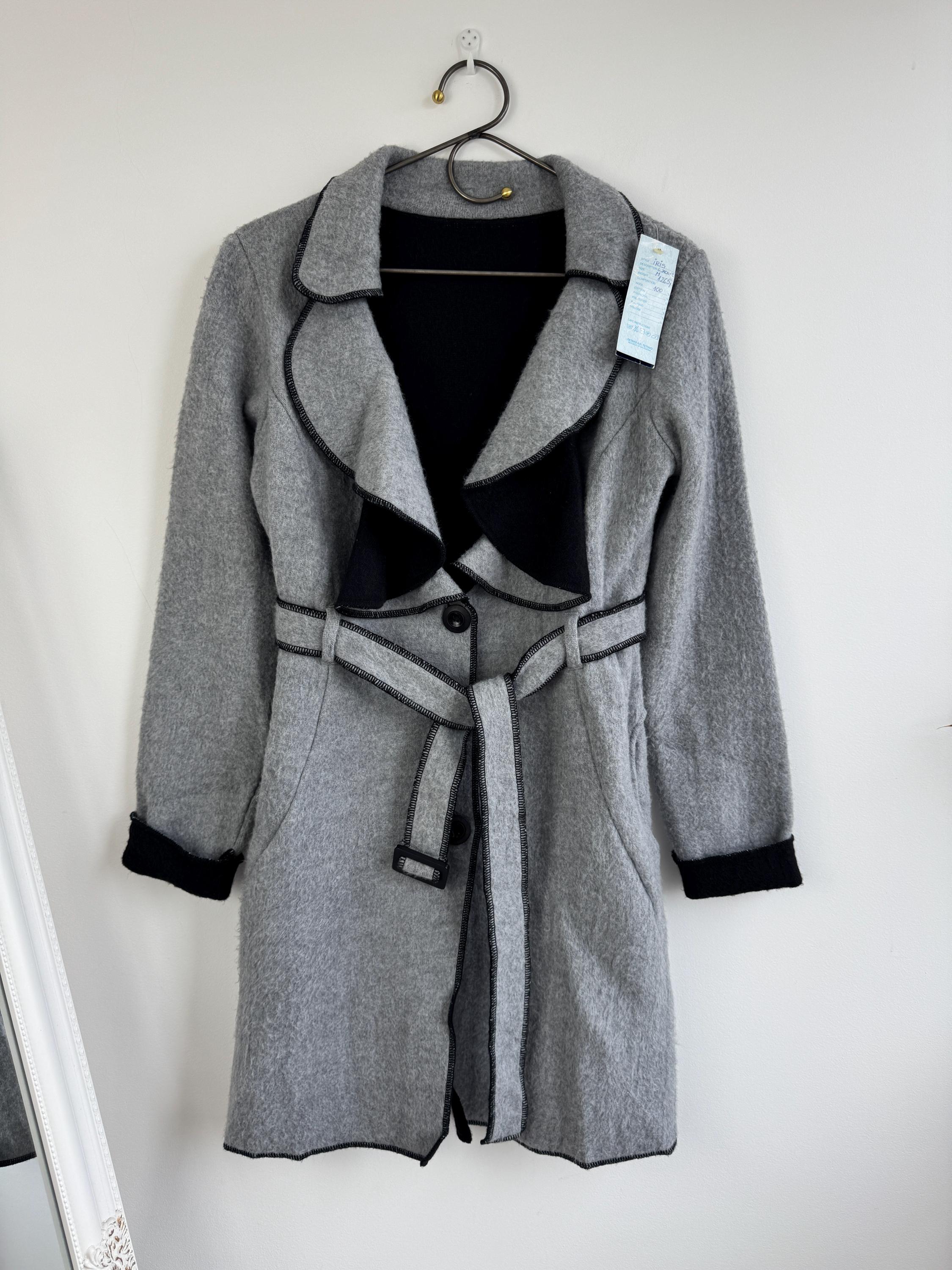 Crafted from 100% pure wool, the fabric has a beautiful, substantial drape ideal for layering over knitwear or a dress. There is no linning underneath. It has extra long belt and side pockets. The light grey body provides a versatile neutral base, dramatically contrasted by a shawl collar and elegant black trim. The statement ruffled collar and single-button closure create that iconic, flattering silhouette—chic, professional, and endlessly stylish. It’s an authentic piece of European vintage tailoring that brings a unique, high-quality touch to any modern outfit.
