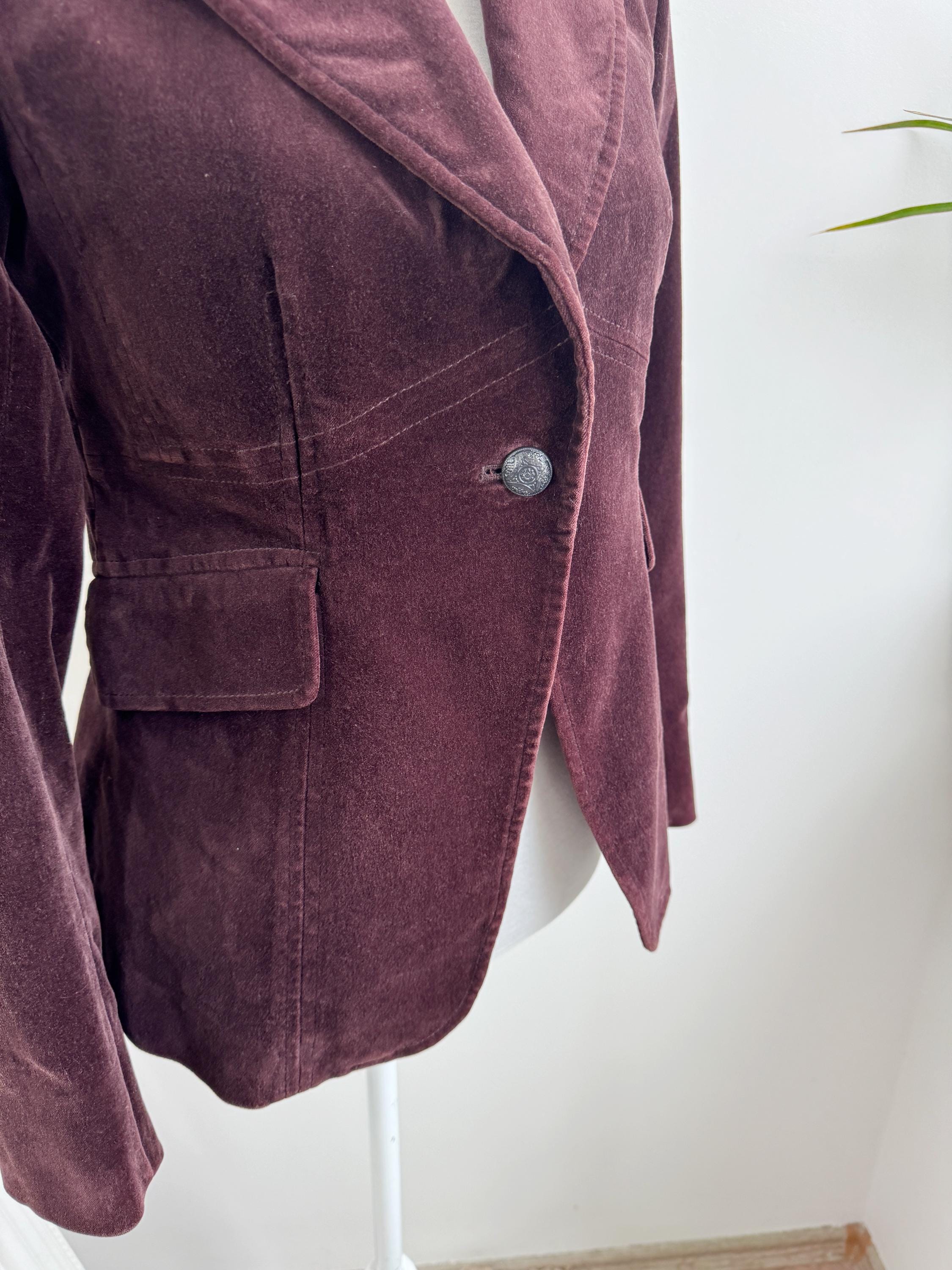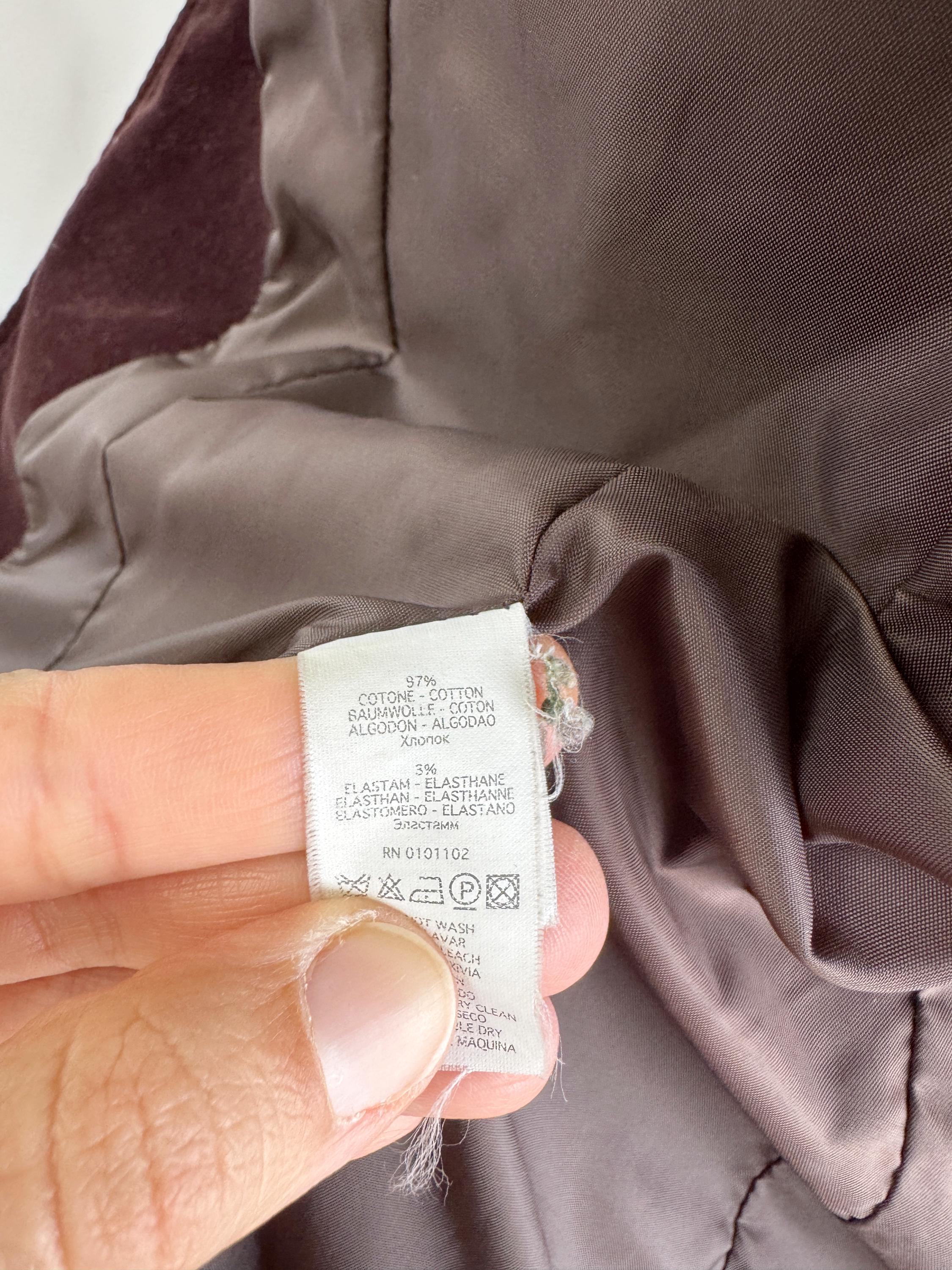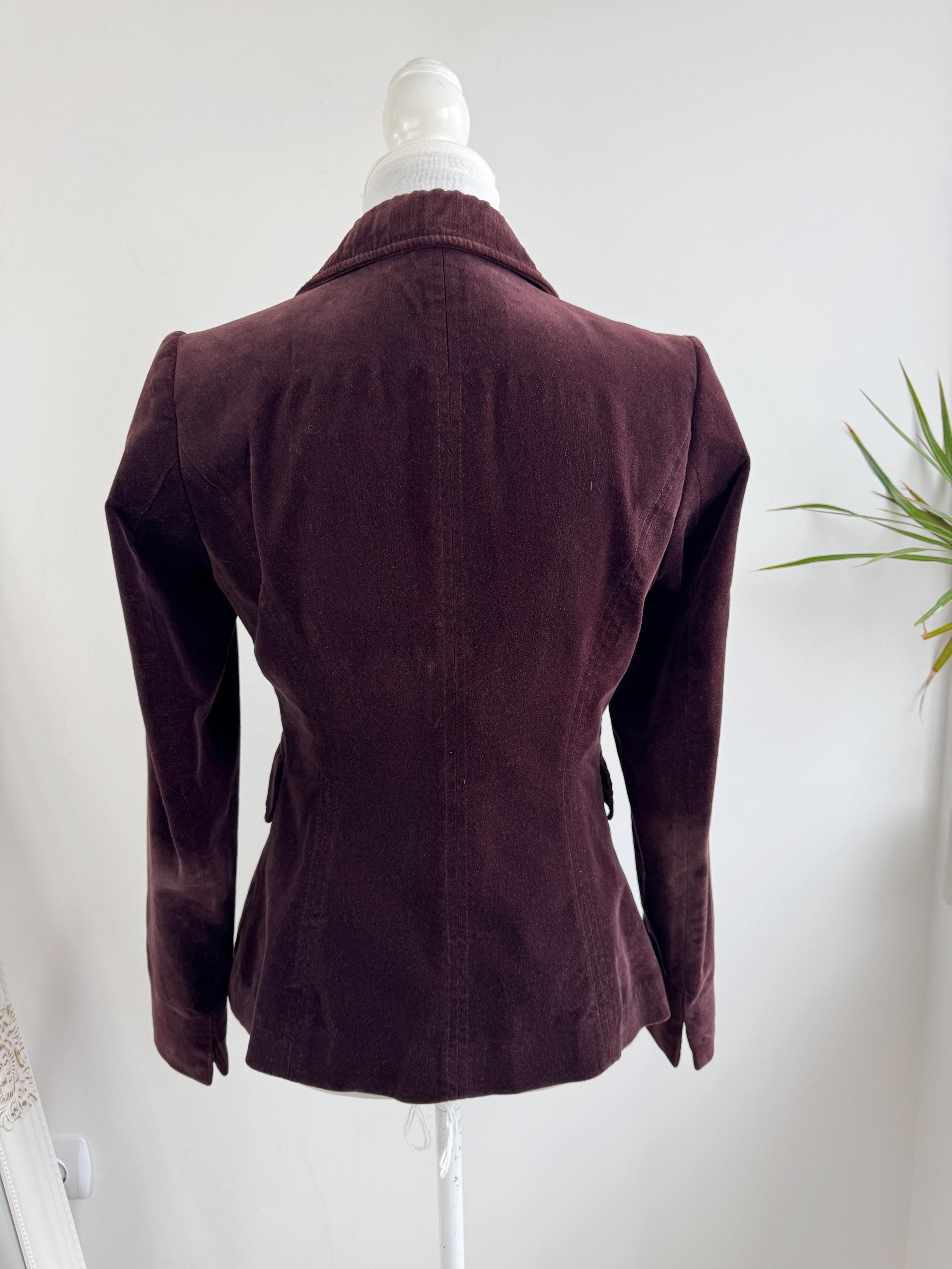 This is s vintage Y2K cotton corduroy blazer jacket for women by the Italian brand Stephanel in lovely dark brown color. This elegant slim fit cotton blazer is made of soft velveteen cotton fabric with single button closure and two flap over pockets. This brown velvet jacket has lining underneath. The size marked is Italy 42, EUR 38, US 6 it fits like size S. Please check the measurements below
