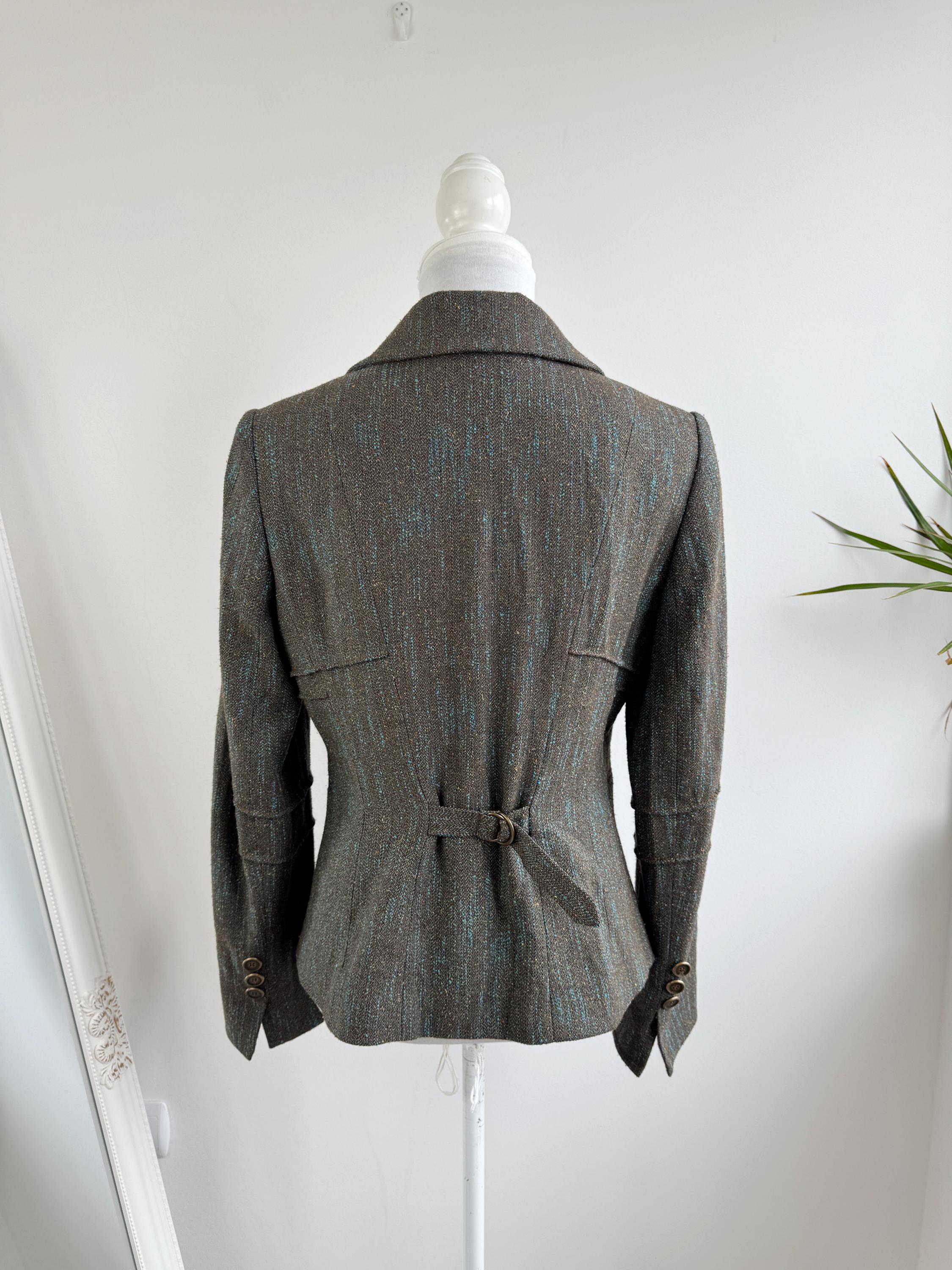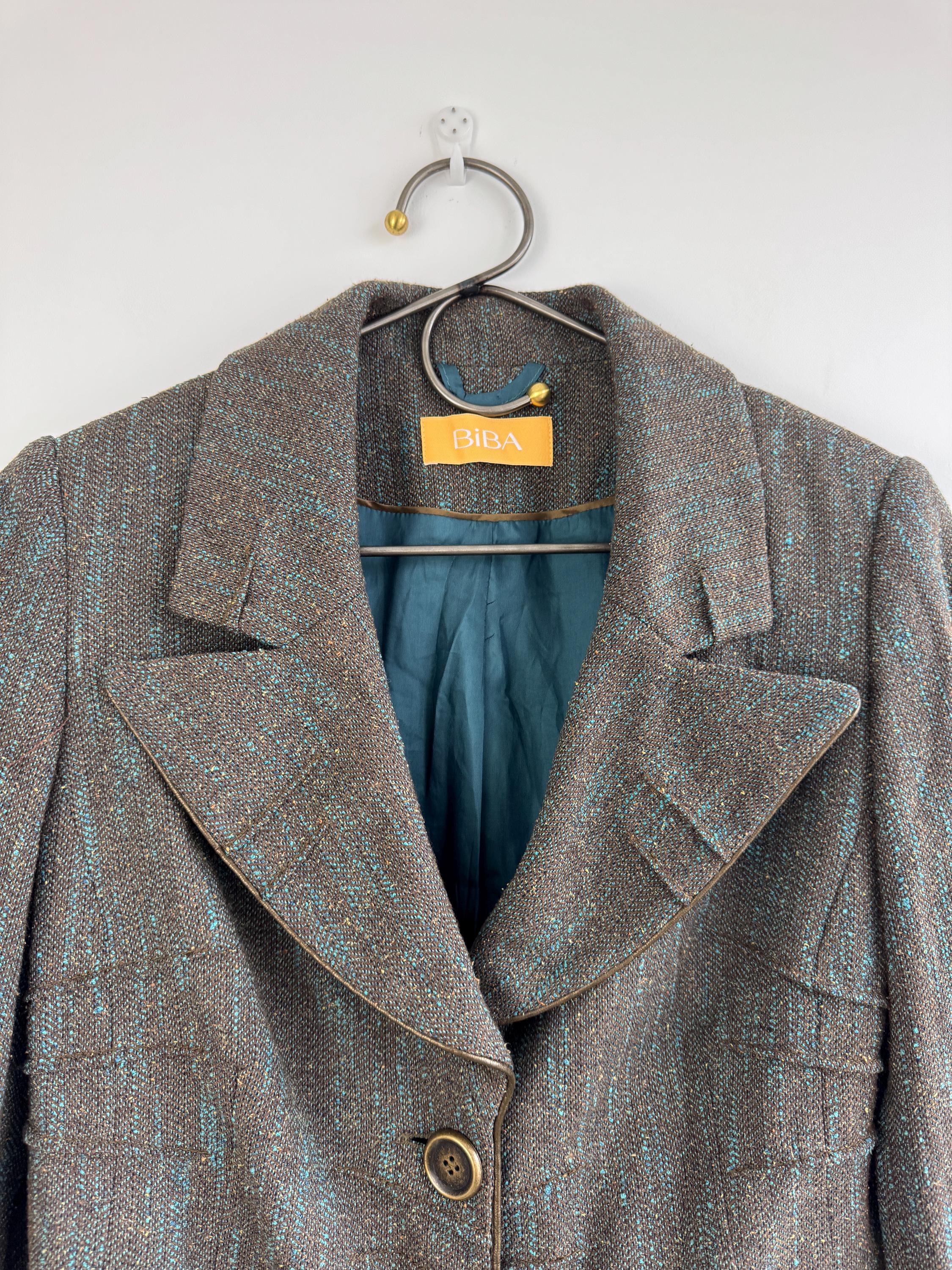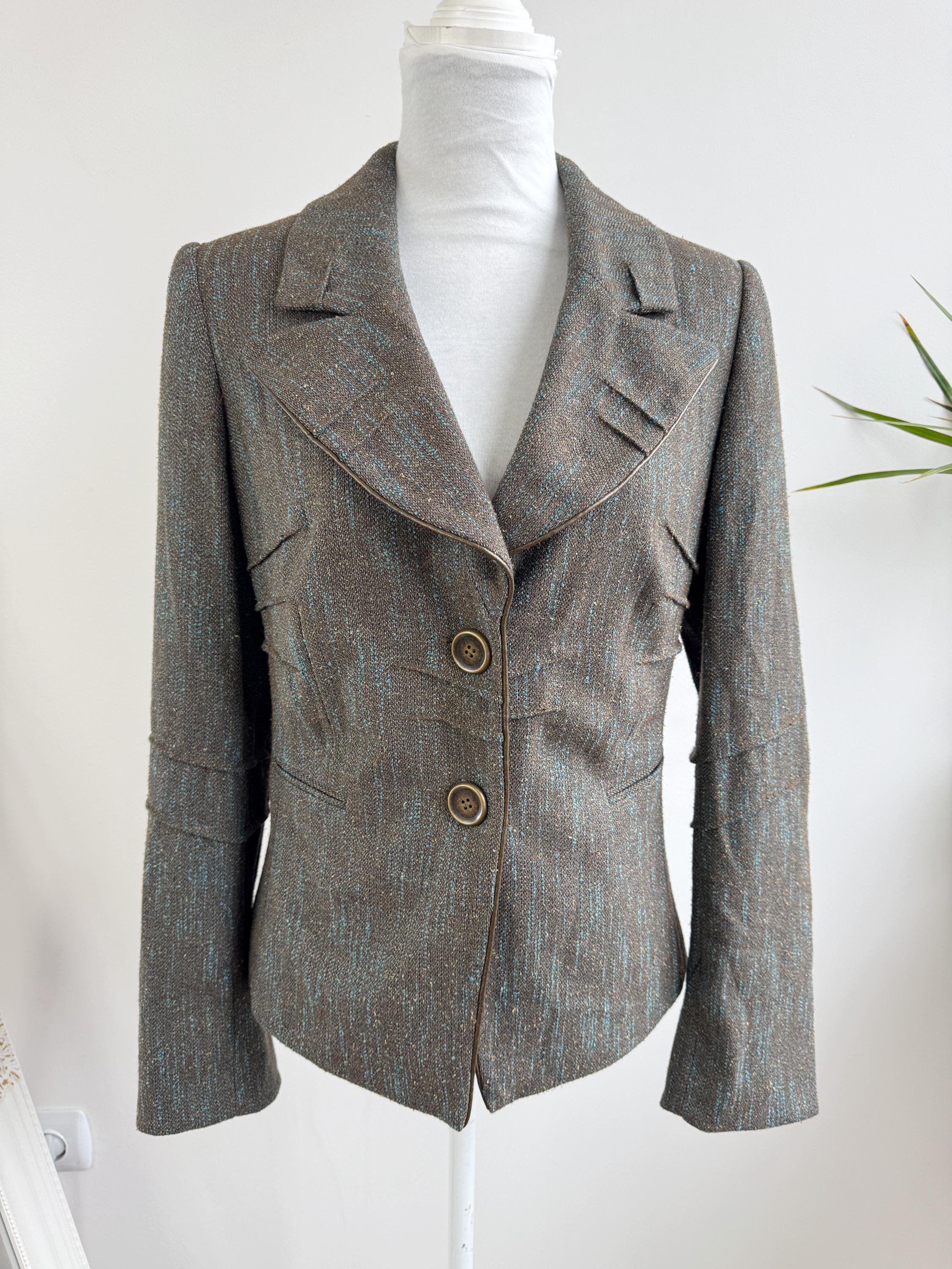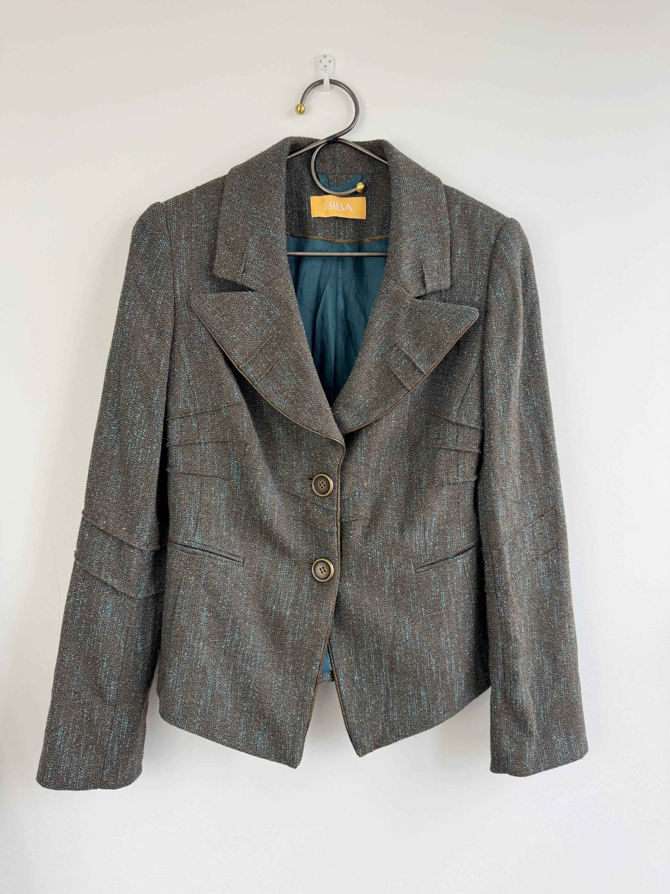 This is s beautiful vintage Y2K BIBA tweed blazer jacket made of beautiful textured fabric made of 51% polyester, 27% viscose, 13% wool, 9% silk with acetate/ viscose lining. This textured tweed blazer has two button closure with two brass buttons and a belted back, so you can tailor it. This elegant sports coat has two front pockets and decorative exposed stitches. The size marked is D 36, GB 10, F 38, fits like S/M