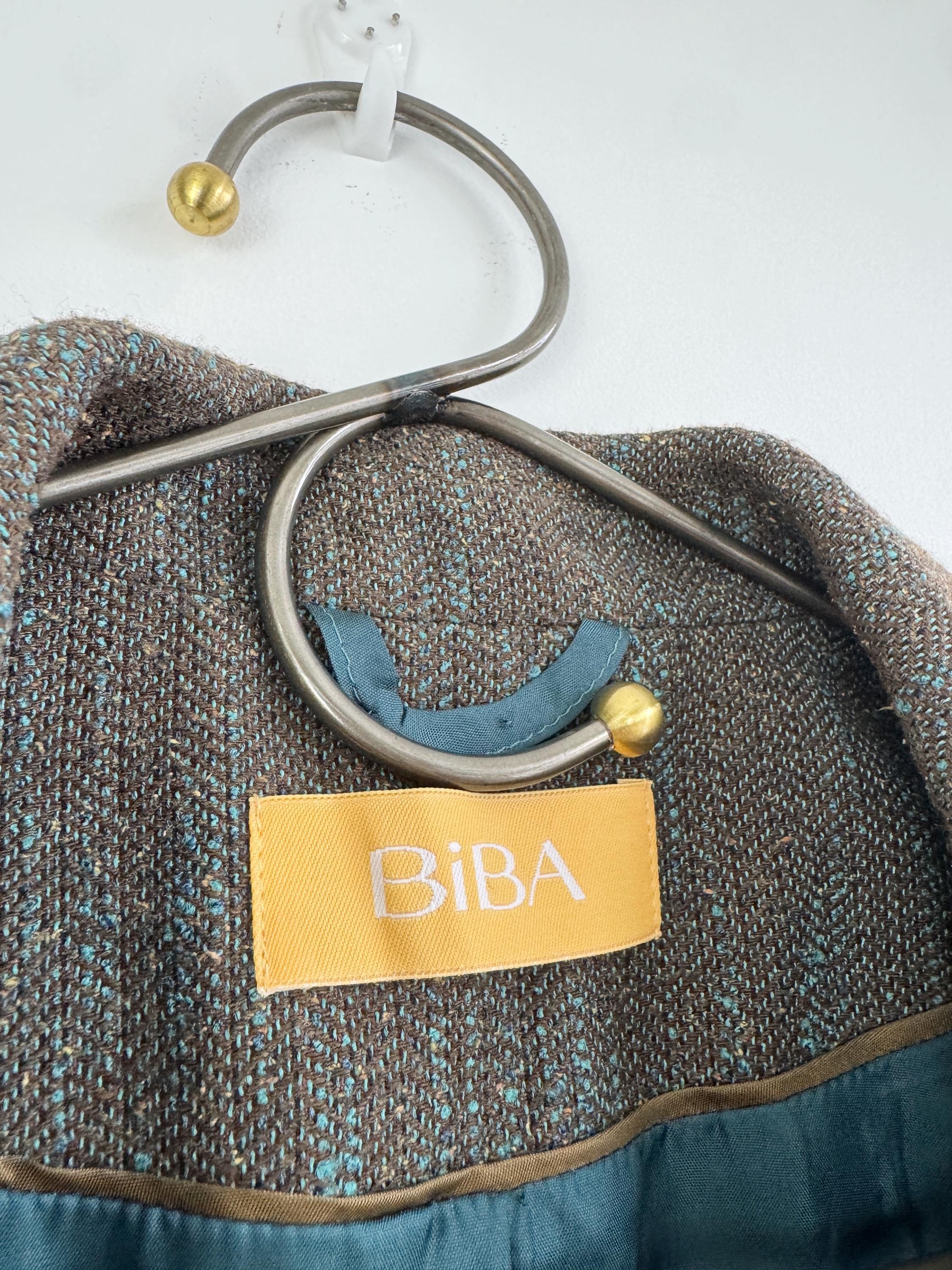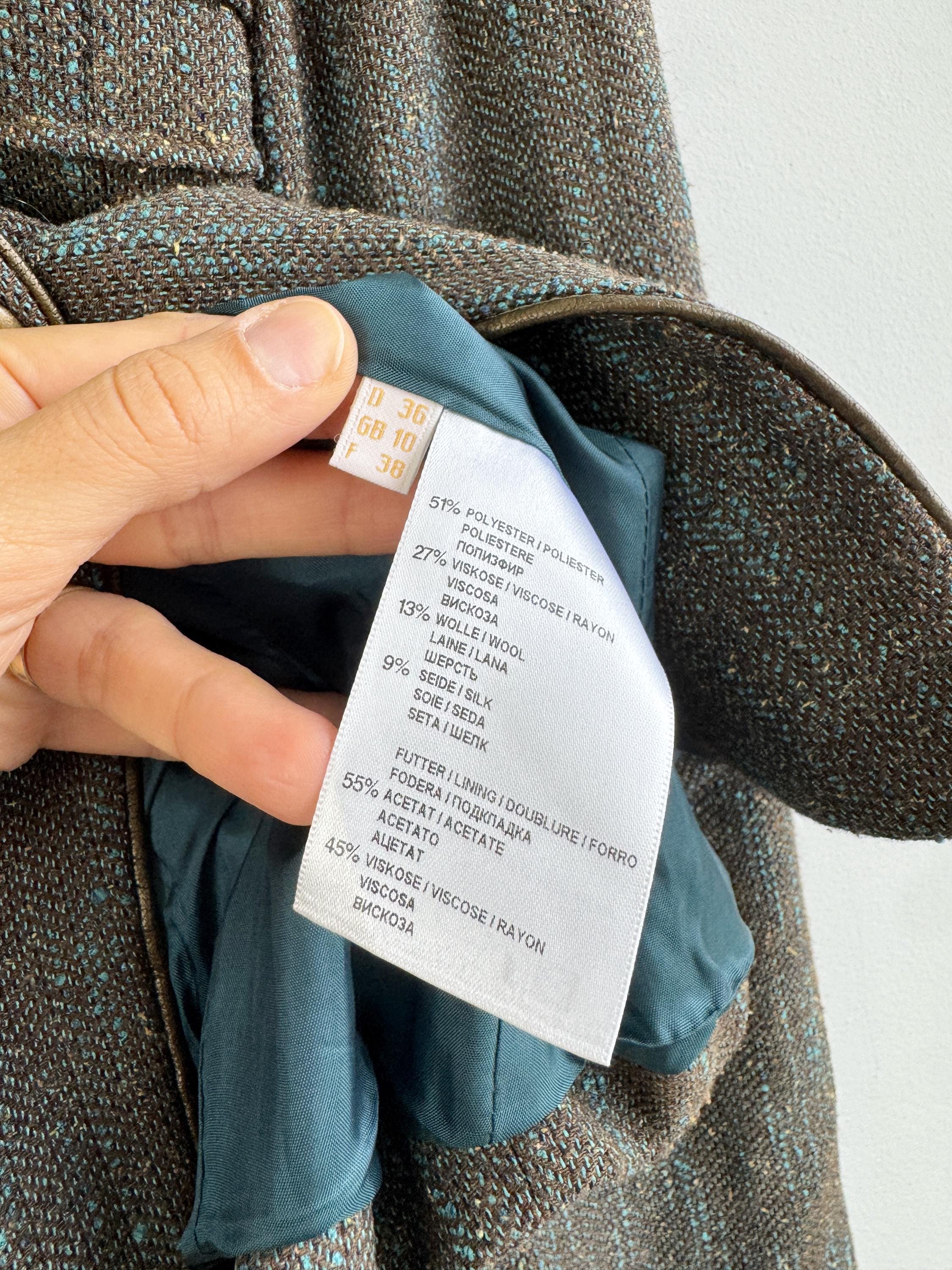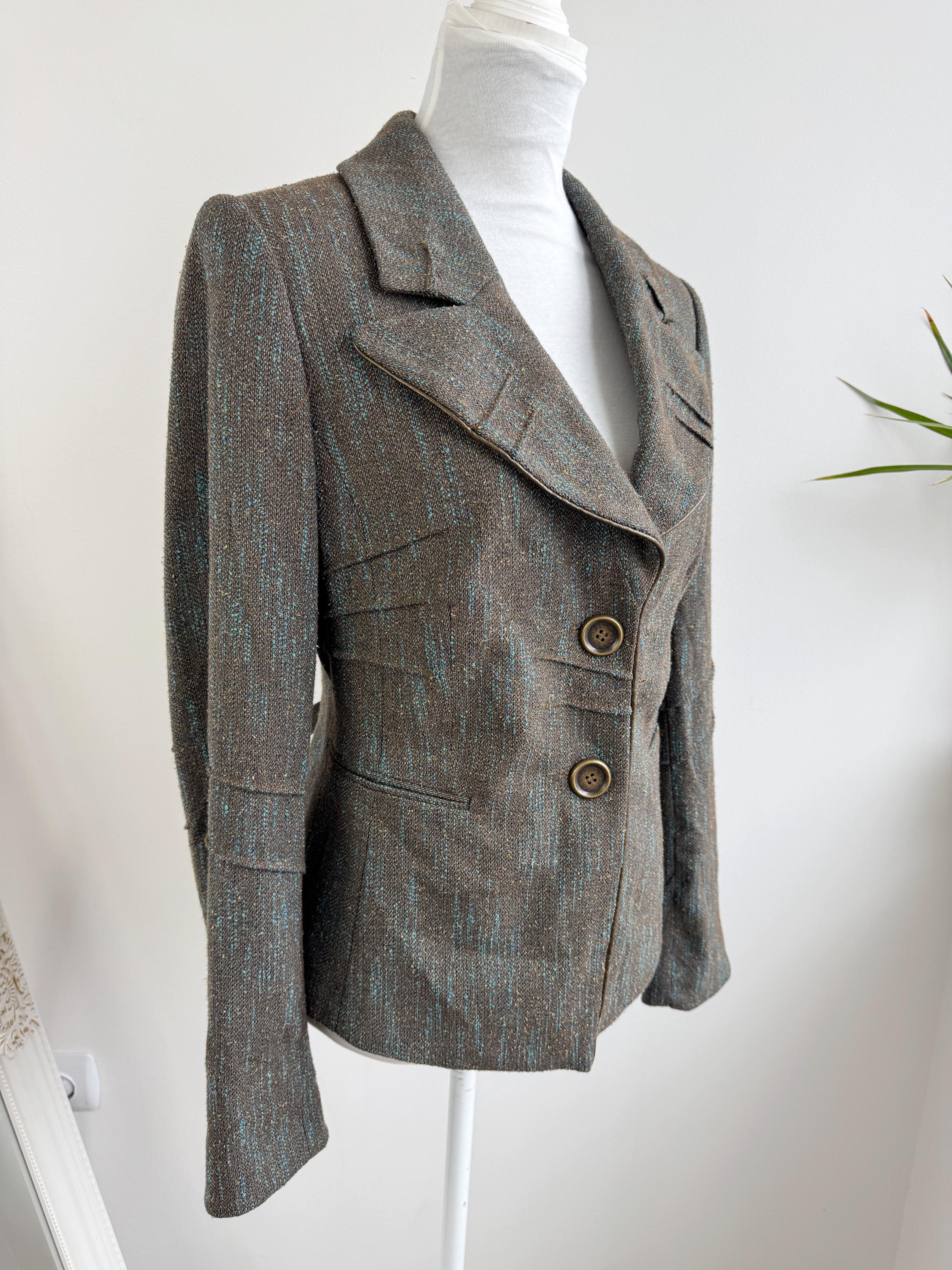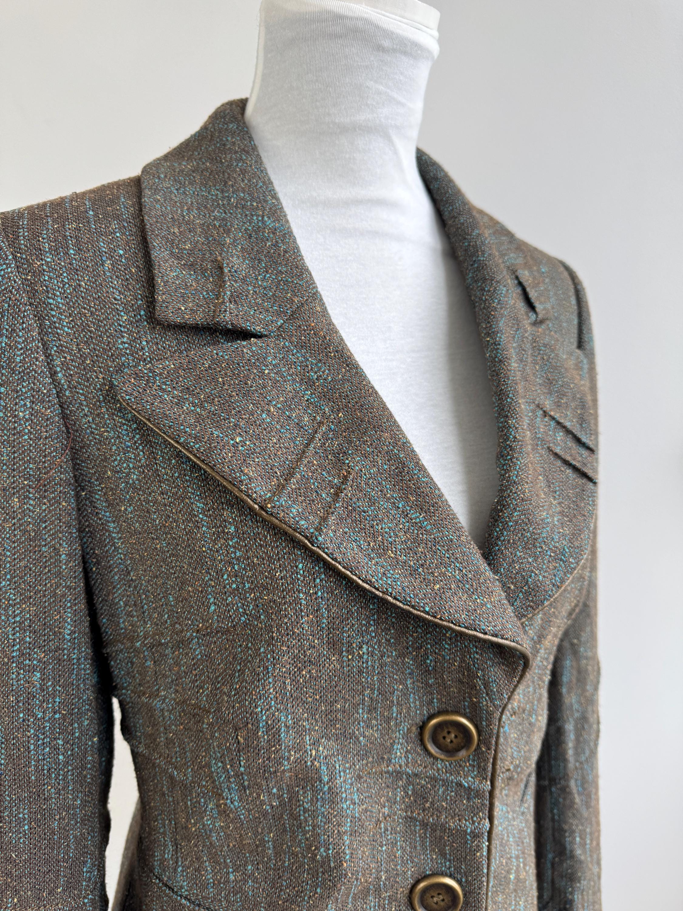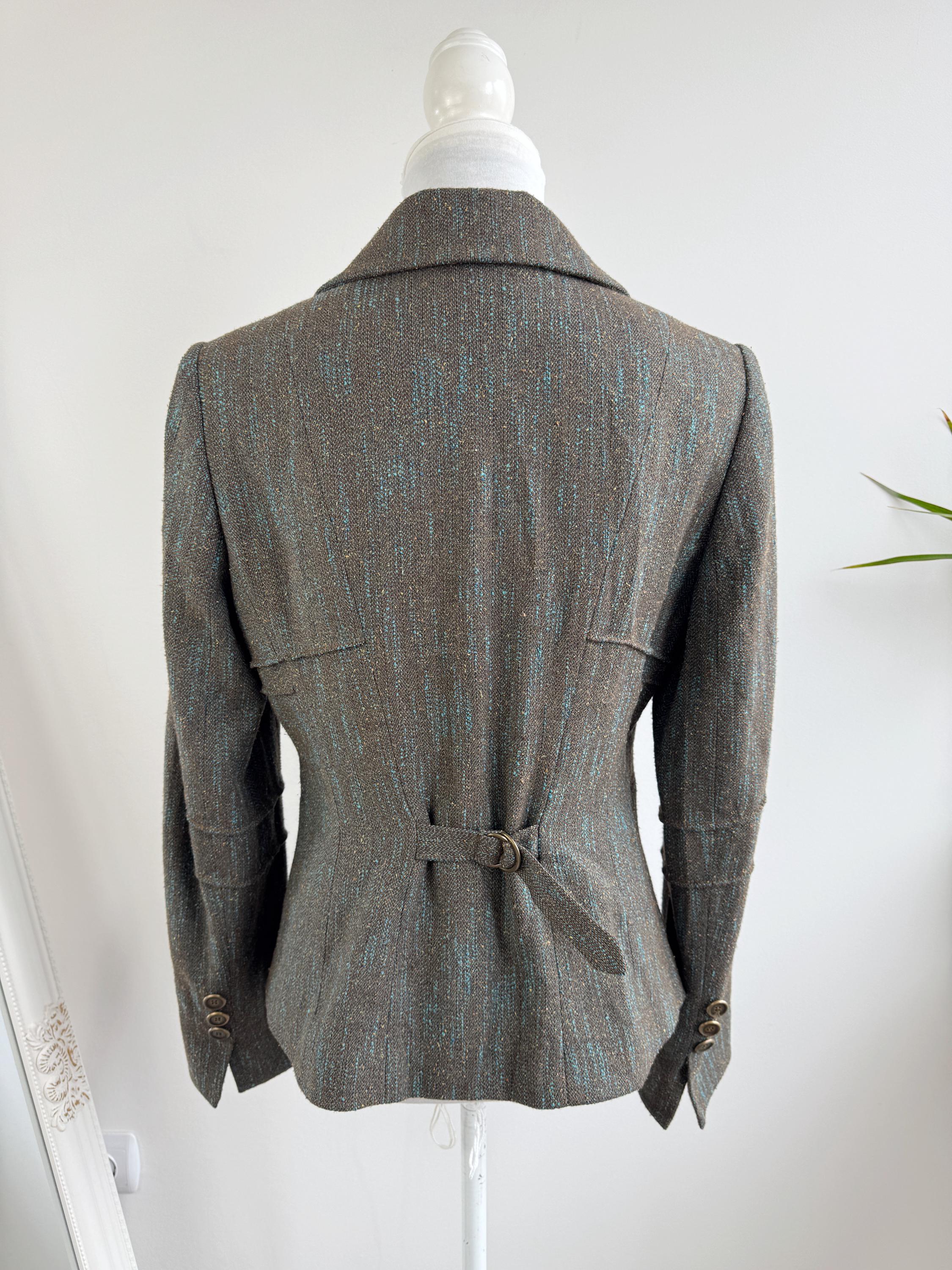 This is s beautiful vintage Y2K BIBA tweed blazer jacket made of beautiful textured fabric made of 51% polyester, 27% viscose, 13% wool, 9% silk with acetate/ viscose lining. This textured tweed blazer has two button closure with two brass buttons and a belted back, so you can tailor it. This elegant sports coat has two front pockets and decorative exposed stitches. The size marked is D 36, GB 10, F 38, fits like S/M