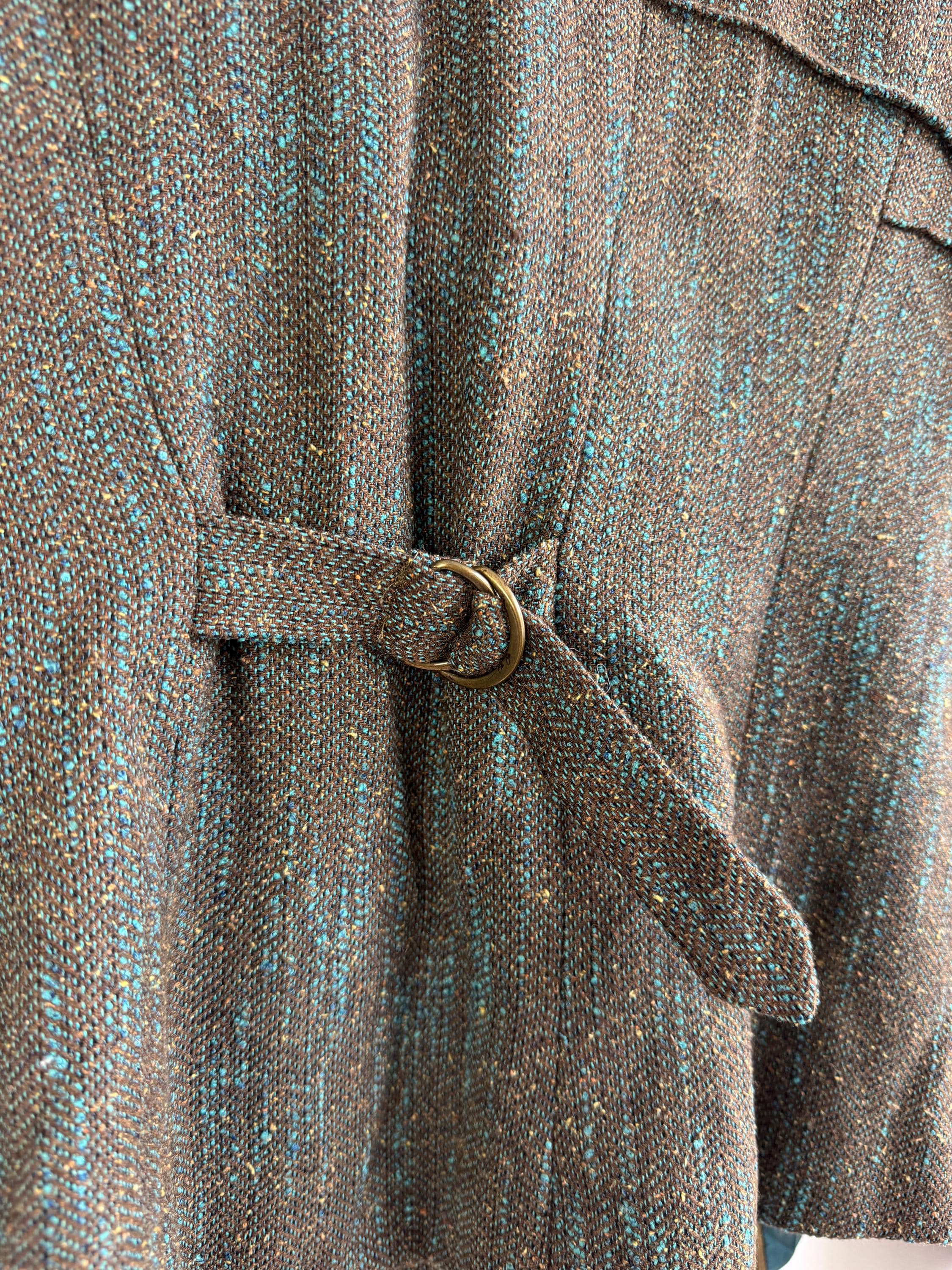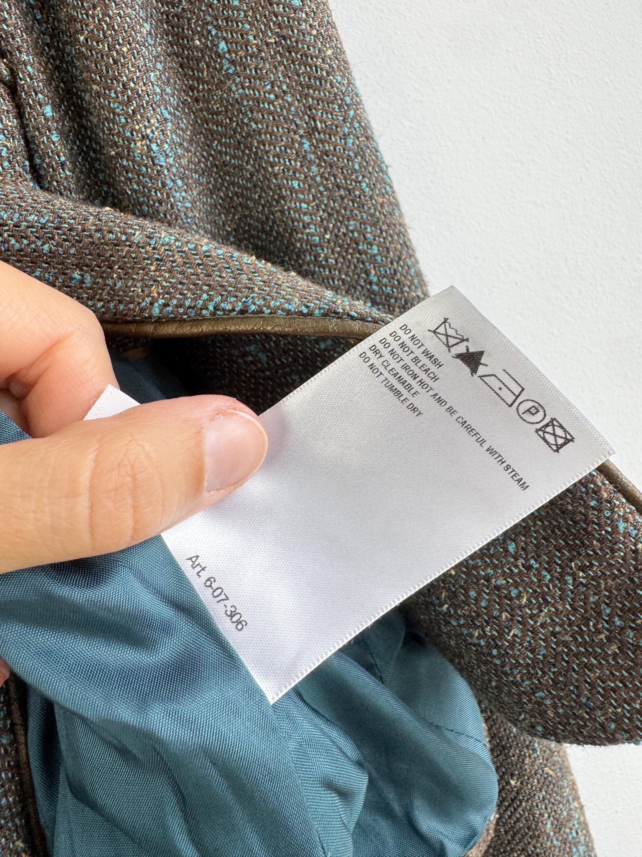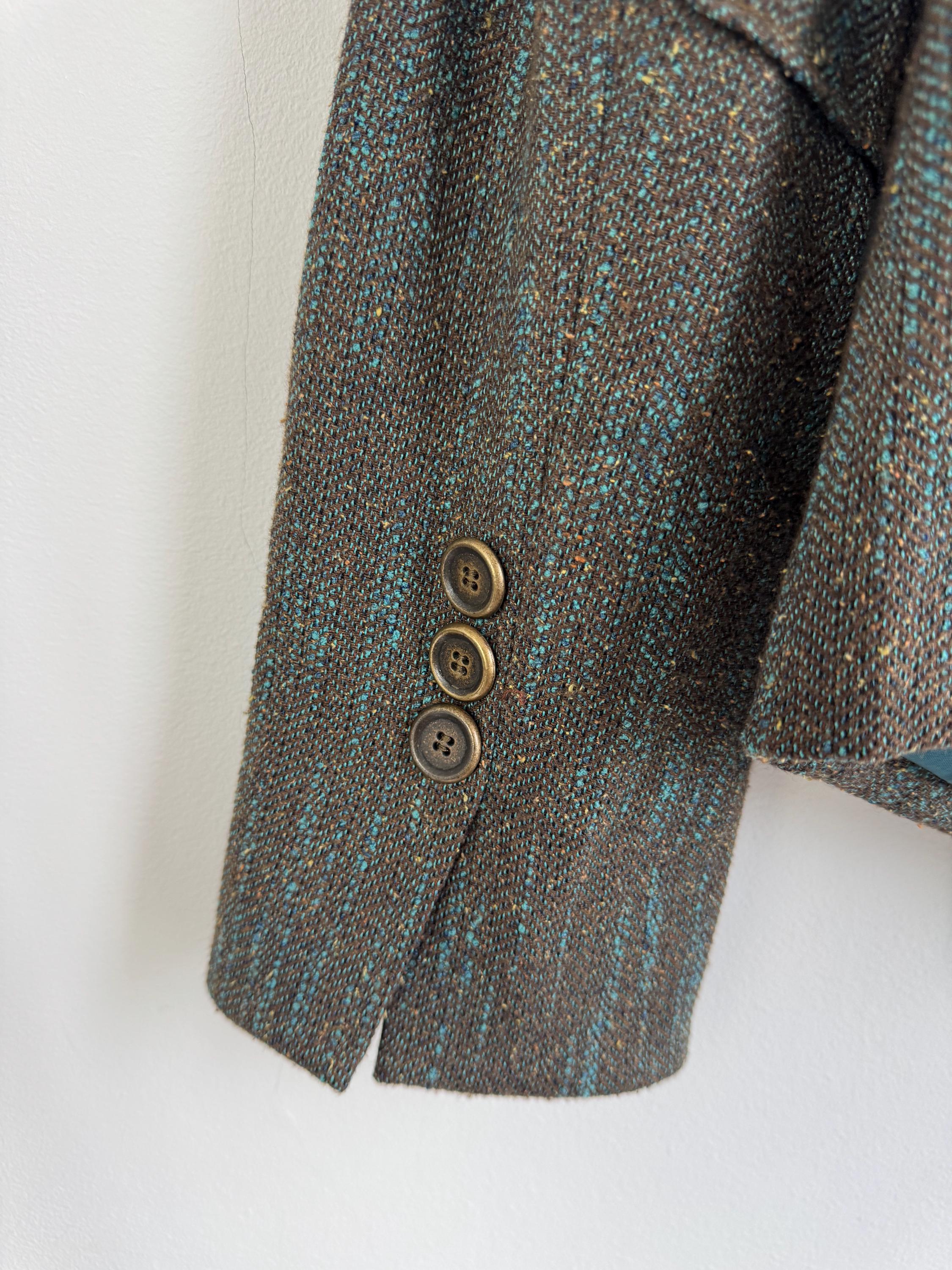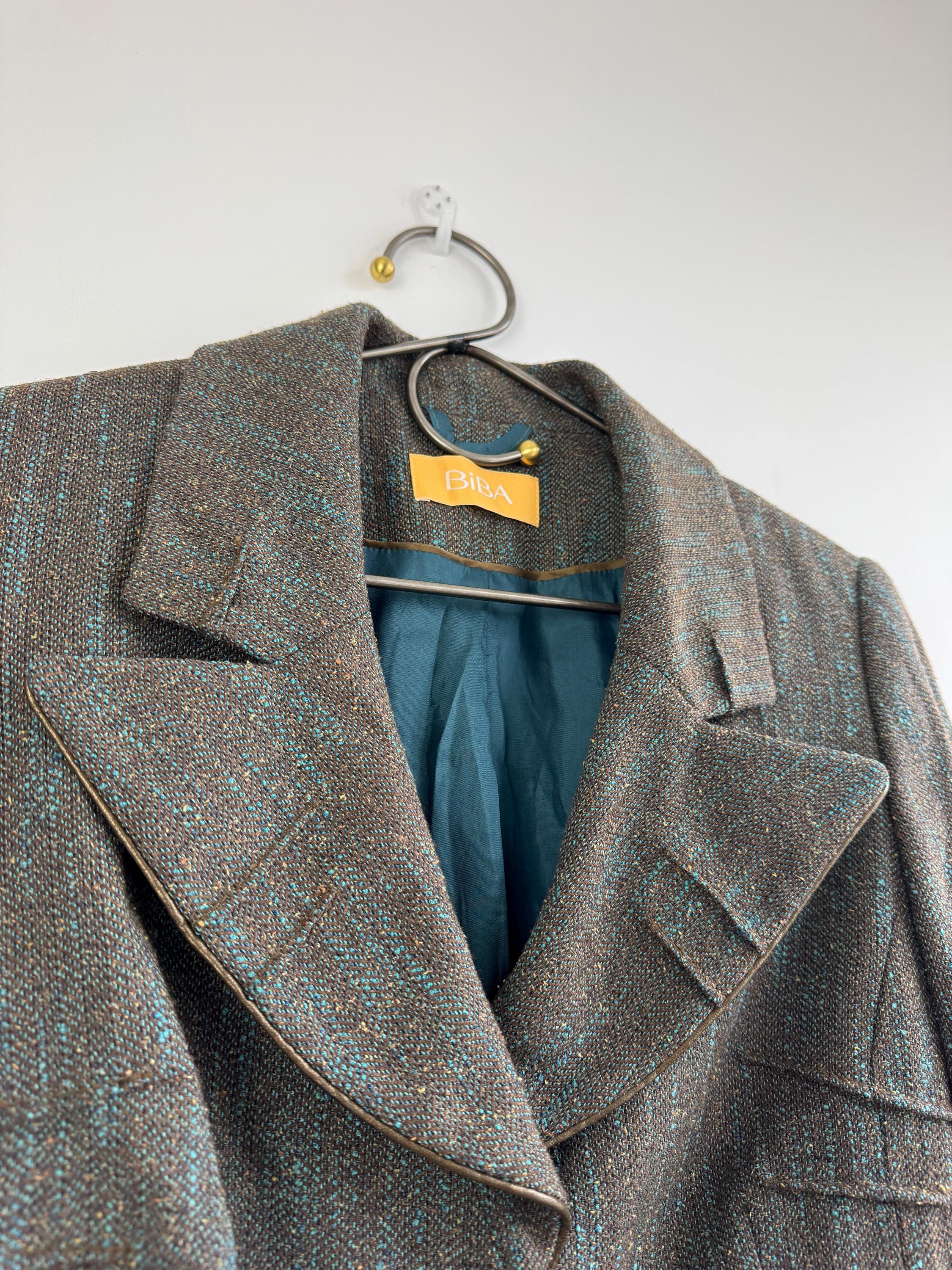 This is s beautiful vintage Y2K BIBA tweed blazer jacket made of beautiful textured fabric made of 51% polyester, 27% viscose, 13% wool, 9% silk with acetate/ viscose lining. This textured tweed blazer has two button closure with two brass buttons and a belted back, so you can tailor it. This elegant sports coat has two front pockets and decorative exposed stitches. The size marked is D 36, GB 10, F 38, fits like S/M