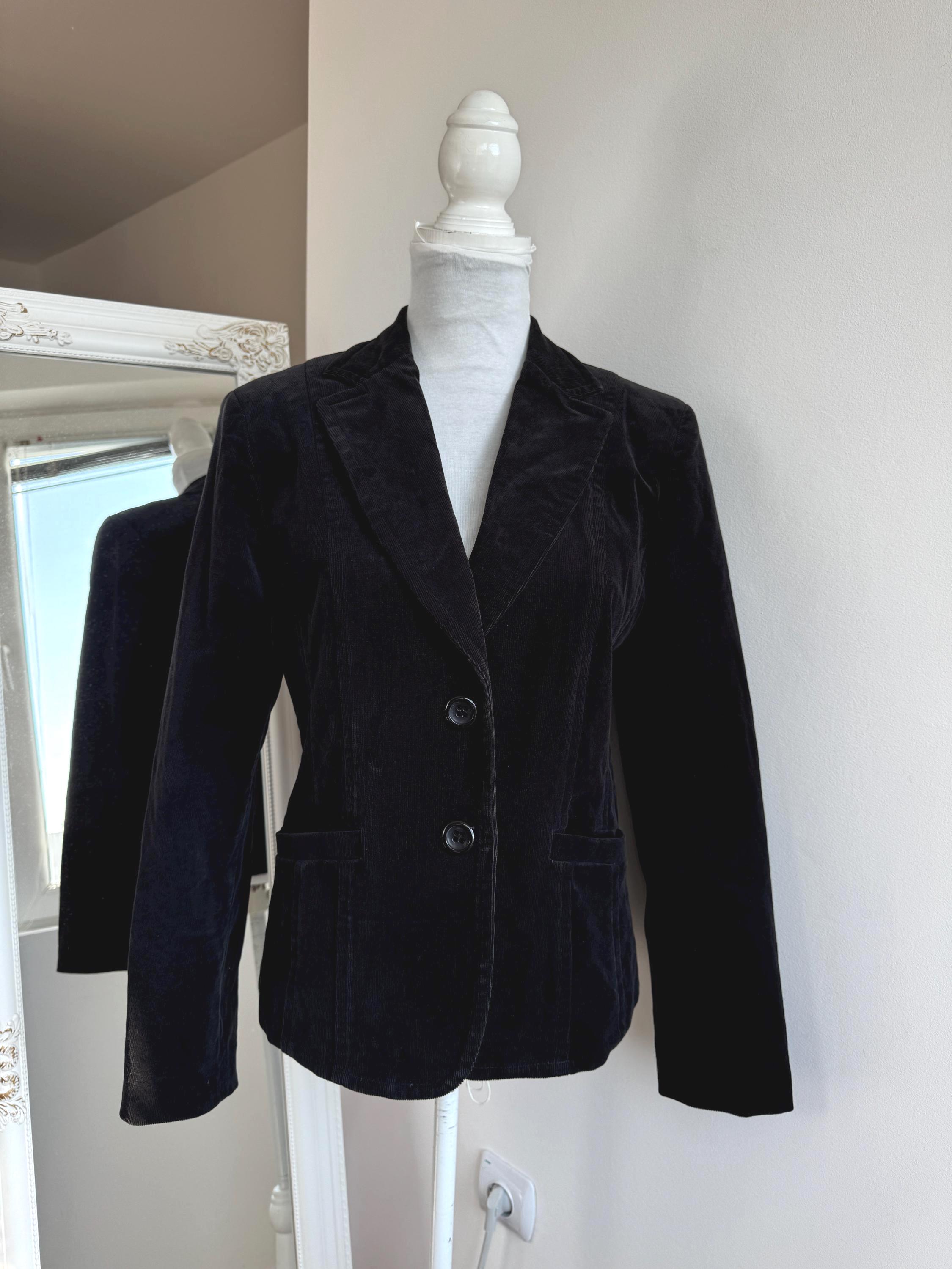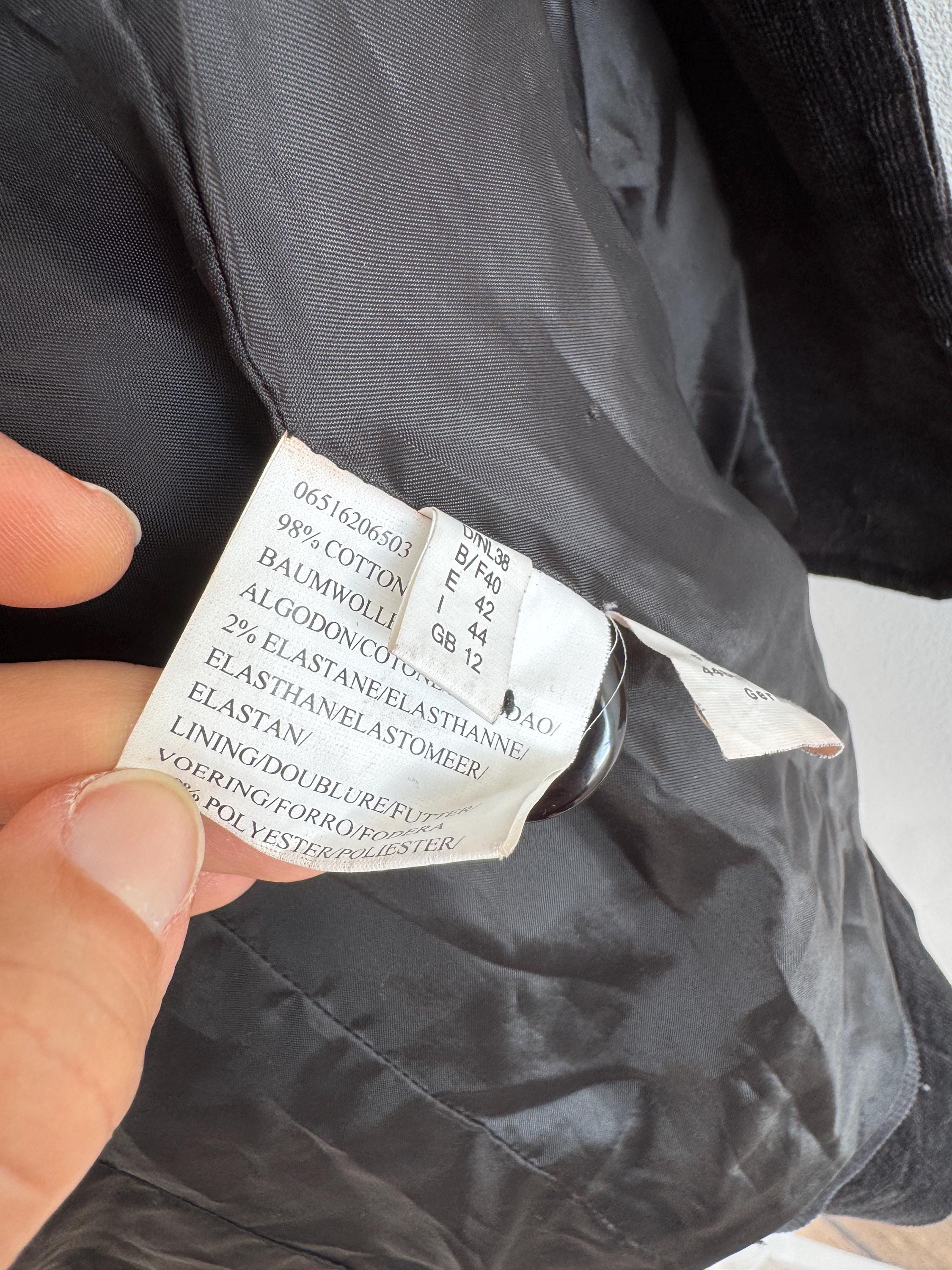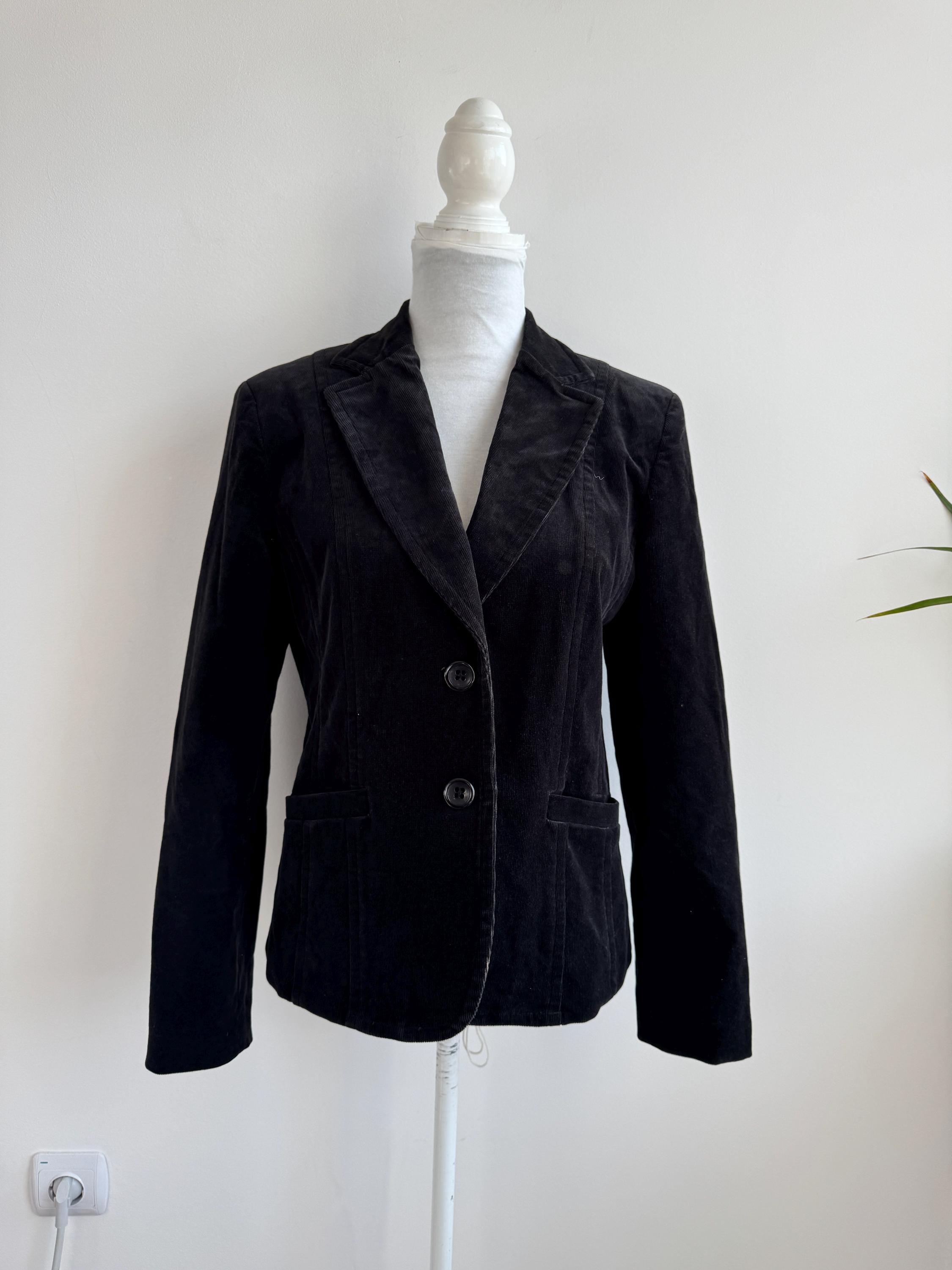 This is s vintage 90s black cotton corduroy blazer for women with two button front closure and pockets in size M by Steilmann made in Germany. This black velveteen blazer is made of cotton corduroy fabric (98% cotton, 2% elastane). It has polyester lining. Fits like M. Please check the measurements below.