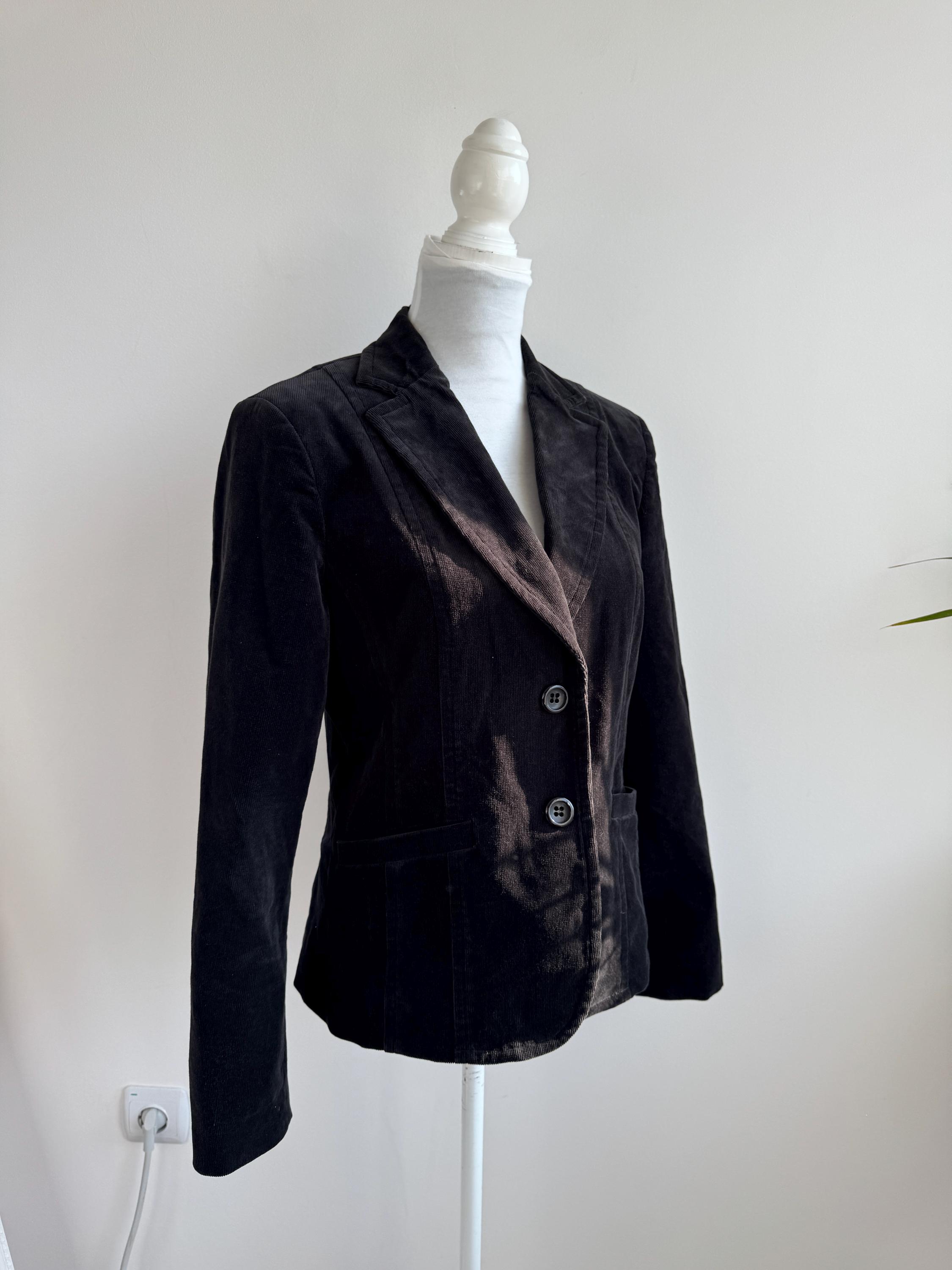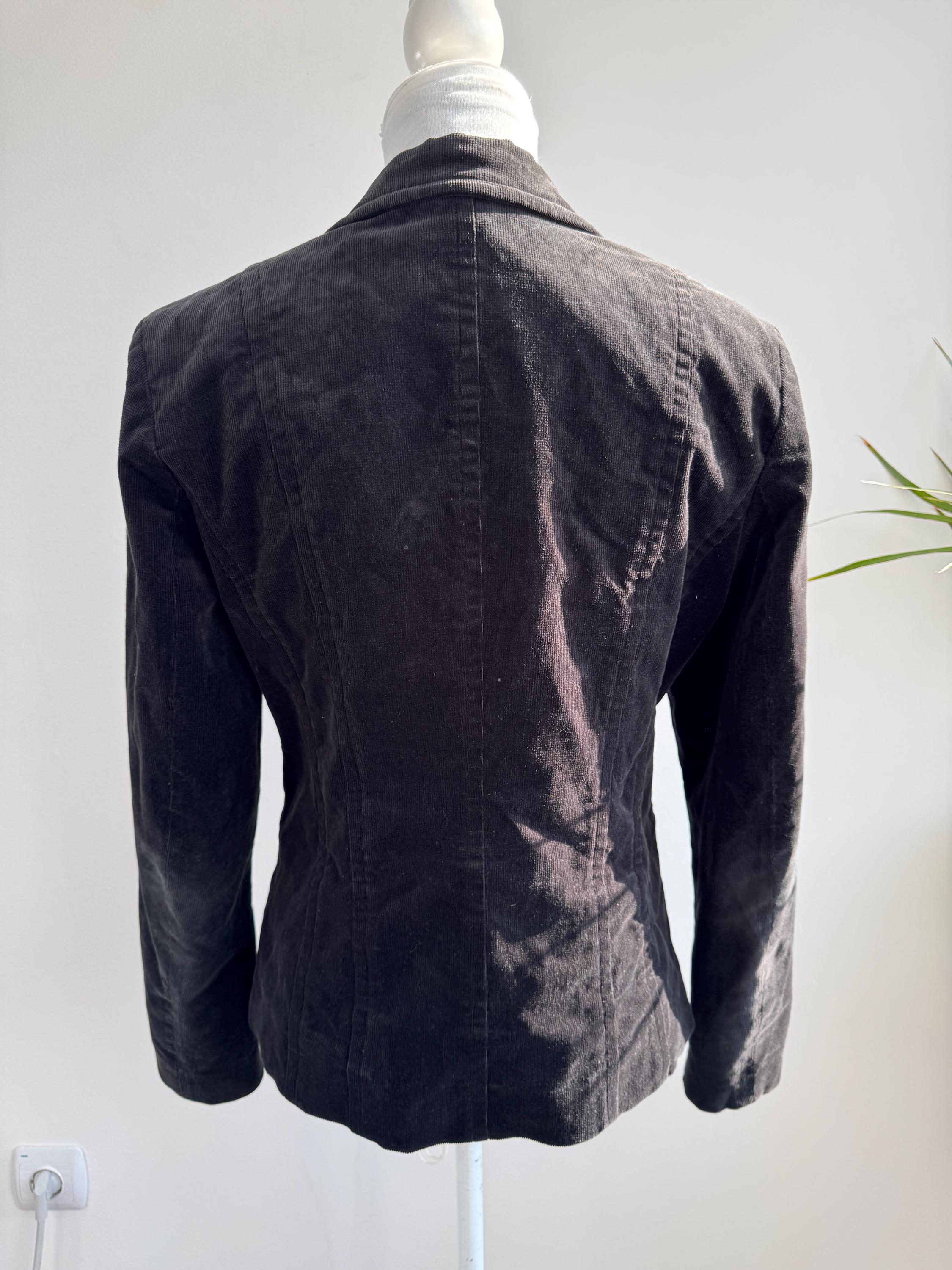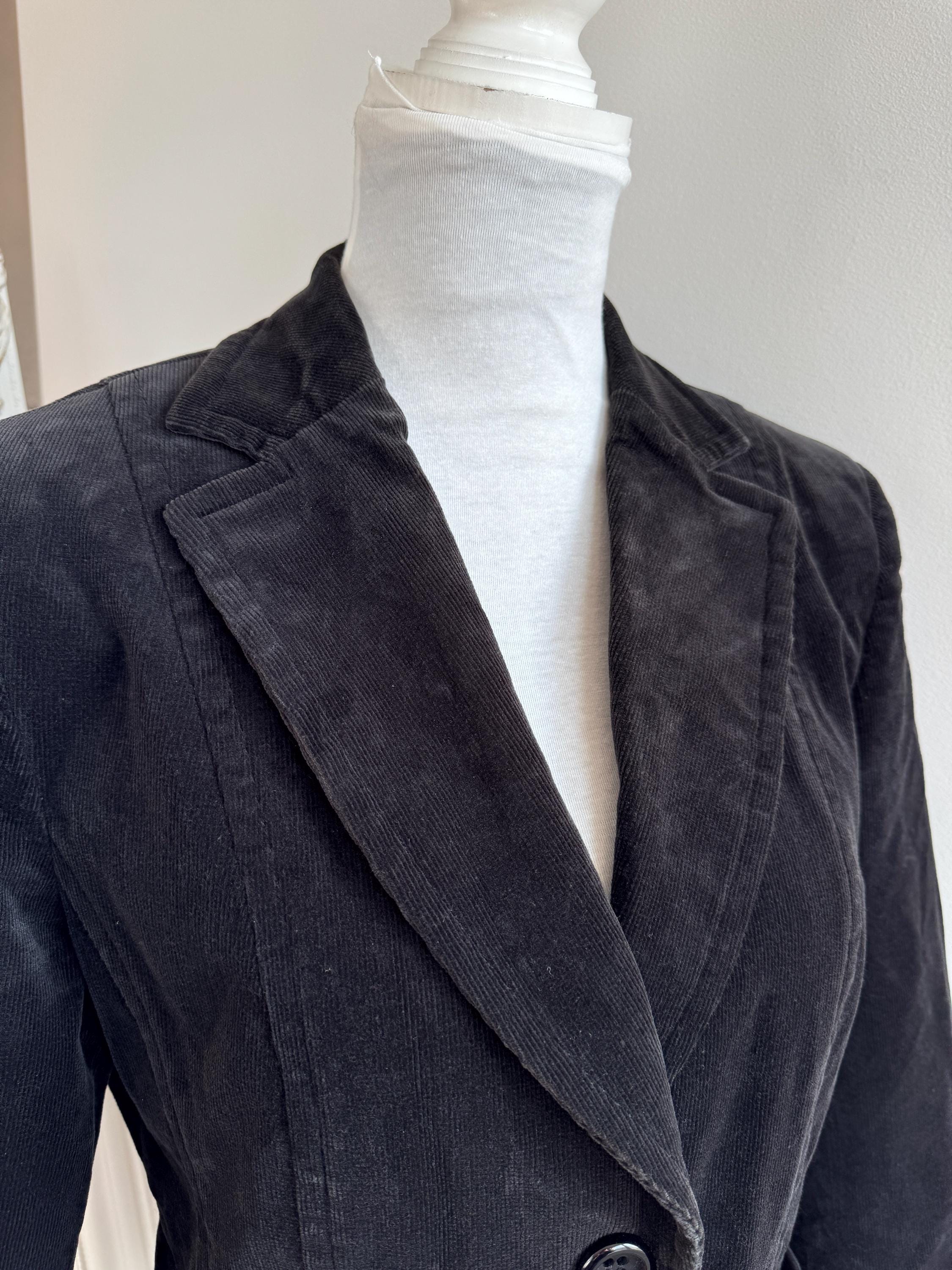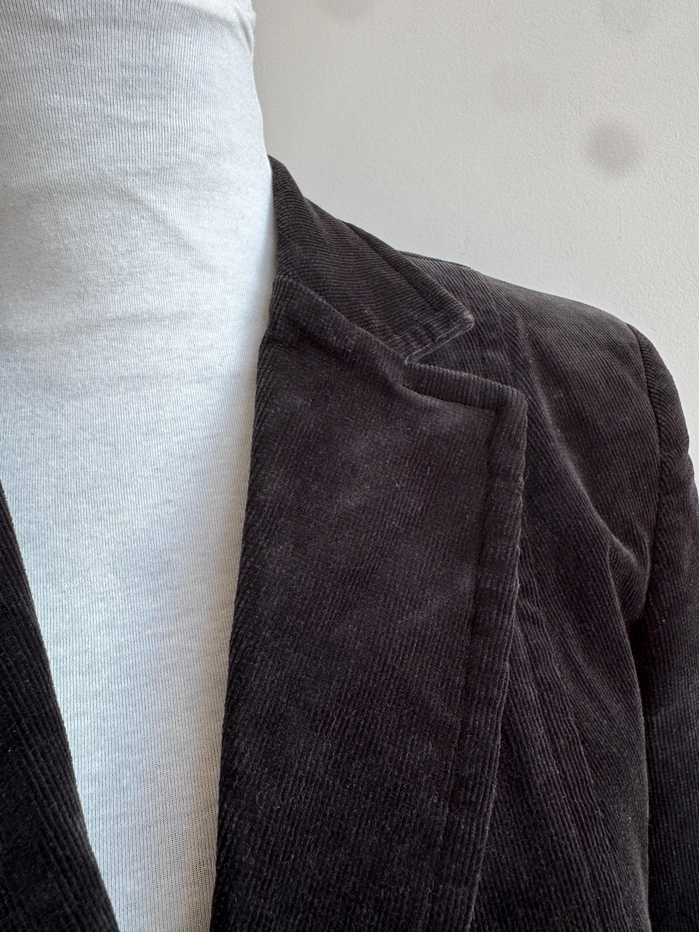 This is s vintage 90s black cotton corduroy blazer for women with two button front closure and pockets in size M by Steilmann made in Germany. This black velveteen blazer is made of cotton corduroy fabric (98% cotton, 2% elastane). It has polyester lining. Fits like M. Please check the measurements below.