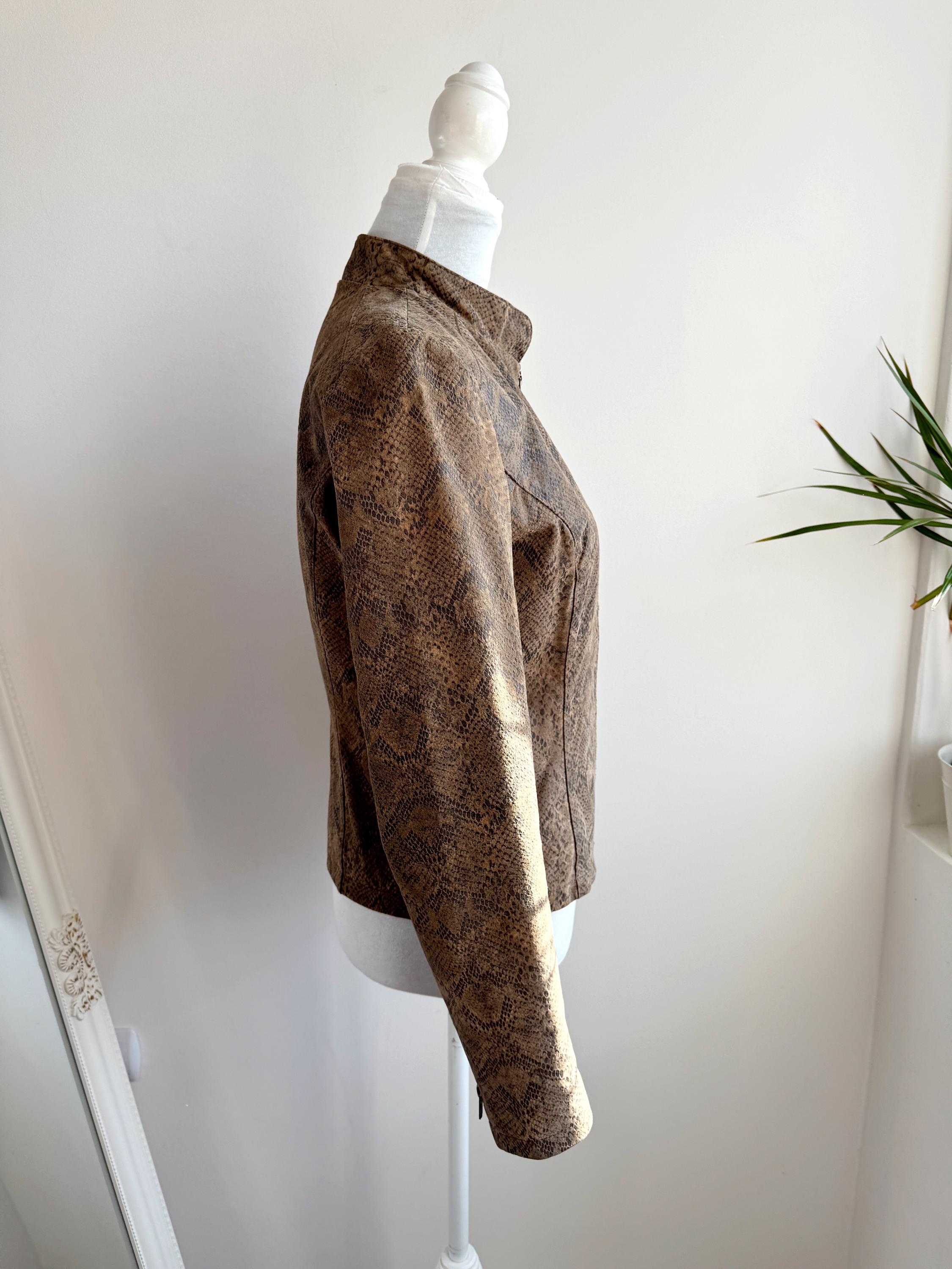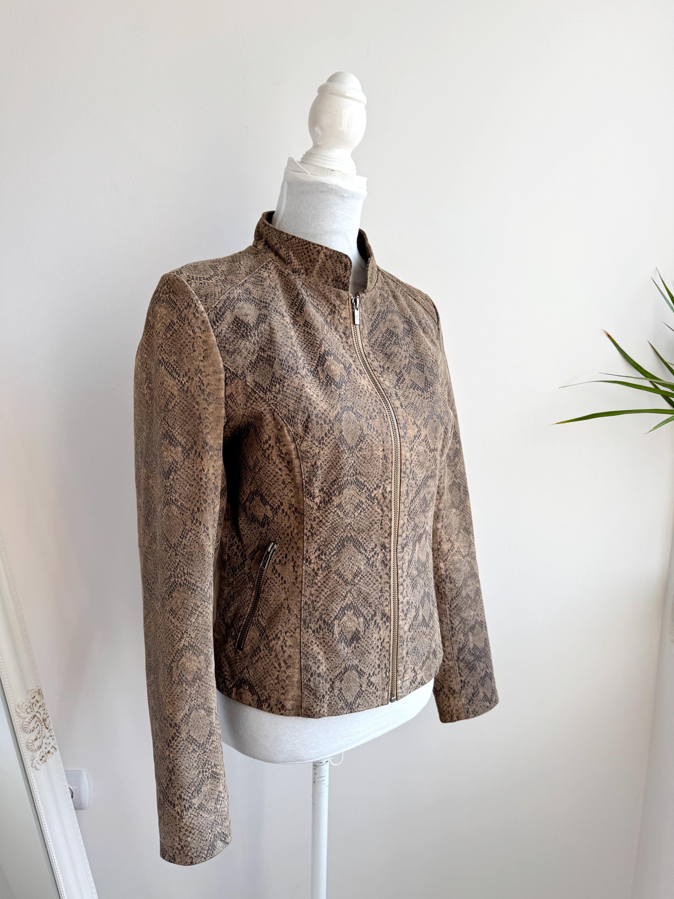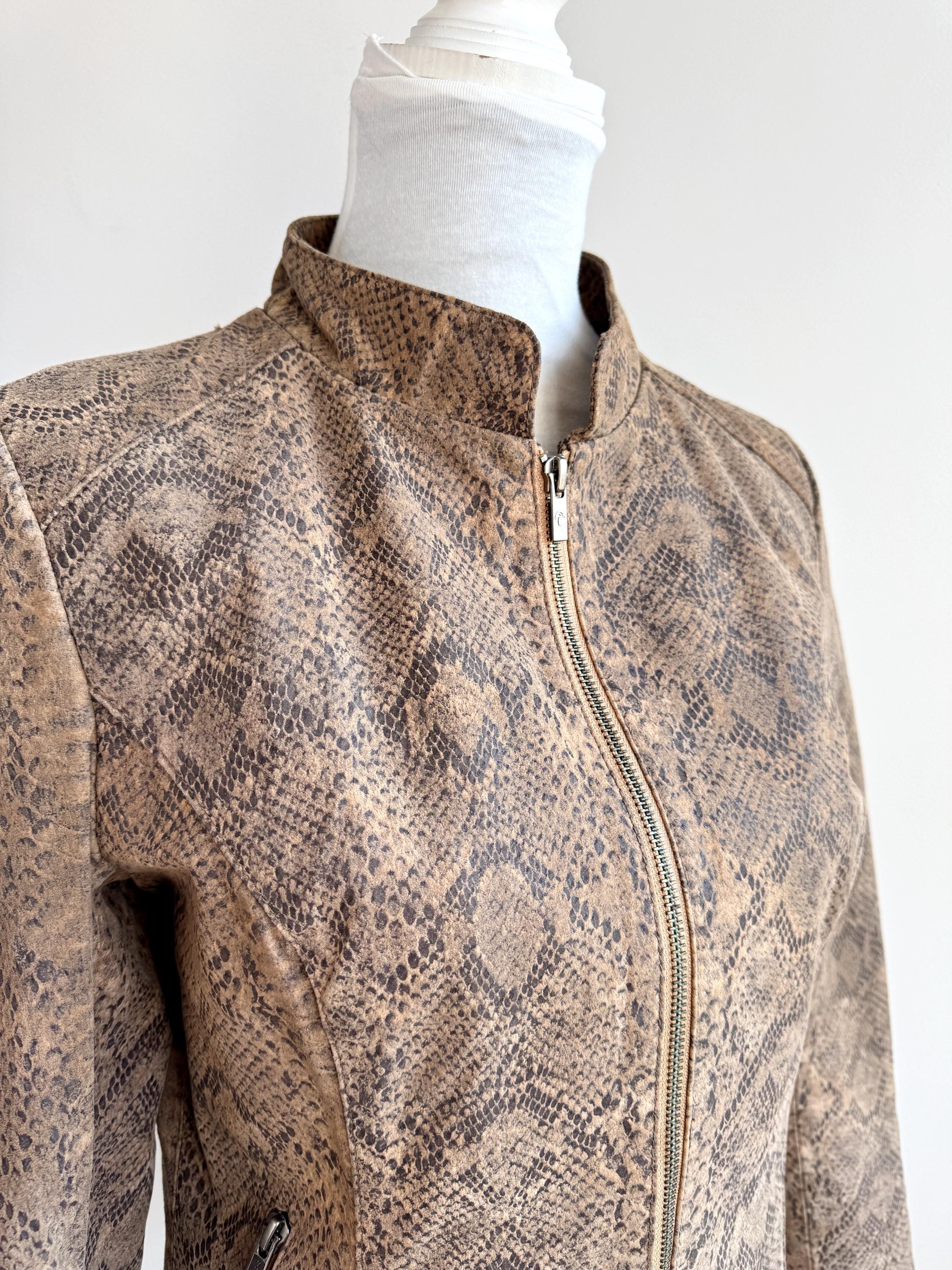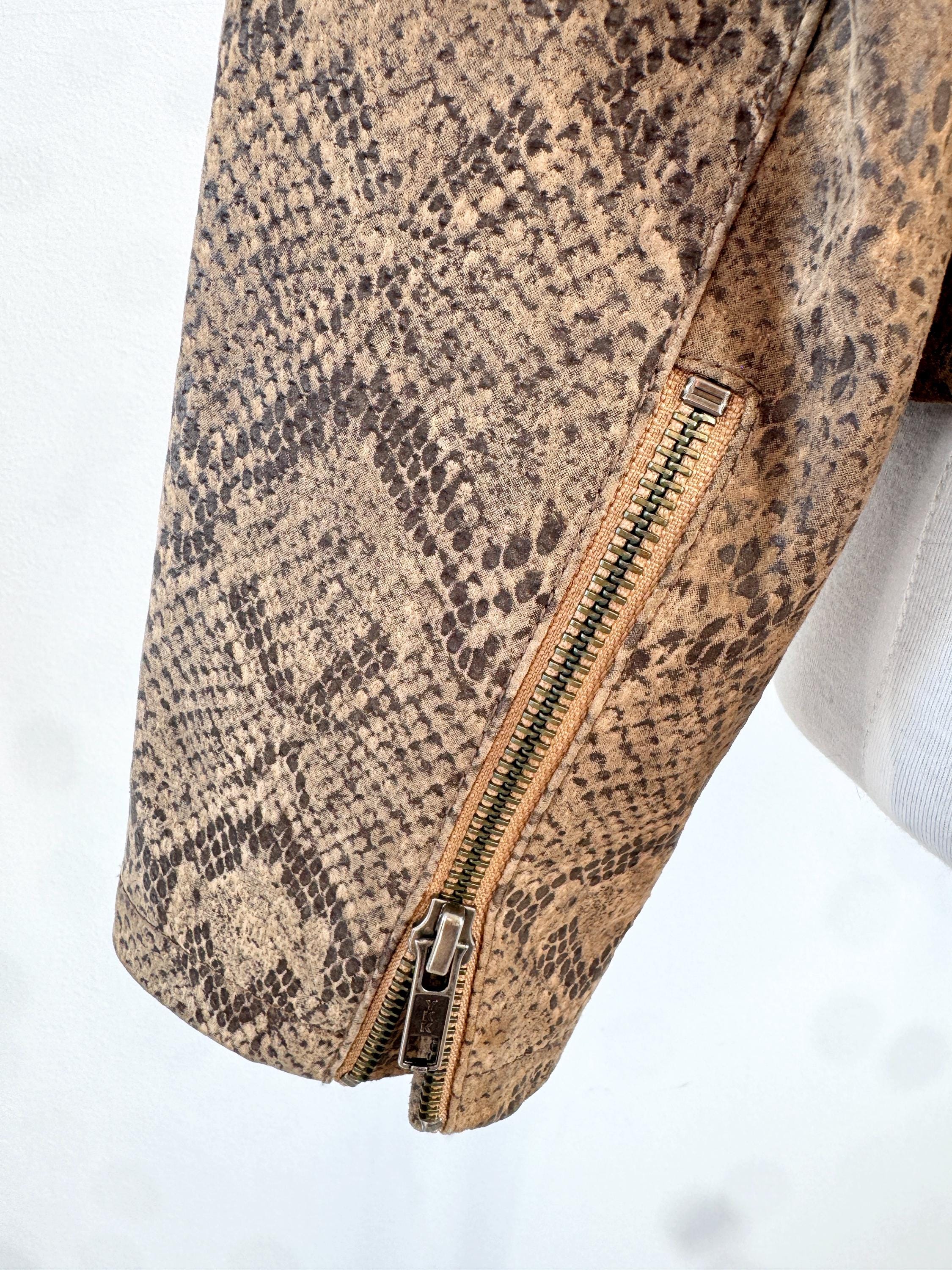 Unleash your wild side with this incredible Goosecraft snakeskin print leather jacket for women in size M. This leather jacket is cut in a classic moto/biker style with a high neck stand collar, front zipper, complemented by zippered cuffs and angled pockets. Made from 100% genuine leather with synthetic lining. Perfect for adding a grunge, punk, or exotic touch to any outfit, this leather jacket pairs effortlessly with everything from denim to dresses.