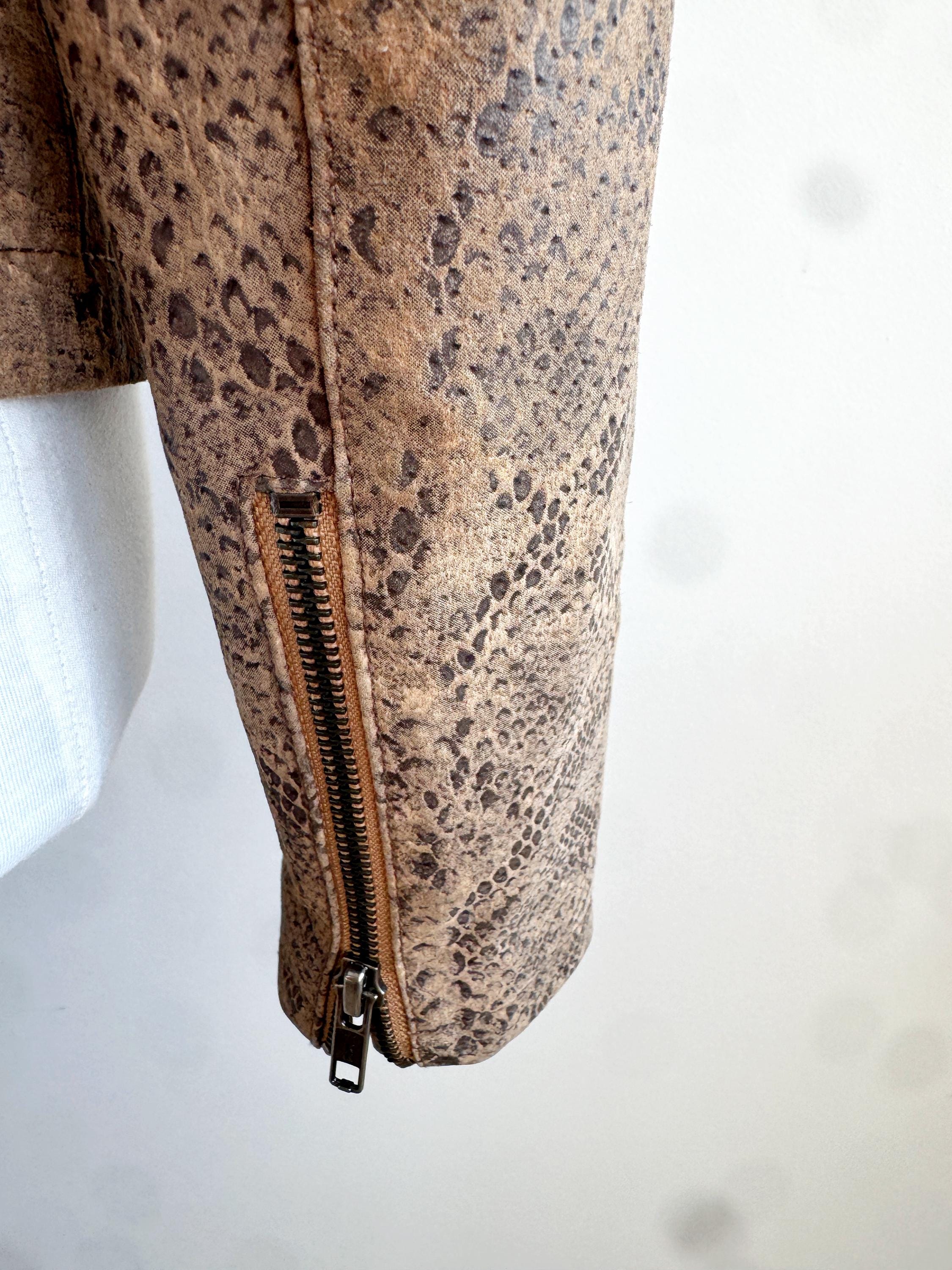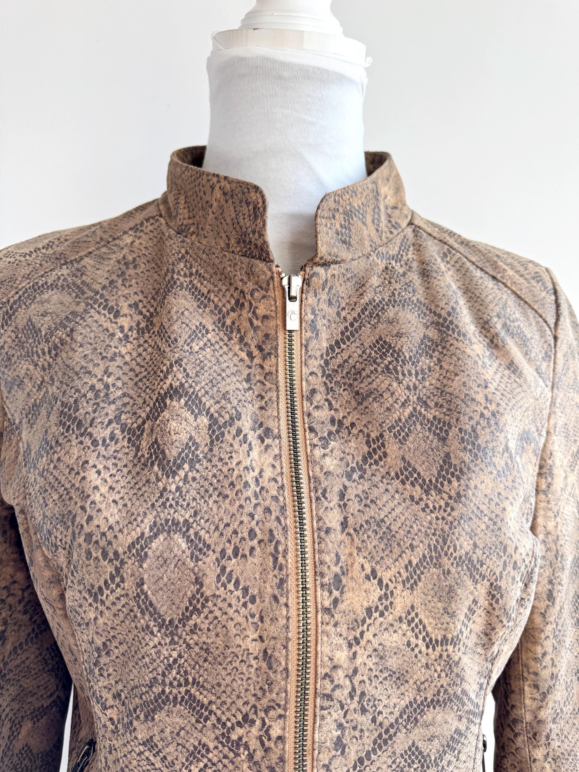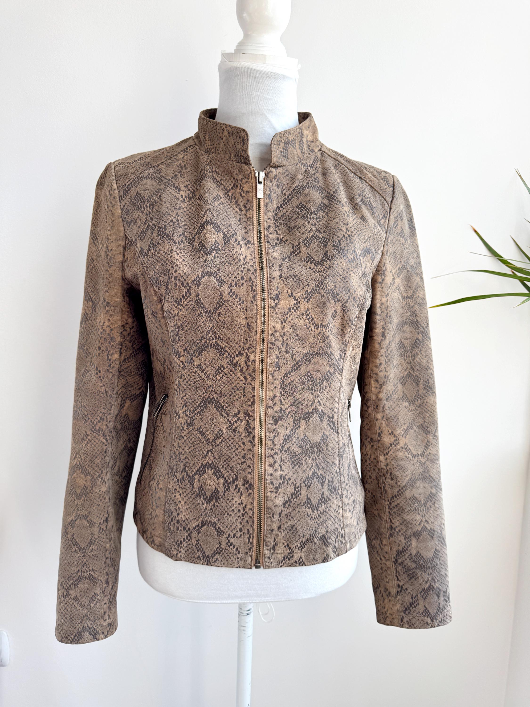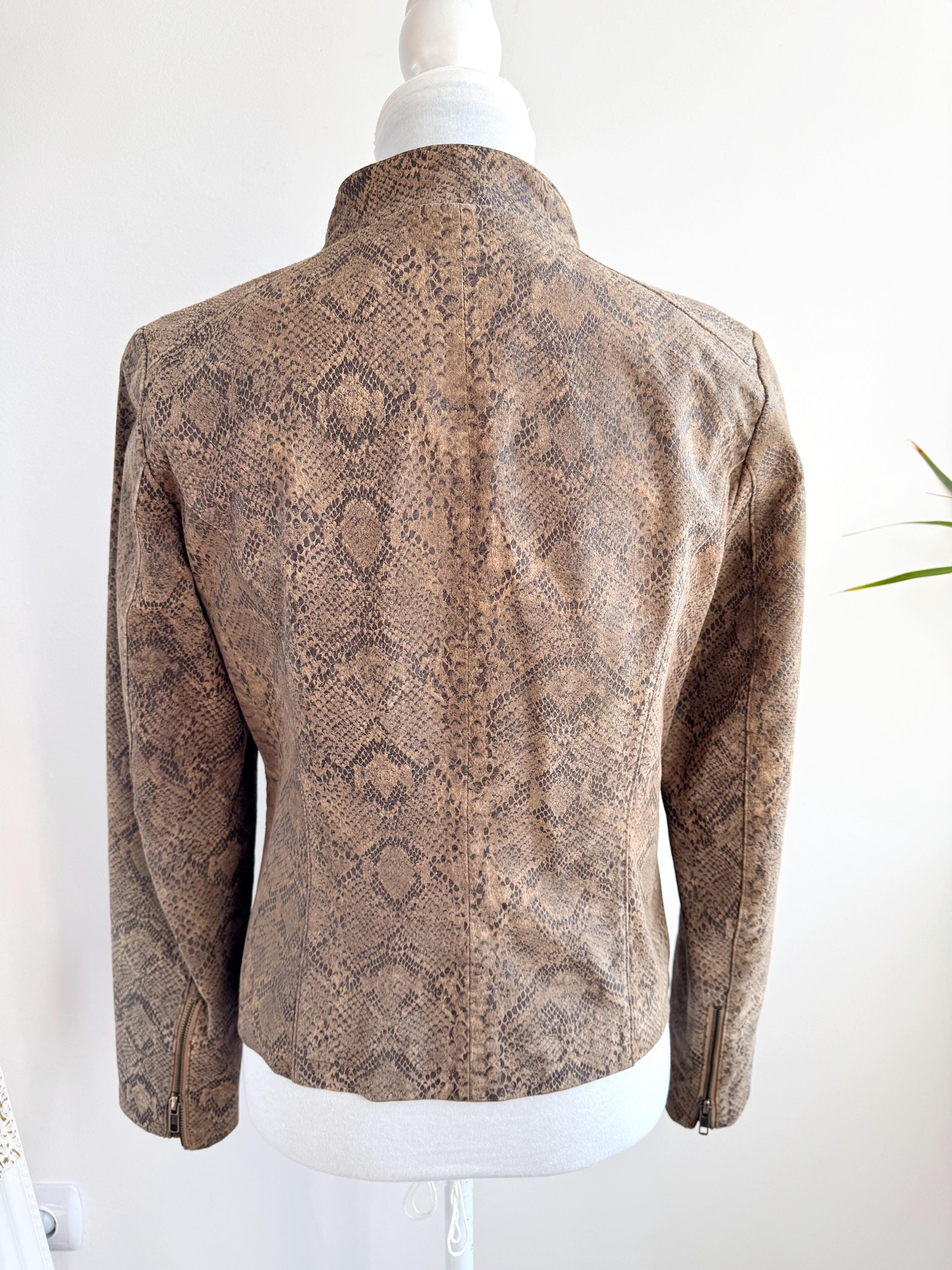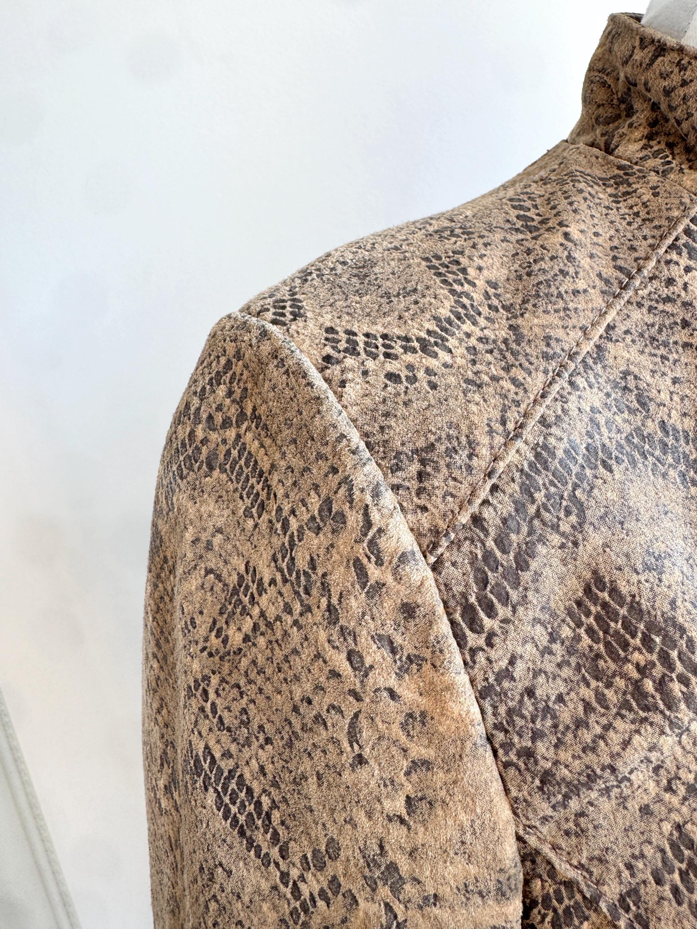 Unleash your wild side with this incredible Goosecraft snakeskin print leather jacket for women in size M. This leather jacket is cut in a classic moto/biker style with a high neck stand collar, front zipper, complemented by zippered cuffs and angled pockets. Made from 100% genuine leather with synthetic lining. Perfect for adding a grunge, punk, or exotic touch to any outfit, this leather jacket pairs effortlessly with everything from denim to dresses.