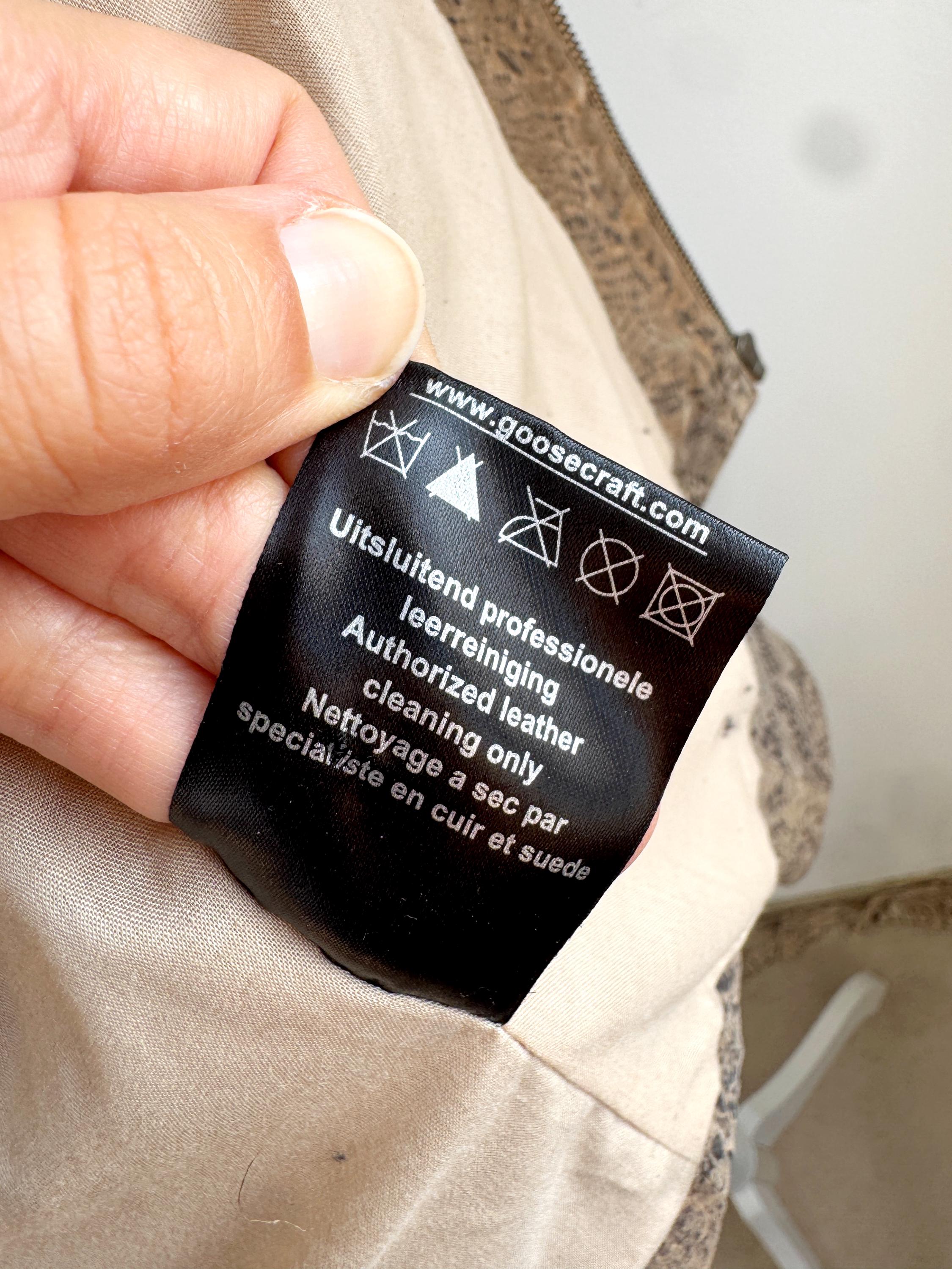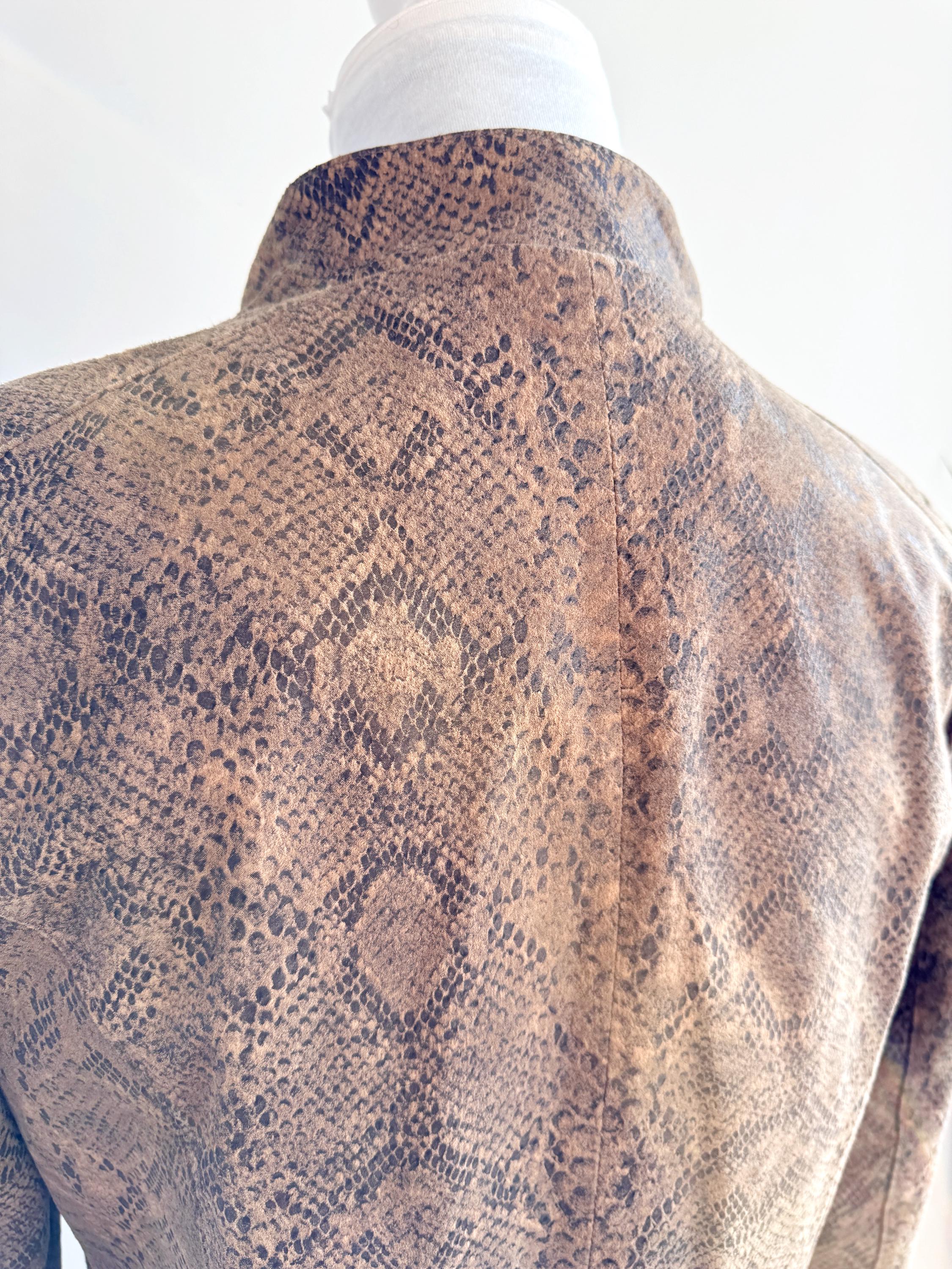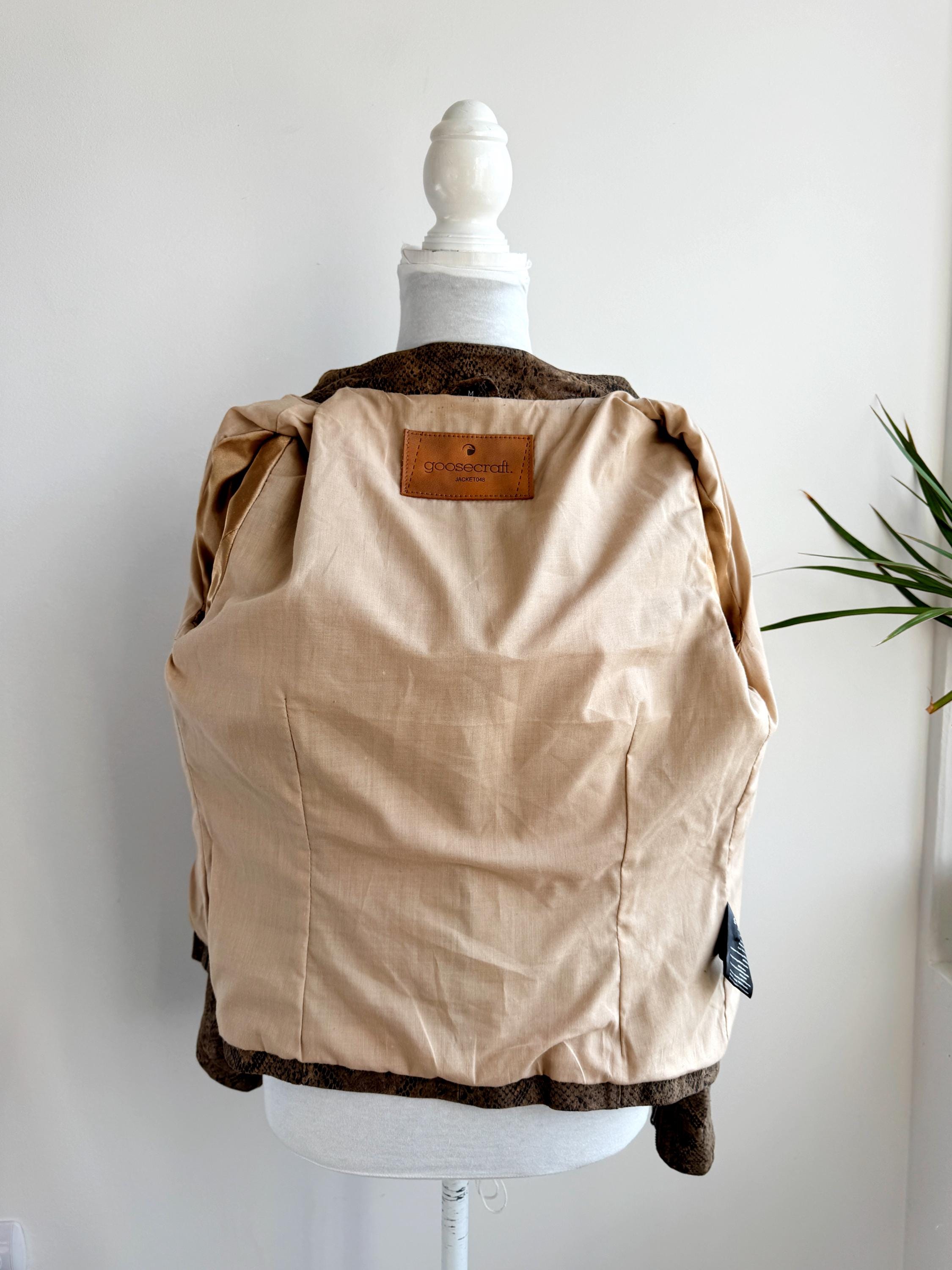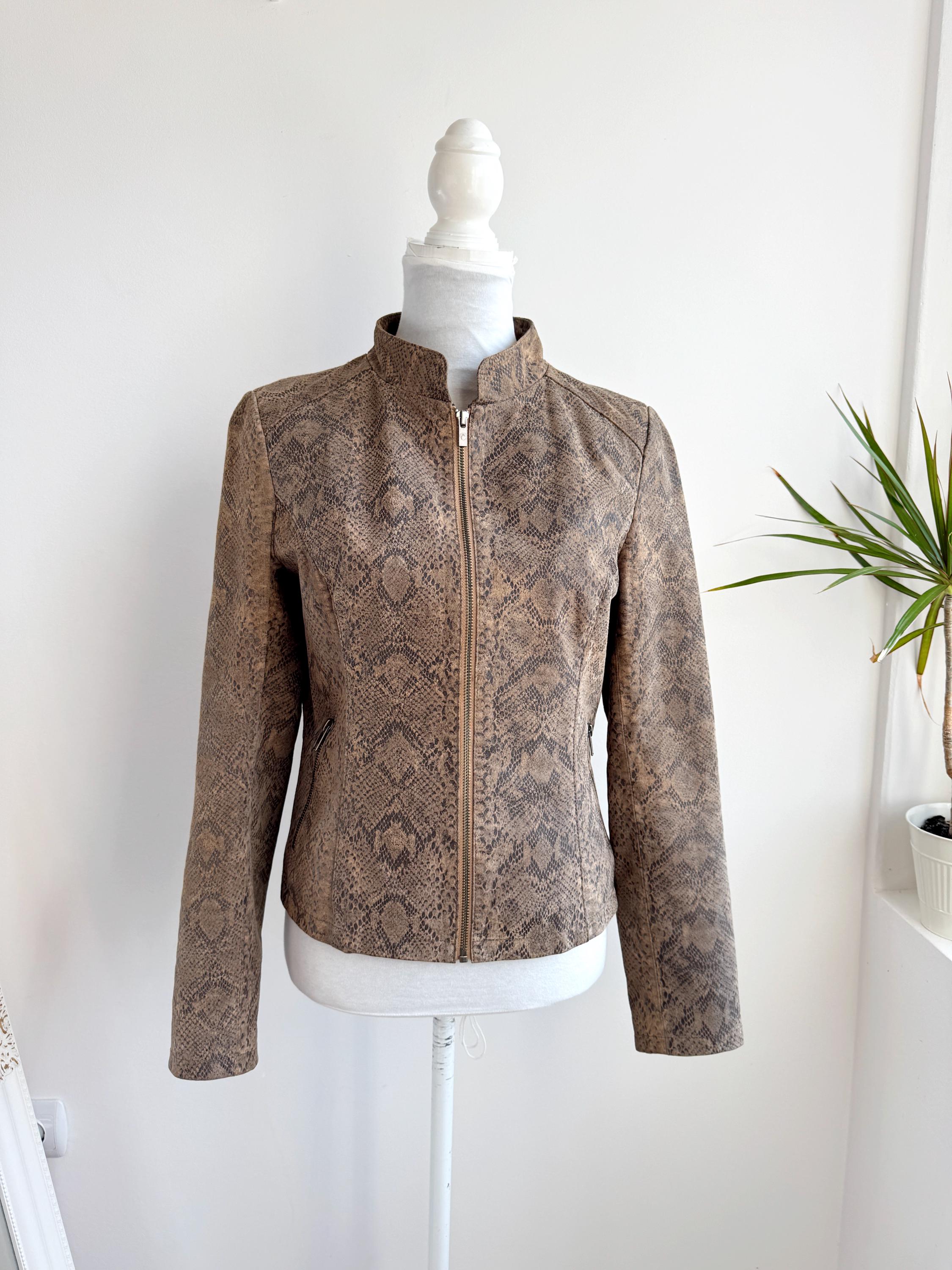 Unleash your wild side with this incredible Goosecraft snakeskin print leather jacket for women in size M. This leather jacket is cut in a classic moto/biker style with a high neck stand collar, front zipper, complemented by zippered cuffs and angled pockets. Made from 100% genuine leather with synthetic lining. Perfect for adding a grunge, punk, or exotic touch to any outfit, this leather jacket pairs effortlessly with everything from denim to dresses.